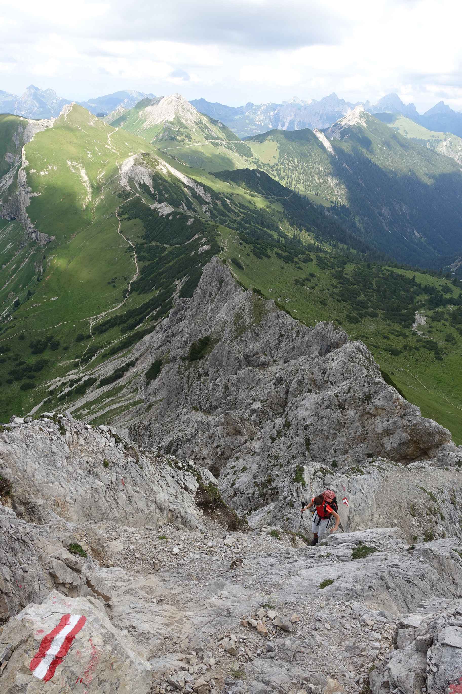 Ein paar Meter ging es dann zusammen wieder nach unten, und hier sprachen wir über den nächsten geplanten Gipfel, die Lachenspitze, die noch ca. 200hm mehr bedeutet hätte, aber am Gipfel oben luftige Kletterstellen im 1er Grad aufweist. Drei von uns machten sich von hier aus auf den Weg zurück. Teils ließen schon die Kräfte etwas nach, und gerade das bevorstehende Stück Weg würde noch einiges an Kraft und Konzentration fordern, außerdem absolut Schwindelfreiheit. Meiner Meinung nach sehr gute Selbsteinschätzung von jedem Einzelnen, und so gingen wir zu sechst weiter, ich meinerseits bedenkenlos mit diesen Jungs und Mädels, was sich ebenso als richtige Einschätzung erwies. Zwar hatten, oben auf 2126m angekommen, doch welche weiche Knie und wohl nen kleinen Adrenalin Kick bekommen, aber alles im grünen Bereich und gutem Empfinden.