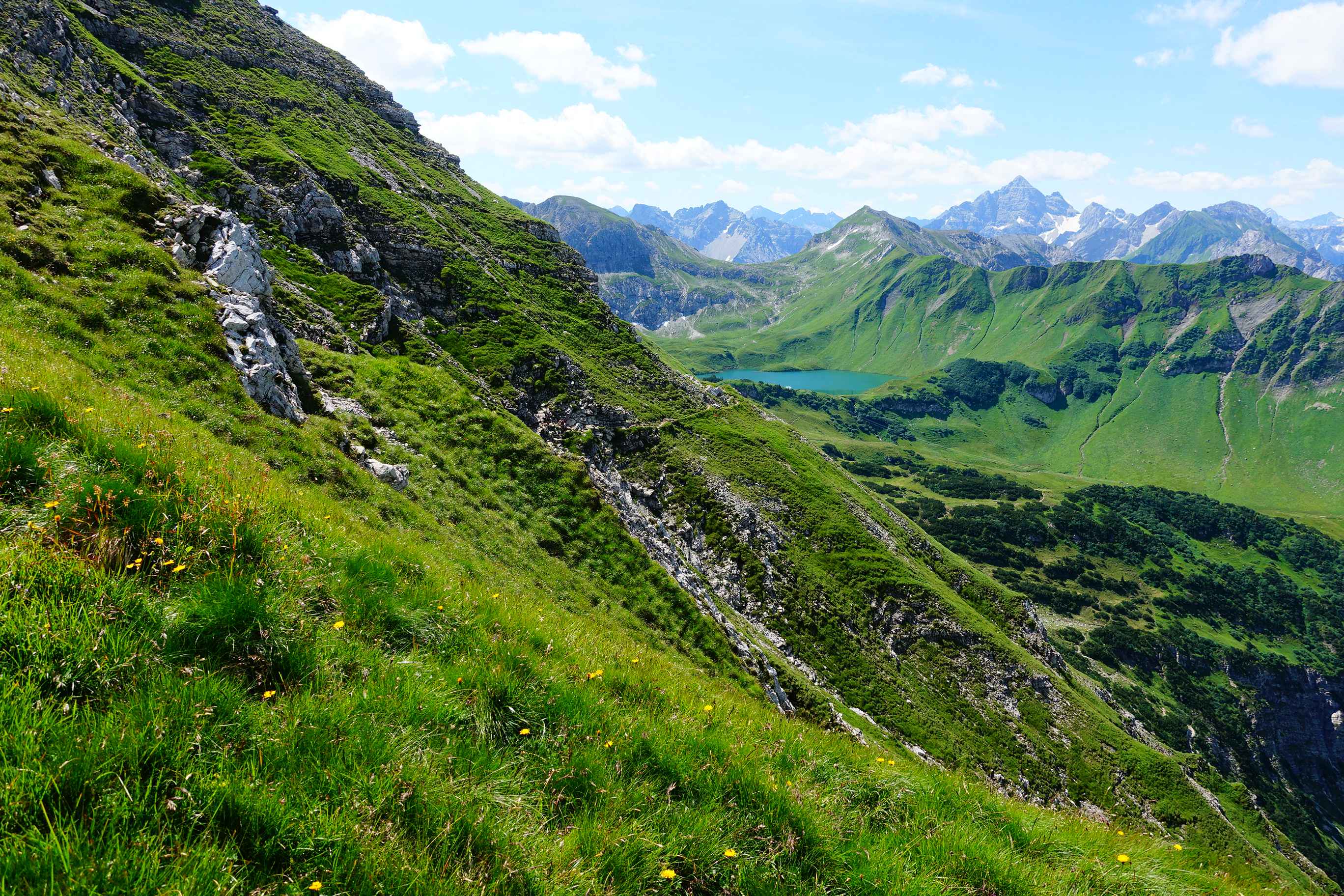 Zum vereinbarten Frühstück um 7 Uhr saßen wir alle schon um halb 7 bereit – die Motivation schien hoch zu sein ;-). Essen, packen, anziehen und los den Berg hinauf bei strahlend blauem Himmel – Bergwetter aus dem Bilderbuch. Zusammen ging es auf dem Saalfelder Höhenweg zur Scharte, von der wir gestern Abend auch runtergekommen sind, und dann hinüber in den nächsten Kessel, an einer Kesselwand ziemlich eben dahin und hinüber ins nächste kleine Tal, langsam und ab jetzt stetig immer mehr Blicke auf den tollen Hochvogel und seine umliegenden Spitzen. Nach 250hm aber schon 4,5km erreichten wir endlich die Stelle, von wo aus zum ersten Mal der Schrecksee zu sehen war. Etwas unterhalb diesen Punktes machten wir etwas Pause und entschieden uns für eine der drei möglichen Varianten – Abstieg zum Schrecksee und wieder hoch, auf gleicher Höhe weiter mit Blick auf den Schrecksee, oder noch über zwei Gipfel drüber, die auch etwas luftiger sein würden. Wir entschieden uns für die zwei Gipfel, Knappenkopf und Kugelhorn, was gesamt nochmal 150hm mehr bedeuten sollten.
