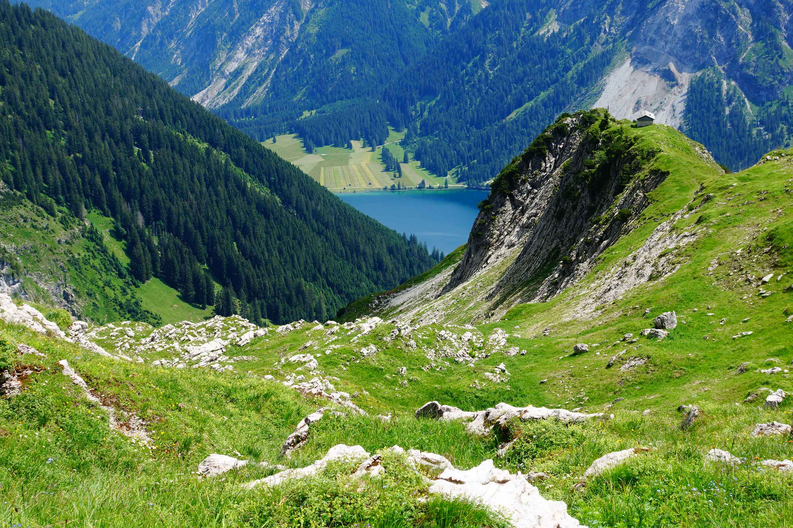 Von meiner Seite hierzu: Es war auch für mich eine Erfahrung, wie schnell bei dem ein oder anderen die „Starre“ einsetzen kann und an was für unterschiedlichen Stellen das bei allen ist. Dadurch, daß ich vorher gute Tourenbeschreibungen gelesen hatte, war ich mir der Schwierigkeit dieser Stelle absolut bewußt, wobei das jetzt keine Kletterstelle ist oder so, und somit natürlich angespannt schon vorher. Dennoch gab es zu keiner Zeit Bedenken, und wenn ich jeden einzeln darüber hätte führen müssen – Gefahr bestand zu keiner Zeit. Durch die super gemischte Gruppe, wo absolut jeder auf jeden geschaut hat, sind wir hier super durchgekommen und gaben uns dann dem Abstieg zum Vilsalpsee hin. Ein langer Abstieg, was auch hier nochmal neu war für viele, denn im letzten Jahr waren wir ja gemütlich mit der Bahn abgefahren.