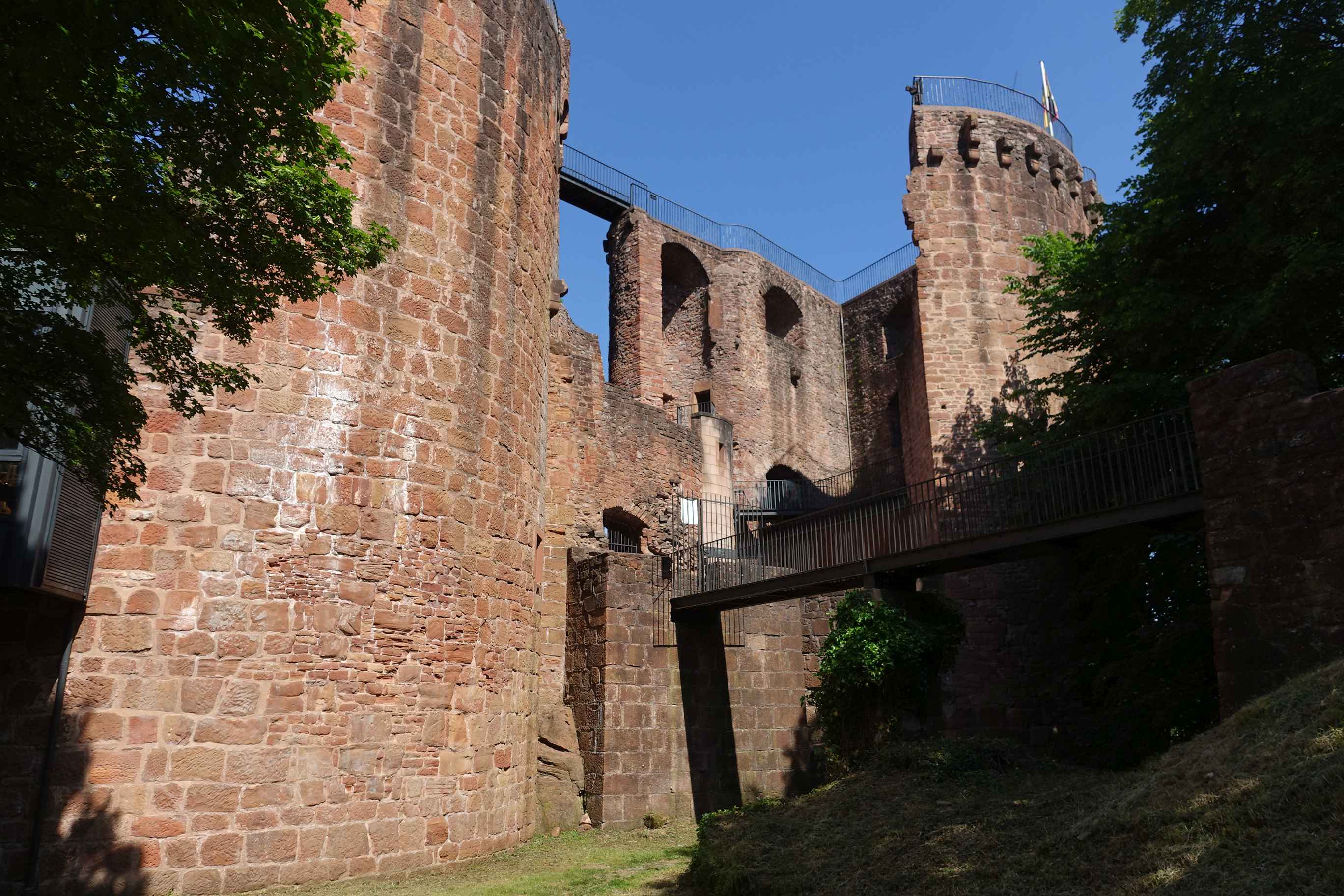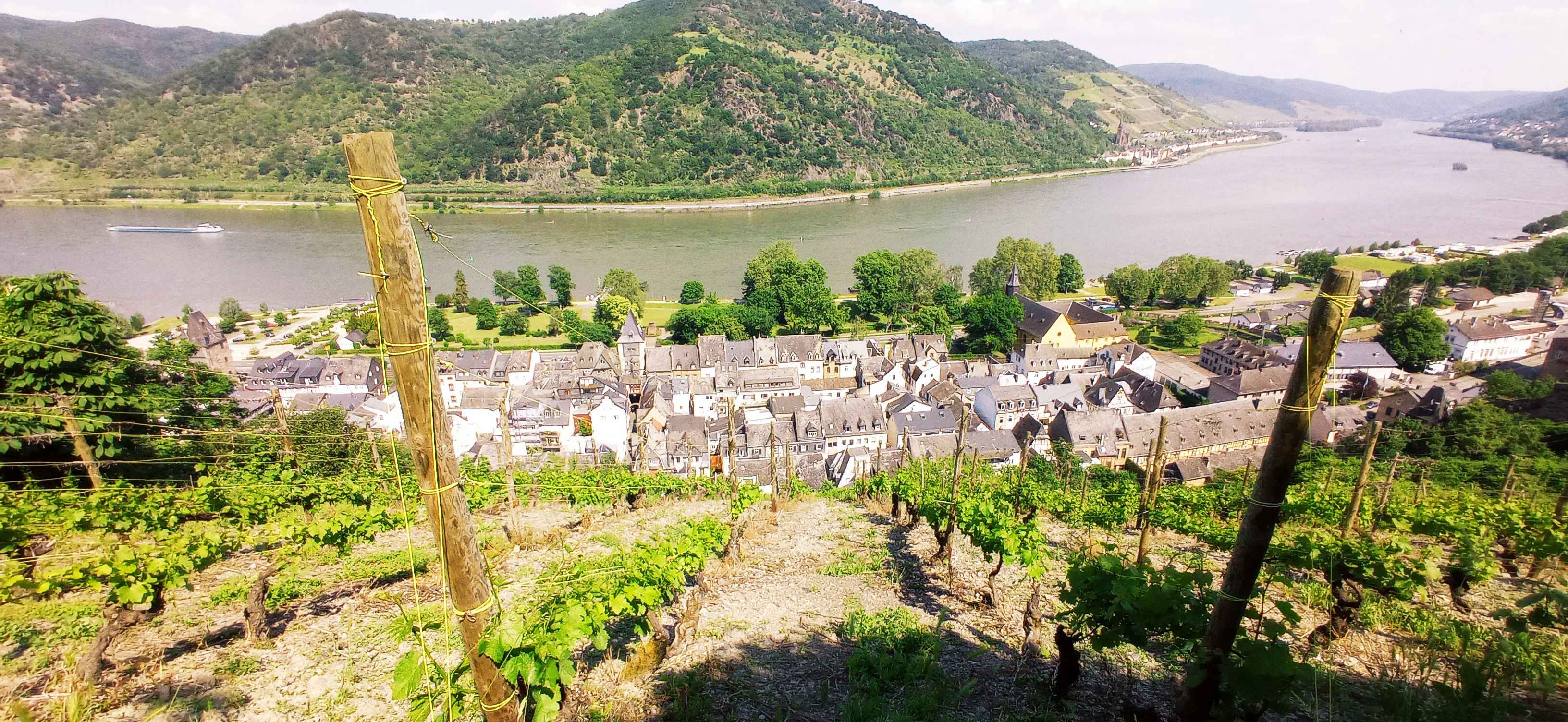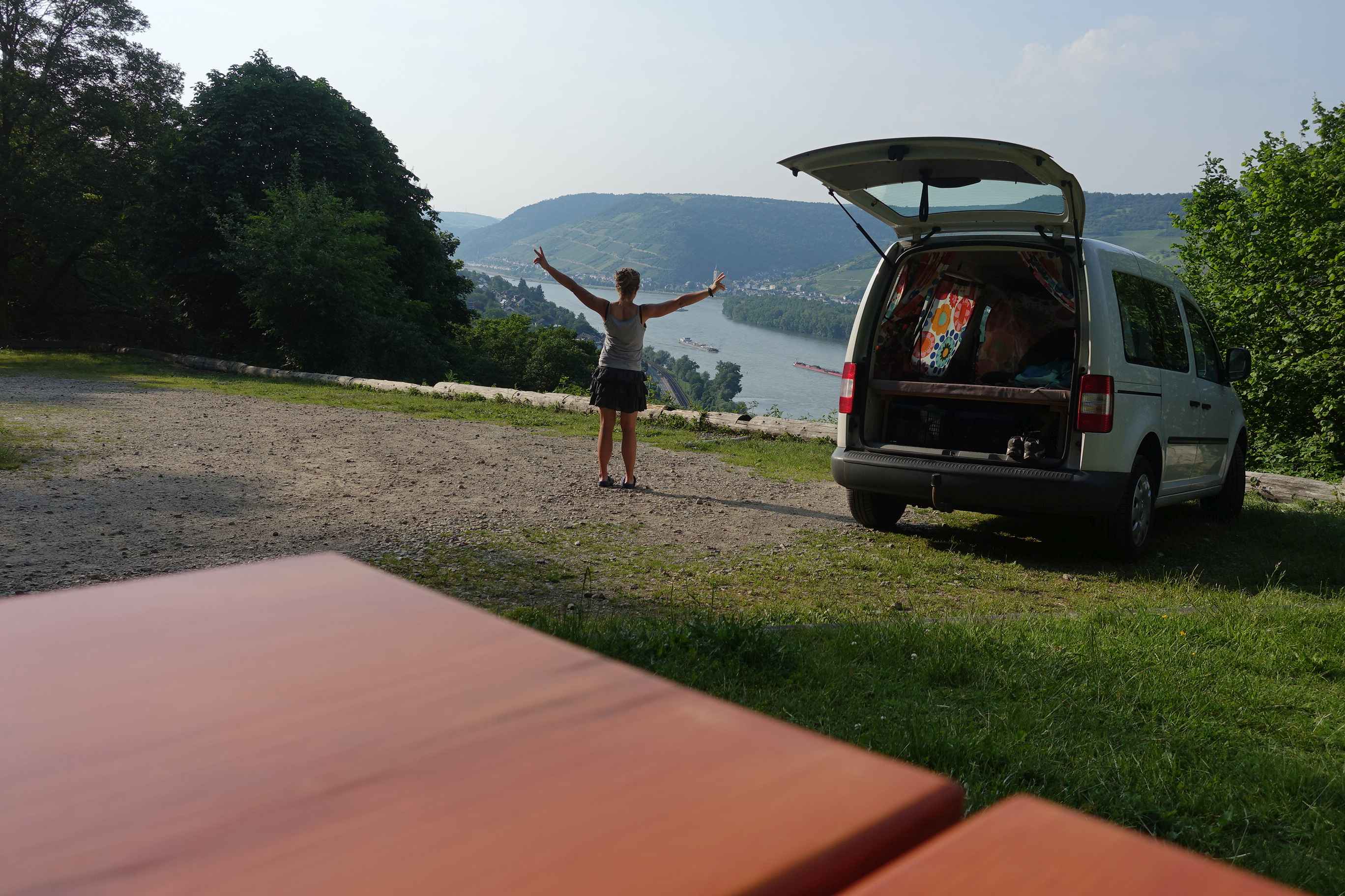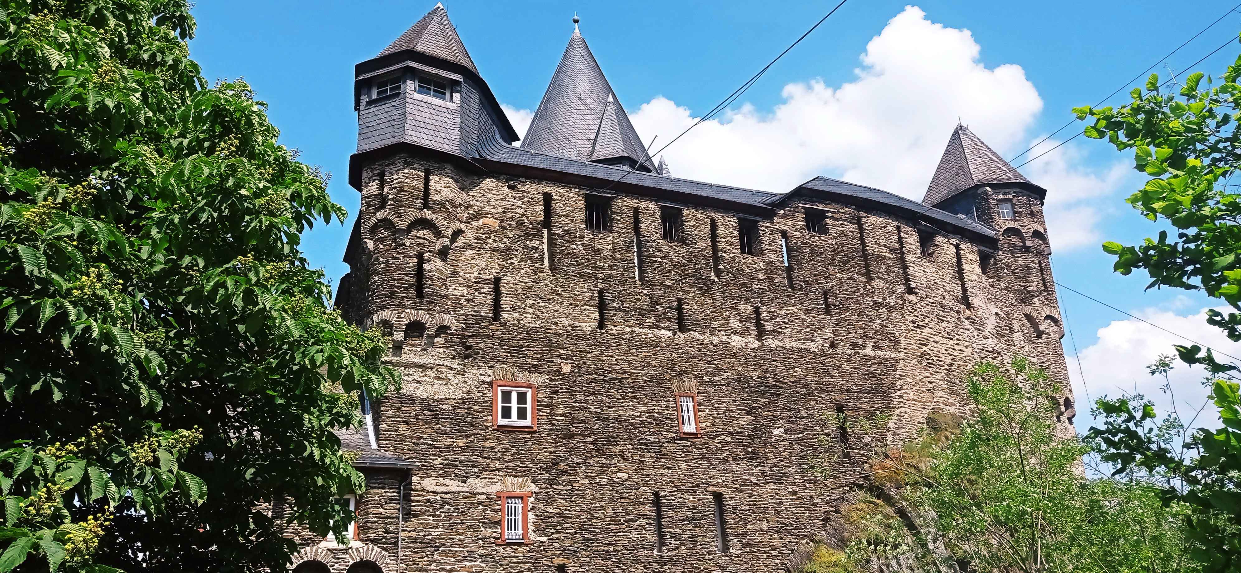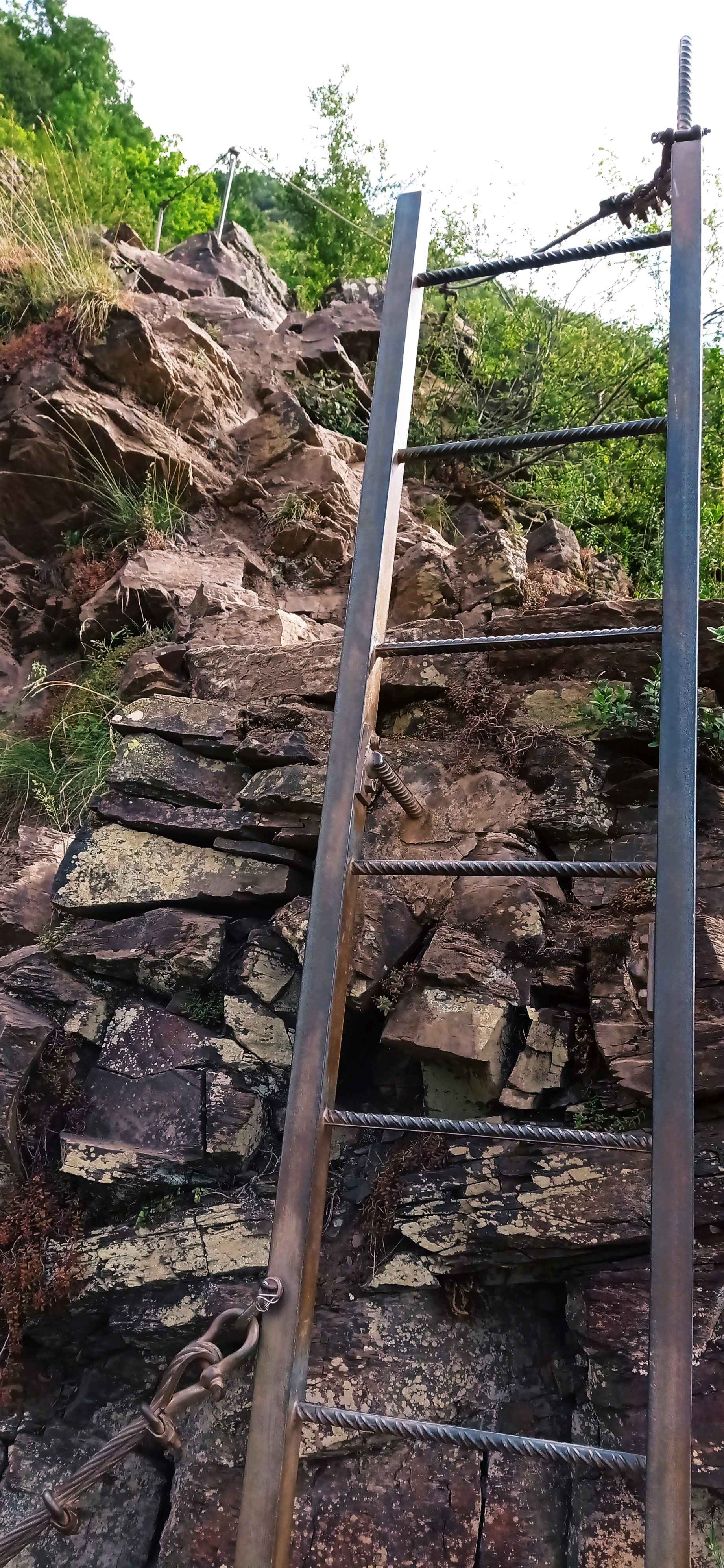 Als ich sehr früh bei Dauerregen erwachte, sprang ich sofort aus dem Bett und beeilte mich nochmal mehr mit packen, um schnell hier wegzukommen. Sturzbäche auf den Straßen, als ich hier gegen 10 Uhr losfuhr der Sonne entgegen. Ab Bamberg war es trocken, kurz hinter Frankfurt noch ein Gewitter und dann Sonne pur bei 28 Grad, als ich am Rhein ankam. Zunächst fuhr ich den Parkplatz der Burg Sooneck an und fand dort einen wunderschönen Platz zum Übernachten hoch über dem Rhein mit Blick auf den selbigen. 14 Uhr, ich hatte noch massig Zeit. Zunächst fuhr ich noch kurz einen Supermarkt an und dann nach Bacharach. Hier stellte ich das Auto ab und lief auf die Burg Stahleck hoch, fand dort glatt einen süßen Miniklettersteig und ging an der Stadtmauer wieder runter und ein bißchen am Rheinufer entlang. Weil ich von der Fahrt etwas geschafft war fuhr ich dann zu meinem Stellplatz und wollte mir eigentlich eine Kleinigkeit zu Essen machen. Als ich um 17 Uhr ankam, waren dort zwei Herren mit Motorsense und Motorsäge zugange – weniger schön, um gemütlich in der Sonne zu sitzen. Also zog ich meine Wanderschuhe an, lief mal zur Burg, in die man aber nicht reinkam, und dann einfach ein Stück den Berg hoch, wo ich mir ein sonniges Plätzchen suchte, um dort gemütlich ein Bier zu trinken. Mein Plan ging auf, als ich wieder am Parkplatz war, war Ruhe, und es sollten den ganzen Abend nur noch 2 Autos kommen, die einen kurzen Spaziergang machten und wieder fuhren. Schöne Stimmung hier, und der Lärm aus dem Tal ließ nach. Daß direkt nebenan ein Steinbruch war, von woher der Lärm wohl gekommen war, entdeckte ich erst am nächsten Tag.