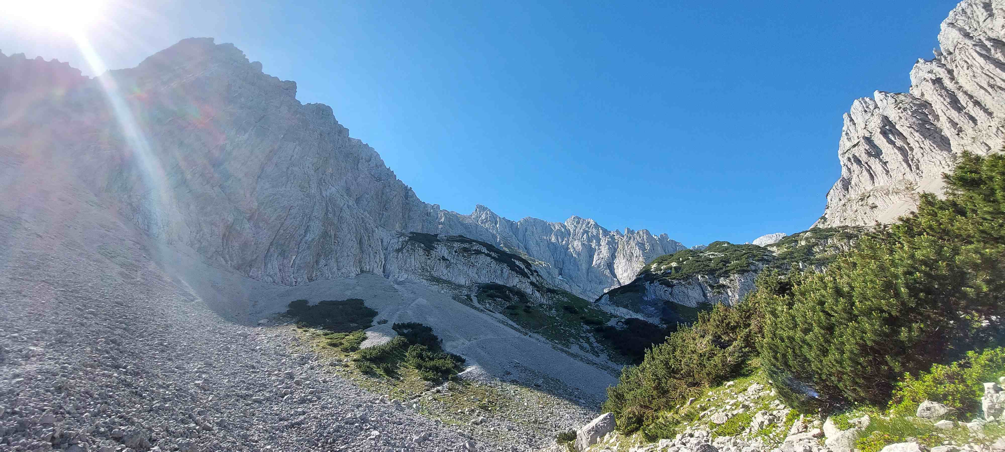 Nur: laufen war nicht der richtige Ausdruck. Schon nach ein paar 100 Metern auf einem Schotterweg zweigten wir links ab, wo es sogleich in steile Wanderpfade mit leichter Kraxelei überging und ziemlich schnell auch noch viel Schotterhänge zu überwinden waren bis wir zum Abzweig in Richtung Gipfel hinauf ankamen. Waren wir bislang im Wald und Schatten unterwegs empfingen uns nun die ersten Sonnenstrahlen, die hinter dem Berg hervorgekrochen waren.