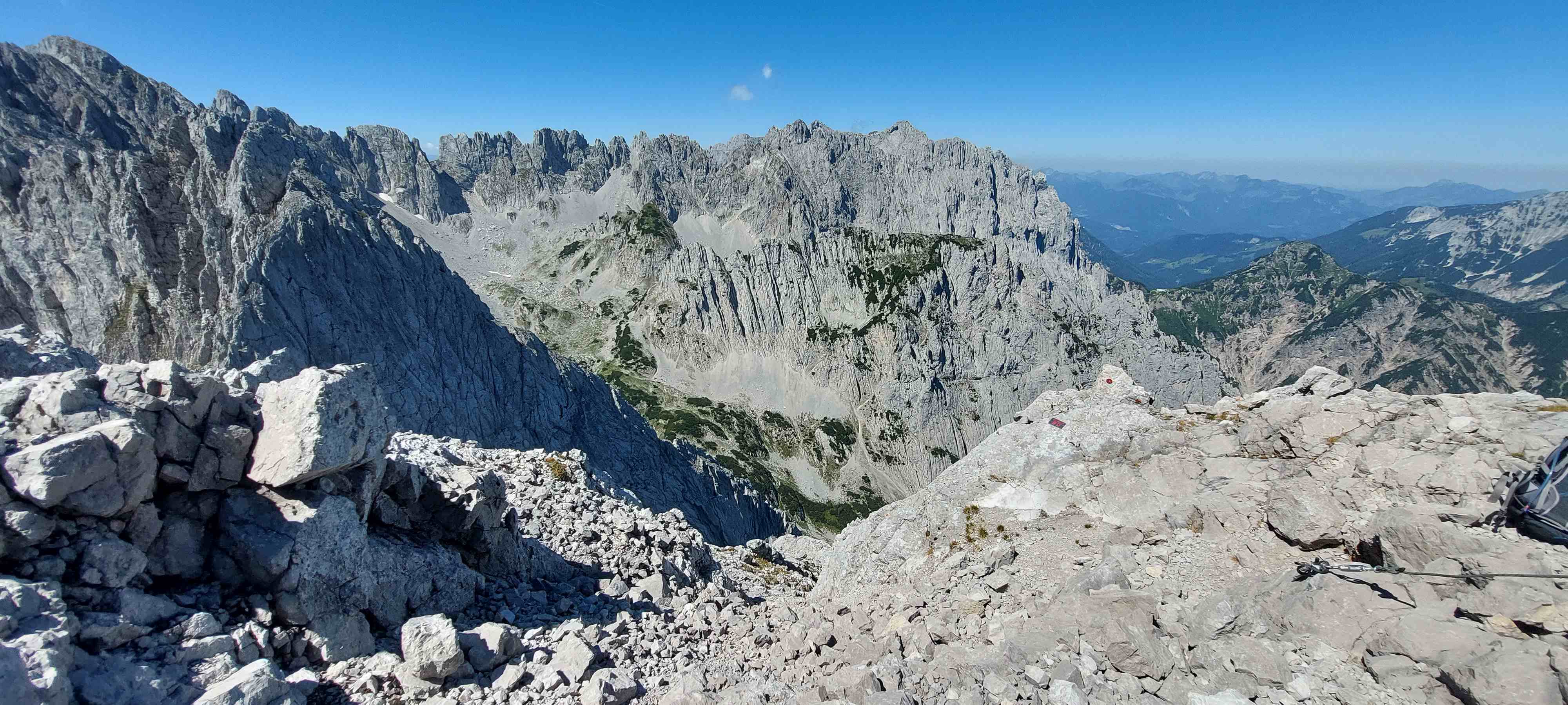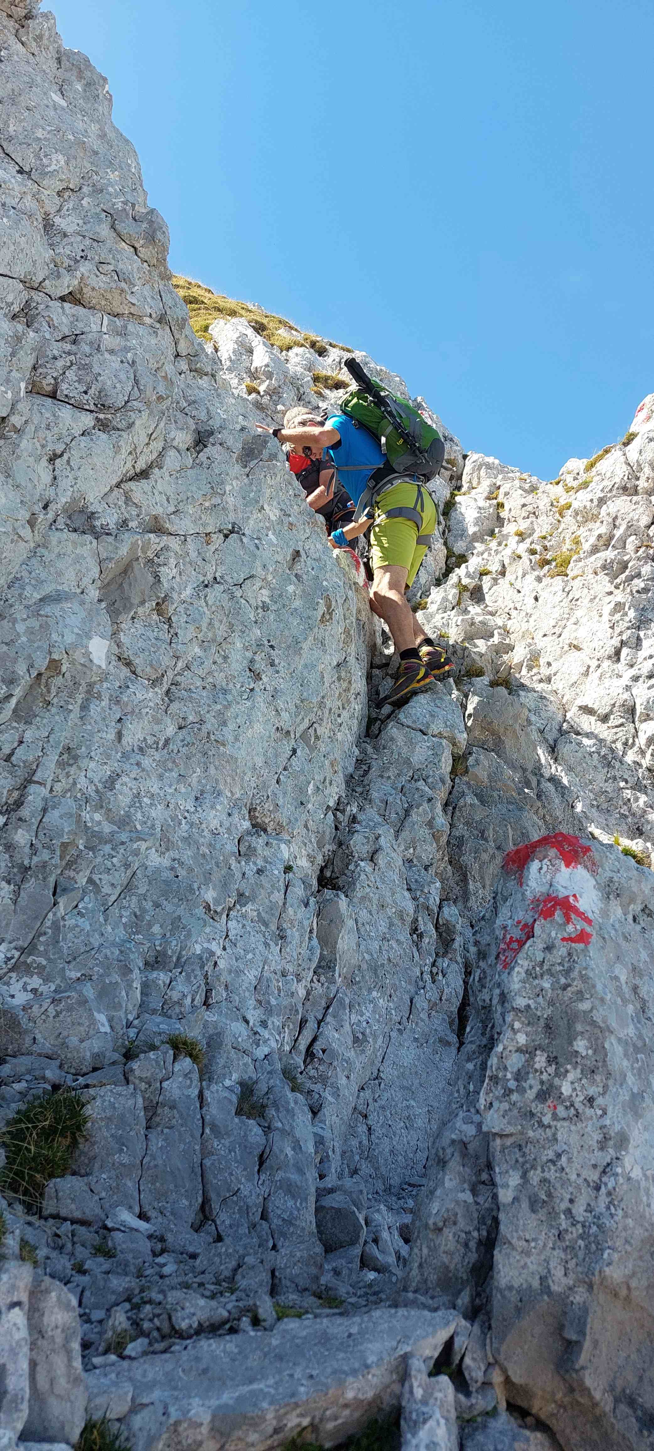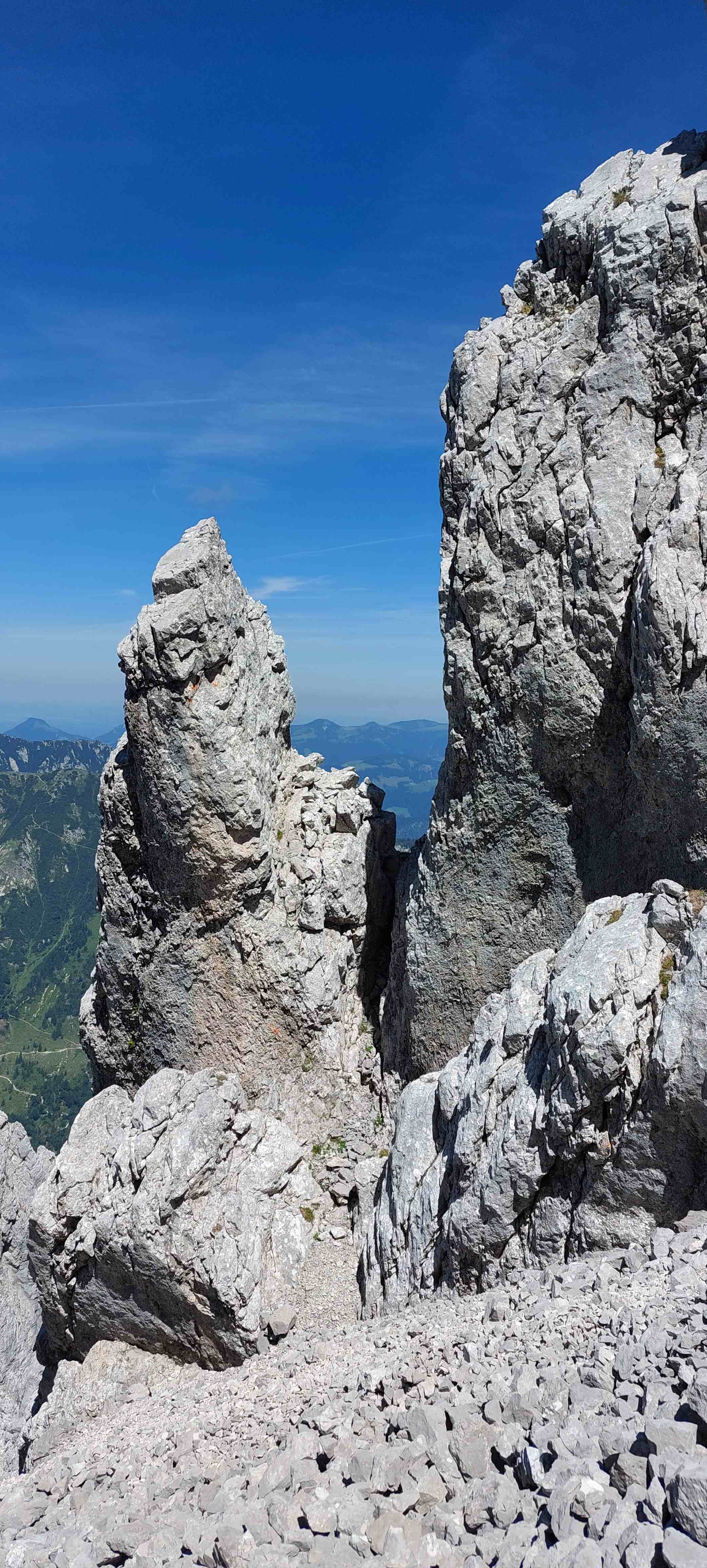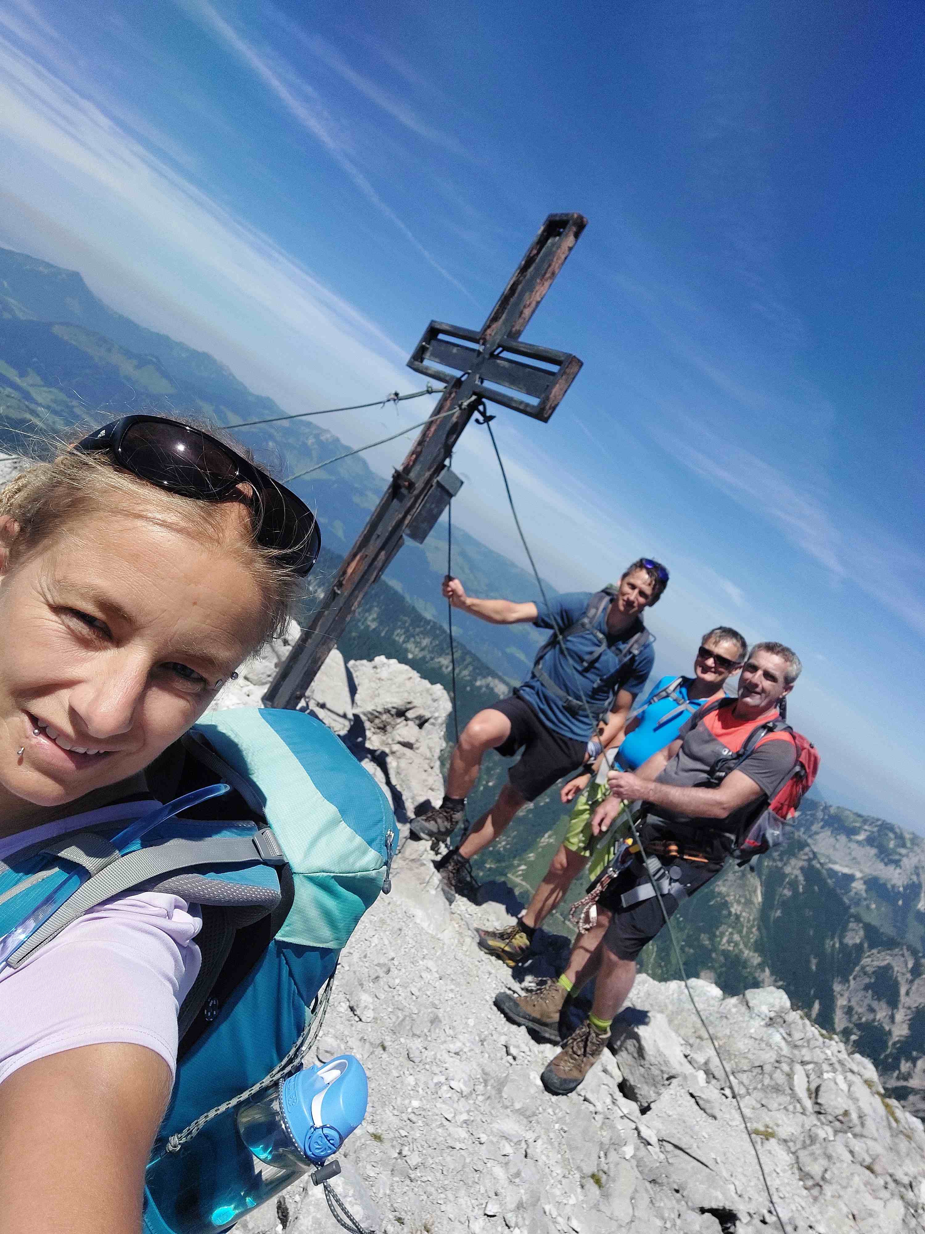 Am Abzweig kurze Rast und Stärkung und dann los in ein richtig fieses, steiles Schotterfeld. Der Aufstieg bis zum Einstieg in die Kletterei war sehr mühsam. Als wir dieses überwunden hatten begann der Kletterspaß. Teils versichert, teils unversichert bis in den 2er Grad stiegen wir dem Gipfel entgegen und kamen unter der angegebenen Zeit oben an, auch wenn wir gefühlt nicht schnell unterwegs gewesen waren. Von hier aus war die Sicht atemberaubend und wir waren eine dreiviertel Stunde ganz allein auf 2123m bis wir uns zum Abstieg rüsteten teils mit, teils ohne Klettersteigset.