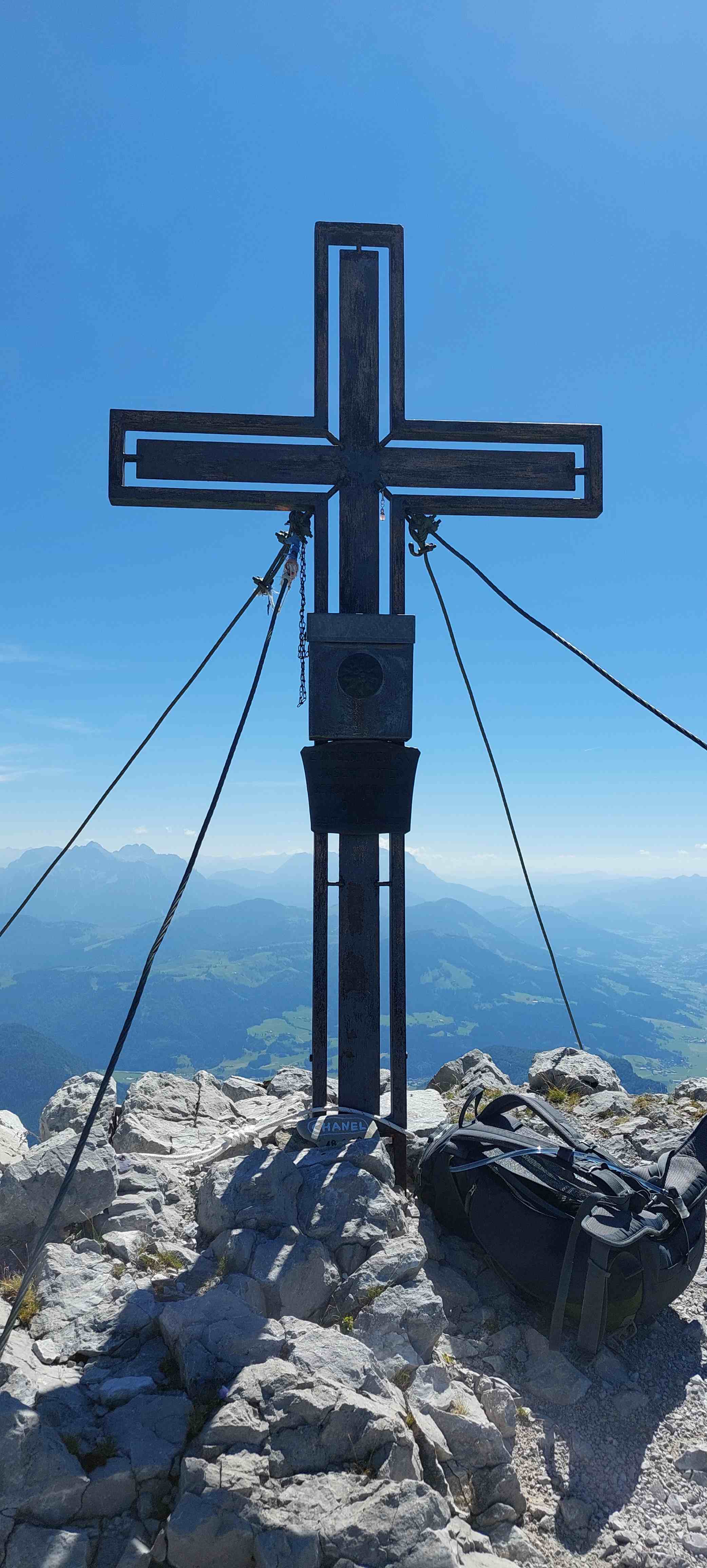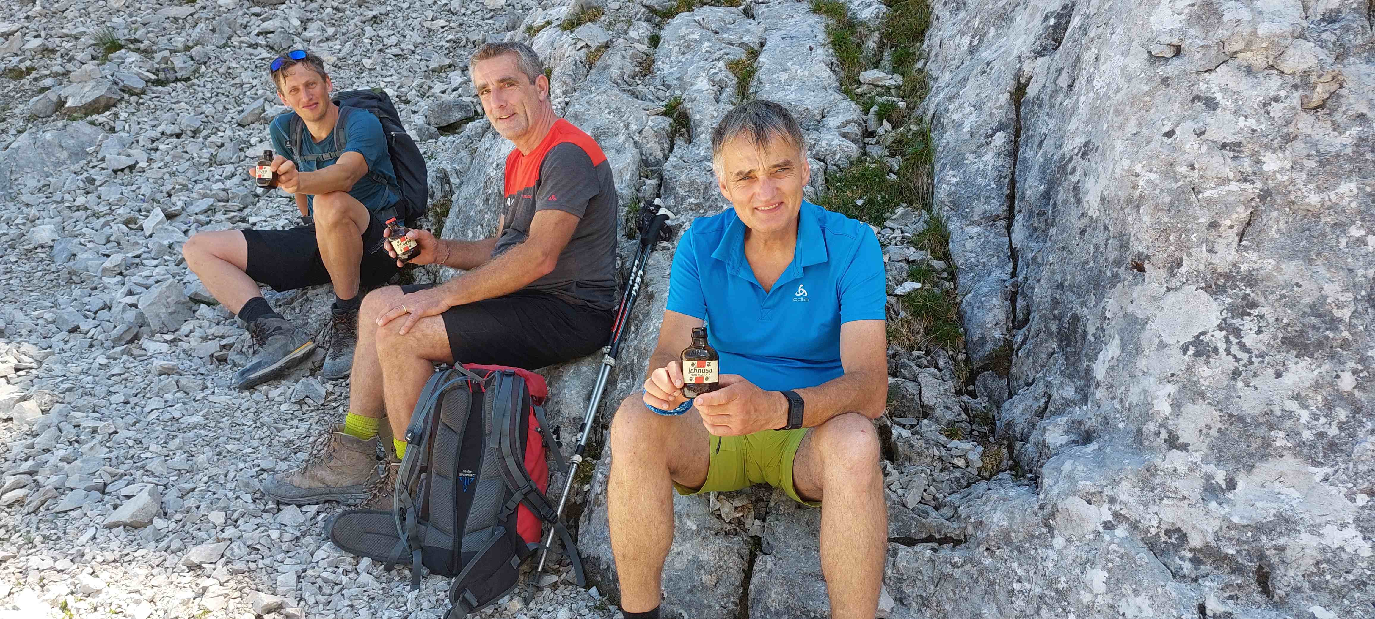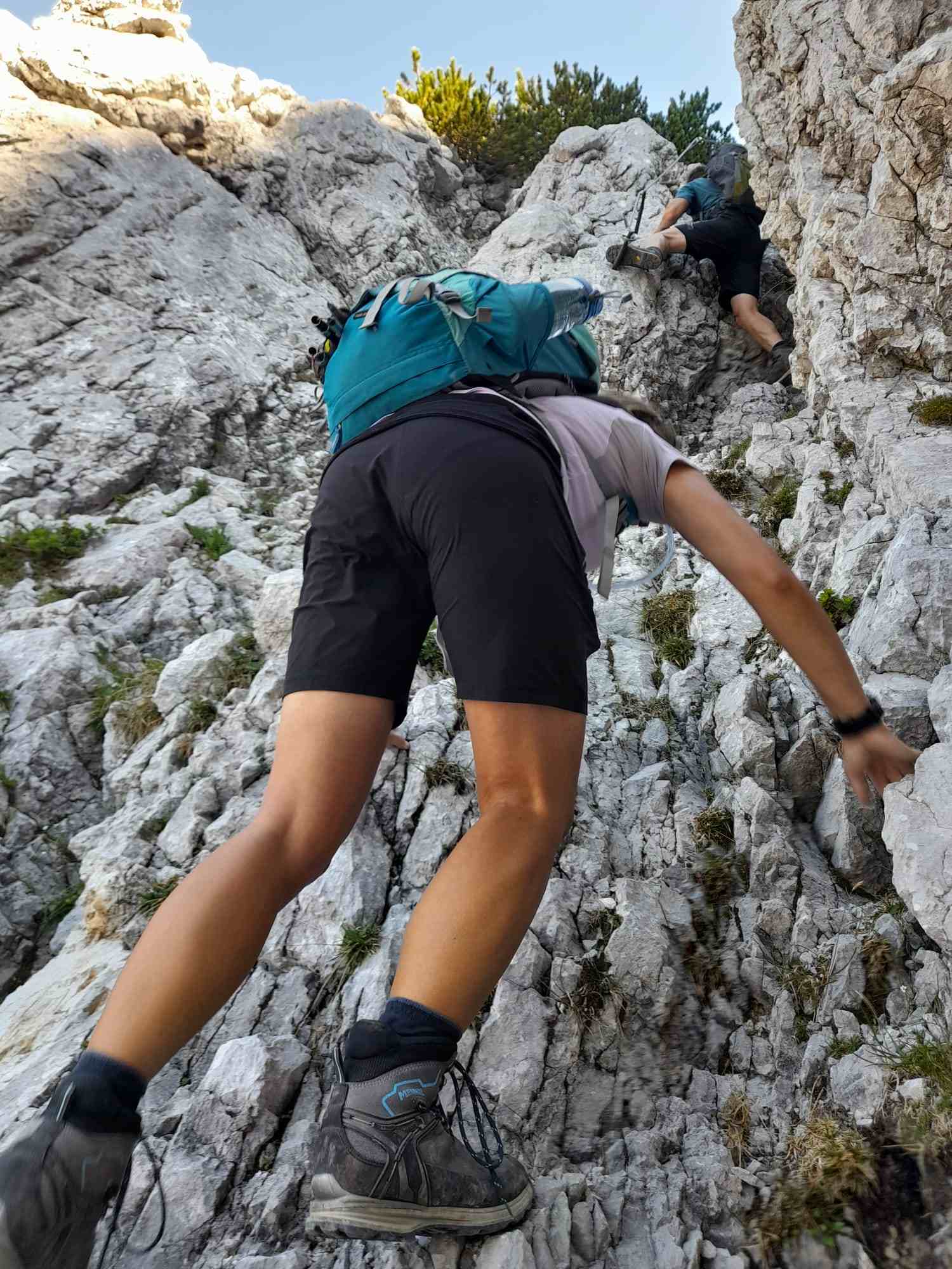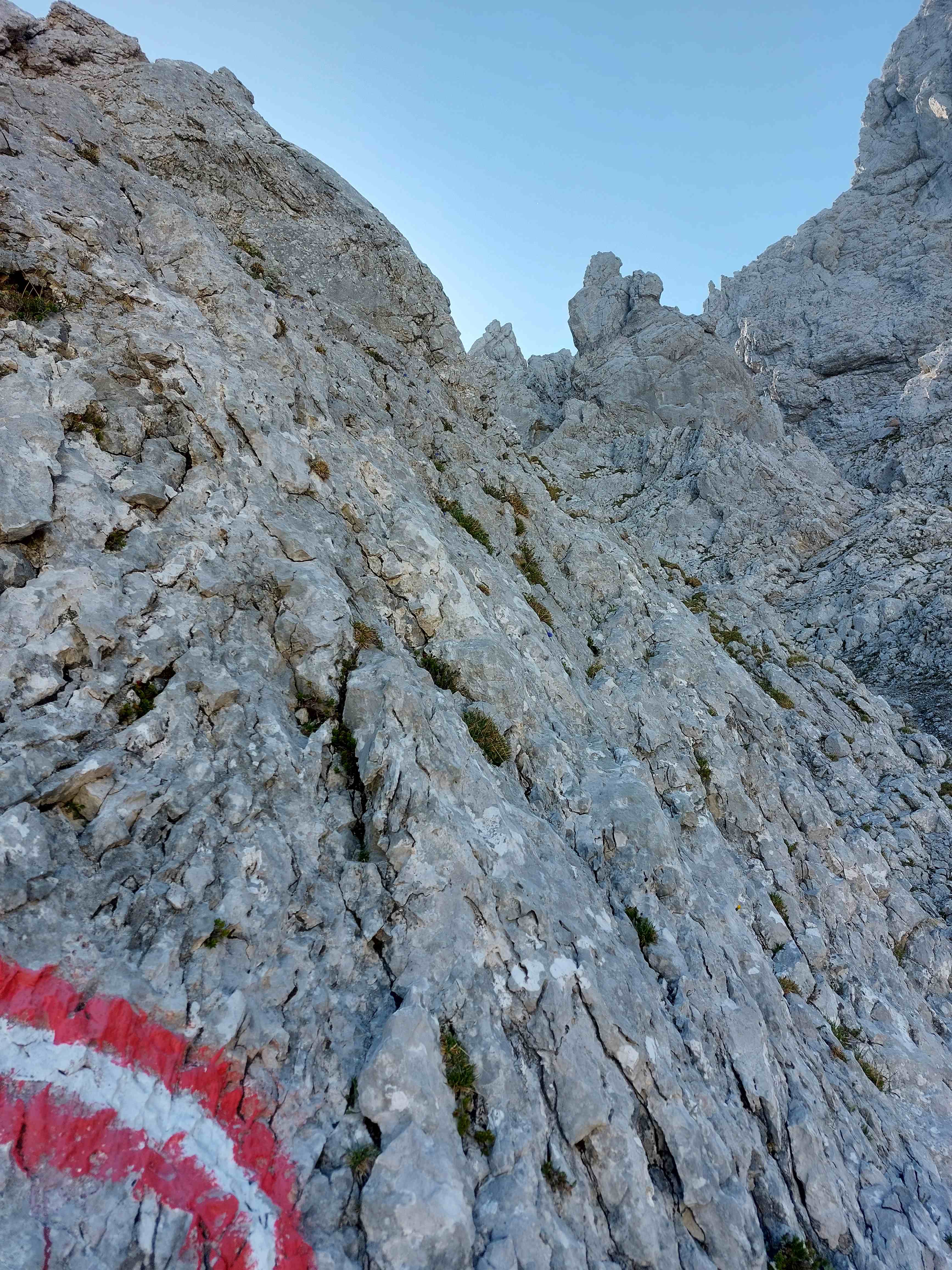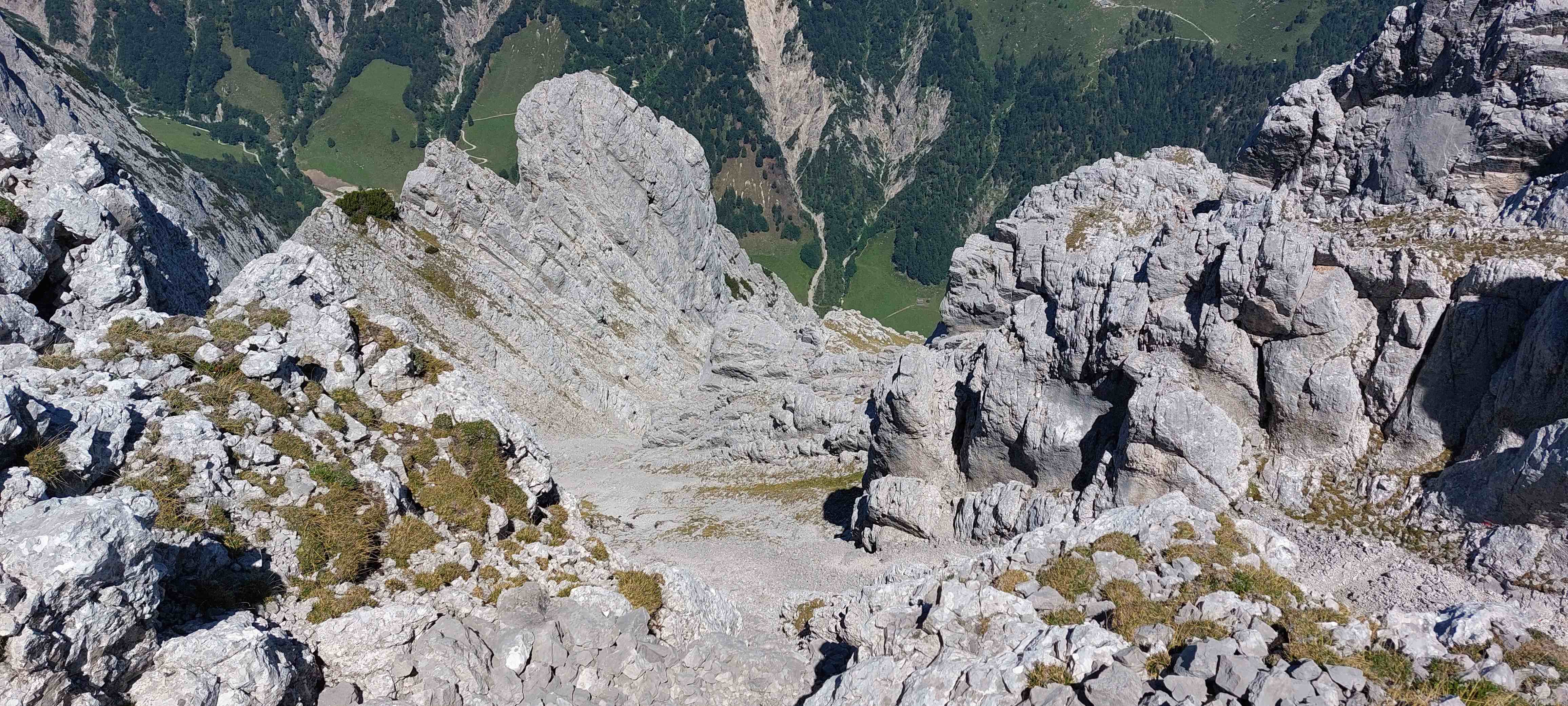 Am Abzweig kurze Rast und Stärkung und dann los in ein richtig fieses, steiles Schotterfeld. Der Aufstieg bis zum Einstieg in die Kletterei war sehr mühsam. Als wir dieses überwunden hatten begann der Kletterspaß. Teils versichert, teils unversichert bis in den 2er Grad stiegen wir dem Gipfel entgegen und kamen unter der angegebenen Zeit oben an, auch wenn wir gefühlt nicht schnell unterwegs gewesen waren. Von hier aus war die Sicht atemberaubend und wir waren eine dreiviertel Stunde ganz allein auf 2123m bis wir uns zum Abstieg rüsteten teils mit, teils ohne Klettersteigset.