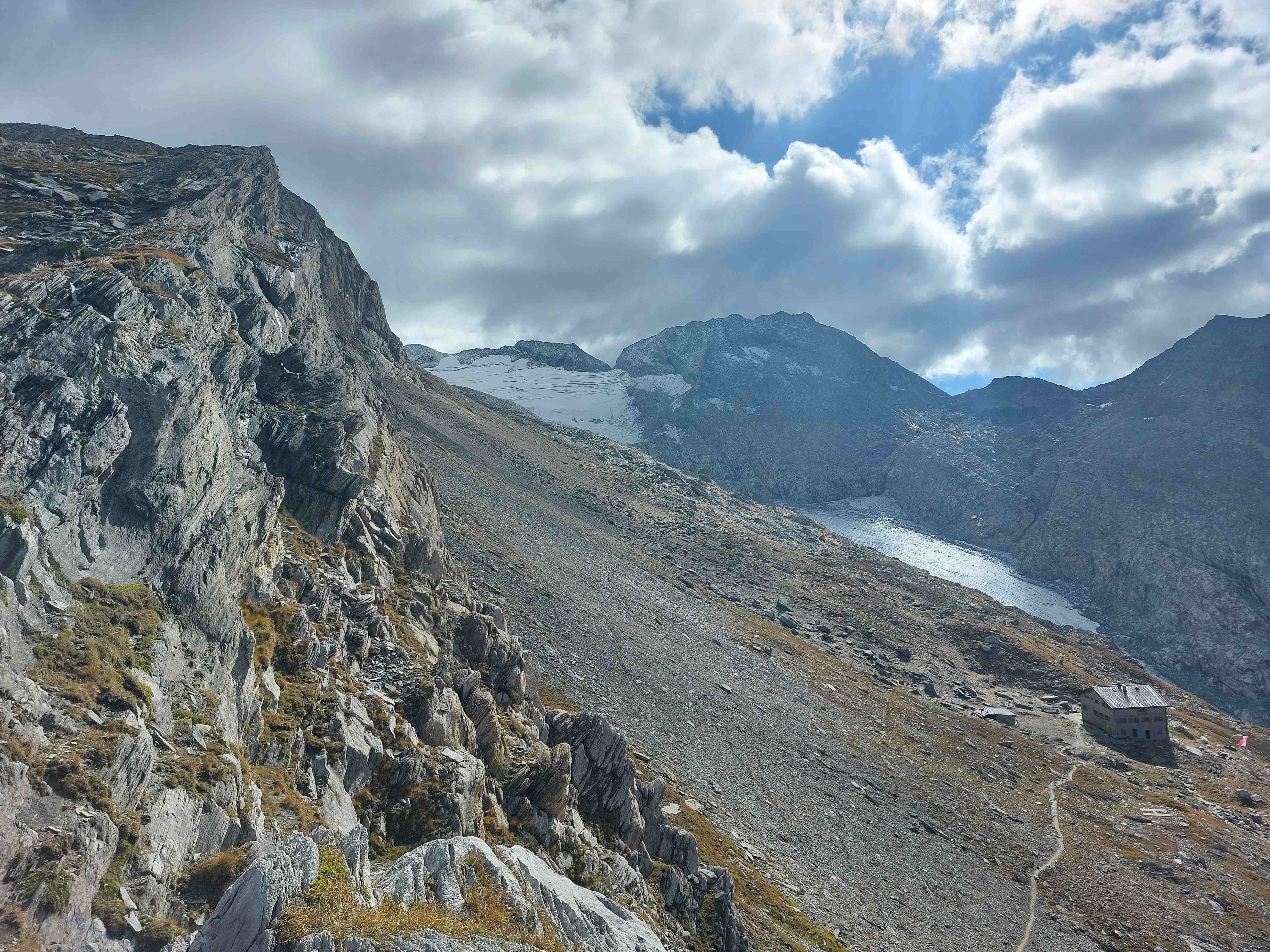 Aufgrund der doch fortgeschrittenen Zeit entschieden wir uns zum direkten Abstieg zur Hütte, den gleichen Weg zurück, und dann mit dem gesamten Gepäck wieder ganz nach unten. Auch dieser Abstieg sollte noch interessant werden. Es hatte wieder aufgerissen und wurde heiß fast wie am Tag vorher. Jetzt lag auch das Persailhorn frei von Wolken. Es ging noch mit einigen Gegenanstiegen steil bergab über Leitern, ekelhaft feines Gries und hohe Stufen. Auf der Steinalm machen wir nochmal Pause bei einem kühlen Getränk und liefen dann zum Auto zurück. Heimfahrt ging dann zumindest einigermaßen fließend. Alles in Allem ein Ausflug, von dem man zehren kann!!