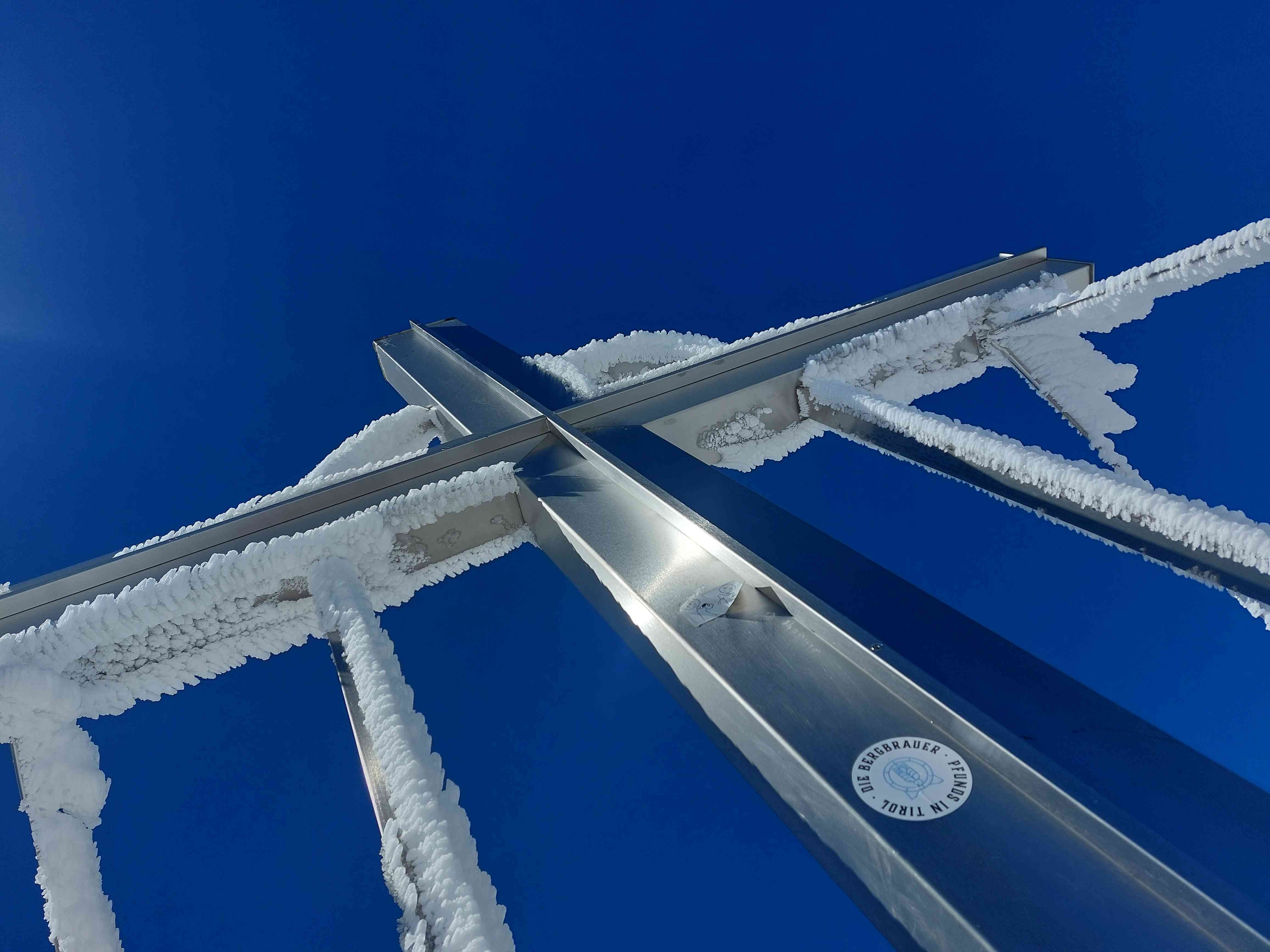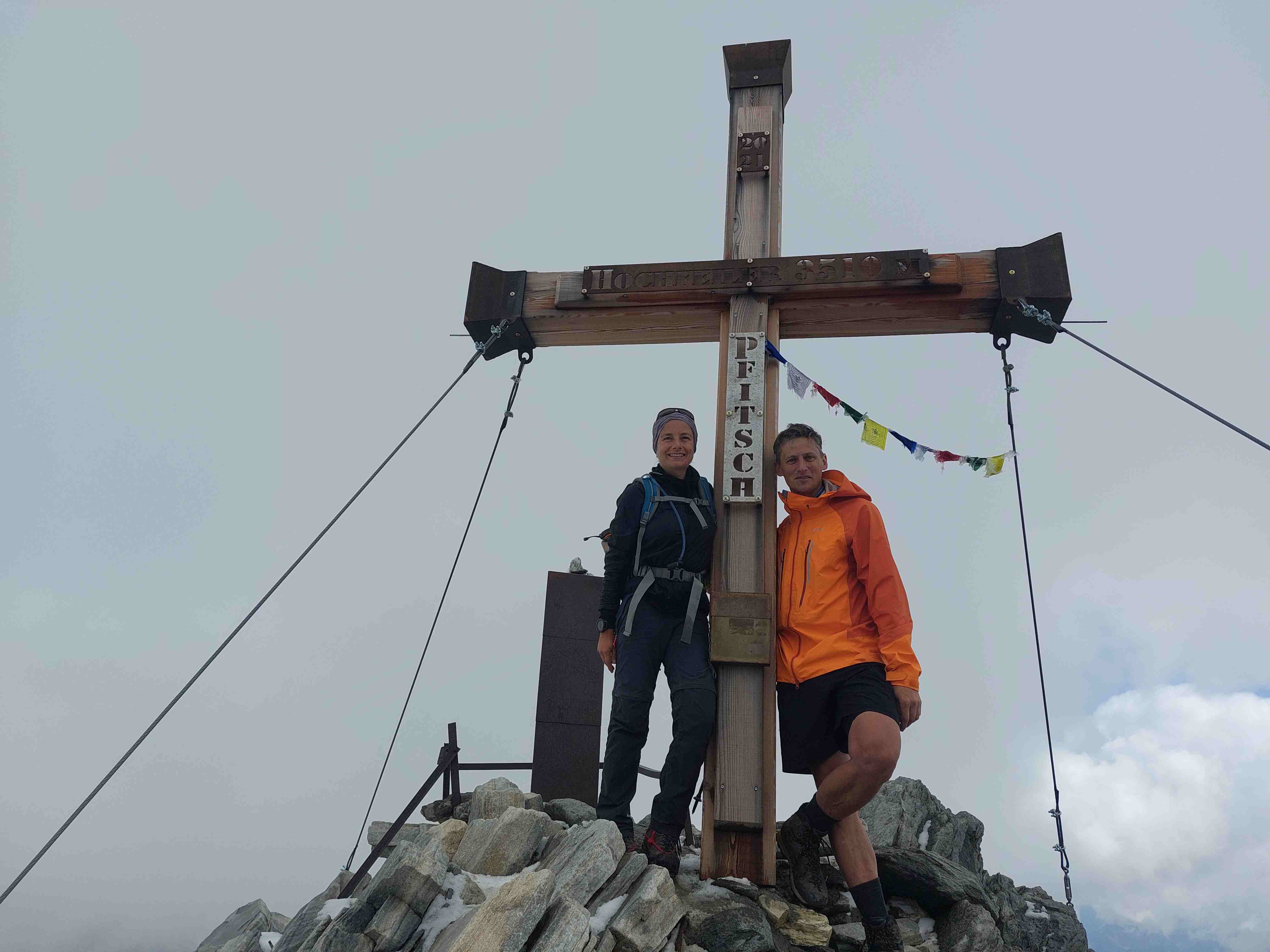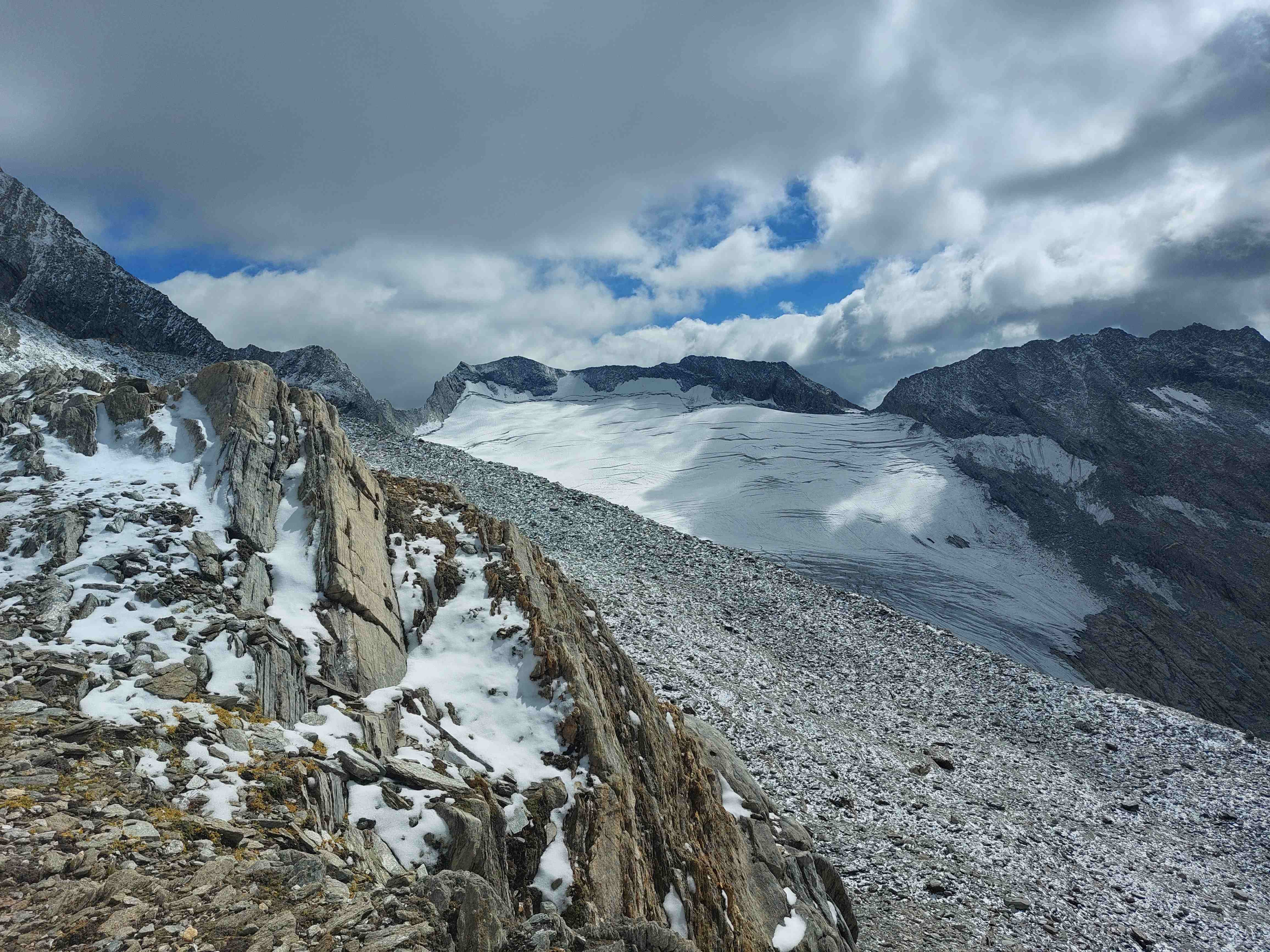 Über losen Schotter und Platten geht der Weg weiter, da es die Nacht vorher etwas geschneit hatte, war hier durchaus Vorsicht geboten, allerdings entschieden wir für uns, dass es, zumindest im Anstieg ohne Spikes oder Steigeisen gehen sollte. Irgendwann zeigt sich dann auch erstmals das Gipfelkreuz und man bekommt einen Eindruck ,wie steil das letzte Gradstück sein wird, dass man im Normalfall eher nordseitig geht. Hier definitiv der Hinweis, dass man selbst im Hochsommer damit rechnen muss auf Firn oder gar gefrorenem Schnee zu treffen, somit macht es sicherlich Sinn, mindestens Spikes oder auch Steigeisen für alle Fälle mit einzupacken, vor allem, wenn es dann in Richtung Abstieg geht, den man über den gleichen Weg unternimmt. Auf den letzten 100 bis 200 Höhenmetern machte sich bei mir dann immer mehr die Höhenluft bemerkbar, vor allem da ich auch eine leichte Erkältung mit mir rumschleppte. Somit war der Schlussanstieg für mich der härteste Abschnitt des Tages, immer wieder musste ich kurz inne halten um etwas Erholung zu suchen, aber Umkehren war keine Option. Nach gut 4 Stunden war der Gipfel dann erreicht. Bei klarem Wetter eröffnet sich auf 3509m sicherlich ein spektakuläres Panorama, aber von Norden her, zog es immer mal wieder zu. Trotz allem konnte kurz einmal der Schlegeisspeicher erblickt werden und im Südwesten zeigten sich hin und wieder mir bekannte Gipfelprominenz der Dolomiten: Langkofel, Plattkofel, die Geislergruppe, Seiser Alm und so weiter.