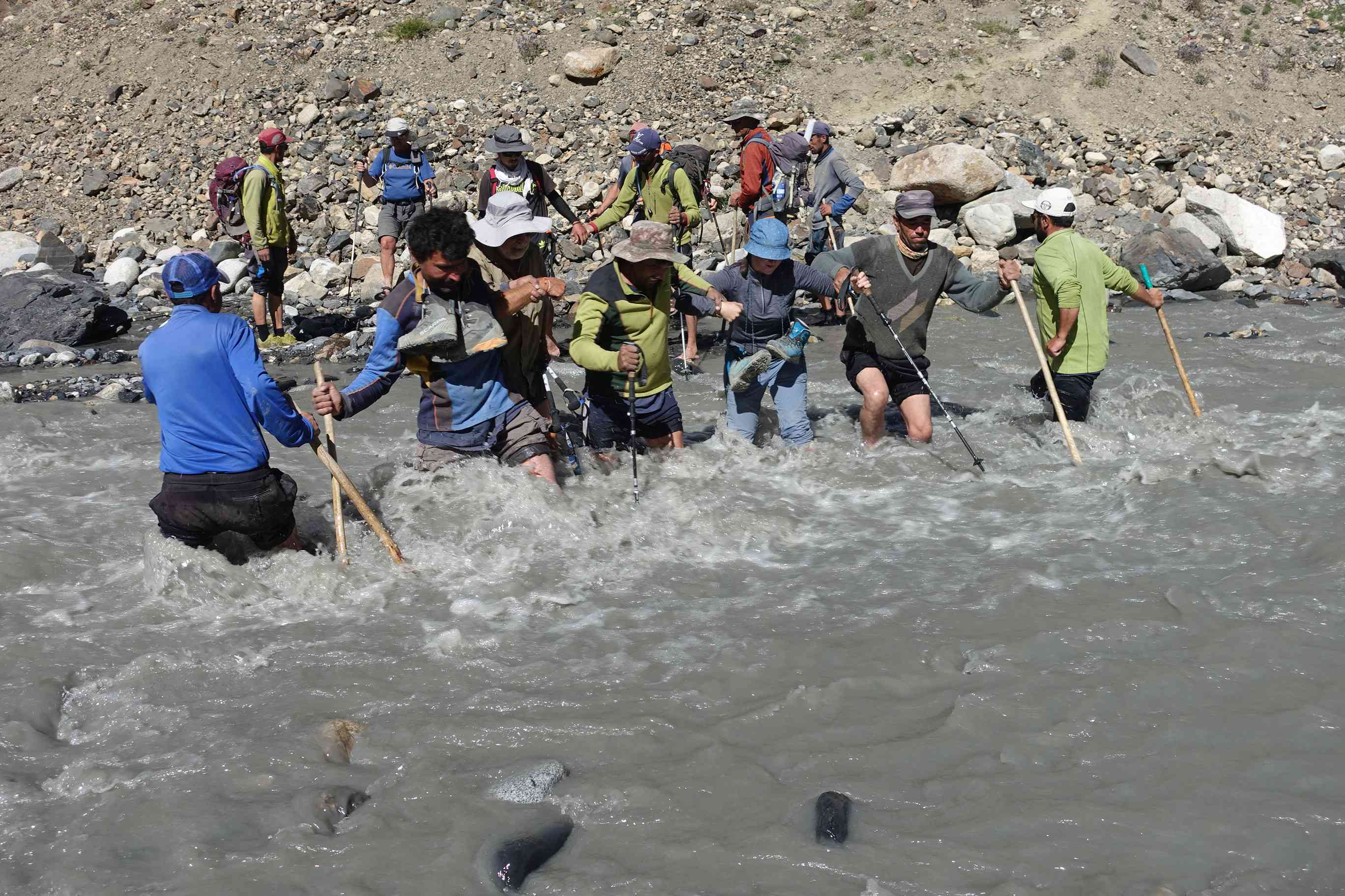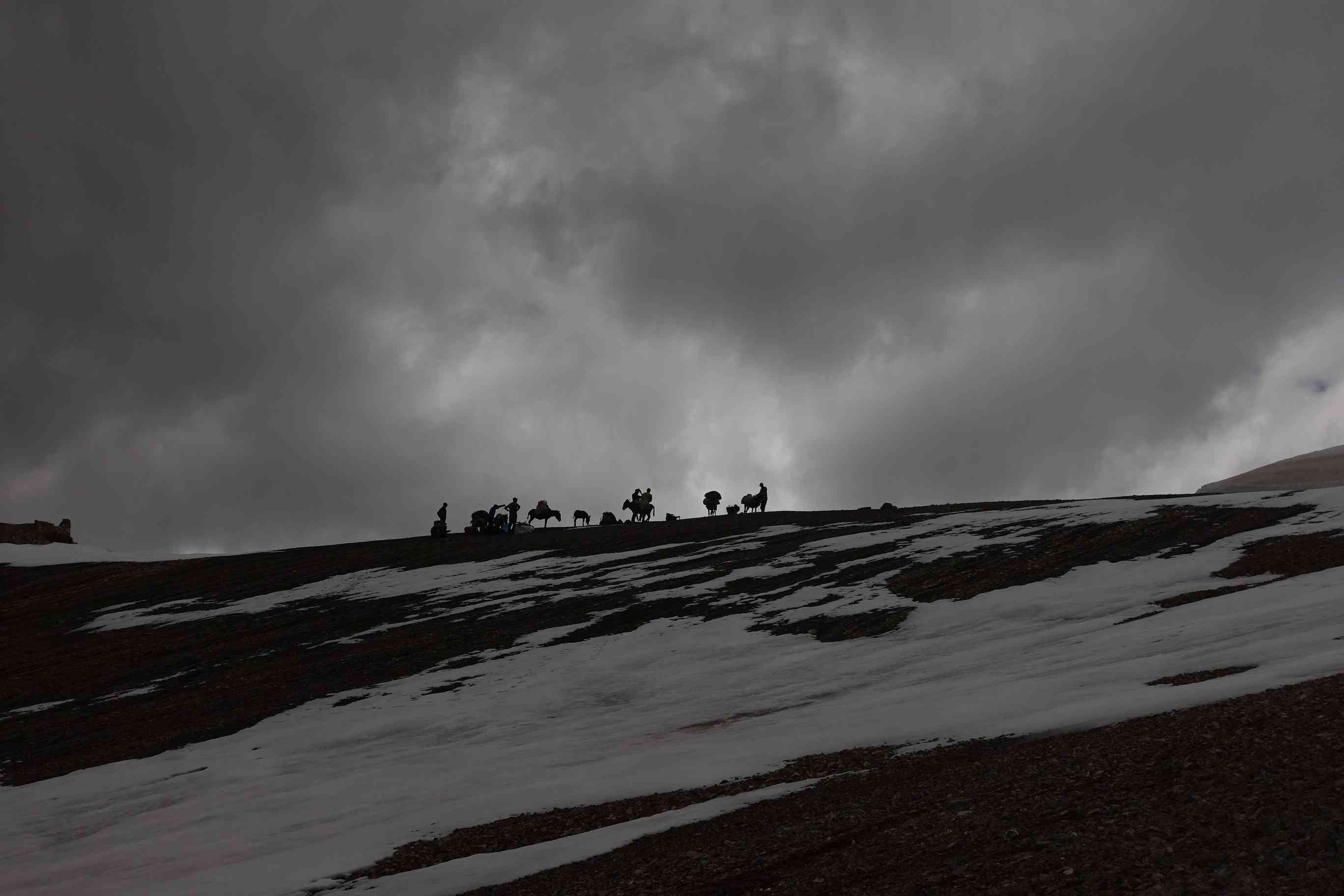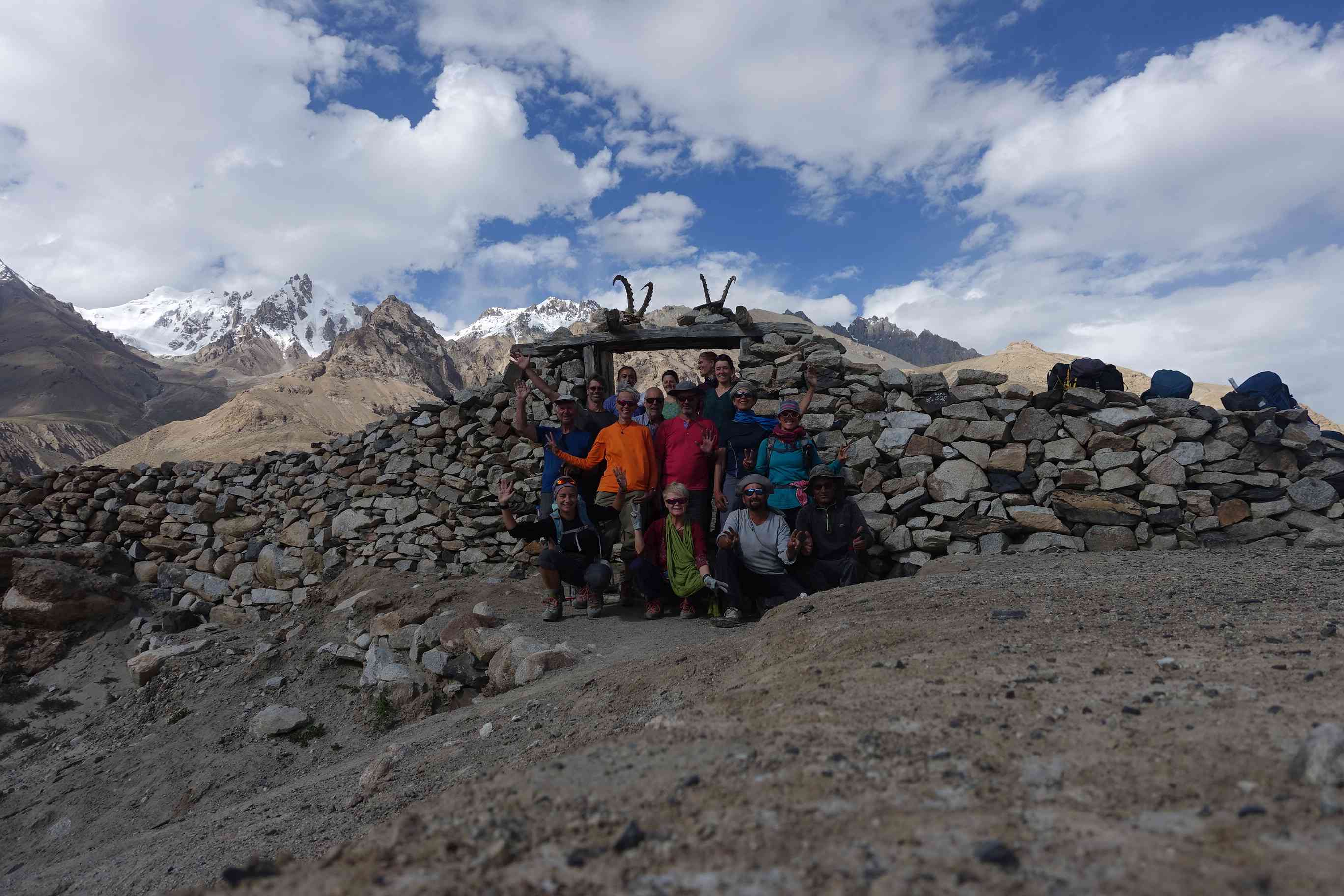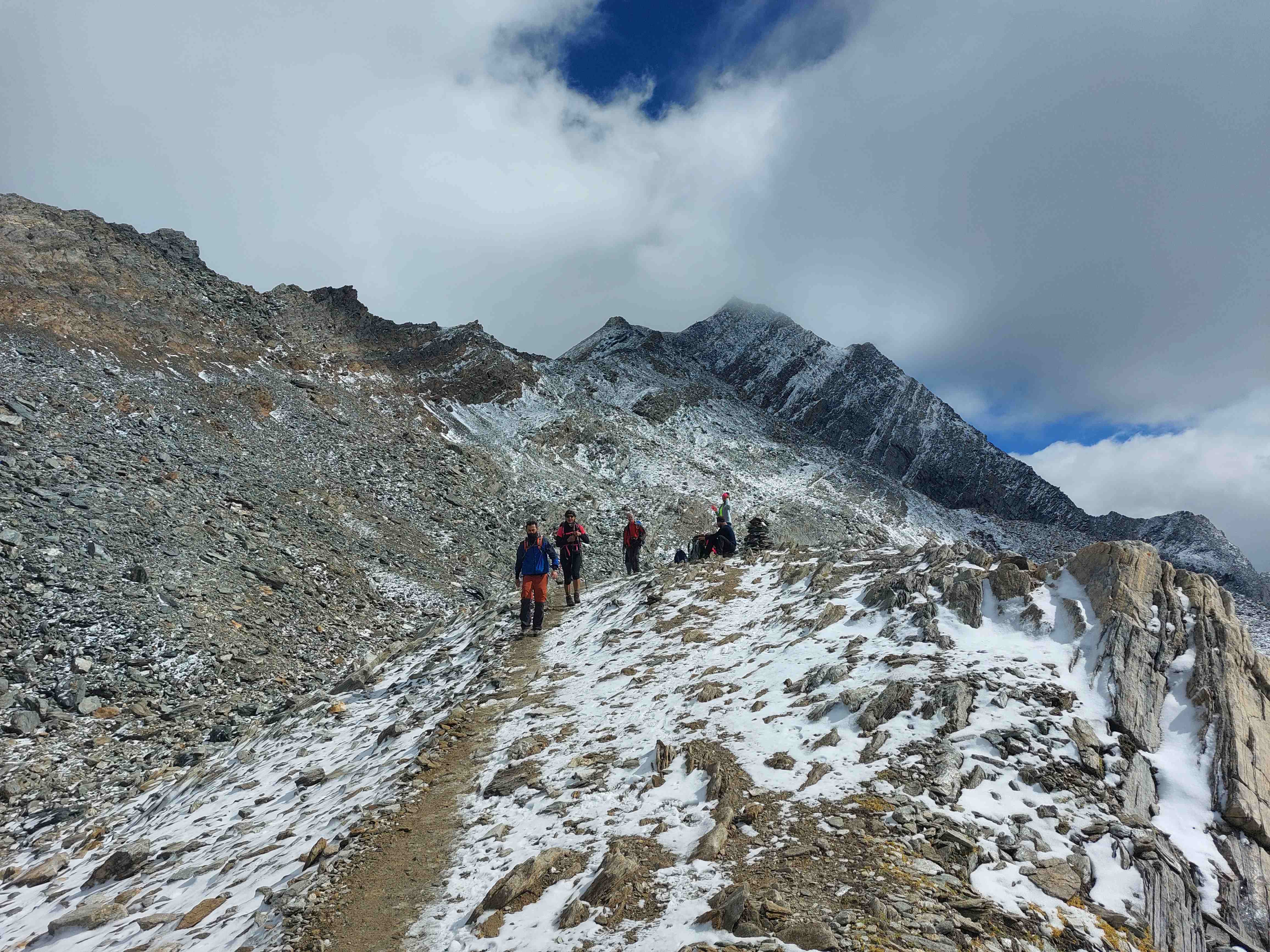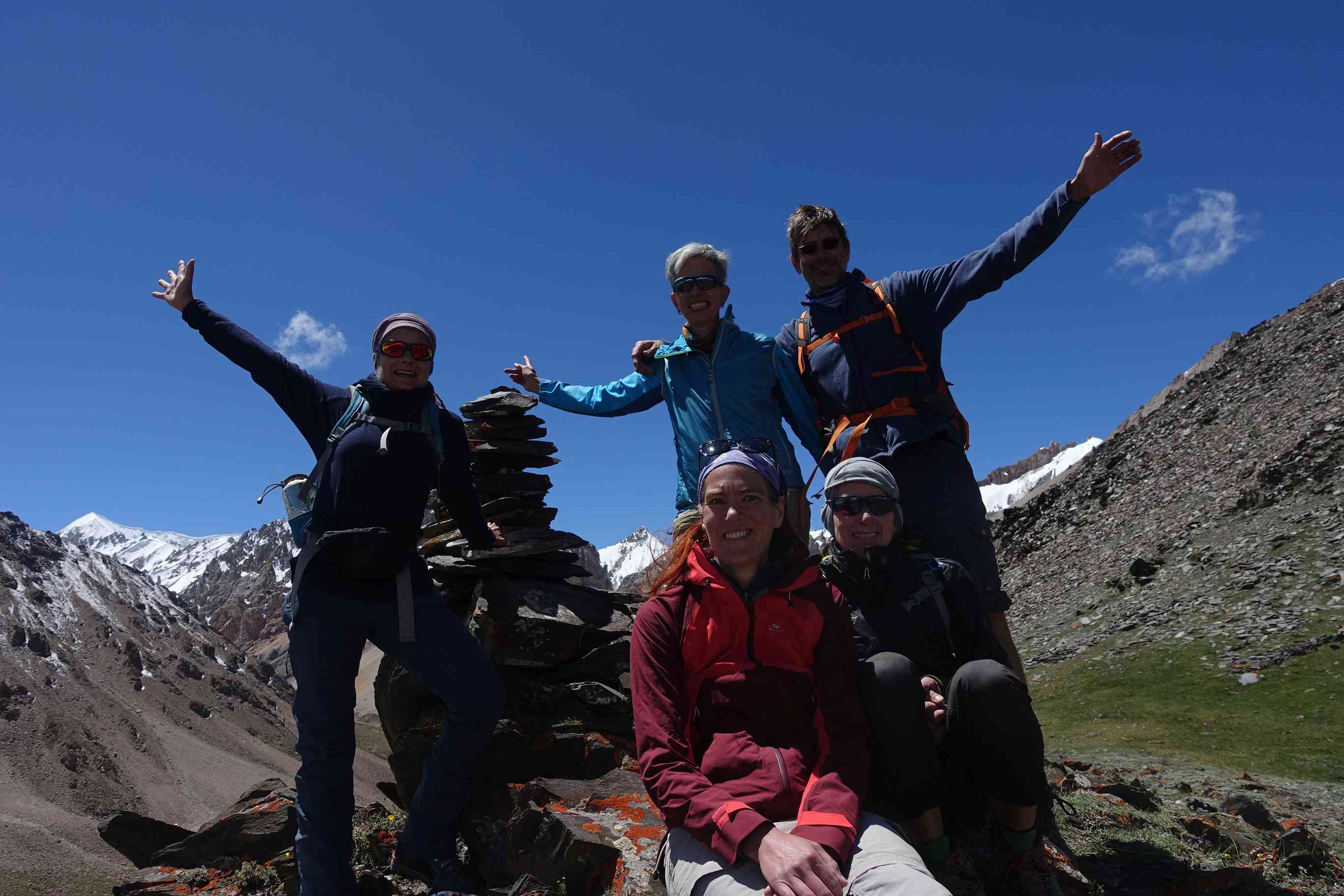 Um 5 Uhr klingelte der Wecker. Aufstehen, packen, Frühstück, los um 6.30 Uhr. Ca. 1000Hm hoch und runter auf 10km lagen vor uns, dabei sollten wir über den 5346m hohen Paß kommen, von dem der Abstieg recht umstritten schien. Johanna ging es noch immer nicht gut. Zumindest gab es früh eine kleine Beilegung der Meinungsverschiedenheiten vom letzten Tag. Mein Hals war noch immer nicht gut, ansonsten aber alles bestens. Erst ging es weit ins Tal rein, dann ein Flußbett hoch, auch über kleine Schneefelder. Unsere Mittagspause bereits um 10 Uhr an dem Platz, an dem noch ein Lager ursprünglich vorgesehen war, aber hier wäre es wohl sehr schwierig geworden, mit so vielen Leuten Platz zu finden. Nichtmal zum Essen konnten wir alle gemeinsam sitzen. Im Anschluß ging es noch 400 Meter steil nach oben zum Paß. Überwältigt kam ich oben an mit Blick ins Tal, in das wir nun absteigen sollten. Zunächst aber wurden Fotos gemacht und die anderen tanzten und sangen.