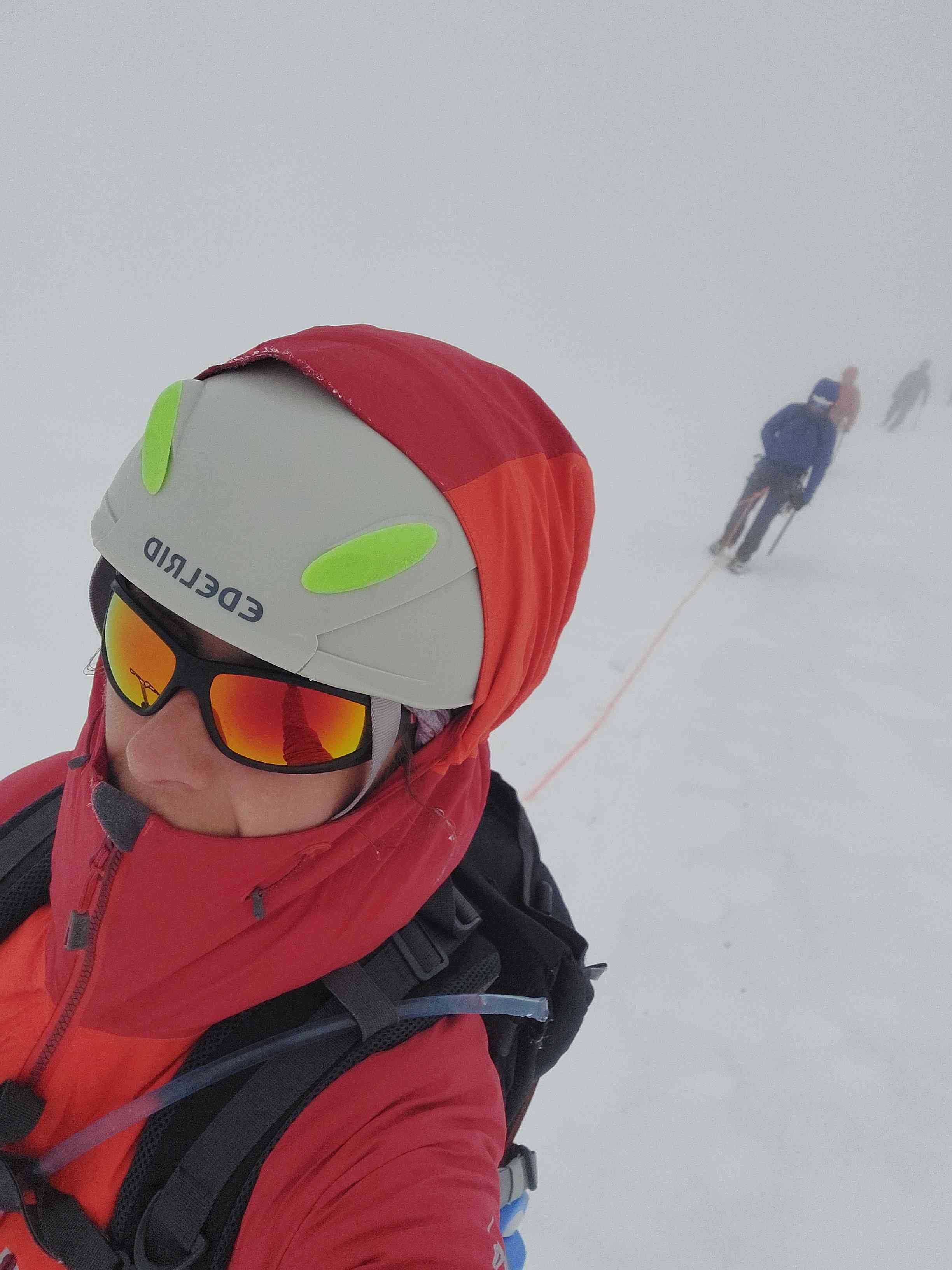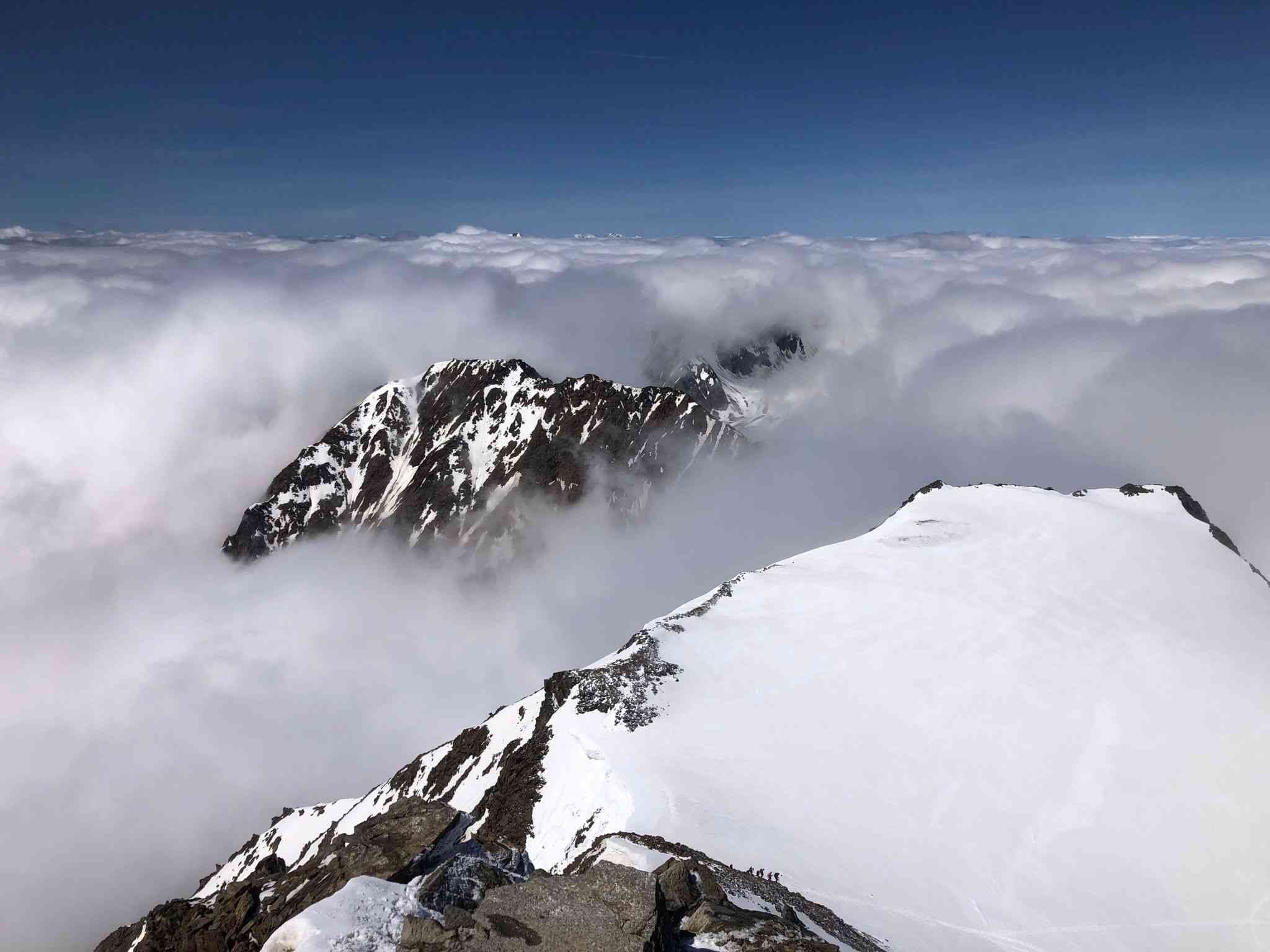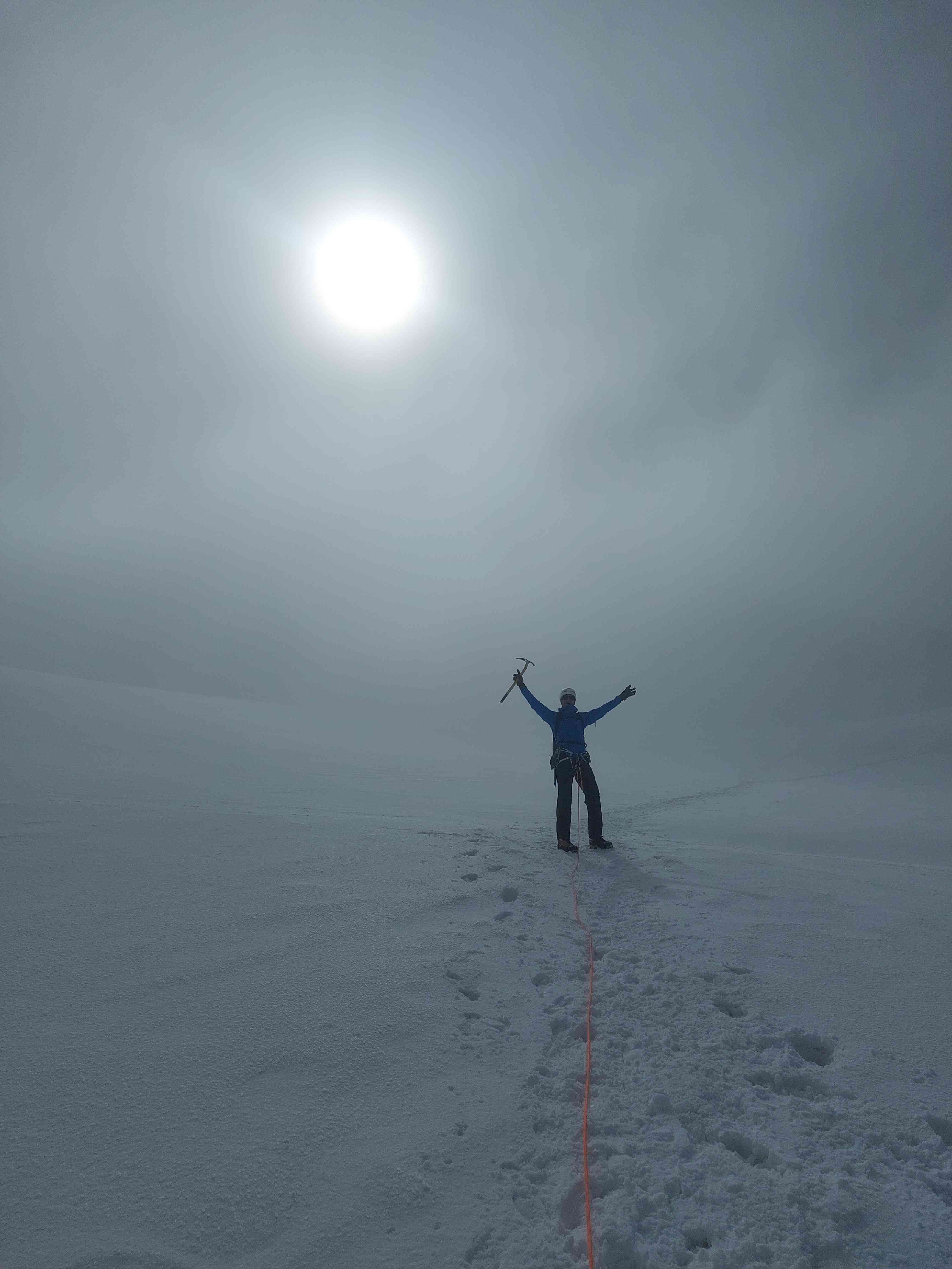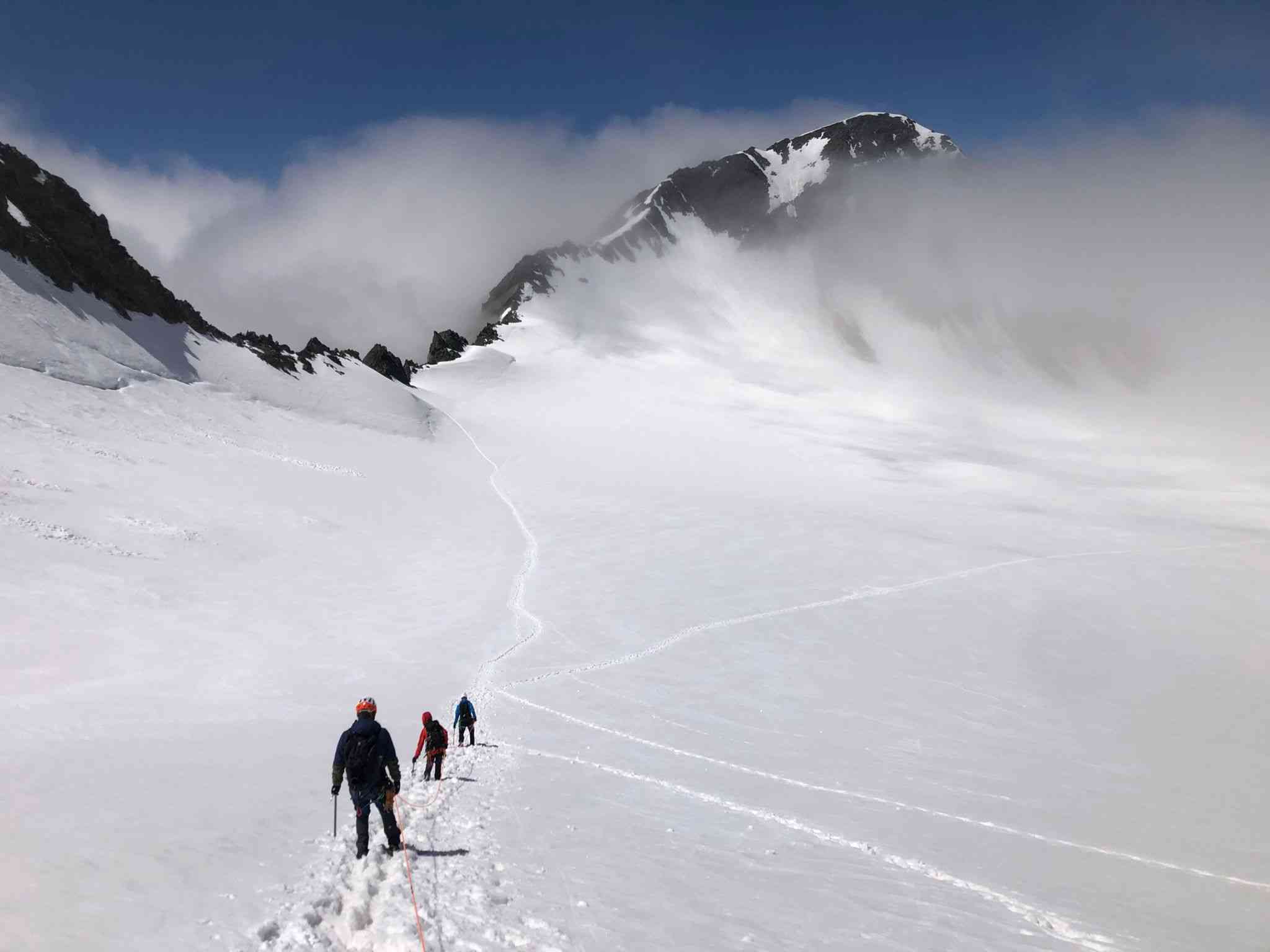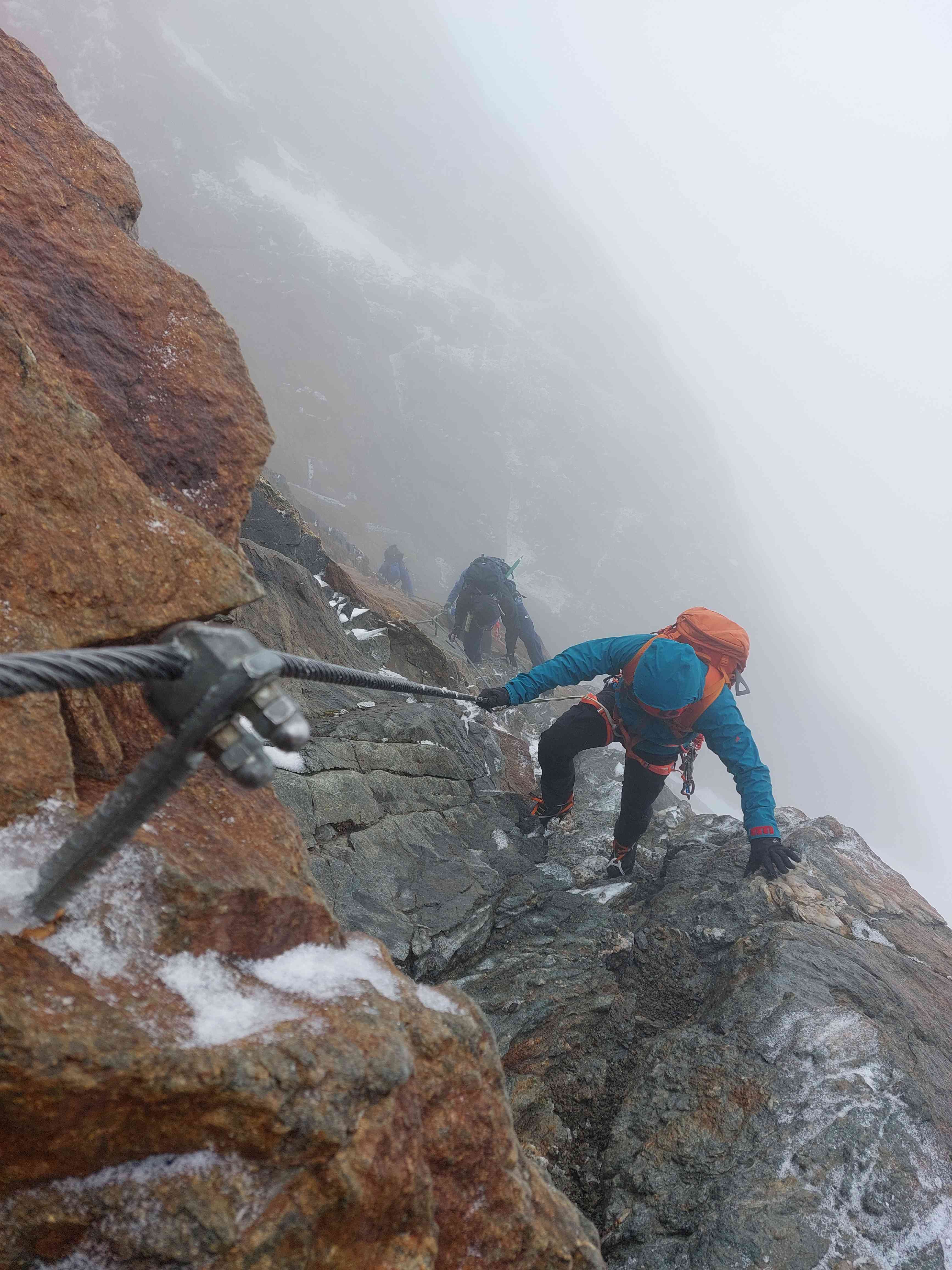 Nachdem wir dieses Gefühl und die Ausblicke ausgiebig genossen hatten, begaben wir uns in den Abstieg, den selben Weg in umgekehrter Richtung wieder zurück. Angeseilt auf dem Gletscher liefen wir langsam wieder in die Wolke hinein und am Joch war es wieder dicht.