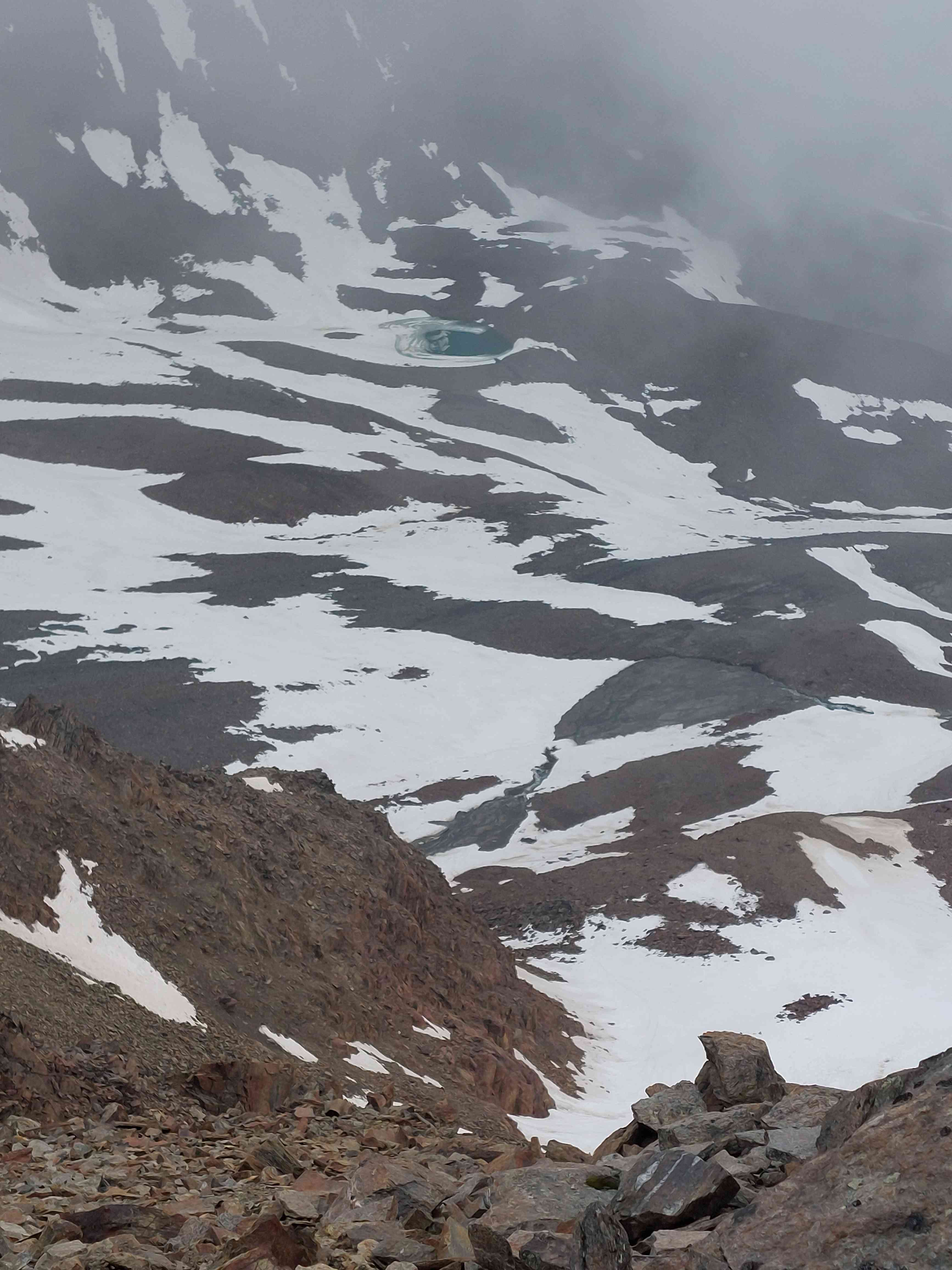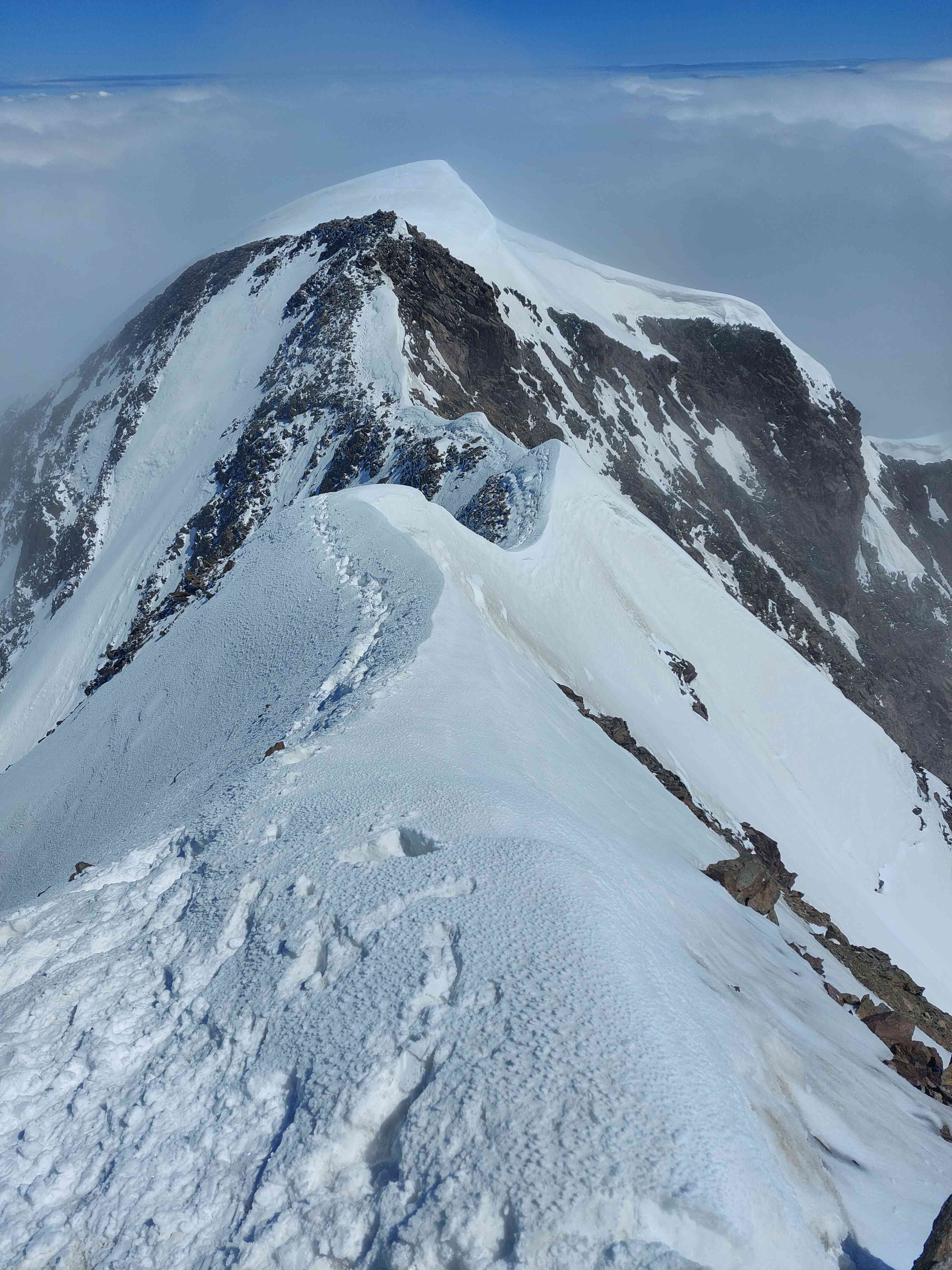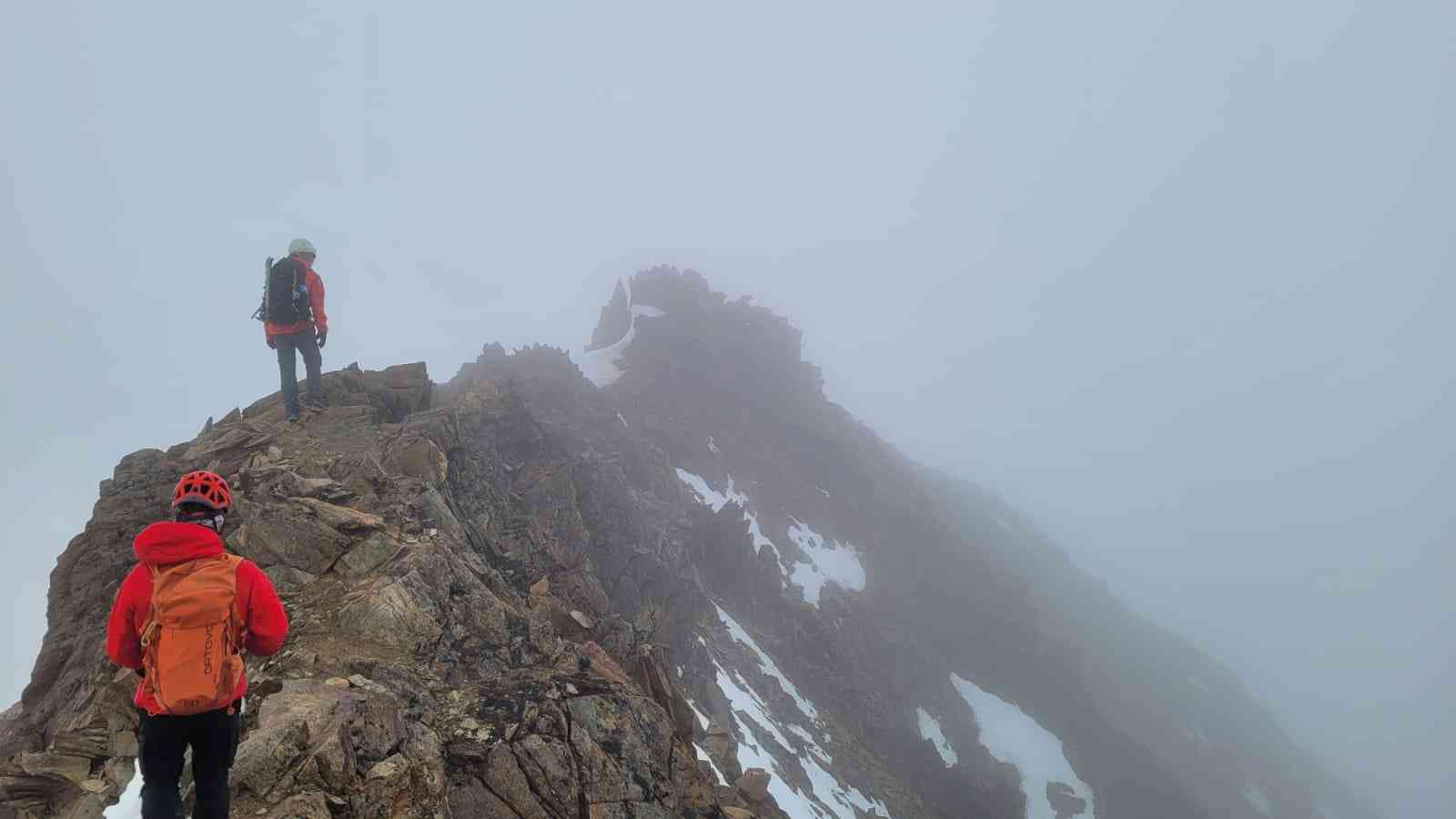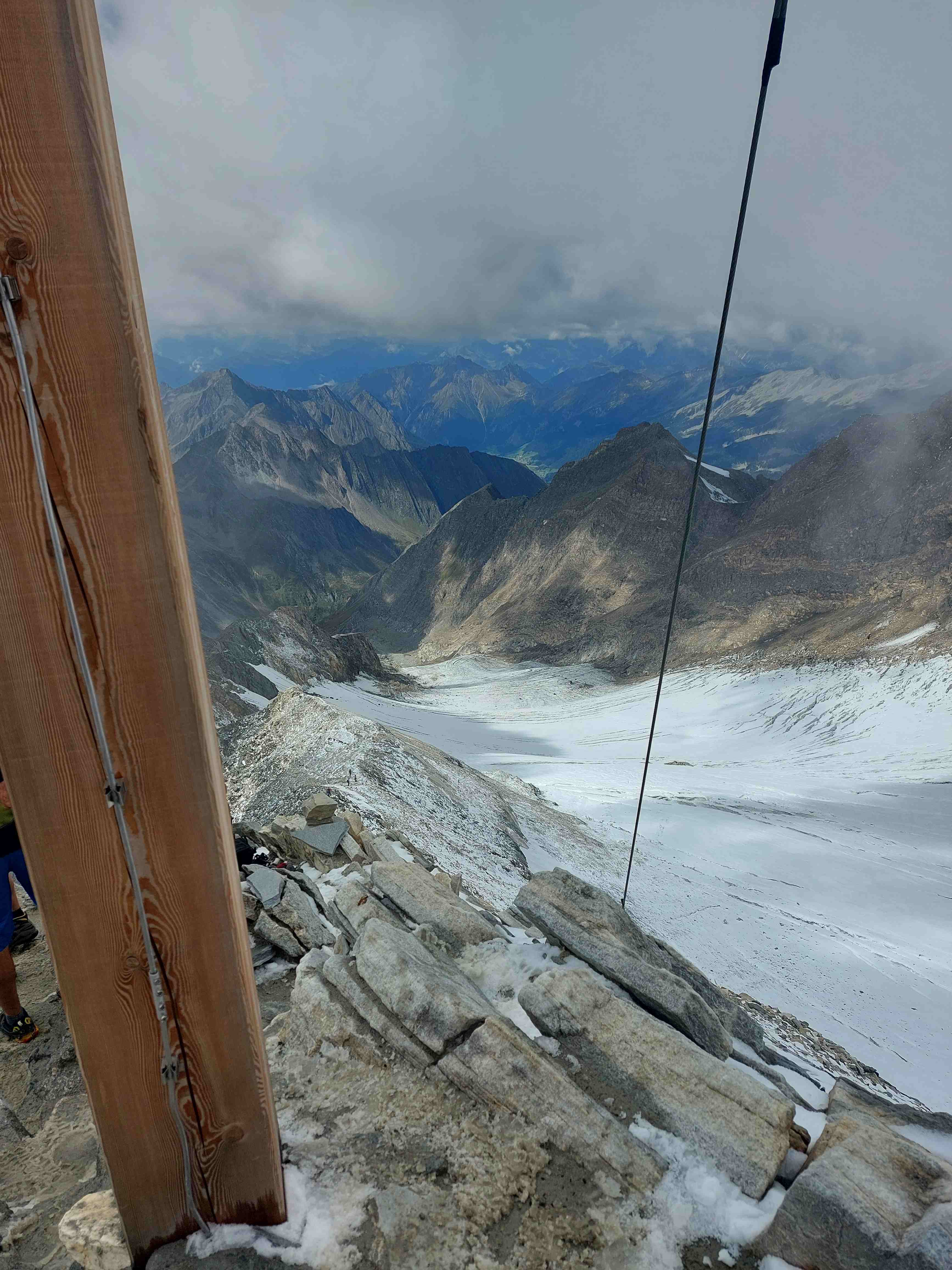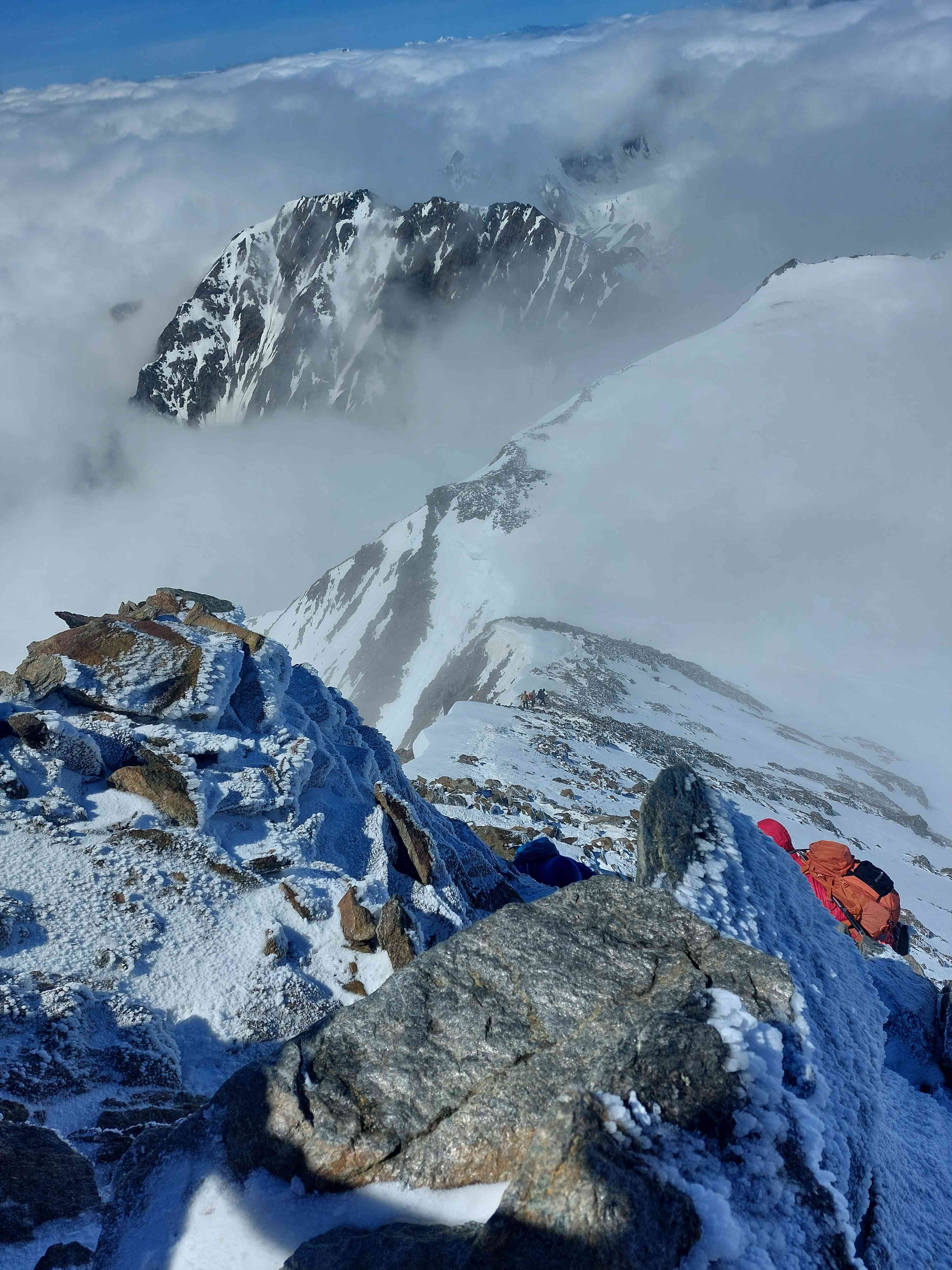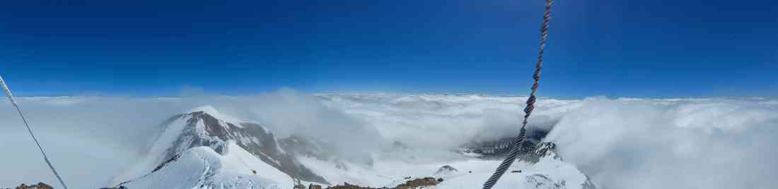 Nachdem wir dieses Gefühl und die Ausblicke ausgiebig genossen hatten, begaben wir uns in den Abstieg, den selben Weg in umgekehrter Richtung wieder zurück. Angeseilt auf dem Gletscher liefen wir langsam wieder in die Wolke hinein und am Joch war es wieder dicht.