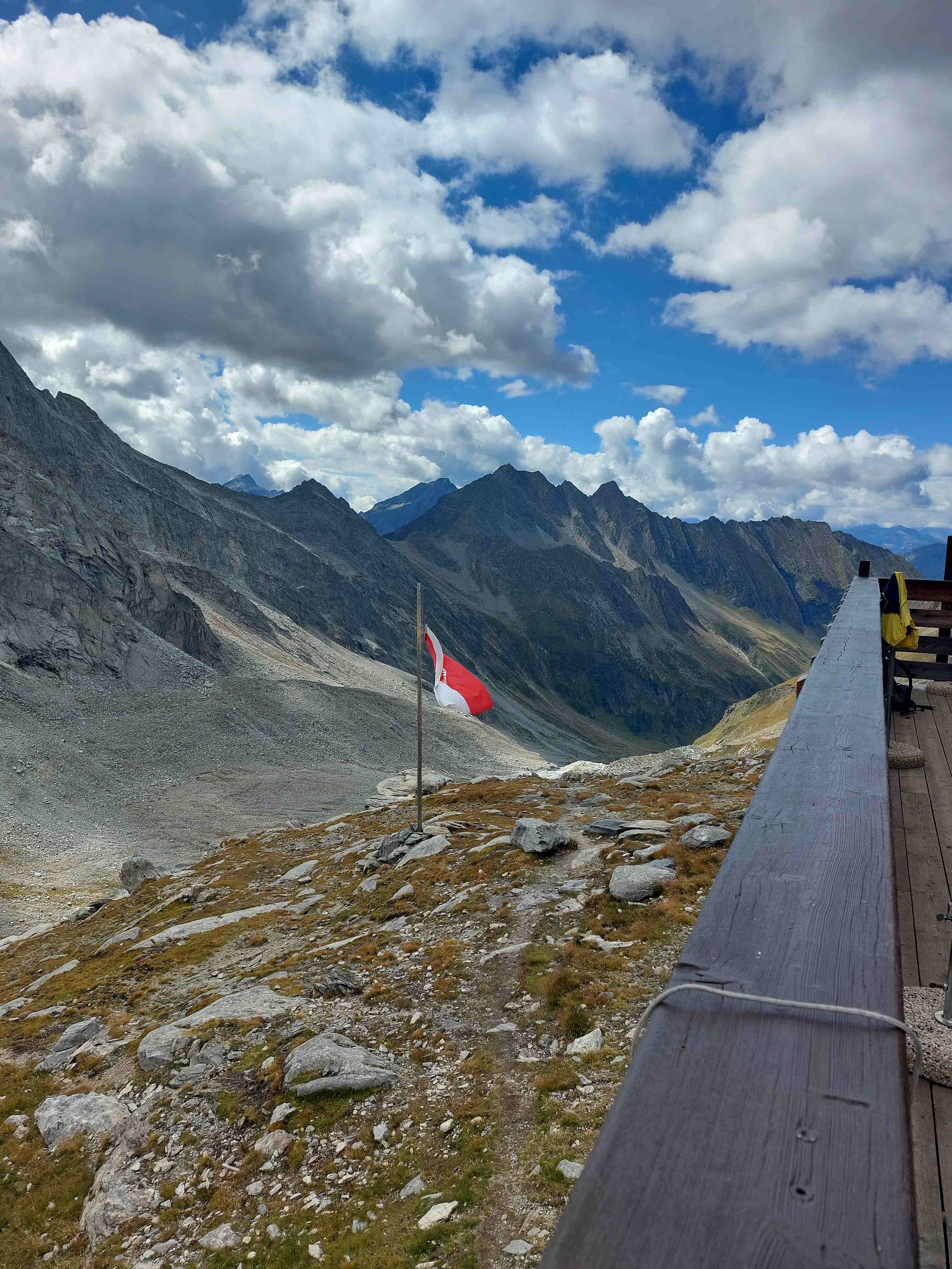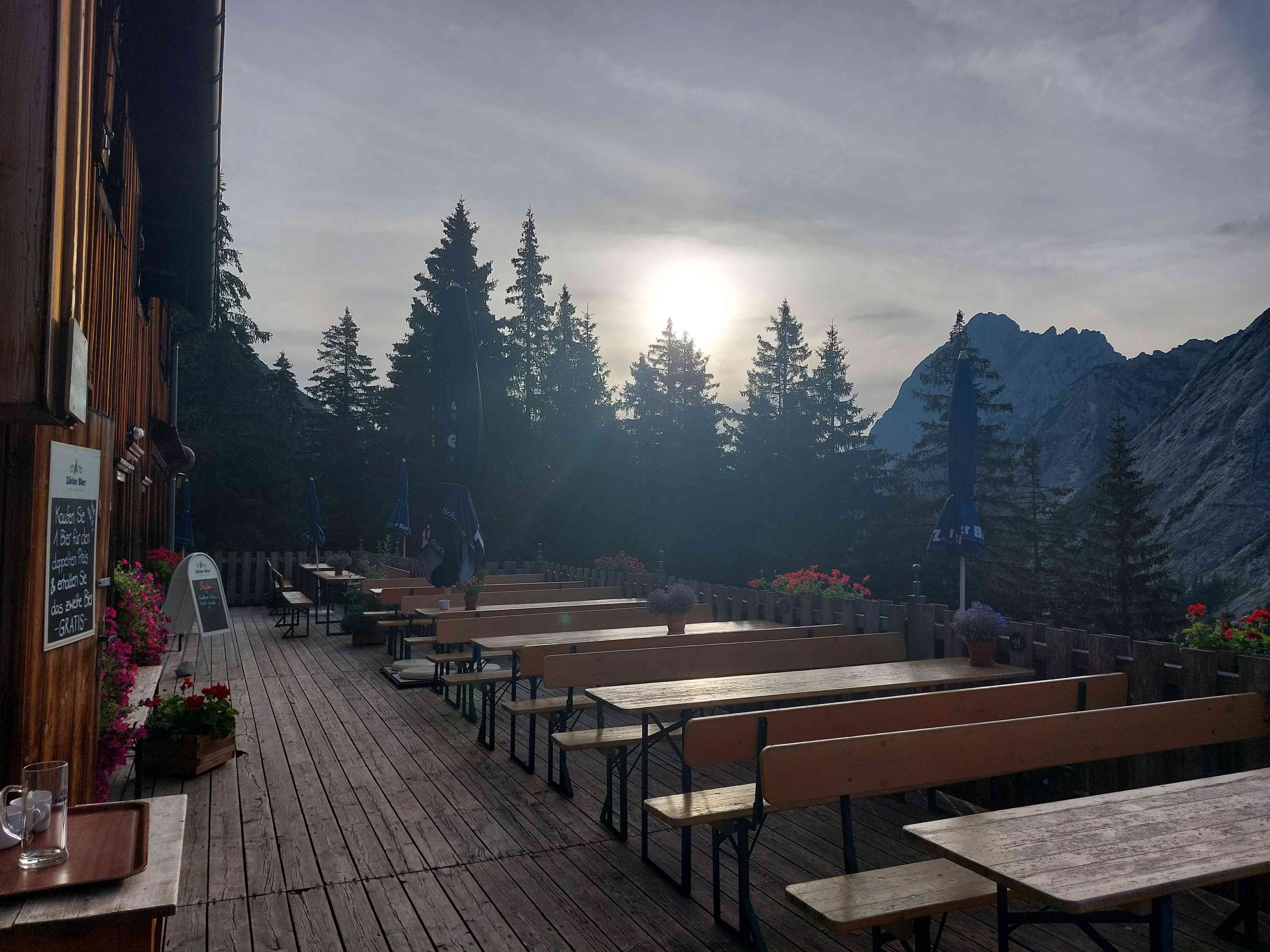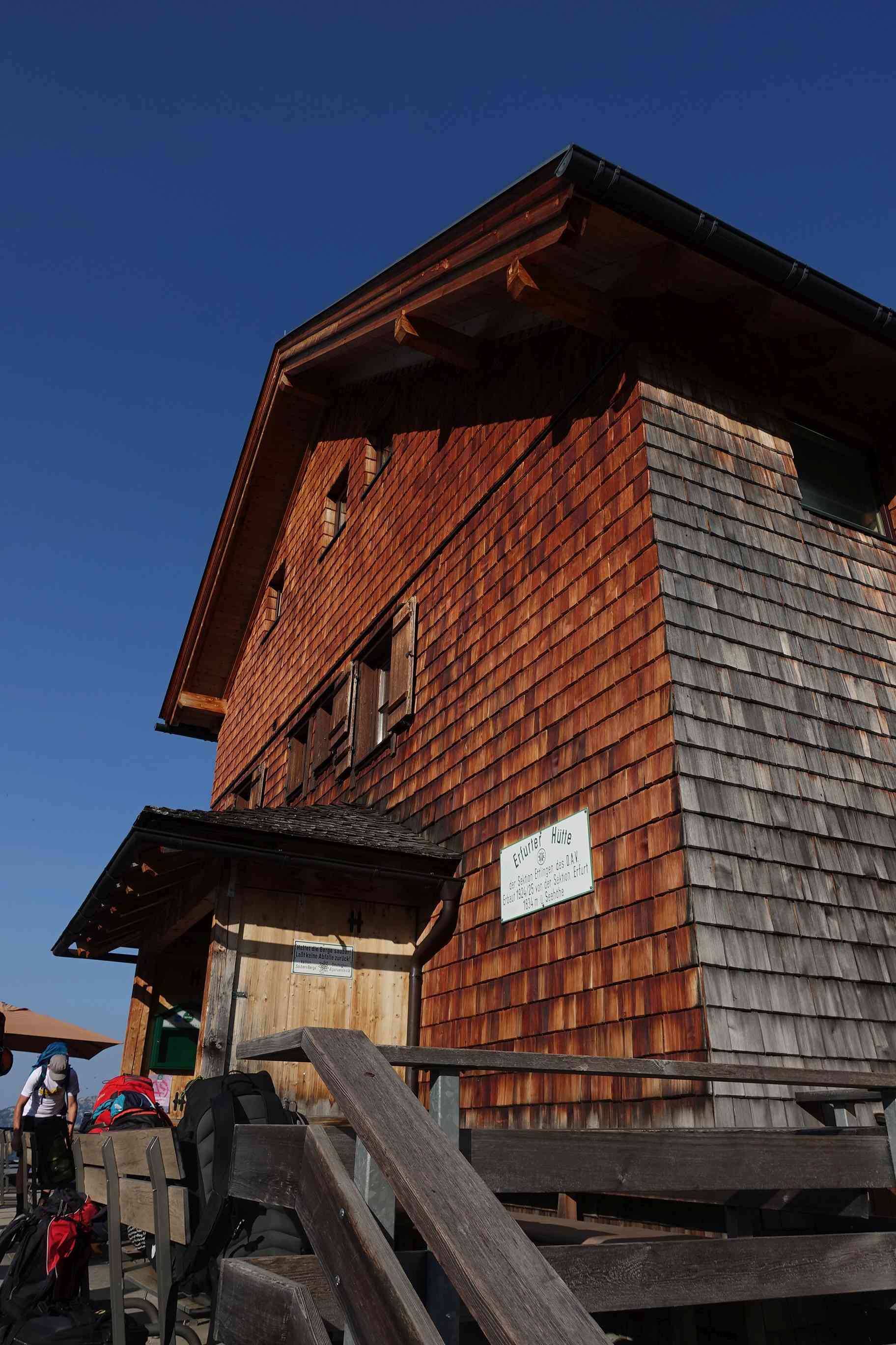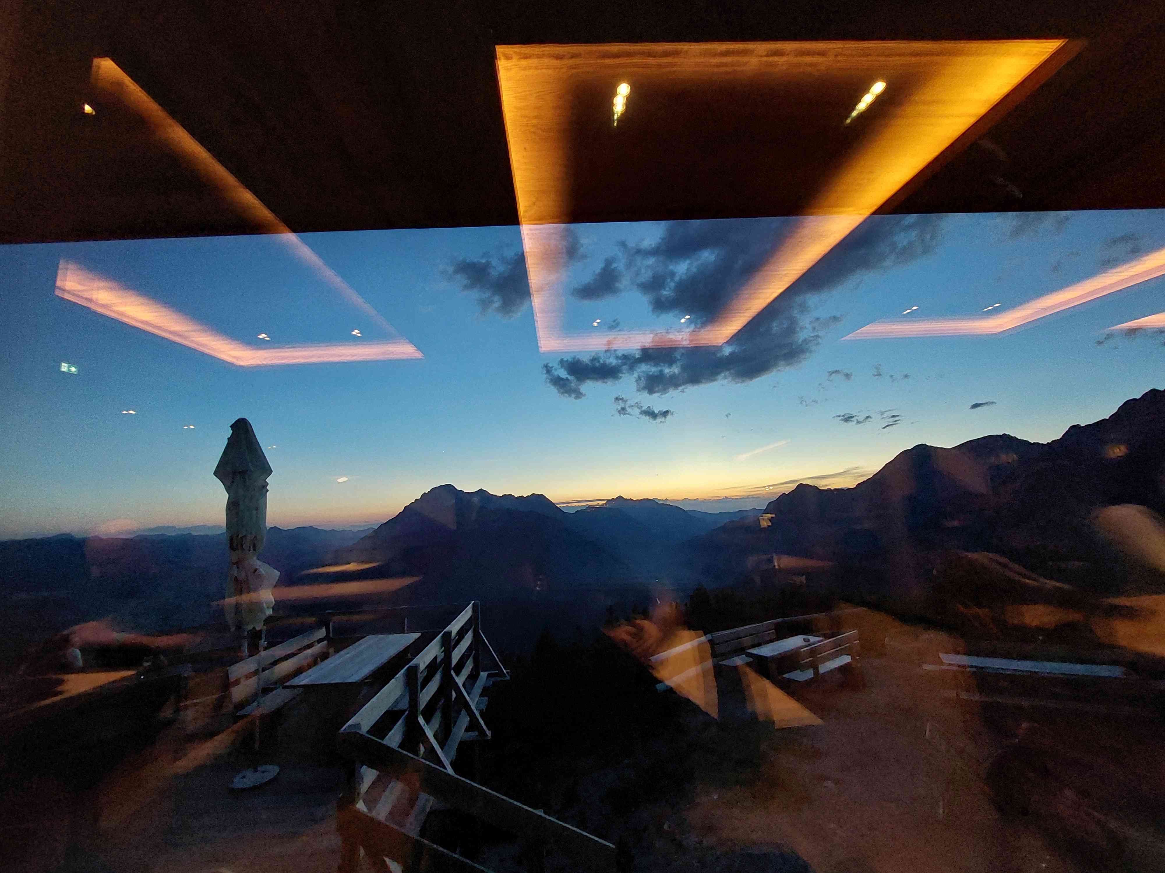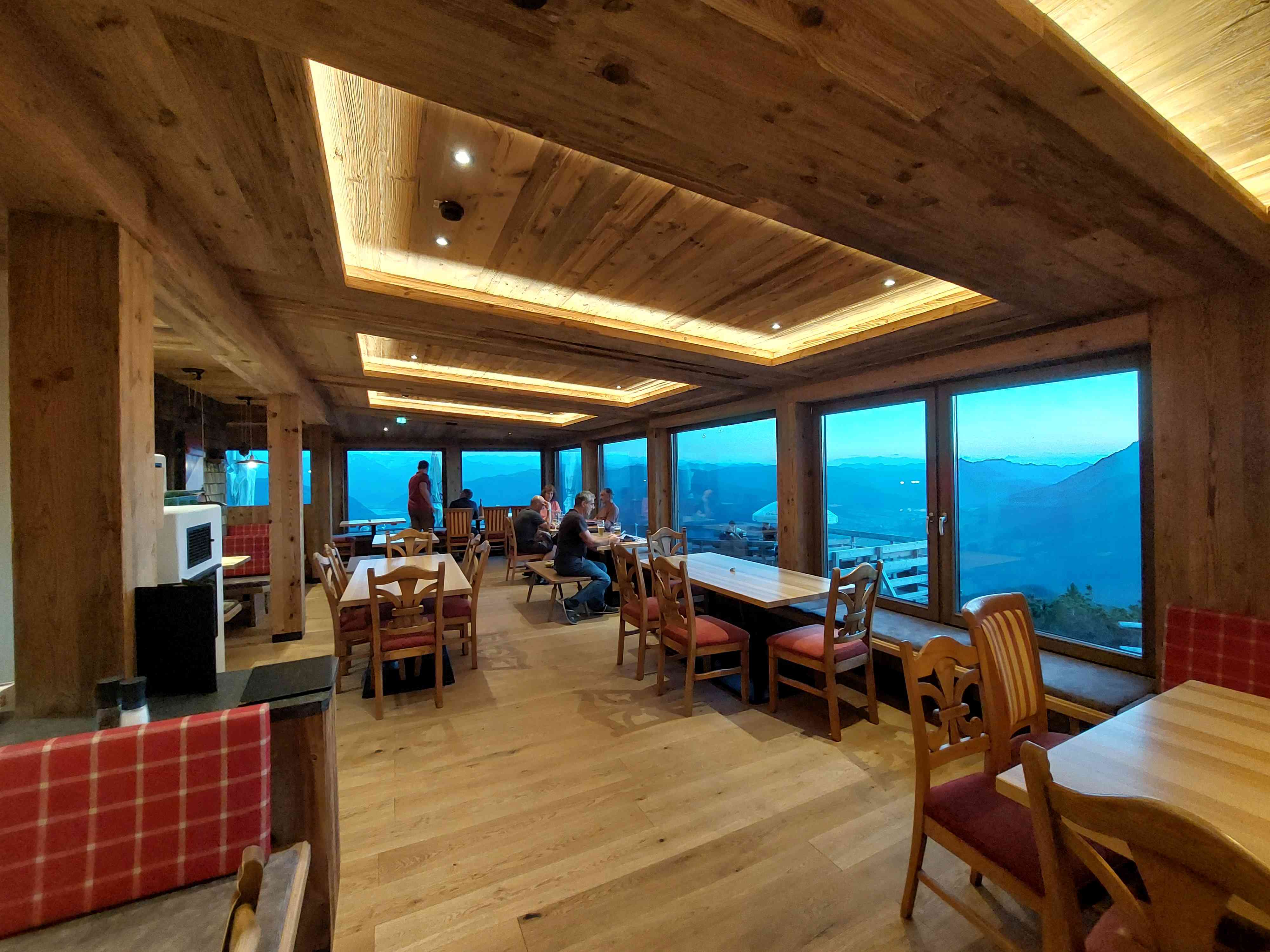 Die Hütte, eine ÖAV Hütte war schon eher eine Nobelunterkunft für diese Bergverhältnisse. Die riesige Sonnenterrasse saß voll mit teilweise sicher noch Tagesgästen. Wir wurden nett empfangen, meldeten uns vor an und saßen dann erstmal noch in der Sonne, um was zu trinken und zu essen. Danach checkten wir ein und machten uns frisch. Hatten wir eigentlich Lagerplätze bestellt, so quartierte man uns in einem 6er Zimmer ein mit 3x 2er Koien. Es sollte also jeder zwei „Betten“ für sich haben. Die Hütte mußte wirklich recht neu saniert sein und war toll gemacht mit viel Holz wie die meisten Hütten, aber dennoch irre nobel. Wir schlossen den Abend ab mit einem Bier auf der Terrasse noch im Sonnenuntergang und gingen dann rein hinter das Panoramafenster, von dem aus man noch lange das Rot am Himmel sehen konnte.