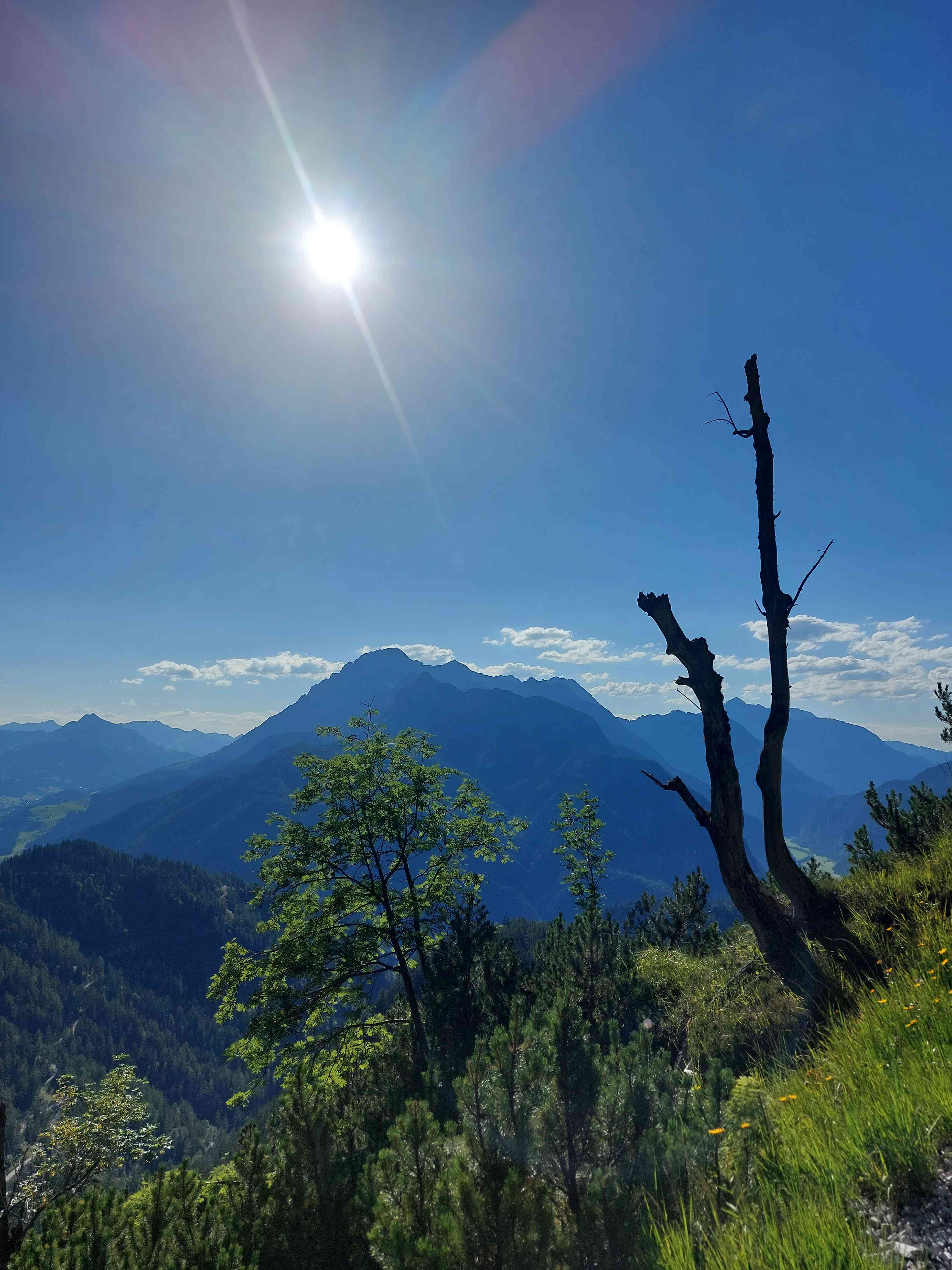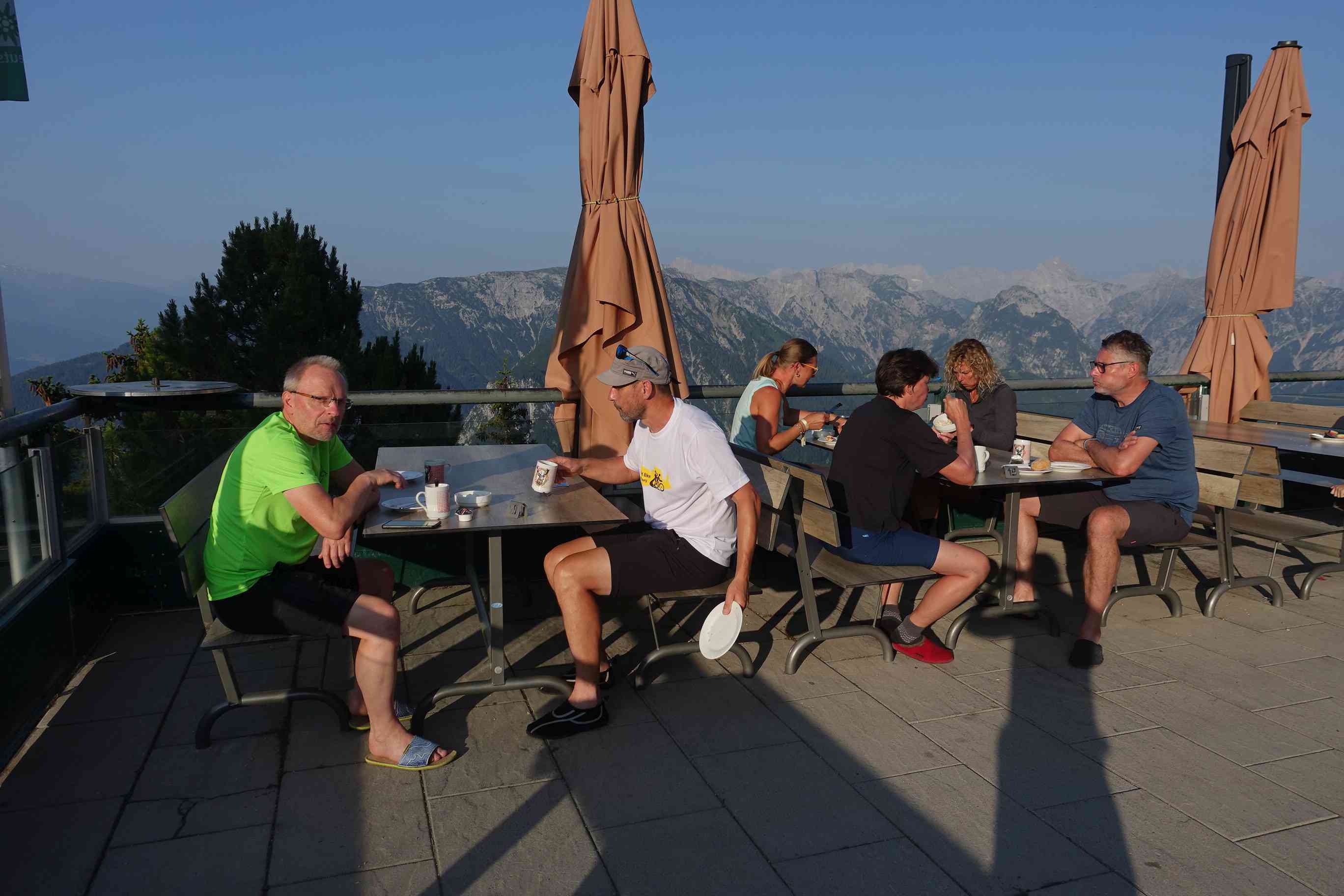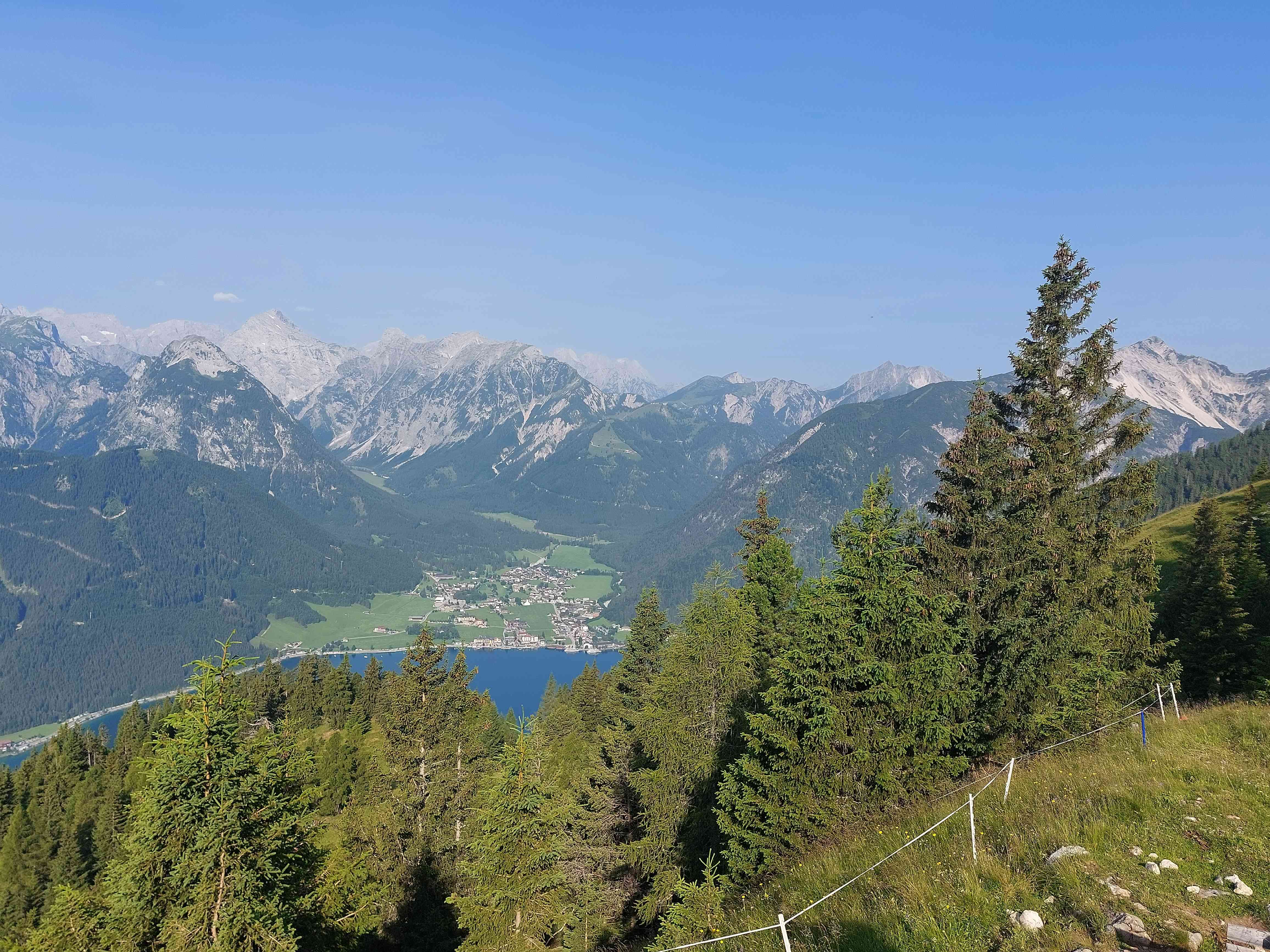 Heute Frühstück um 7 Uhr und wieder draußen in der Sonne. Es war noch wärmer als am Tag zuvor um diese Zeit und auch im weiteren Verlauf des Tages. Wäre heute noch der Rotspitz und der Dalfazer Roßkopf möglich gewesen, so entschieden wir uns dann doch für die entspanntere Runde rüber zur Dalfazer Alm und von dort aus nach unten zum Parkplatz zurück. Auf der Sonnenterrasse der Dalfazer Alm genossen wir nochmal die Berge um uns rum sowie den Achensee von oben, bevor wir abstiegen und mittags beim Auto zurück waren.