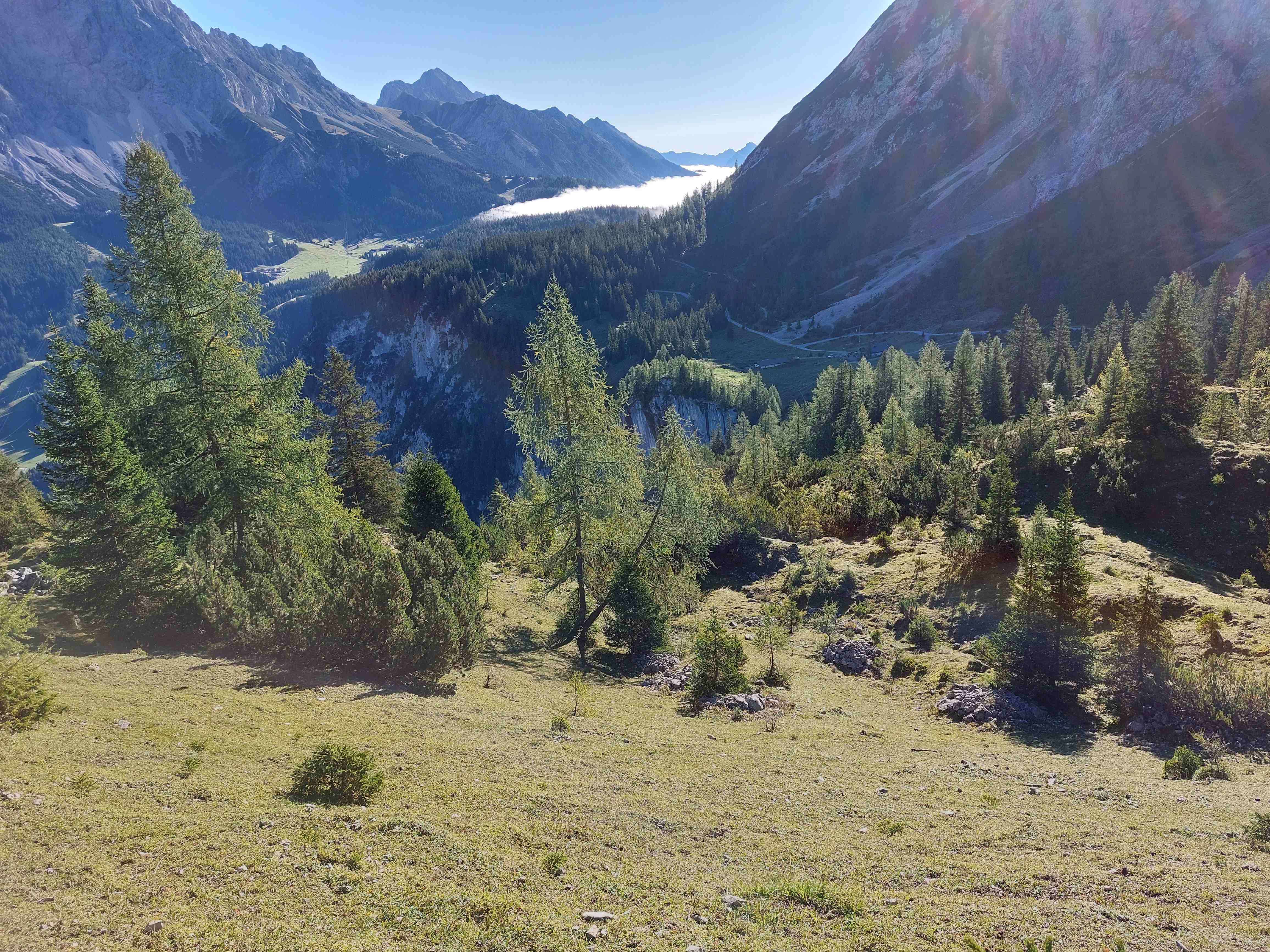 Sobald man dann allerdings die ersten Grashänge erreicht hat, entspannt sich die Situation auch zunehmend, das Gelände wird gutmütiger und kommt wieder einer Bergwanderung gleich. Der Abstieg endet schließlich wieder am Seebensee und final geht es über die oben beschriebenen „Hohen Gänge“ wieder in Richtung Parkplatz. Fazit: wer eine rassige Bergfahrt im ungesicherten Gelände sucht, die sich größtenteils im Ier Grad bewegt, aber auch einige würzige Stellen im II er bietet, ist hier gut aufgehoben. Zu beachten ist allerdings, dass man im Fels stets im sehr ausgesetzten Gelände unterwegs ist und es keinerlei Möglichkeit der Selbstsicherung gibt. Für den erfahrenen Bergsteiger ist die Tour ungesichert eine absolute Genusskletterei, wer am Fels wenig Erfahrung hat, sollte das Ganze mit einem erfahrenen Geher am Kurzseil angehen oder eventuell auch die vielen Standplätze nutzen und generell am Seil klettern.