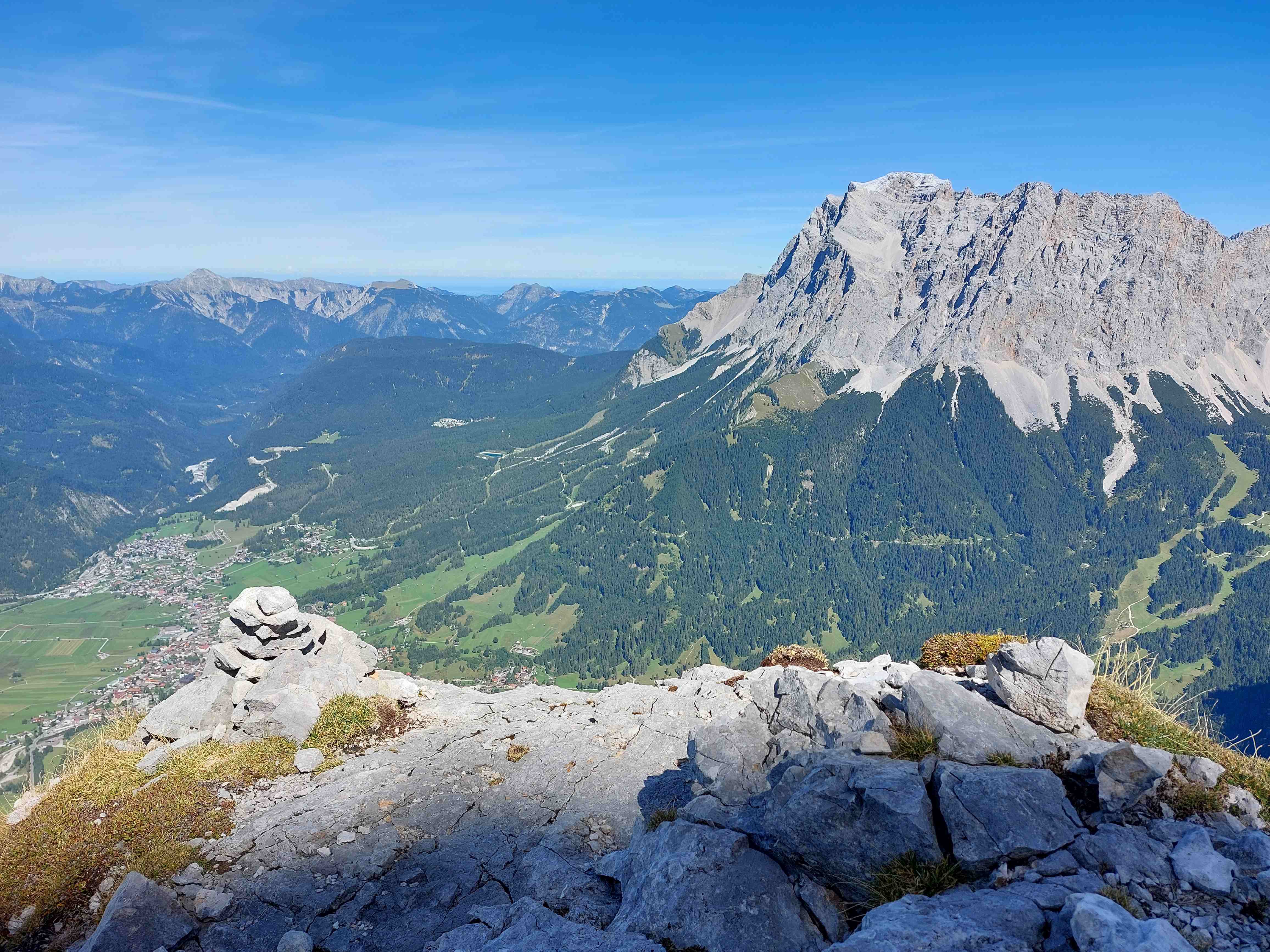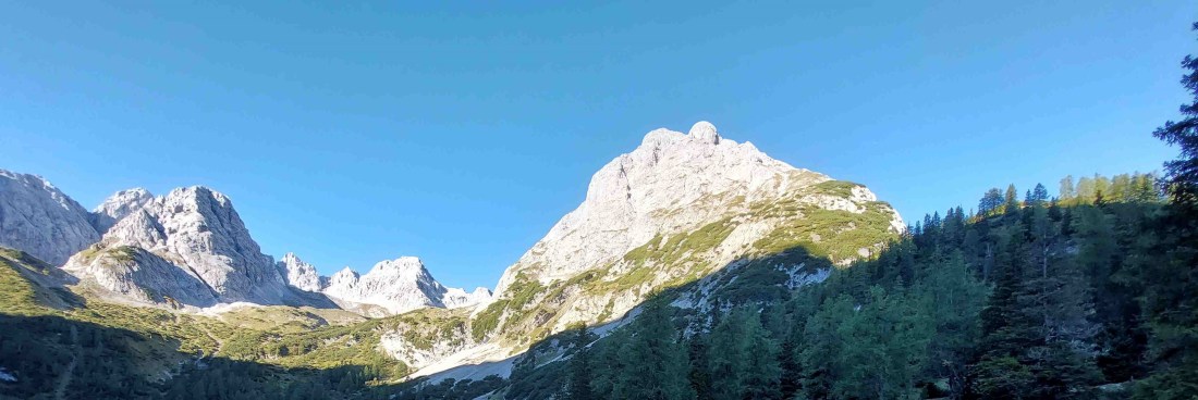 Vor 2 Jahren, während der Besteigung der Zugspitze über den Stopselzieher-Steig, stach mir eine wunderschöne „Pyramide“ ins Auge – die Ehrwalder Sonnenspitze. Noch während des damaligen Urlaubs in Ehrwald kam der fixe Gedanke auf, dort oben auch einmal stehen zu wollen, also google bemüht und schnell war klar, so unerreichbar wie der Gipfel auf den ersten Blick scheint, ist er gar nicht einmal. Der erste Versuch Anfang Juni 2022 scheiterte ca. 200 Höhenmeter unterhalb des Gipfels am Wetter, damals zeigten sich ringsherum bedrohliche Gewitterwolken und ein Rückzug war die einzig kluge Entscheidung. Am vergangenen Montag dann war es endlich so weit, zusammen mit Susan vollendeten wir die noch offene Überschreitung der Sonnenspitze, sie war schließlich beim ersten Versuch auch schon meine Mitstreiterin. Der erste Teil bis zum malerischen Seebensee war alt bekannt, über die „Hohen Gänge“, ein leichter Klettersteig (Kat. B), ging es bei traumhaftem Bergwetter die ersten knapp 600 Höhenmeter nach oben, der erfahrene Bergsteiger kann in diesem Abschnitt, der immer mal wieder mit Stahlseil versichert ist, getrost auf das Klettersteigset verzichten, wir hatten es ohnehin nicht dabei, da im weiteren Verlauf oben im Fels der Sonnenspitze ohnehin keine Möglichkeiten zur Selbstsicherung vorhanden sind. Nach guten 1,5 Stunden erreichten wir den See, der noch vollständig im Schatten lag, entsprechend kühl war es hier.