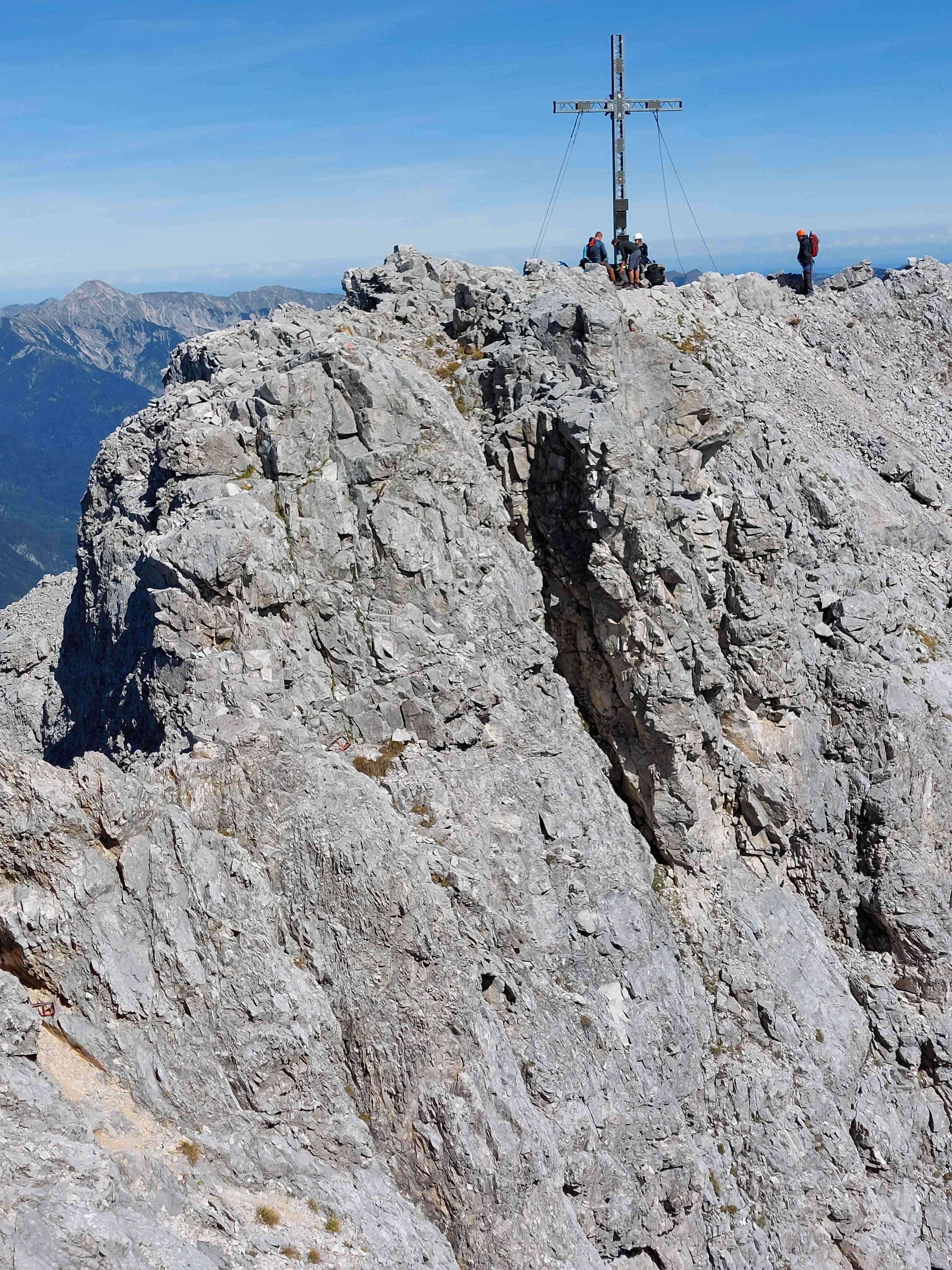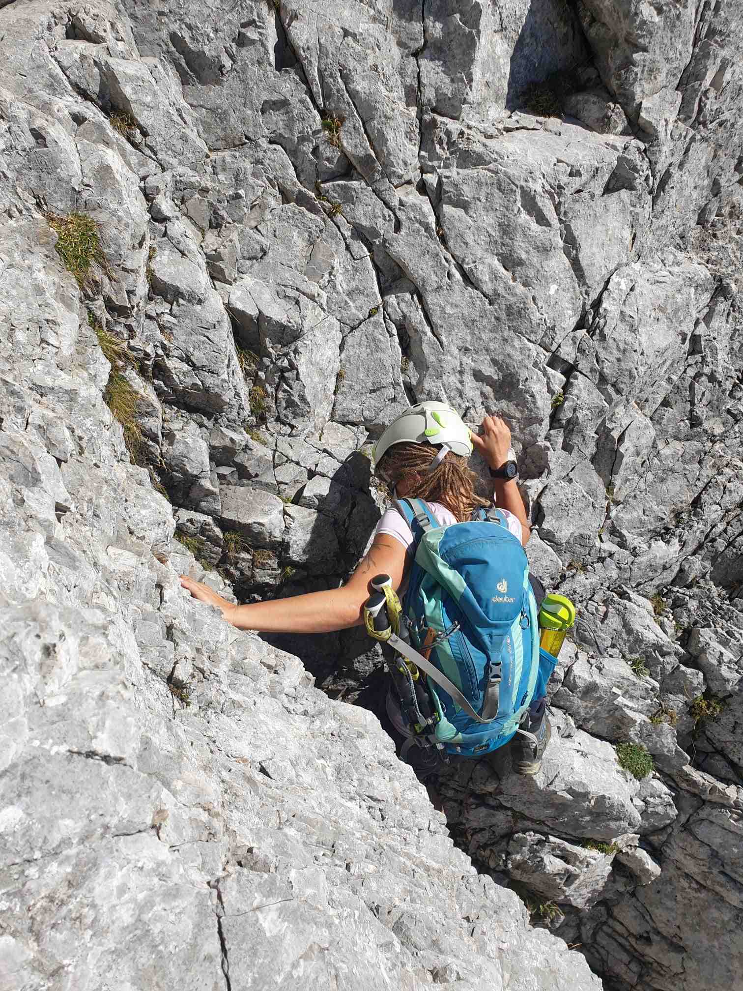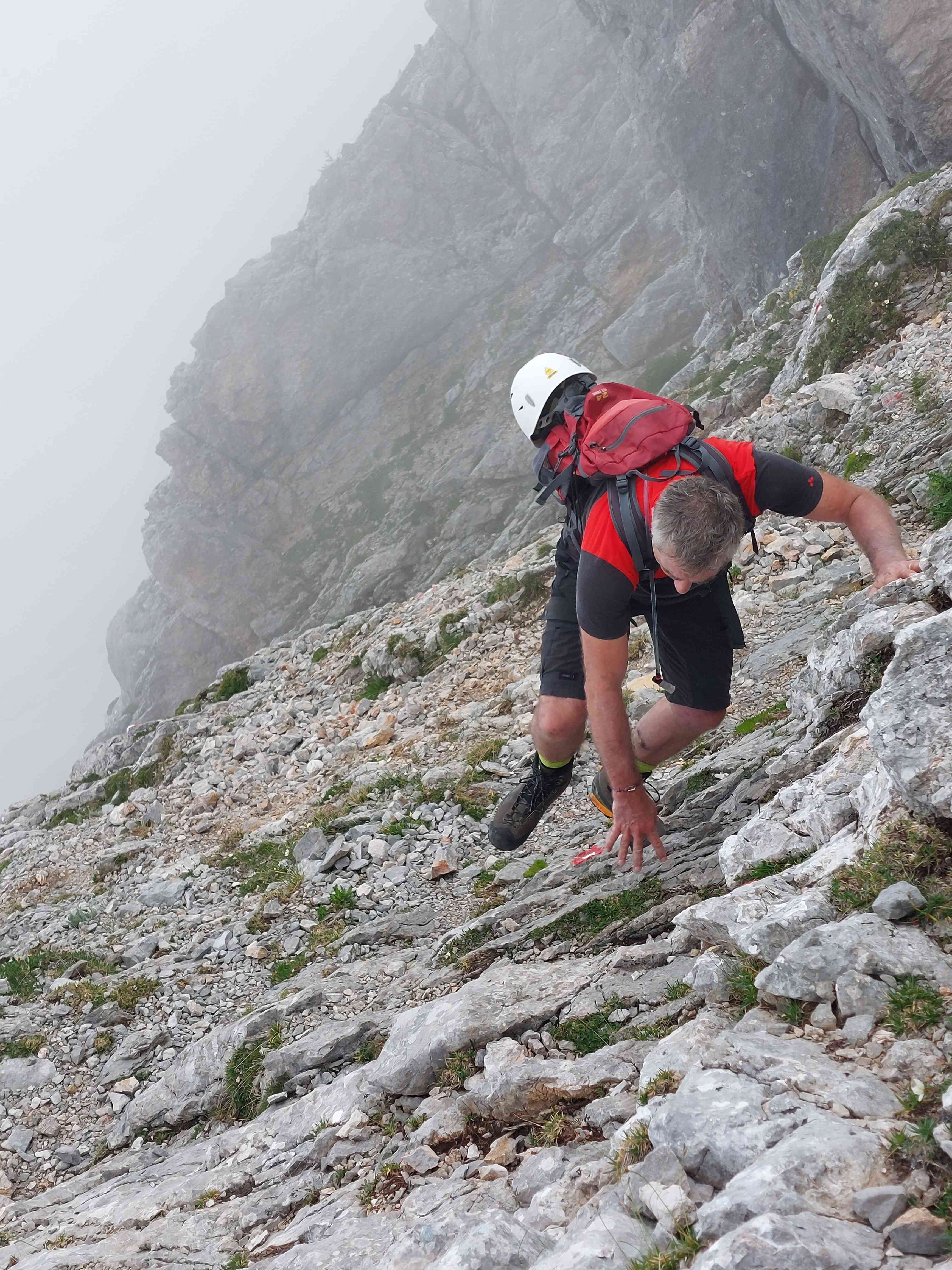 Als wir die „Labertasche“ von unten hörten, gesehen hat man die Seilschaft noch lange nicht, wussten wir dass es bald vorbei ist mit der herrlichen Ruhe auf dem Gipfel und wir machten uns bereit zum Abstieg, der in nördlicher Richtung beginnt. Die ersten Höhenmeter des Abstiegs sind immer wieder gespickt von kurzen Abklettereien, die durchaus ebenfalls den zweiten Grad streifen. Am unangenehmsten allerdings ist die Tatsache, dass sehr viel loses Gestein auf dem „Weg“ liegt, hier ist absolute Aufmerksamkeit gefragt, bewegt man sich doch stets in sehr ausgesetztem Absturzgelände, ein Ausrutschen ist absolut zu vermeiden, es würde nicht wirklich gut enden, wenn man hier fällt.