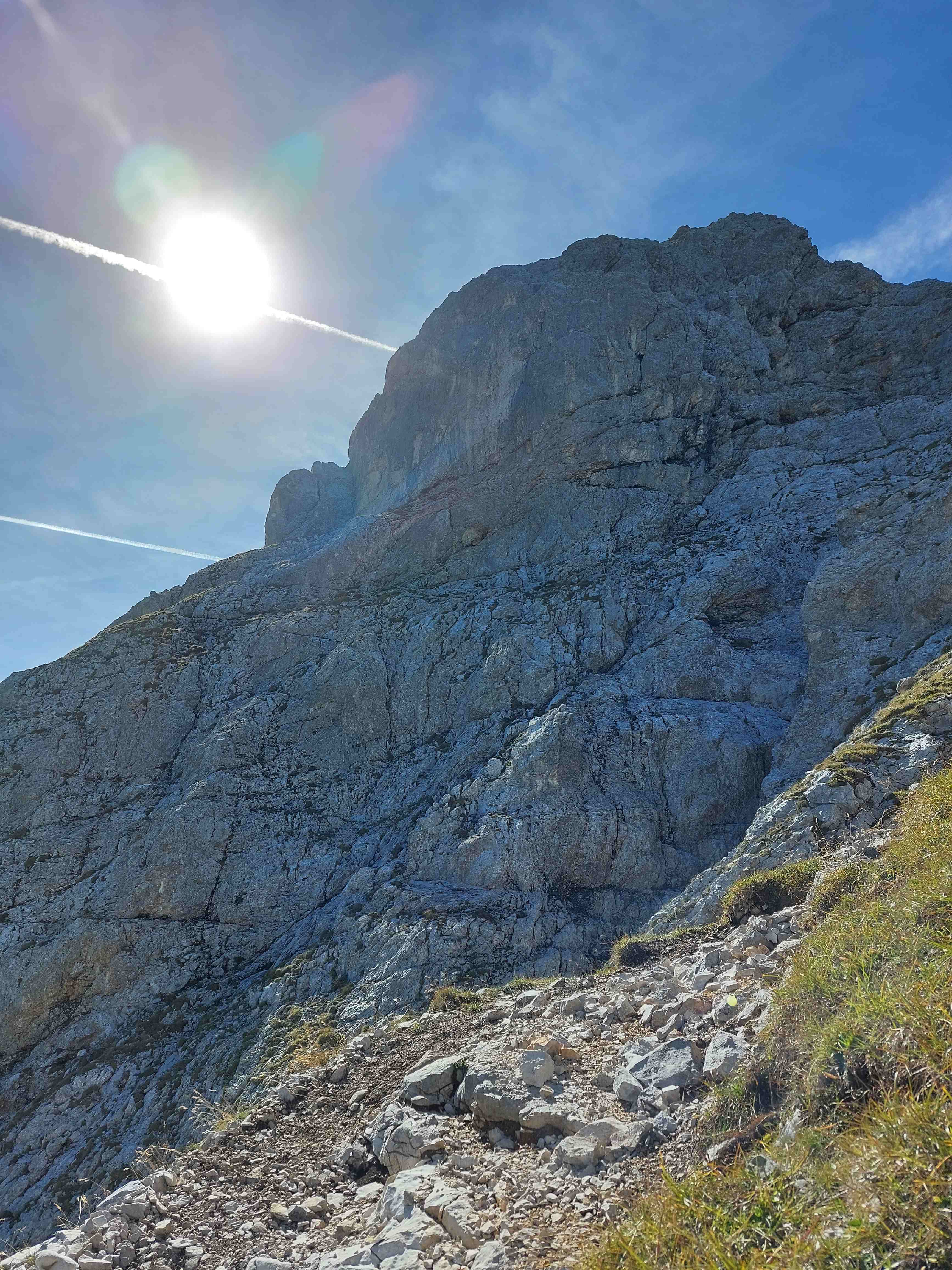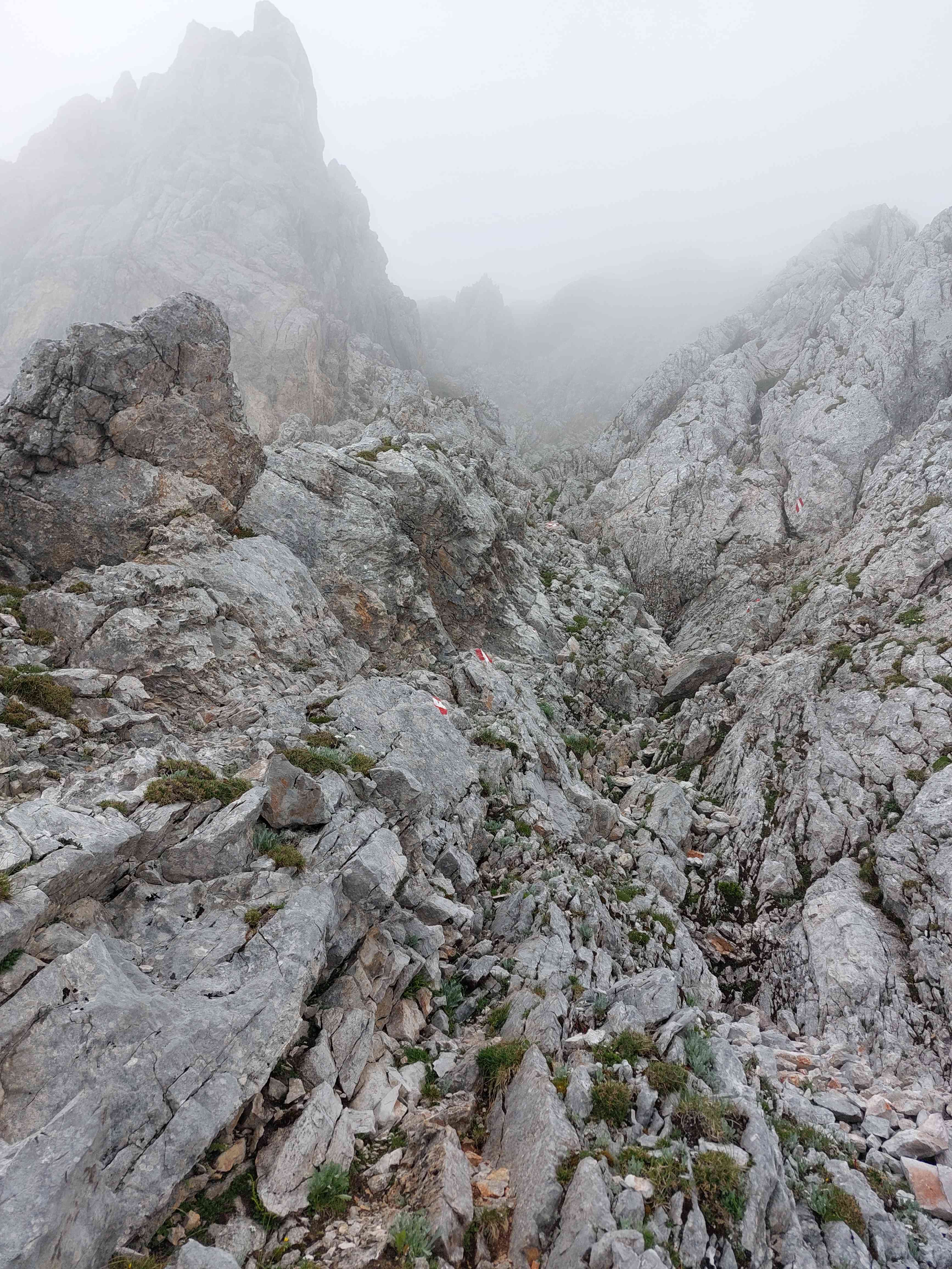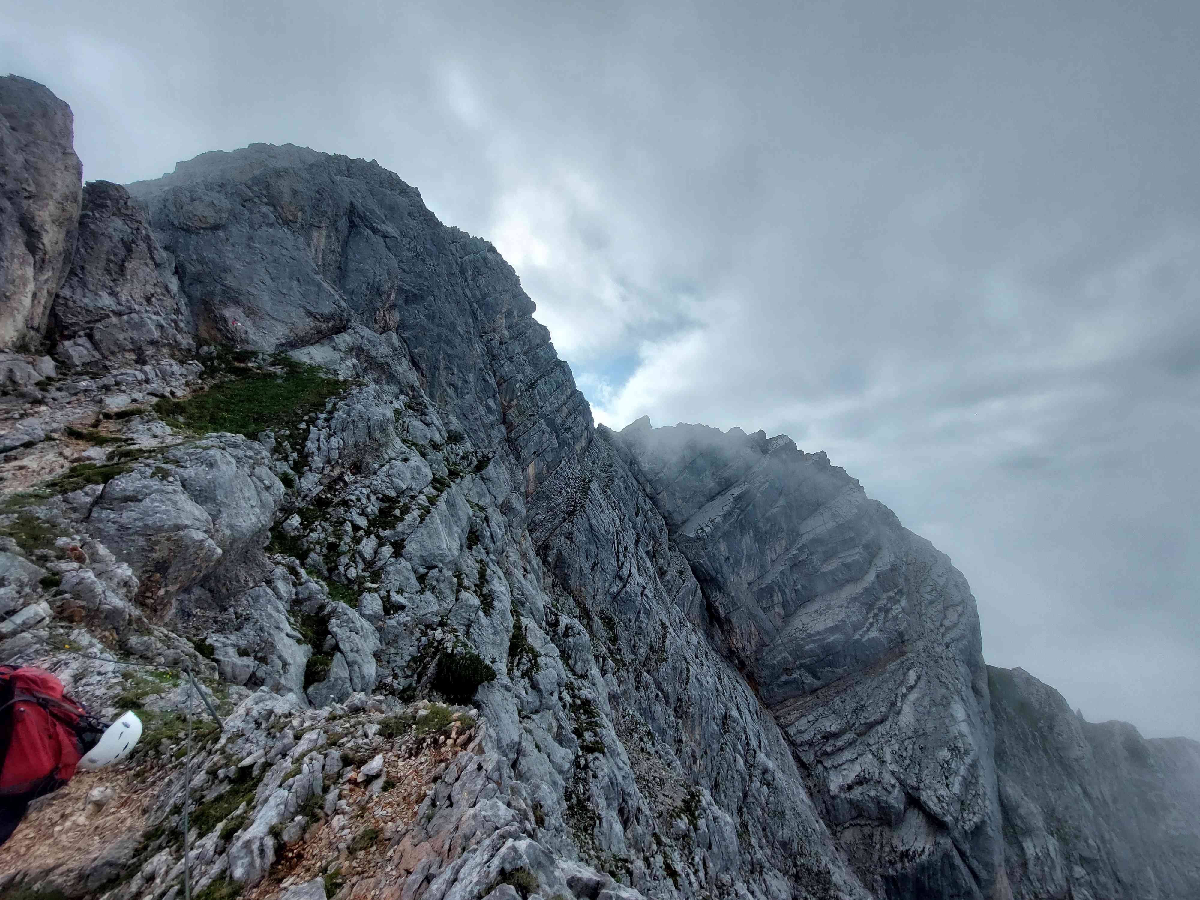 Als wir die „Labertasche“ von unten hörten, gesehen hat man die Seilschaft noch lange nicht, wussten wir dass es bald vorbei ist mit der herrlichen Ruhe auf dem Gipfel und wir machten uns bereit zum Abstieg, der in nördlicher Richtung beginnt. Die ersten Höhenmeter des Abstiegs sind immer wieder gespickt von kurzen Abklettereien, die durchaus ebenfalls den zweiten Grad streifen. Am unangenehmsten allerdings ist die Tatsache, dass sehr viel loses Gestein auf dem „Weg“ liegt, hier ist absolute Aufmerksamkeit gefragt, bewegt man sich doch stets in sehr ausgesetztem Absturzgelände, ein Ausrutschen ist absolut zu vermeiden, es würde nicht wirklich gut enden, wenn man hier fällt.