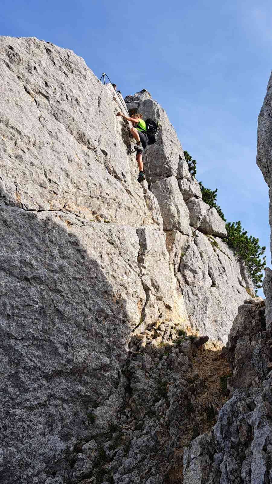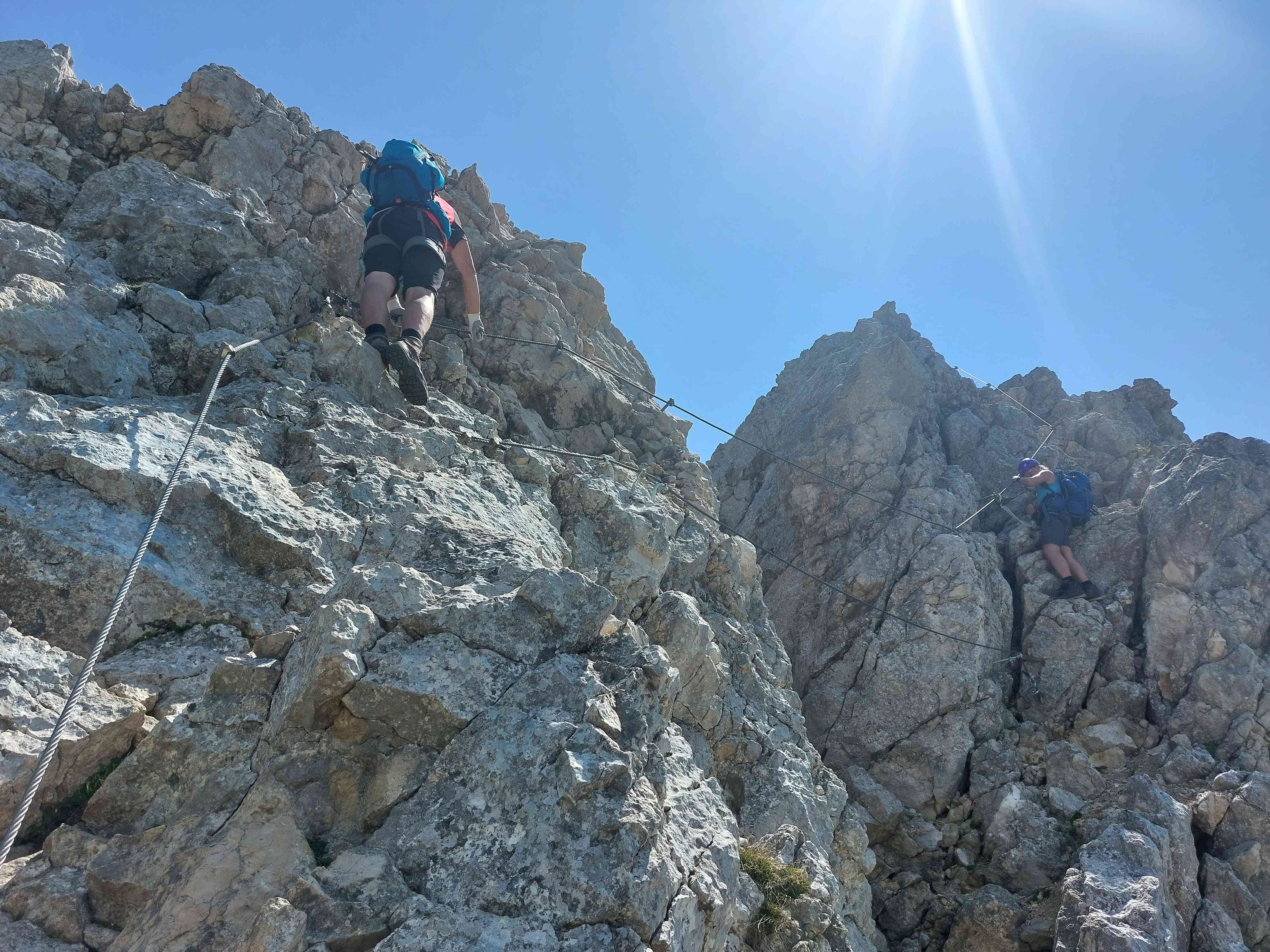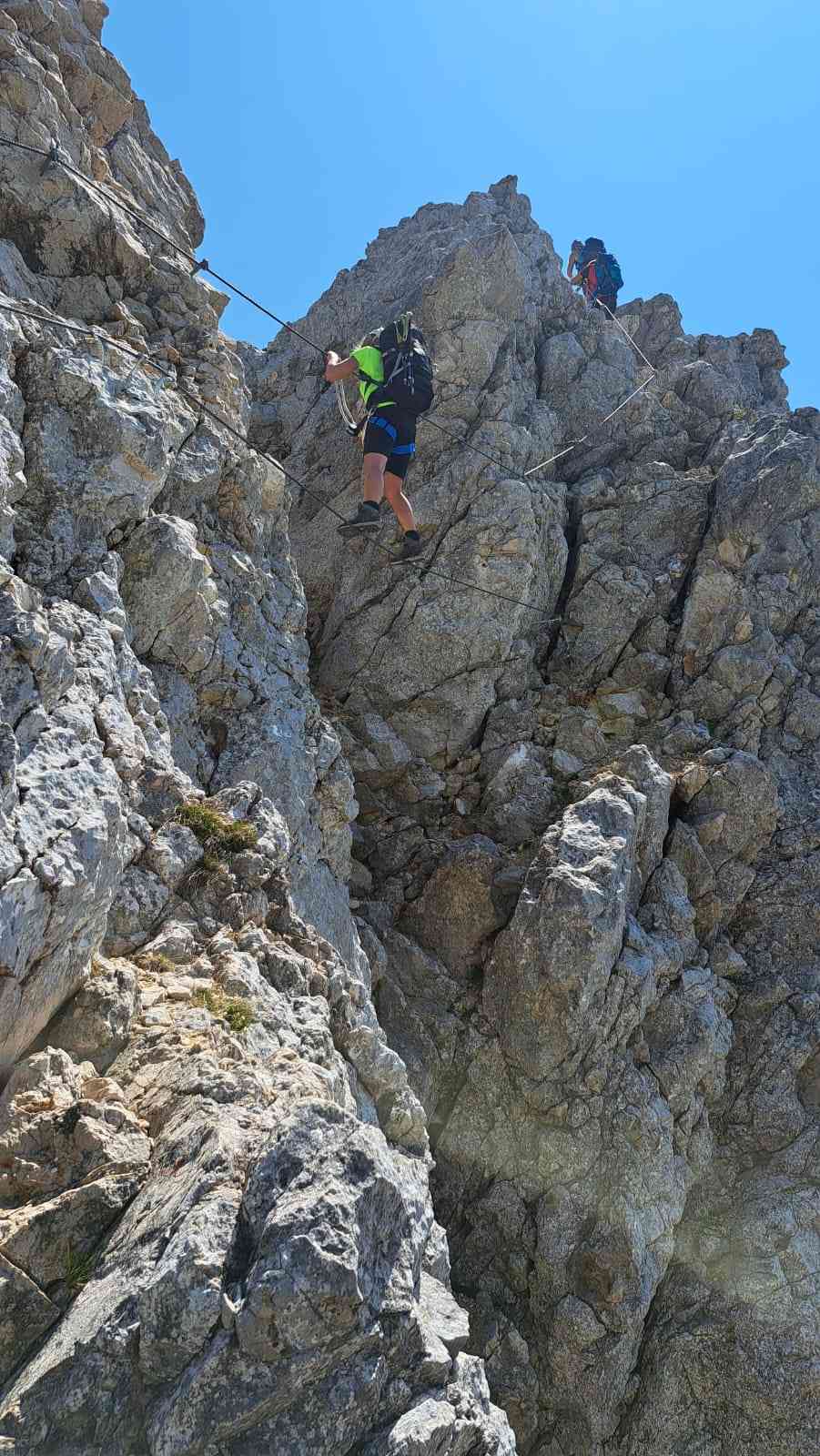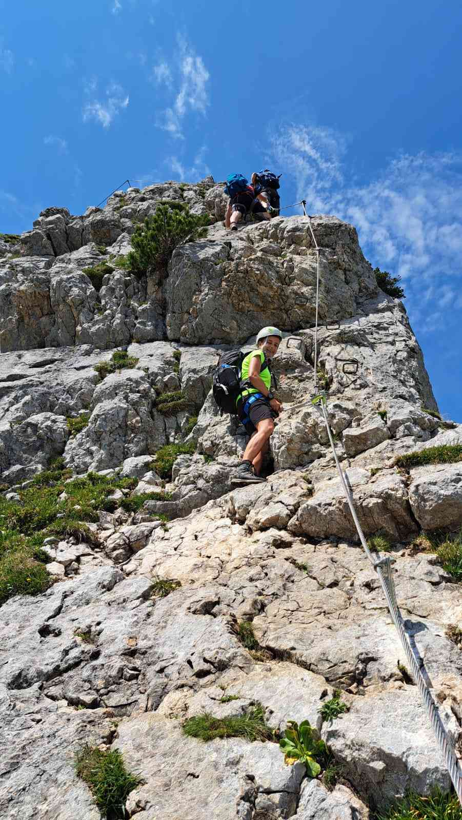 Somit hieß es Ausrüstung anlegen, Klettergurt, Klettersteigset und Helm. Wir begutachteten den ersten steilen Aufschwung des Steiges vor uns, der gleich mit den schwierigsten Passagen beginnt laut Topo, die wir uns auf dem Schild auch nochmal ansahen. Bei Roland und Lissy machte sich etwas flaues Gefühl im Magen breit und so beratschlagten wir die Reihenfolge, in der wir gehen wollten. Ich voraus, Lissy hinter mir starteten wir die ersten Meter steil nach oben, aber ihr war sofort nicht wohl dabei. Schon nach 3-4 Tritten sagte sie nein, geht nicht heute. Schade, aber eine gute starke Entscheidung von ihr überhaupt und wie sich später auch herausstellen sollte wohl die Bessere. Der Steig ist wirklich nicht zu unterschätzen. Ich ging nochmal mit runter, um mit ihr unseren späteren Treffpunkt zu besprechen, während die anderen losstiegen. Schlußlicht bildete schließlich Andy hinter mir. Die 3-4 B/C Stellen sind schon knackig, was wir alle ähnlich empfinden sollten. Es ist einiges an Armkraft gefragt und die Trittmöglichkeiten sind teilweise weit auseinander, so daß man auf die Reibung am Fels vertrauen muß. Auch fehlt es nicht an luftigen ausgesetzten Stellen, Schwindelfreiheit absolut von Nöten, vor allem auch auf der kurzen Seilbrücke. Gegen 14.15 Uhr waren wir schließlich alle auf dem Gipfel im großflächigen Gehgelände und schnauften erstmal durch, bevor wir uns eine Viertelstunde später zum Abstieg aufmachten.
