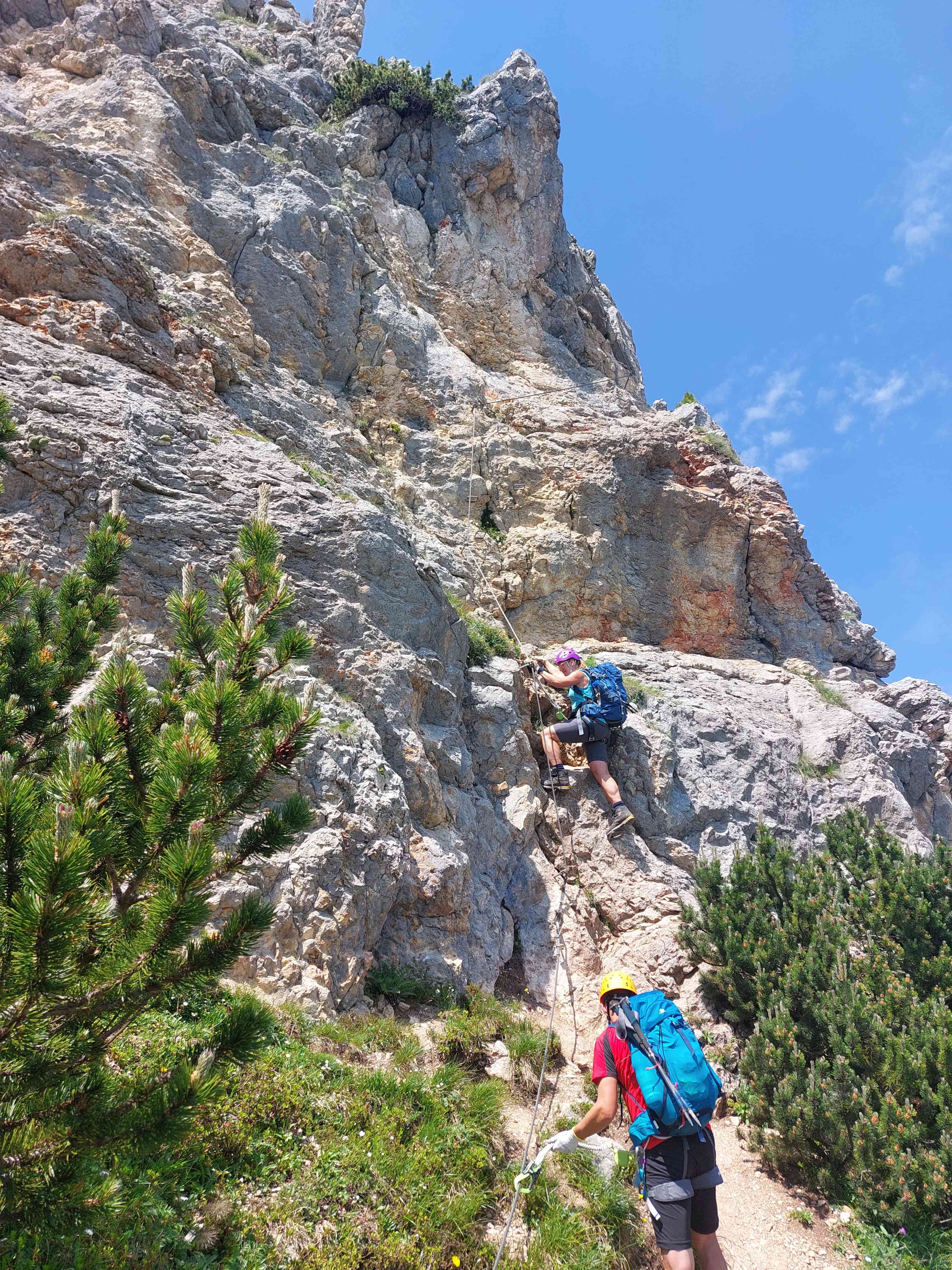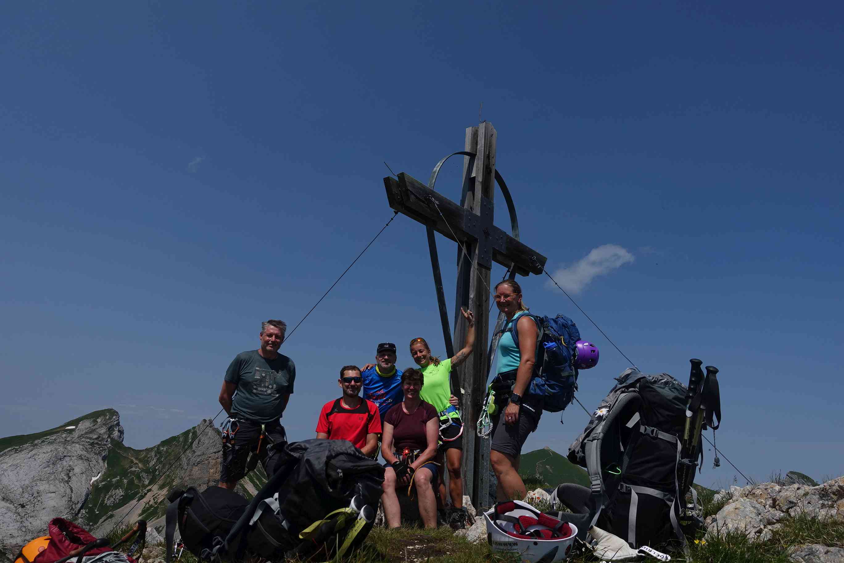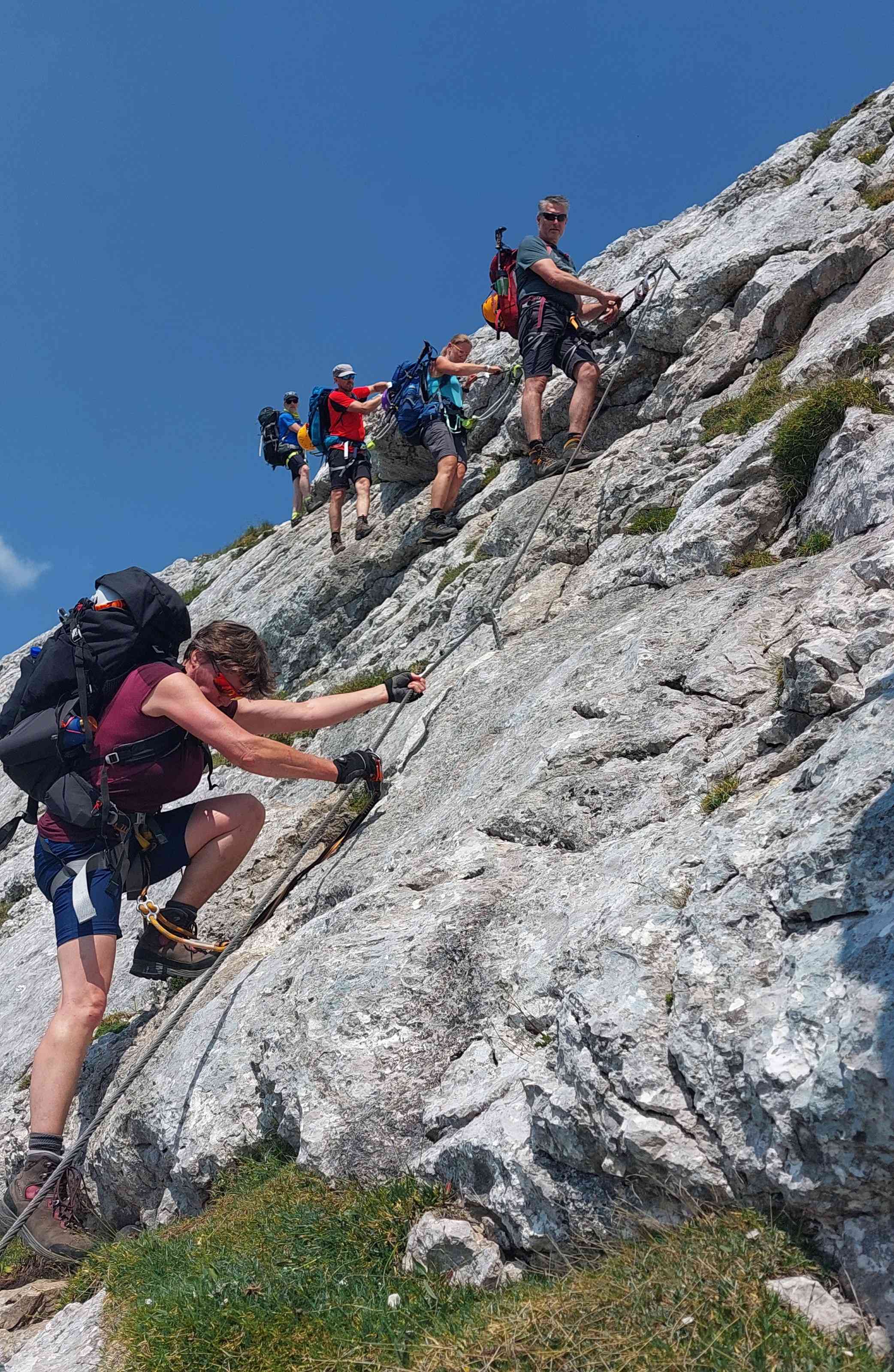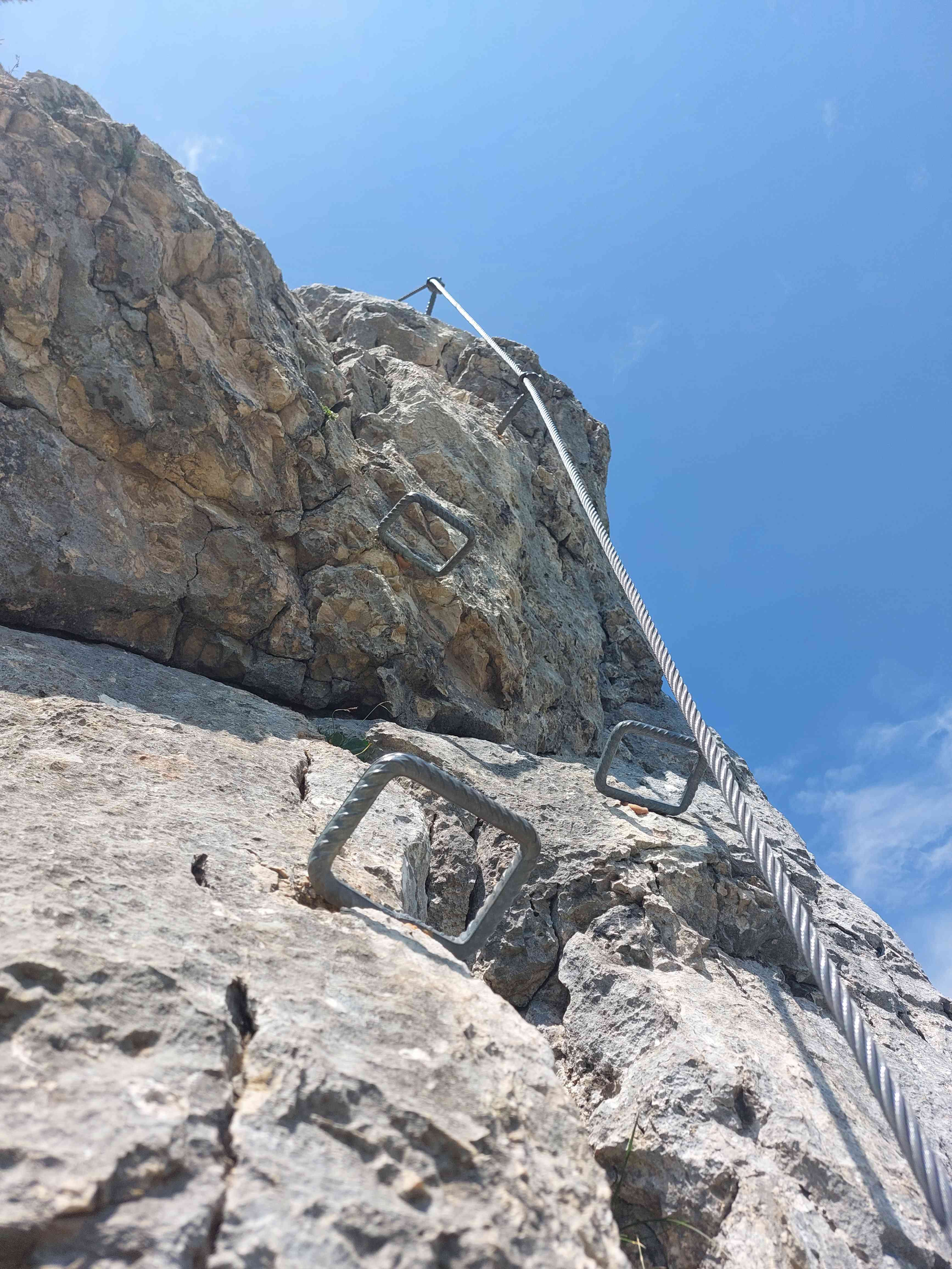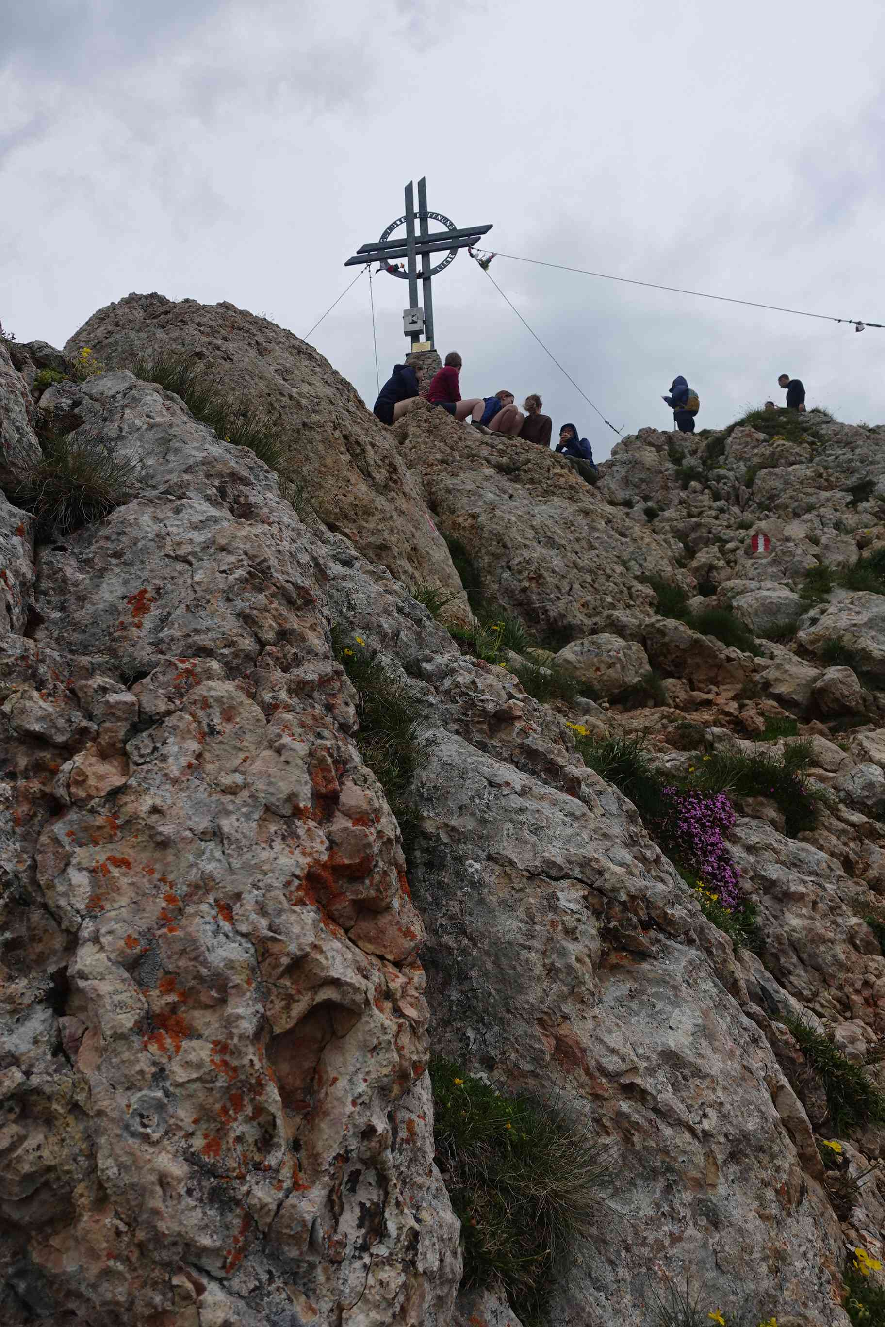 Somit hieß es Ausrüstung anlegen, Klettergurt, Klettersteigset und Helm. Wir begutachteten den ersten steilen Aufschwung des Steiges vor uns, der gleich mit den schwierigsten Passagen beginnt laut Topo, die wir uns auf dem Schild auch nochmal ansahen. Bei Roland und Lissy machte sich etwas flaues Gefühl im Magen breit und so beratschlagten wir die Reihenfolge, in der wir gehen wollten. Ich voraus, Lissy hinter mir starteten wir die ersten Meter steil nach oben, aber ihr war sofort nicht wohl dabei. Schon nach 3-4 Tritten sagte sie nein, geht nicht heute. Schade, aber eine gute starke Entscheidung von ihr überhaupt und wie sich später auch herausstellen sollte wohl die Bessere. Der Steig ist wirklich nicht zu unterschätzen. Ich ging nochmal mit runter, um mit ihr unseren späteren Treffpunkt zu besprechen, während die anderen losstiegen. Schlußlicht bildete schließlich Andy hinter mir. Die 3-4 B/C Stellen sind schon knackig, was wir alle ähnlich empfinden sollten. Es ist einiges an Armkraft gefragt und die Trittmöglichkeiten sind teilweise weit auseinander, so daß man auf die Reibung am Fels vertrauen muß. Auch fehlt es nicht an luftigen ausgesetzten Stellen, Schwindelfreiheit absolut von Nöten, vor allem auch auf der kurzen Seilbrücke. Gegen 14.15 Uhr waren wir schließlich alle auf dem Gipfel im großflächigen Gehgelände und schnauften erstmal durch, bevor wir uns eine Viertelstunde später zum Abstieg aufmachten.