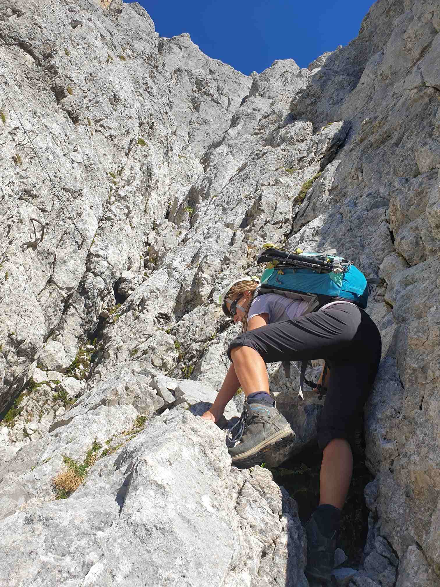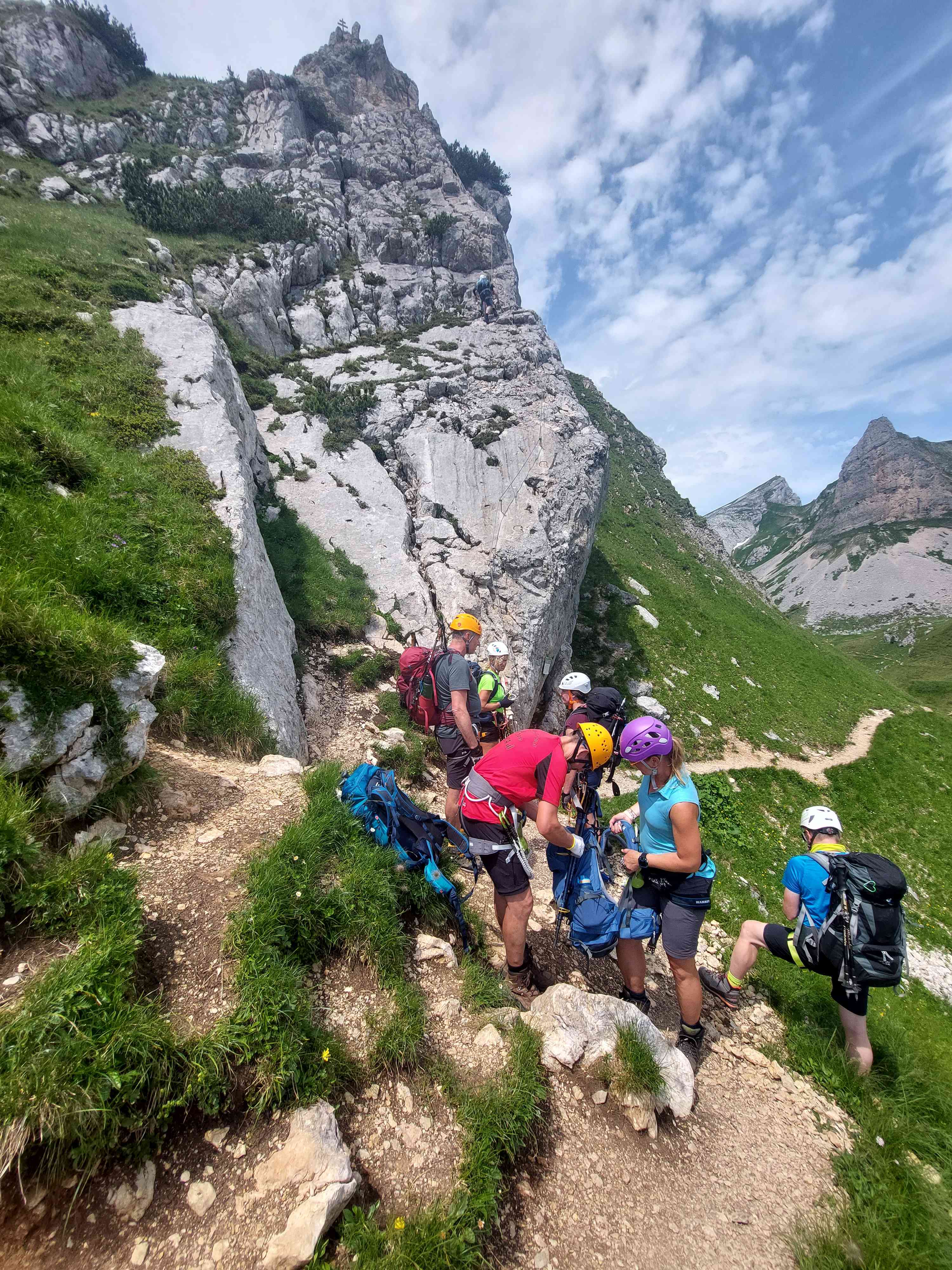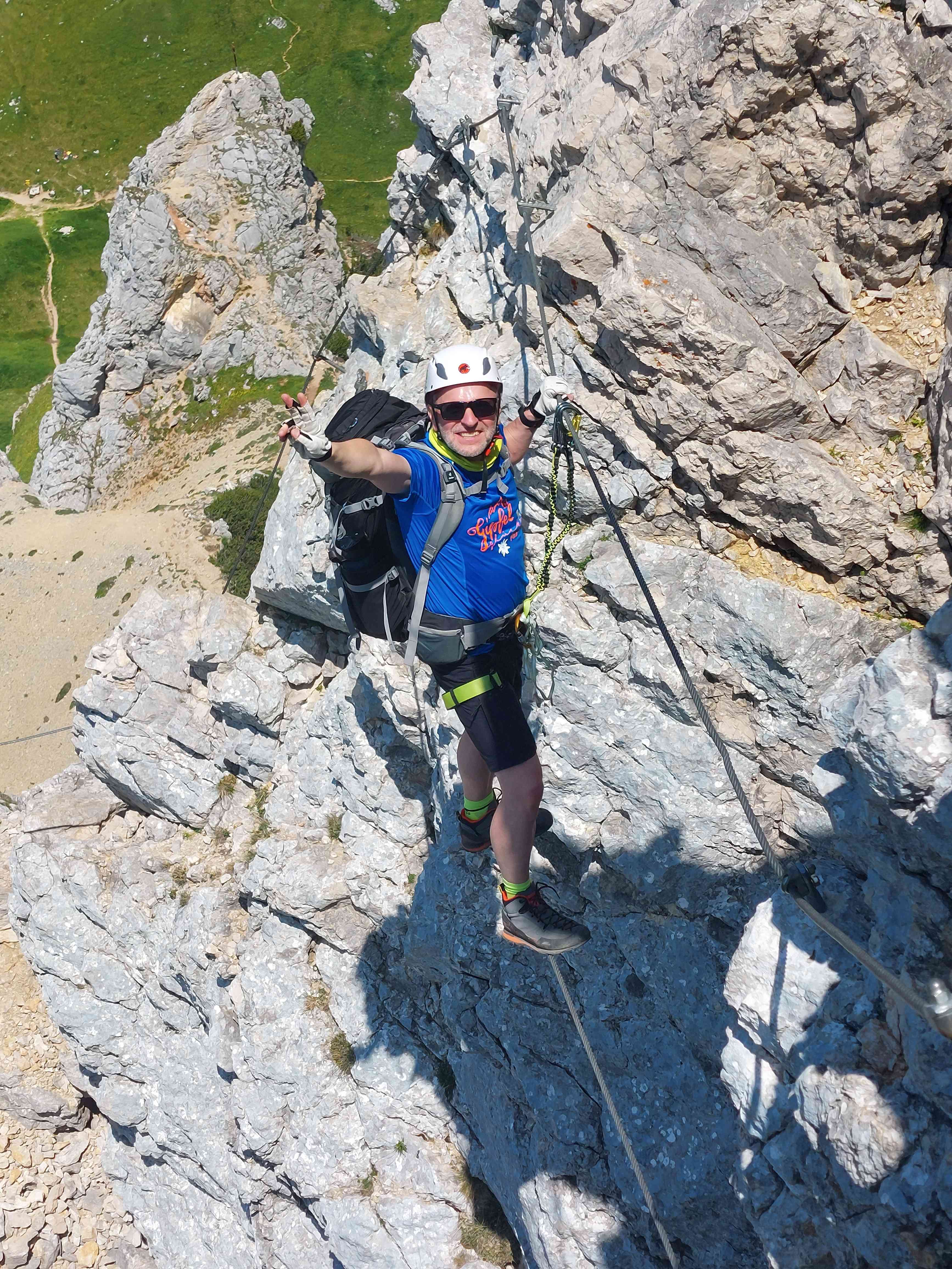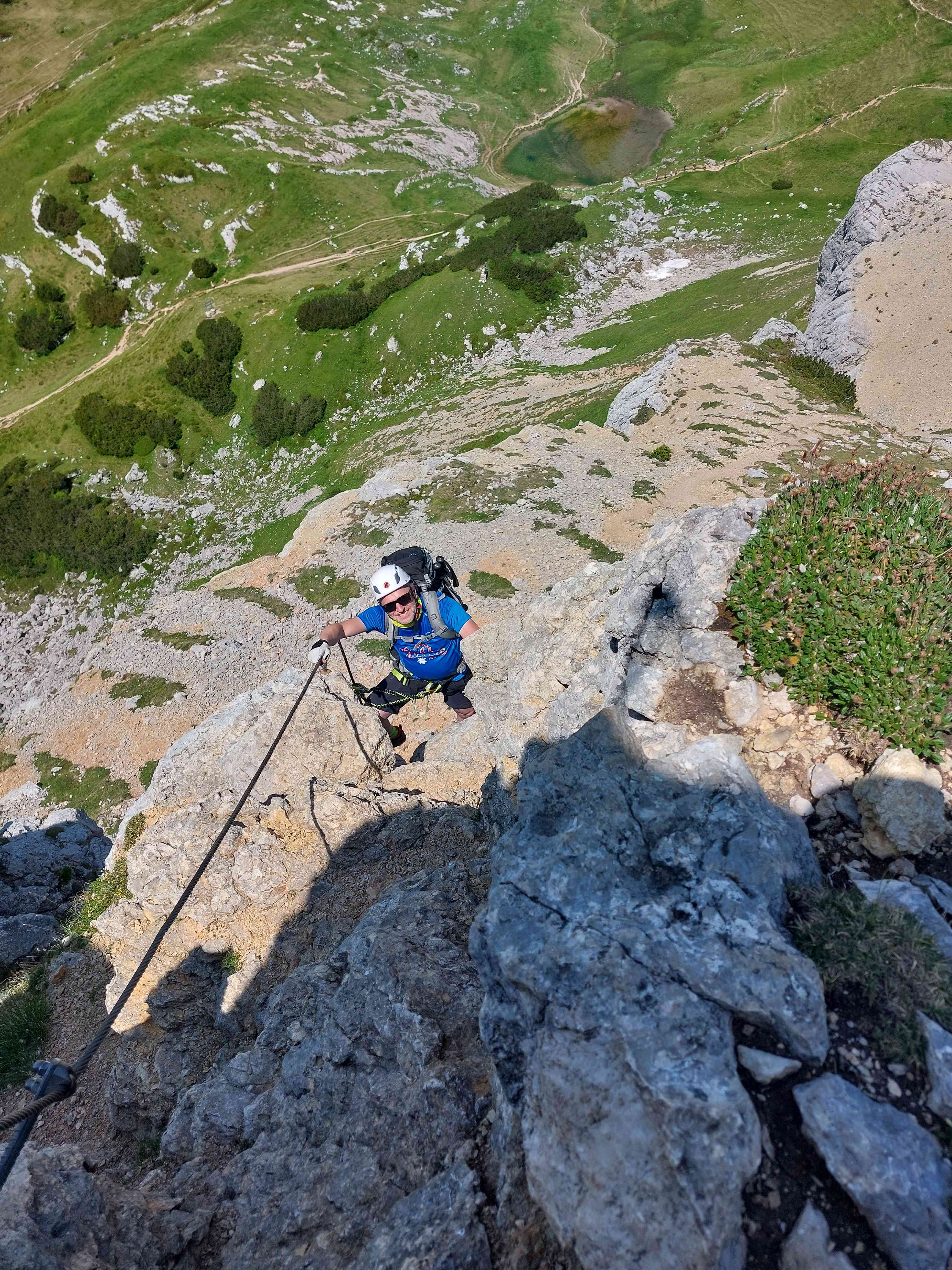 Somit hieß es Ausrüstung anlegen, Klettergurt, Klettersteigset und Helm. Wir begutachteten den ersten steilen Aufschwung des Steiges vor uns, der gleich mit den schwierigsten Passagen beginnt laut Topo, die wir uns auf dem Schild auch nochmal ansahen. Bei Roland und Lissy machte sich etwas flaues Gefühl im Magen breit und so beratschlagten wir die Reihenfolge, in der wir gehen wollten. Ich voraus, Lissy hinter mir starteten wir die ersten Meter steil nach oben, aber ihr war sofort nicht wohl dabei. Schon nach 3-4 Tritten sagte sie nein, geht nicht heute. Schade, aber eine gute starke Entscheidung von ihr überhaupt und wie sich später auch herausstellen sollte wohl die Bessere. Der Steig ist wirklich nicht zu unterschätzen. Ich ging nochmal mit runter, um mit ihr unseren späteren Treffpunkt zu besprechen, während die anderen losstiegen. Schlußlicht bildete schließlich Andy hinter mir. Die 3-4 B/C Stellen sind schon knackig, was wir alle ähnlich empfinden sollten. Es ist einiges an Armkraft gefragt und die Trittmöglichkeiten sind teilweise weit auseinander, so daß man auf die Reibung am Fels vertrauen muß. Auch fehlt es nicht an luftigen ausgesetzten Stellen, Schwindelfreiheit absolut von Nöten, vor allem auch auf der kurzen Seilbrücke. Gegen 14.15 Uhr waren wir schließlich alle auf dem Gipfel im großflächigen Gehgelände und schnauften erstmal durch, bevor wir uns eine Viertelstunde später zum Abstieg aufmachten.