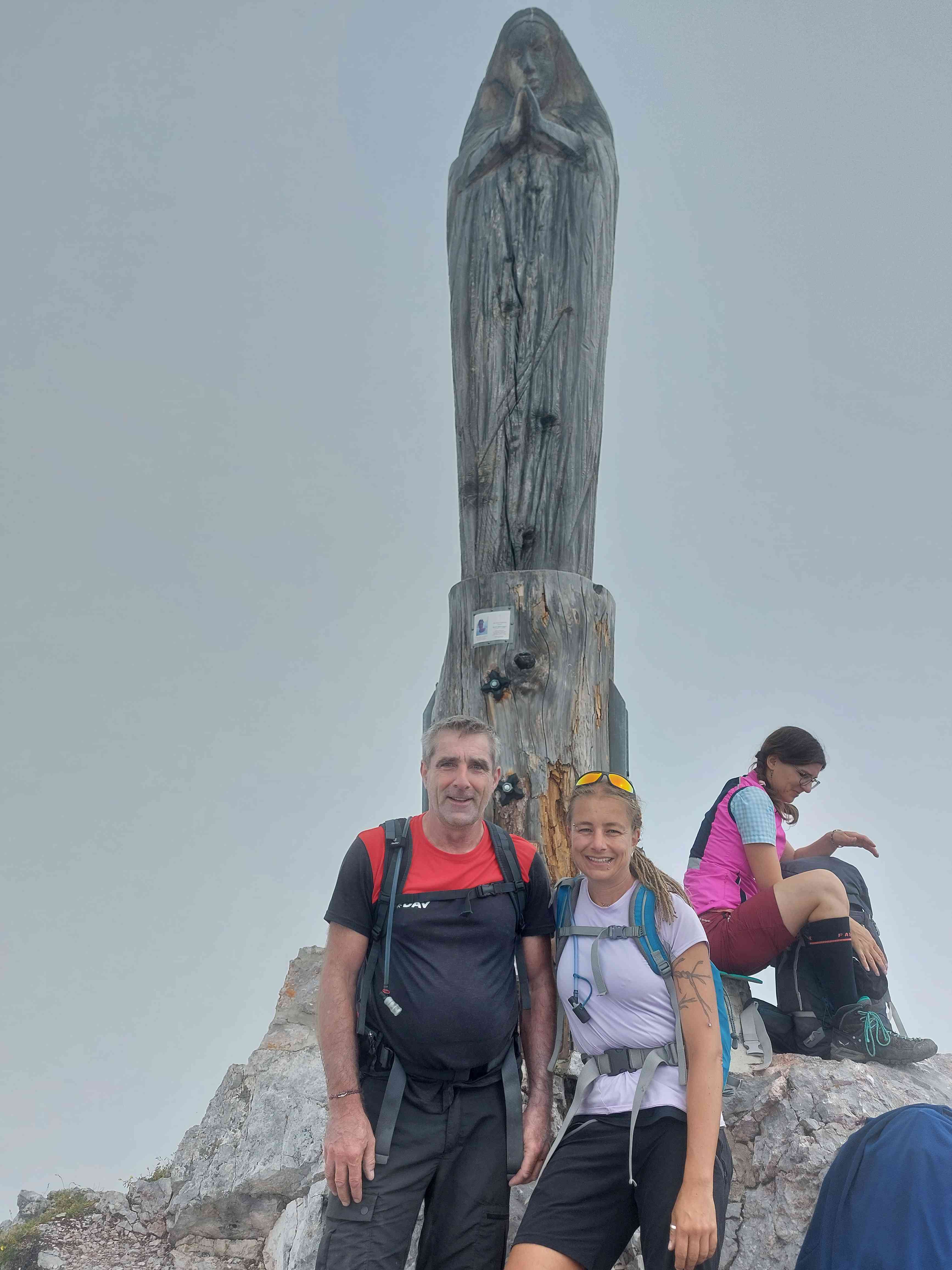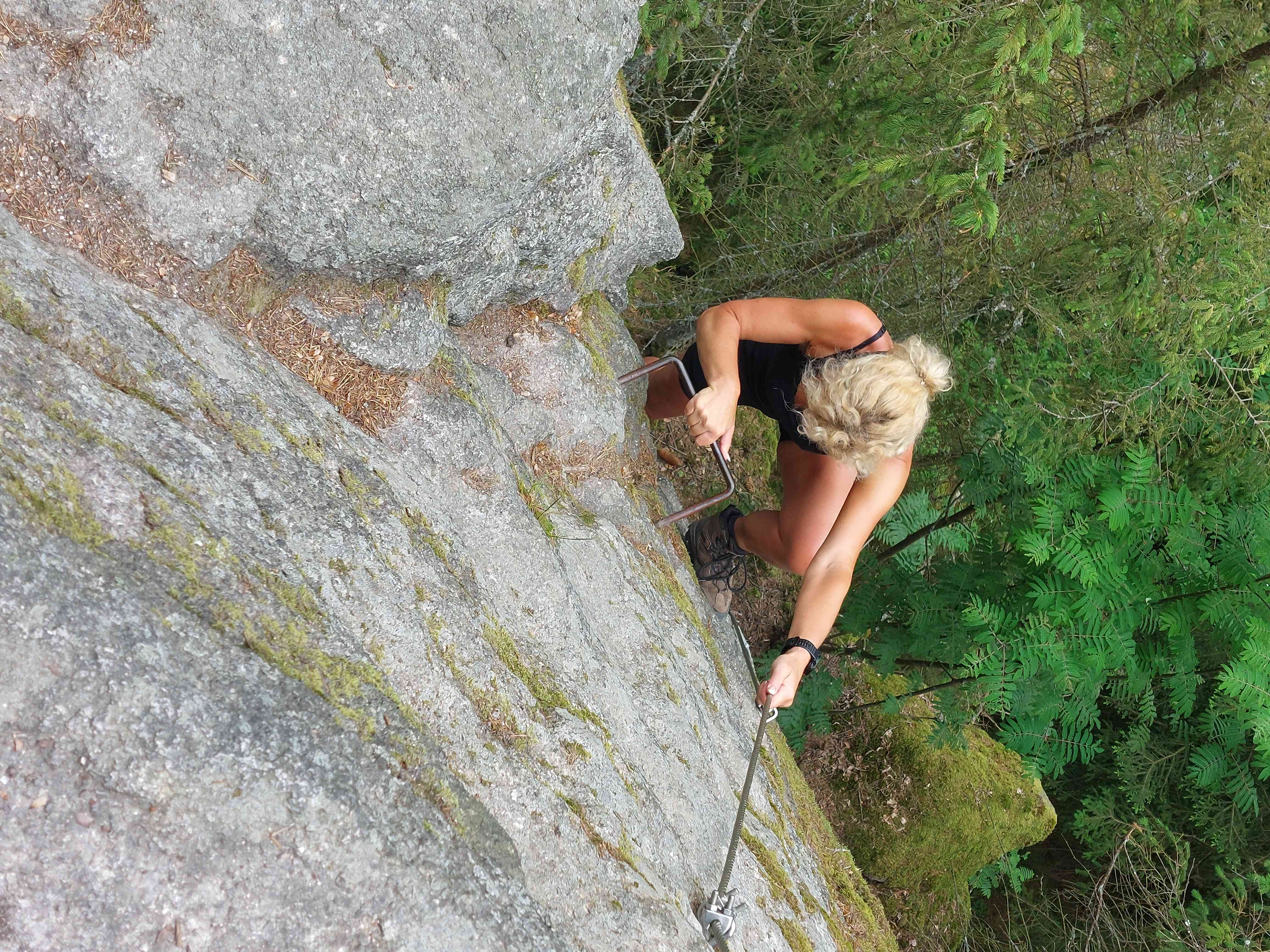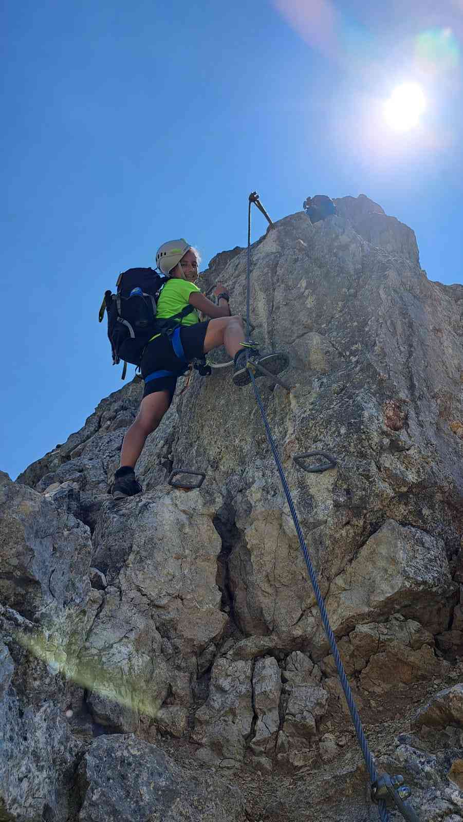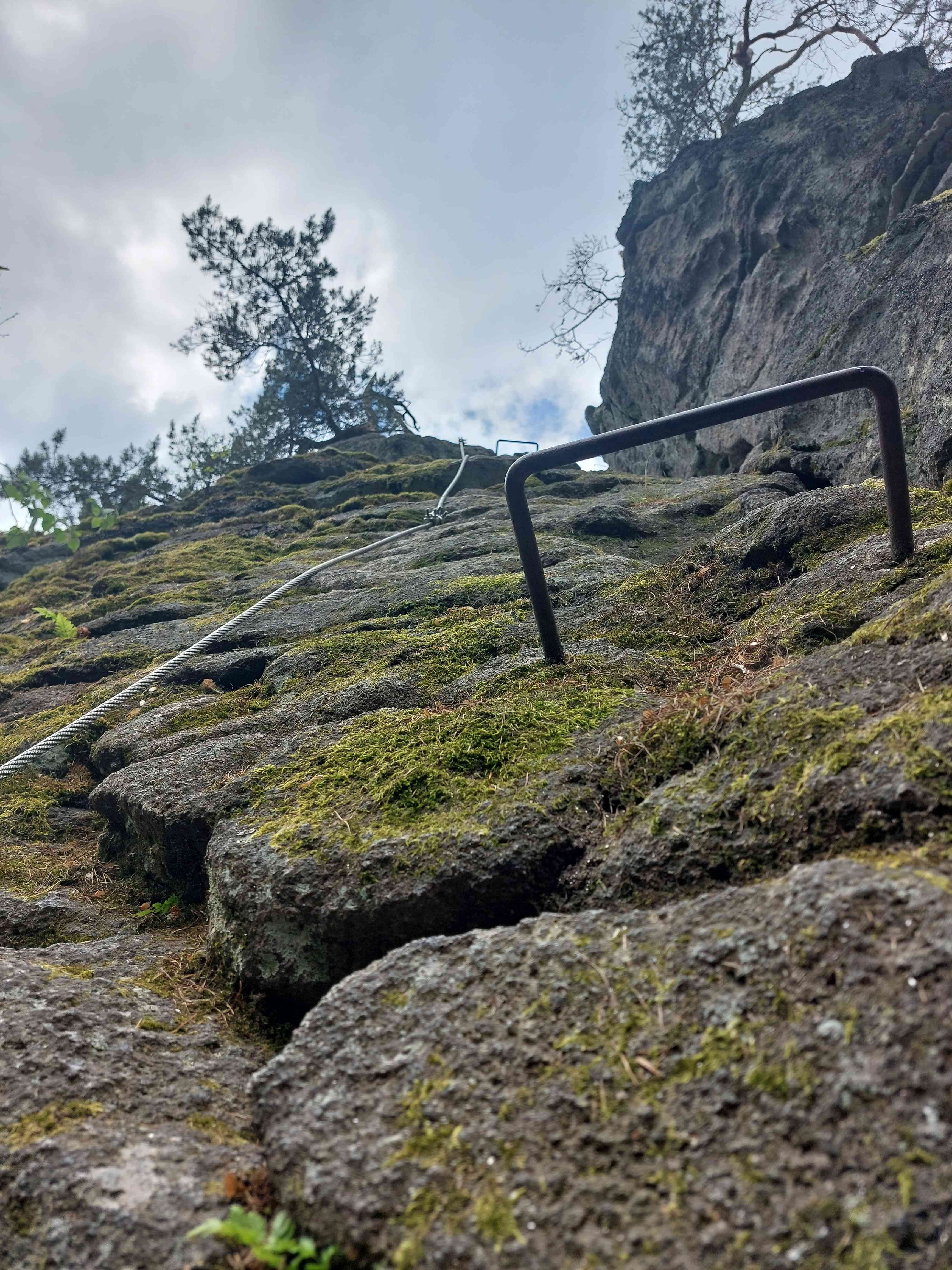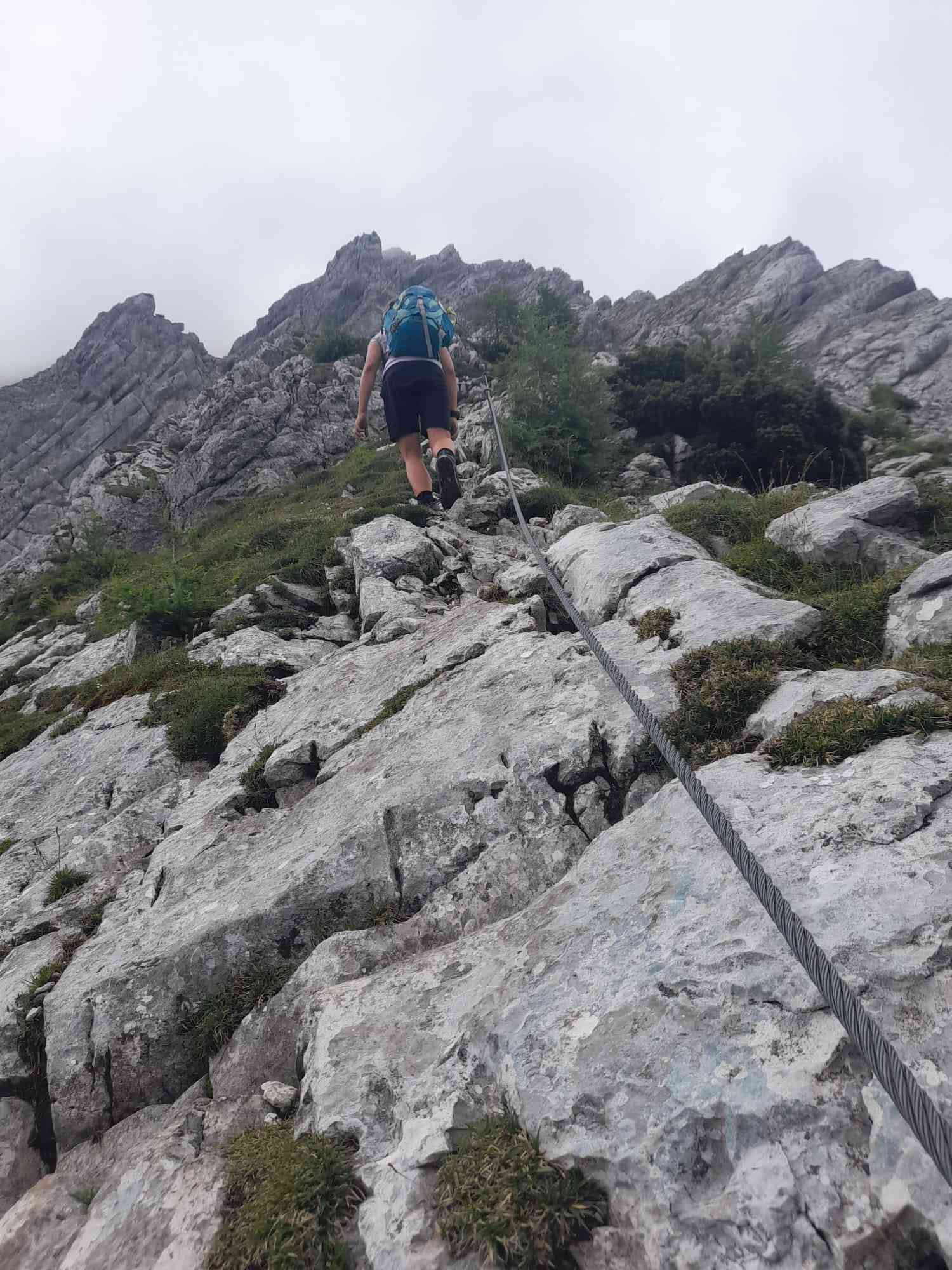 Somit hieß es Ausrüstung anlegen, Klettergurt, Klettersteigset und Helm. Wir begutachteten den ersten steilen Aufschwung des Steiges vor uns, der gleich mit den schwierigsten Passagen beginnt laut Topo, die wir uns auf dem Schild auch nochmal ansahen. Bei Roland und Lissy machte sich etwas flaues Gefühl im Magen breit und so beratschlagten wir die Reihenfolge, in der wir gehen wollten. Ich voraus, Lissy hinter mir starteten wir die ersten Meter steil nach oben, aber ihr war sofort nicht wohl dabei. Schon nach 3-4 Tritten sagte sie nein, geht nicht heute. Schade, aber eine gute starke Entscheidung von ihr überhaupt und wie sich später auch herausstellen sollte wohl die Bessere. Der Steig ist wirklich nicht zu unterschätzen. Ich ging nochmal mit runter, um mit ihr unseren späteren Treffpunkt zu besprechen, während die anderen losstiegen. Schlußlicht bildete schließlich Andy hinter mir. Die 3-4 B/C Stellen sind schon knackig, was wir alle ähnlich empfinden sollten. Es ist einiges an Armkraft gefragt und die Trittmöglichkeiten sind teilweise weit auseinander, so daß man auf die Reibung am Fels vertrauen muß. Auch fehlt es nicht an luftigen ausgesetzten Stellen, Schwindelfreiheit absolut von Nöten, vor allem auch auf der kurzen Seilbrücke. Gegen 14.15 Uhr waren wir schließlich alle auf dem Gipfel im großflächigen Gehgelände und schnauften erstmal durch, bevor wir uns eine Viertelstunde später zum Abstieg aufmachten.