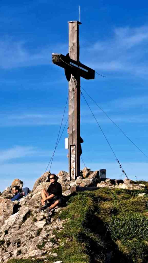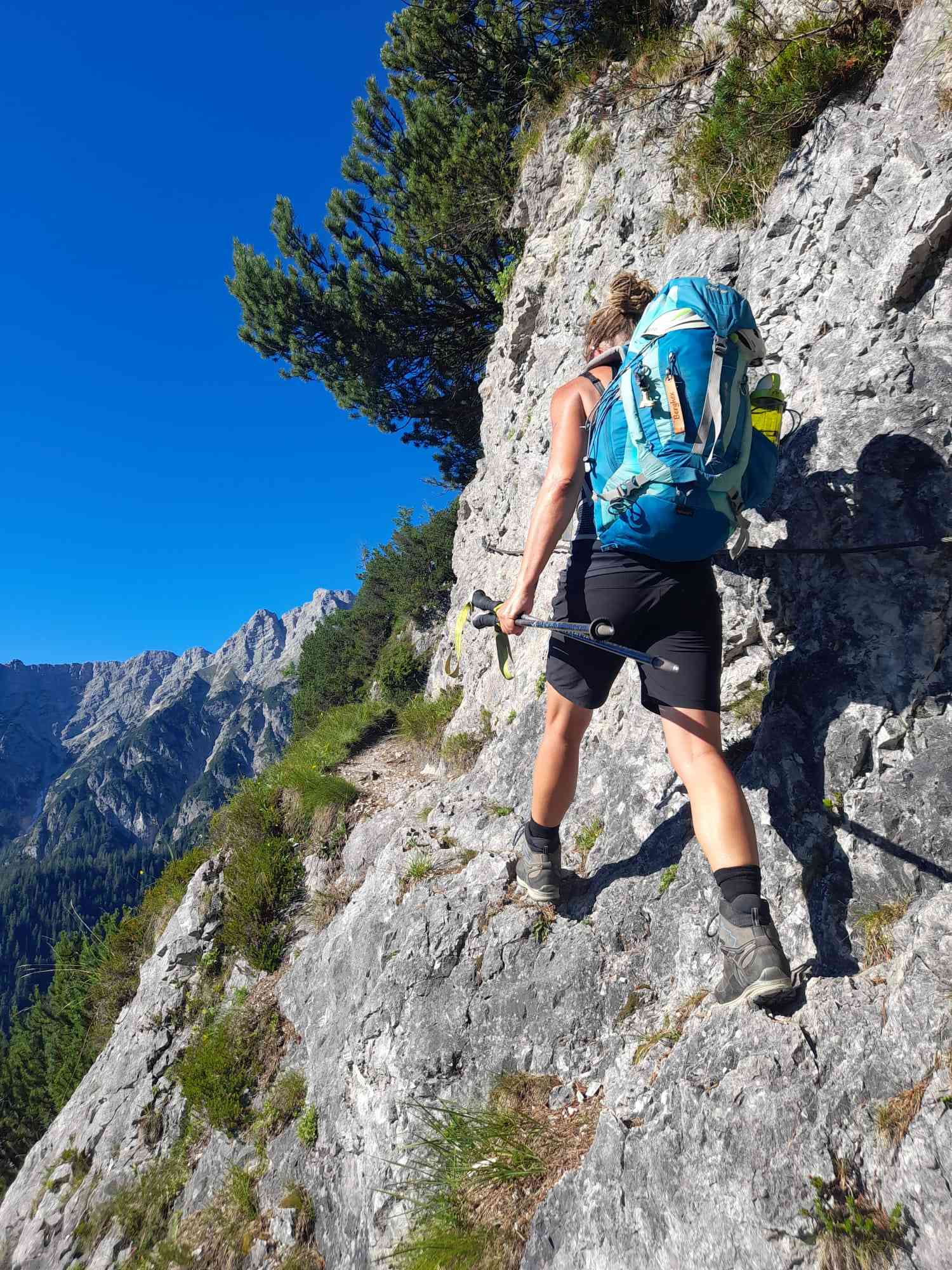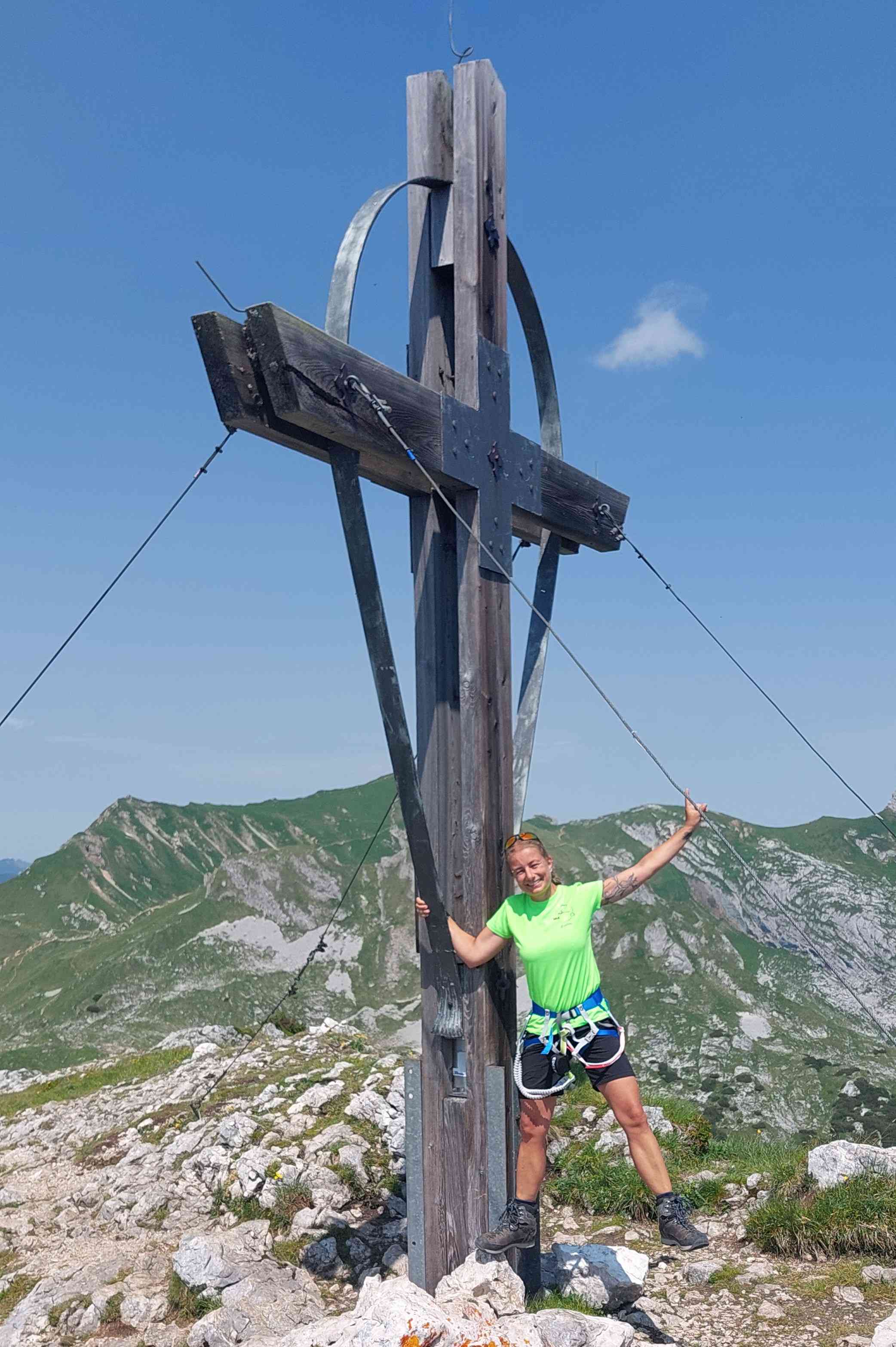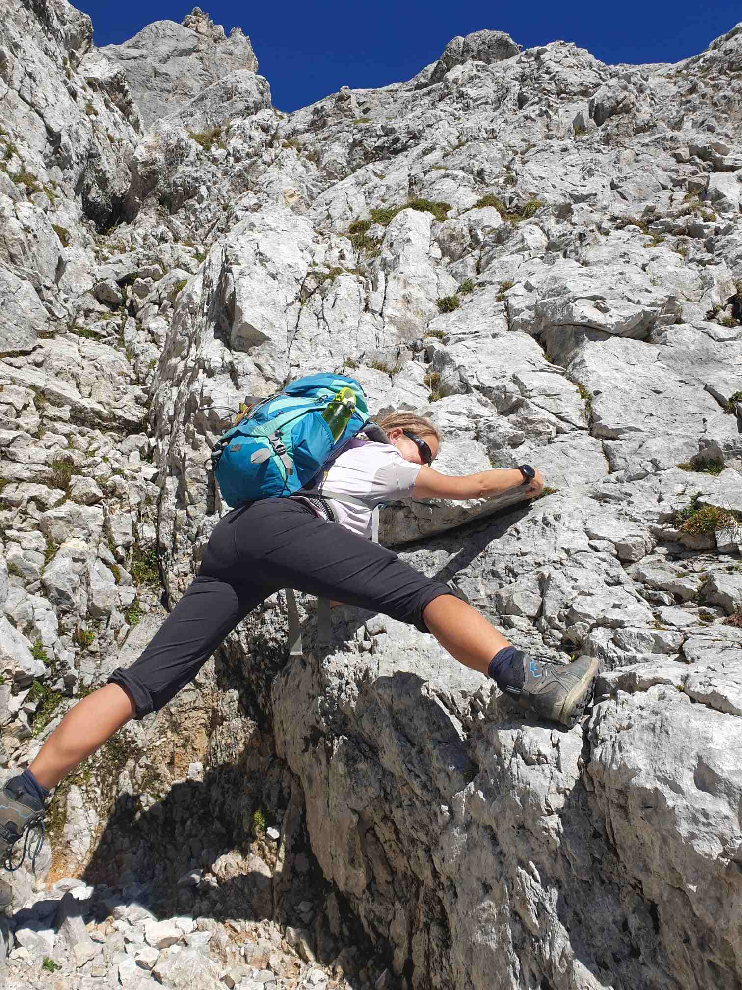 Das nächste Ziel lautete dann Coburger Hütte auf 1920 Meter, die über einen normalen Bergwanderweg erreicht wird. Vom See aus rechnet man mit ca. 45 Minuten Gehzeit bis zur Hütte. Wir stärkten uns dort angekommen noch einmal mit einer kurzen Jause, sammelten unsere Kräfte und machten uns auf in Richtung Gipfelsturm. Zunächst verliert man auf einem angenehmen Bergpfad wieder etwas an Höhe in Richtung Bierwierer Scharte bis man bald auf einen Felsen trifft, auf dem das Ziel klar sichtbar aufgepinselt ist: Sonnenspitze. Also rechts ab und schon bald geht es durch Latschenkiefer immer weiter Richtung Geröllfeld. Den Weg durch diese Schutthalde sieht man schon relativ frühzeitig, über zwei langgezogene Serpentinen geht es in Richtung Fels und den Einstieg in den ernsten Teil der Tour. Zunächst noch in leichter Kletterei durch Schrofengelände, doch bald schon kommen die ersten Felsriegel und die Hände dürfen auch mit der Arbeit beginnen – dies wird bis zum Gipfel so bleiben. Die Orientierung ist für bergerfahrene Kletterer übrigens nicht allzu schwer, man erspäht immer mal wieder ausgeblichene rote Markierungspunkte, oder Standplätze zum Sichern, alternativ Steinmänner. Sollte mal nichts von all dem zu sehen sein, folgt man instinktiv der logischen Linie und überraschend entdeckt man dann immer wieder eine der oben genannten Orientierungshilfen. Bei der ersten Klettereinlage waren wir von einer dreiköpfigen Seilschaft etwas genervt, die nur schleppend vorankam, da der Bergführer eine seiner Mitgeher am Kurzseil hatte. Wir entschlossen uns etwas rechts von der eigentlichen Route zu klettern um diese Gruppe zu überholen, aber „netterweise“ machte der außerdem noch dauerquasselnde Bergführer urplötzlich auch ordentlich Tempo und zog die gesicherte Dame regelrecht den Fels nach oben. Letztendlich konnte er dann aber unserer Tempoeinlage doch nicht mehr ganz folgen und wir waren vorbei an ihnen. Im Nachhinein ein guter Entschluss, hörten wir doch immer wieder ein „Vorsicht Stein“ von unten, scheinbar traten die gut was los. Entsprechend auch die Empfehlung pro Helm wenn viel Betrieb an der Wand ist, die Steinschlaggefahr ist definitiv nicht von der Hand zu weisen. Nach besagter ersten Rinne (1er, maximal mal kurz 2er Gelände) folgt zur Erholung eine erste Querung, bei der man sich allerdings trotzdem im absoluten Absturzgelände befindet. Es geht ein schmales Band in einer steilen Wand entlang zur nächsten Rinne, bei der gefühlt auch die Schlüsselstelle der Route wartet. Susan bewältigt diese Schlüsselstelle, die am Ausstieg mit Krampen etwas entschärft ist auf der eigentlichen Route, ich entschied mich aus der Erfahrung des ersten Besteigungsversuches heraus dafür, diese Stelle links zu umklettern, hatte ich doch so meine Schwierigkeiten bei besagten erstem Versuch. Die Variante links herum ist deutlich ausgesetzter und man hat ordentlich Luft unterm Hintern, dafür empfand ich sie als schöner zu klettern, da der Fels wesentlich weniger abgewetzt ist und sich auch hier immer wieder schöne Griffe und Tritte finden. Kurz nach den erwähnten Krampen quert man dann einfach wieder in die Rinne und befindet sich ab da wieder auf der eigentlichen Route. Nach der Rinne folgt wiederum eine weitere Querung auf einem schmalen Band, dieses Mal nach links. Hier gibt es auch einmal kurz ein Stahlseil als zusätzliche Möglichkeit zum Festhalten. Danach geht es wieder relativ straight nach oben, hier finden sich wenige Hinweise, wie bereits beschrieben einfach der logischen Linie folgen, versteigen kann man sich dort eher kaum. Tendenziell jedenfalls sollte man sich leicht nach rechts oben halten, denn hier folgt die letzte Querung die zum finalen Gipfelaufschwung führt. Dort angekommen steigt man wieder kurz im Fels (1er Gelände) nach oben und steht auf dem Vorgipfel und erblickt erstmals das Gipfelkreuz. Diesen erreicht man schließlich über einen schmalen, sehr ausgesetzten Grat an dessen Ende man noch einmal eine kurze anregende Klettereinlage bewältigen muss um endlich am Kreuz abklopfen zu können. Bei strahlendem Sonnenschein genossen wir ca. 45 Minuten lang die Einsamkeit am Gipfel auf 2417m, die Aussicht auf diesem exponierten Gipfel ist wirklich an so einem Traumtagele überwältigend.