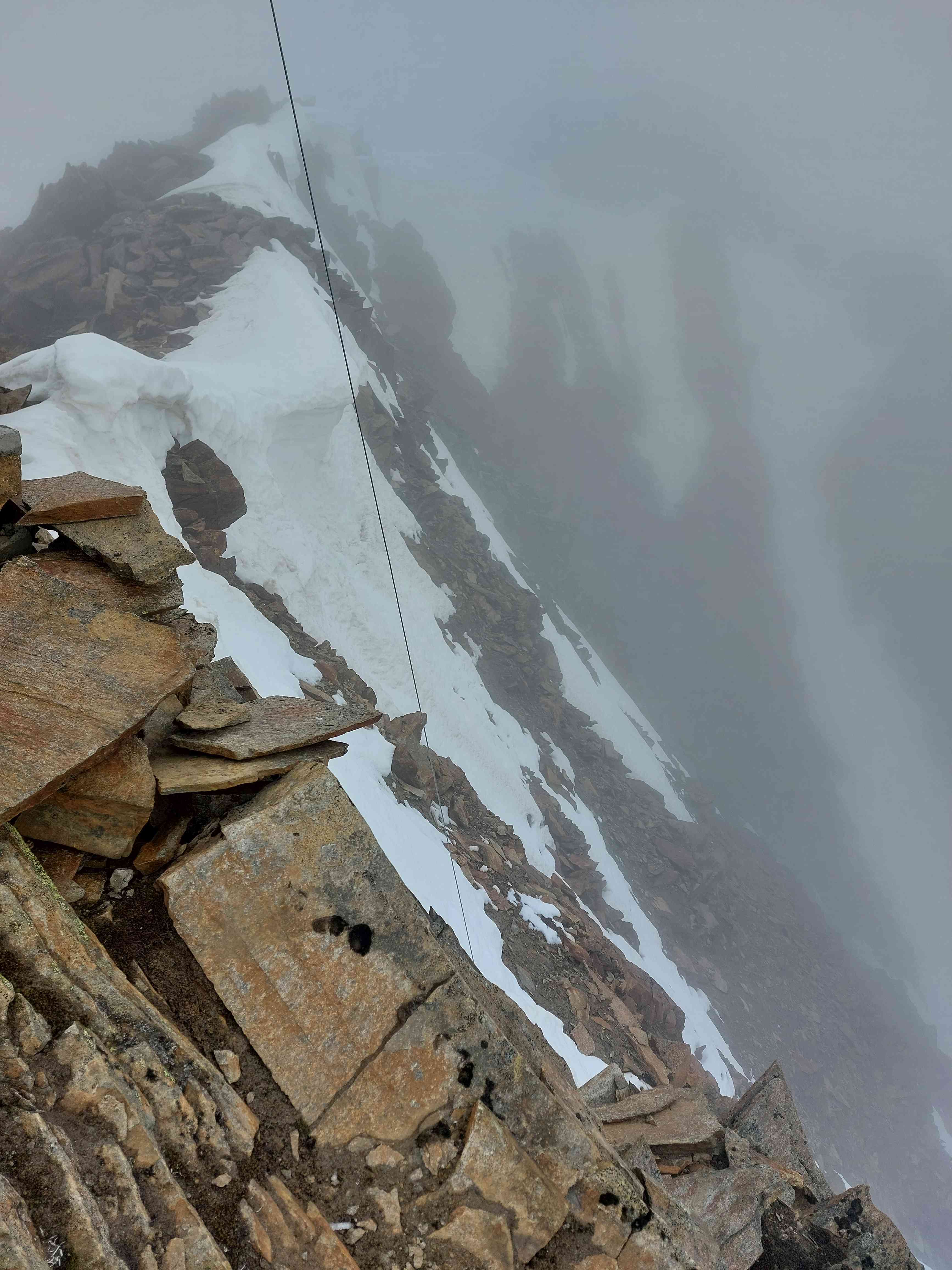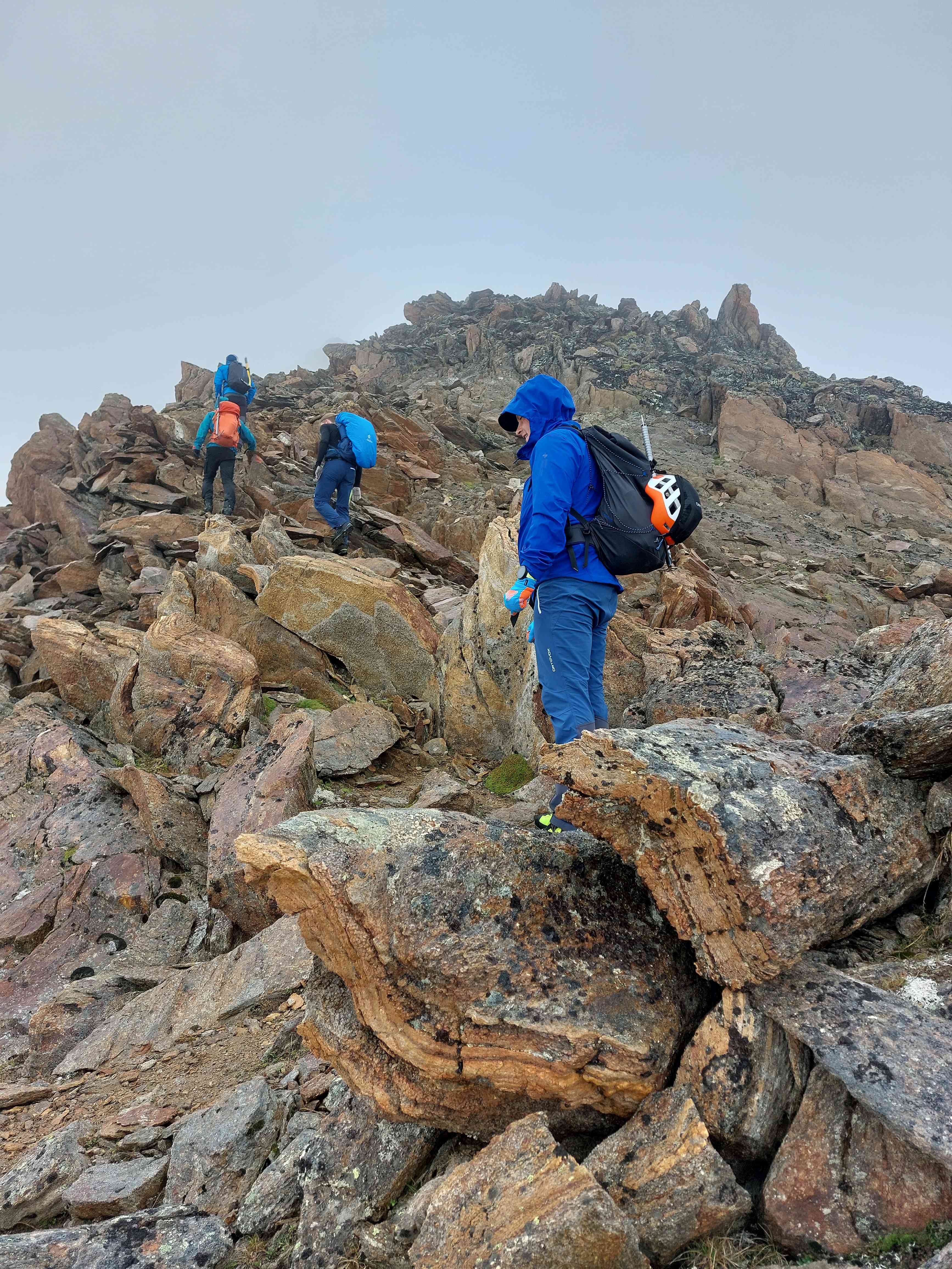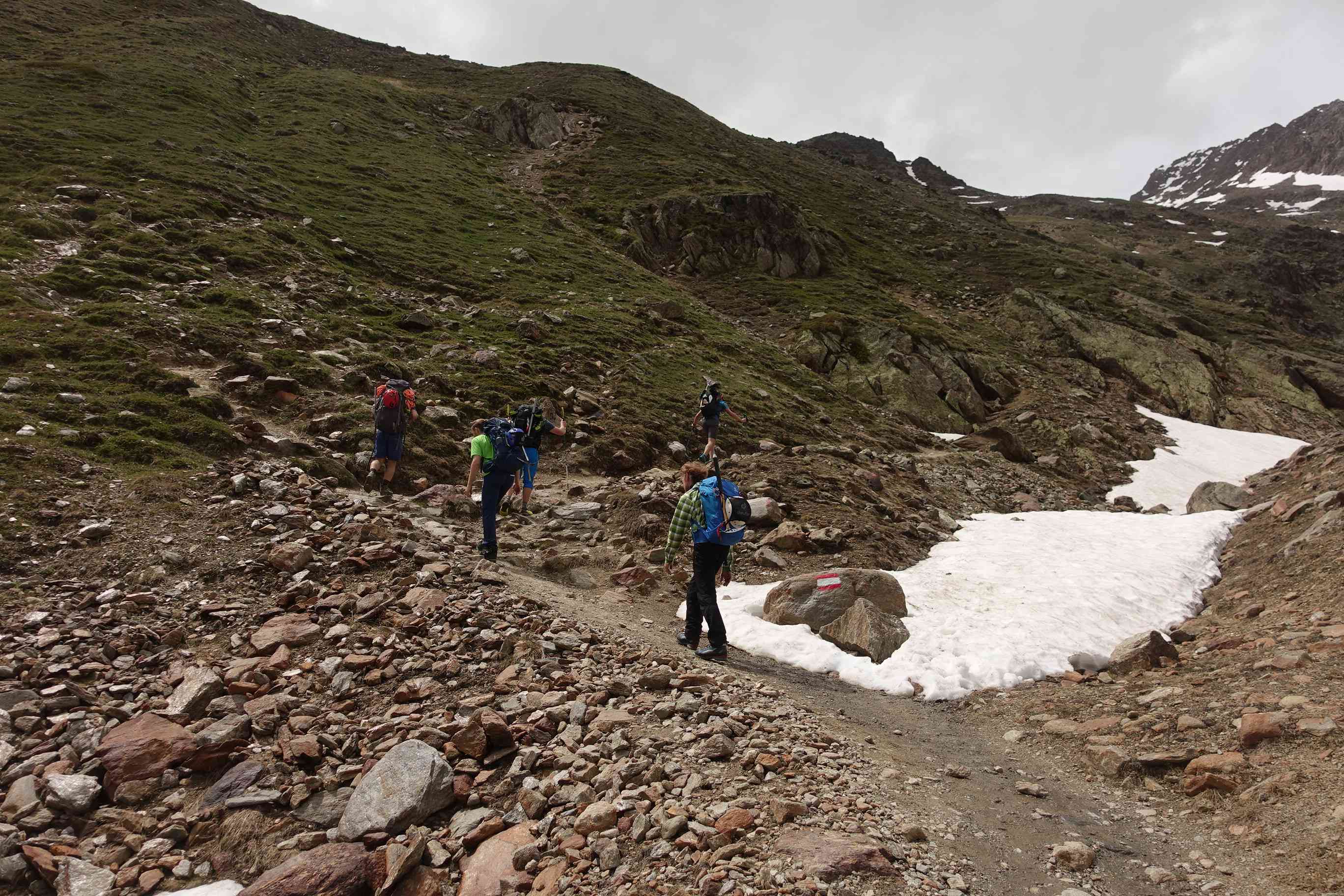 Wir trafen uns zum späten Frühstück um 7.30 Uhr. Noch „nieselte“ es aus dicken Wolken, dennoch machten wir uns gegen 9 Uhr auf in Richtung Vorderer Brochkogel (3565m). Zwar zogen die Wolken nicht wirklich auf an diesem Tag, aber es wurde trockener und so erreichten wir gemeinsam den Gipfel. Zunächst folgt man dem Seufertweg auf gleichbleibender Höhe in Richtung Vernagthütte bis man im Geröll des Mitterkars aufsteigt, um schließlich auf den Brochkogel zu kraxeln, der seinem Namen alle Ehre macht. Im oberen Teil gibt es dabei leichte Kletterstellen zu überwinden, bei denen auch Schwindelfreiheit absolut notwendig ist. Es gab dabei keinerlei Probleme in der Gruppe.