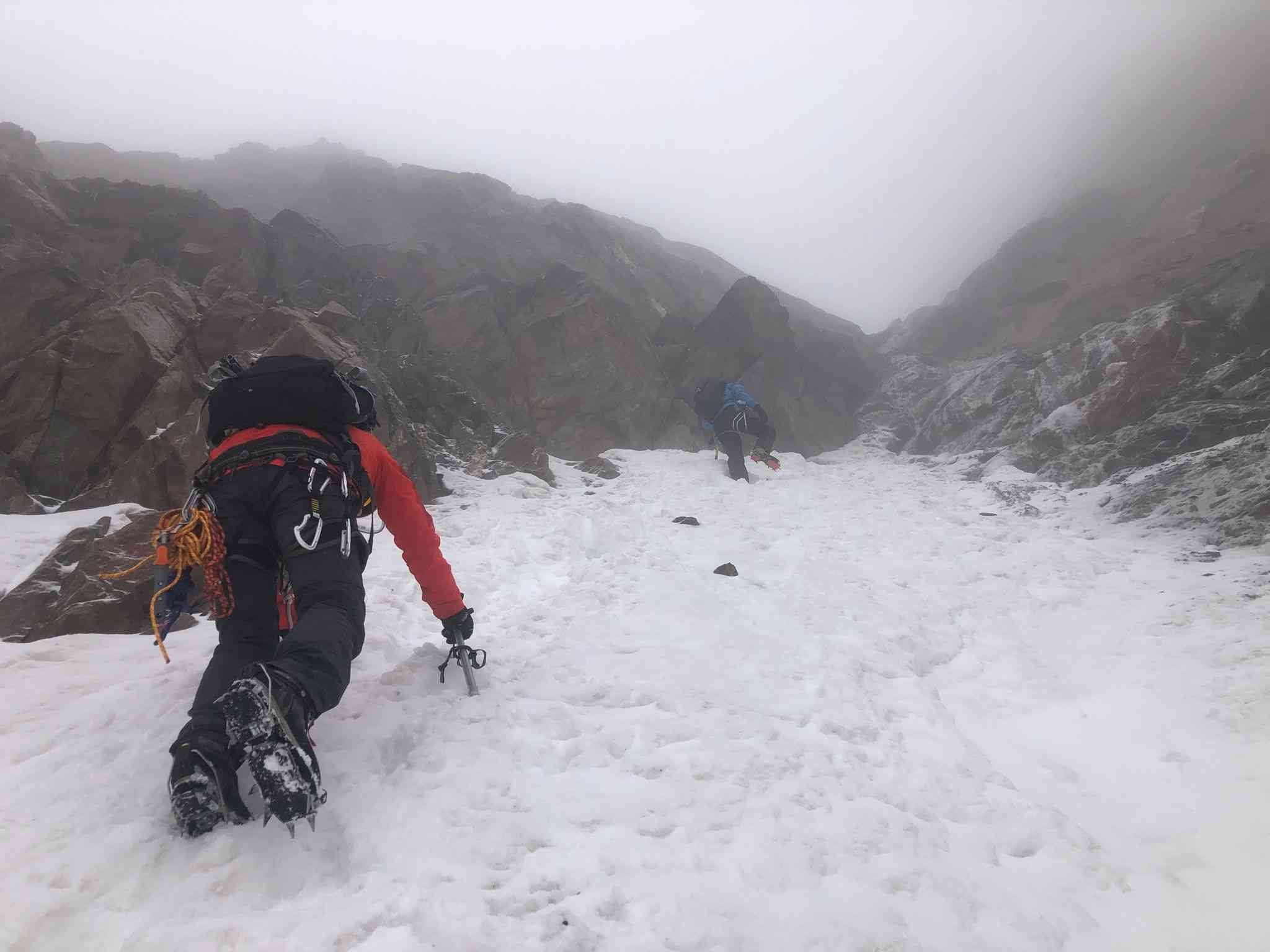 Heute klingelte der Wecker früher – Frühstück bereits um 5 Uhr. Die Rucksäcke waren gepackt und so starteten wir um kurz nach 6 Uhr. Noch immer war der Himmel dick wolkenverhangen, was sich erstmal auch nicht ändern sollte, aber die Vorhersage war nicht beunruhigend. Hinauf ging es tief ins Mitterkar hinein und auf den ehemaligen Mitterkarferner, der allerdings schon lange kein Eis mehr hat. Einige Schneefelder und Bachläufe waren zu queren bis wir unterhalb des Mitterkarjochs unsere Ausrüstung anlegten: Klettergurt mit Kletter- und Gletscherequipment sowie Steigeisen, Helm und Pickel. Der Wind pfiff, und so war auch noch eine zusätzliche Wärmeschicht notwendig. Zuverlässig trocken schien es bis dahin noch nicht zu sein. So also im steilen Schneefeld und durch eine noch steilere Rinne hoch zum Einstieg in den Klettersteig zum Mitterkarjoch. Den B/C Steig stiegen wir hinauf auf teilweise vereisten Stellen, da es über Nacht gefroren hatte hier oben.
