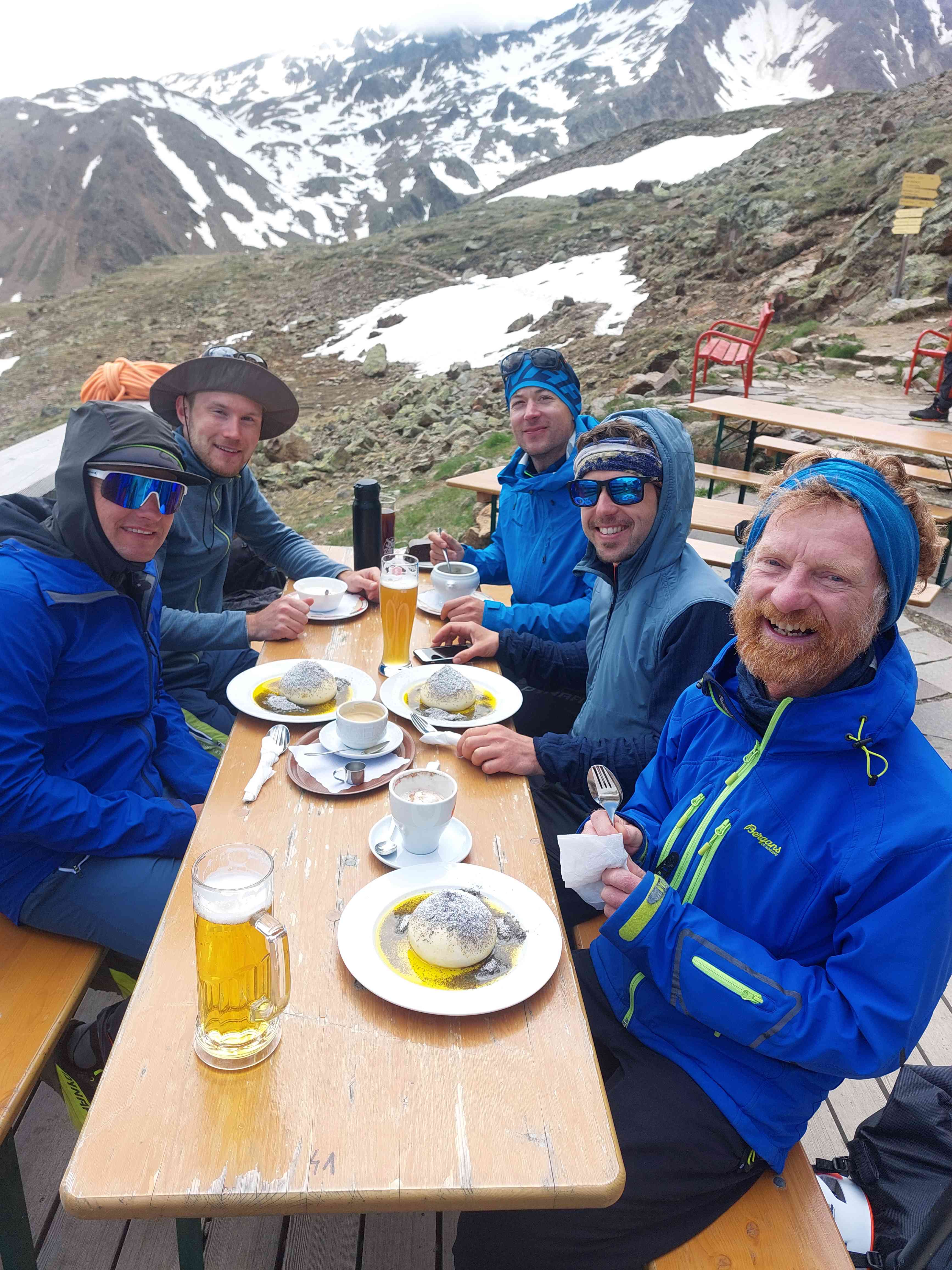 Zurück bei der Hütte waren wir nach dem Abstieg auf dem selben Weg pünktlich, so daß vor dem Abendessen noch Zeit zum Frischmachen war. Zum ausgiebigen 3-Gänge-Menü gab’s dort noch eine Nach- und Vorbesprechung – morgen also Wildspitze.