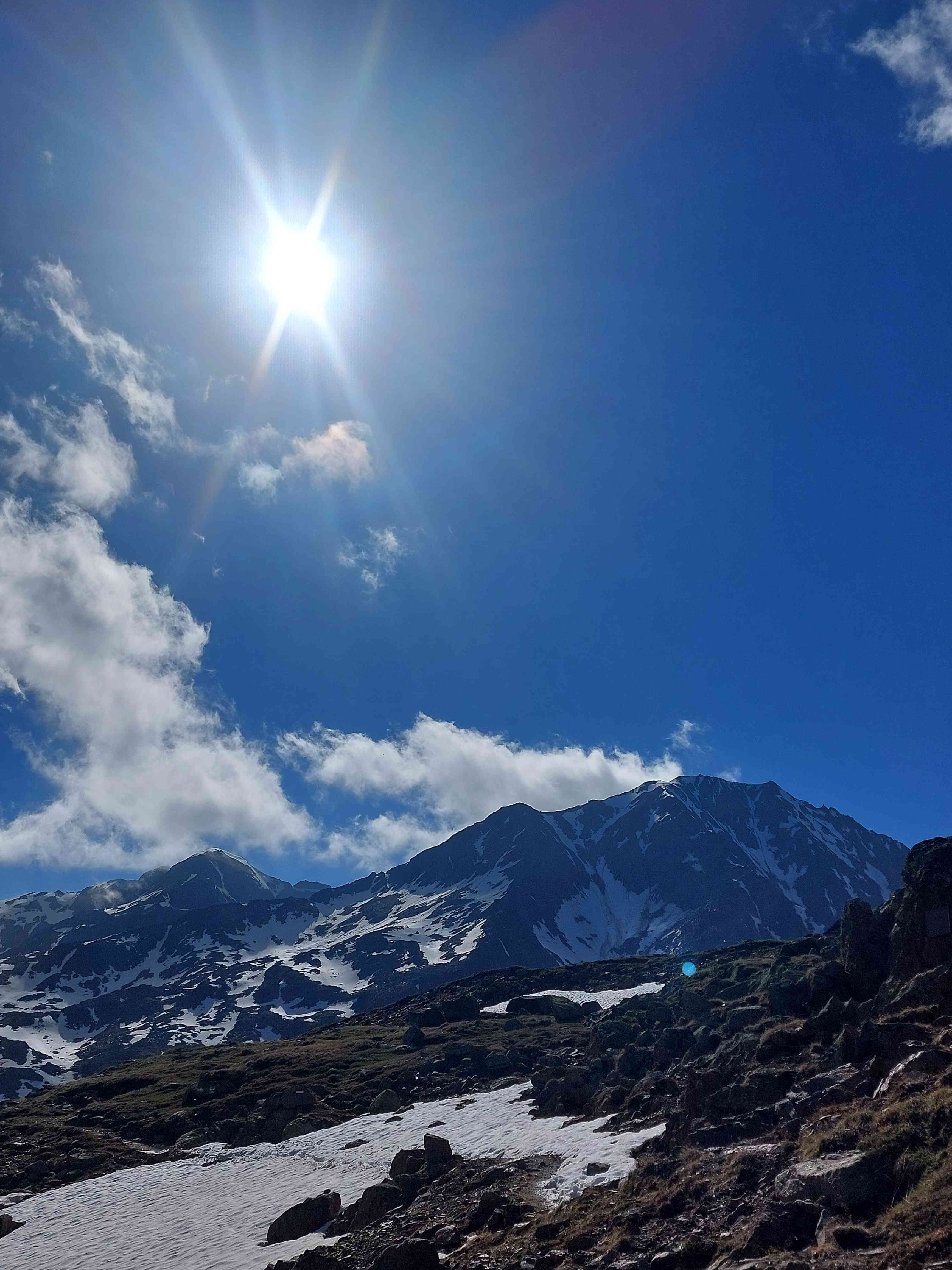 Da es relativ kühl und auch windig war, hielten wir uns am Gipfel nicht allzu lange auf und machten uns zügig an den Abstieg, Susan zog sich sinnigerweise die Spikes über die Schuhe, ich liebäugelte mit den Steigeisen, dumm nur, wenn man vergessen hat diese auf seine Schuhgrösse umzustellen, also musste ich wegen meiner Nachlässigkeit eben ohne Hilfsmittel an den Schuhen wieder runter kommen. Hierzu wählte ich dann gerne einmal Stellen fernab des eigentlichen Wegs und wich auf die südliche Gradseite aus, da hier weniger Schnee lag, der Nachteil war eben, dass dort der Schutt und die Platten etwas schwieriger zu begehen waren, allerdings aufgrund der Verhältnisse sicherlich für mich ohne Steighilfen die bessere Wahl. Der Abstieg zieht sich ebenfalls in die Länge, früh erspäht man im Tal schon die Hochfeilerhütte und die verdiente „Halbe“ hat man schon fest in Gedanken, aber wie gesagt, man muss sie sich schon redlich verdienen, dafür schmeckt es dann gleich umso mehr.