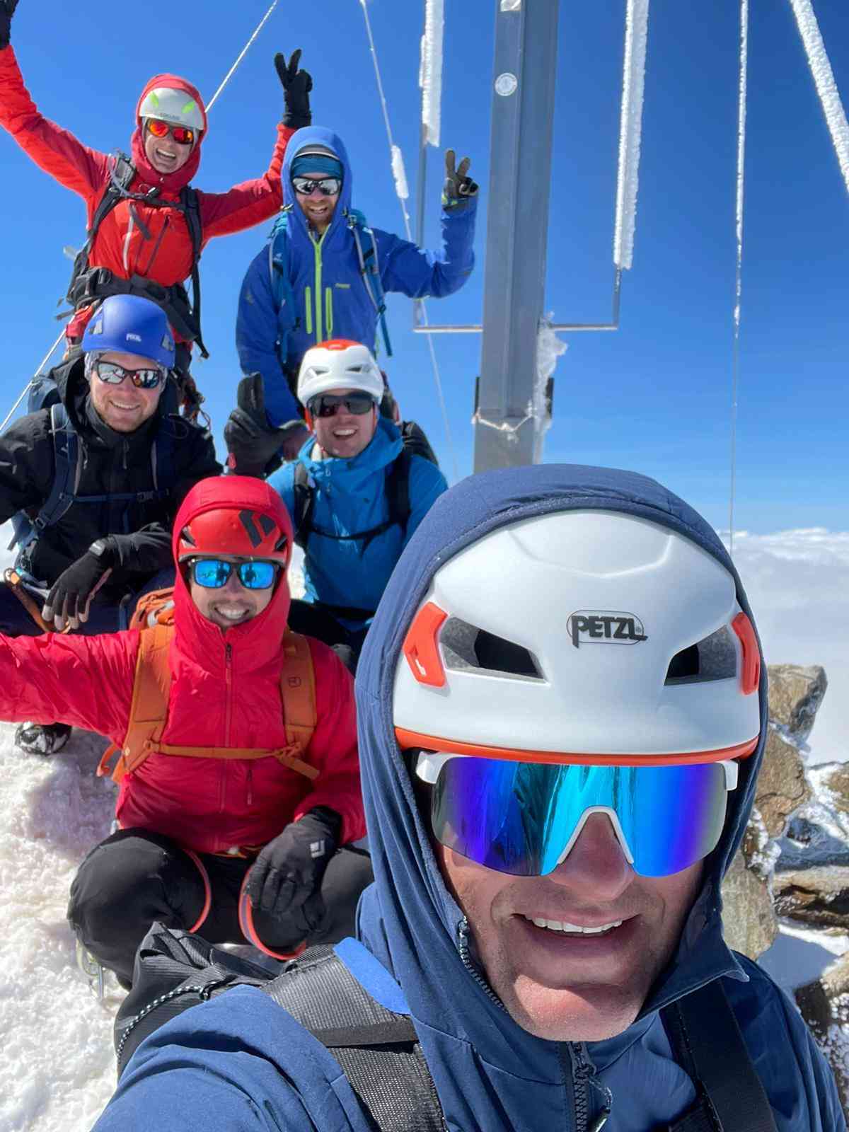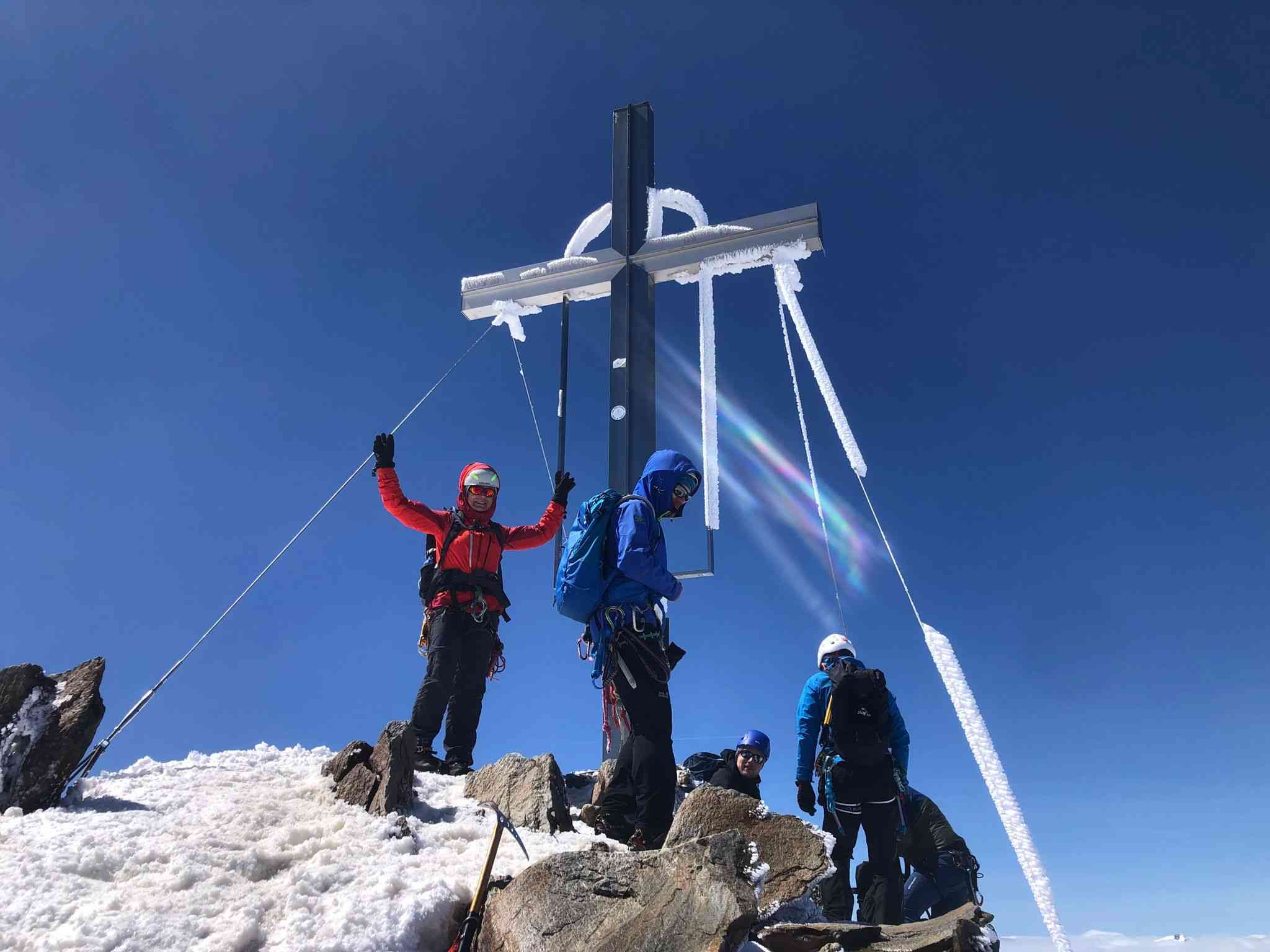 Hier gab es nun eine kurze Rast bevor wir die letzten Meter hinauf kraxelten wieder ohne Seil, nur mit Steigeisen und Pickel. Waren gerade bei dieser Rast einige Gruppen wieder vom Gipfel heruntergekommen, so hatten wir diesen nun ca. eine halbe Stunde lang für uns alleine – 3768m über dem Meer. Was für ein Erlebnis für uns alle! Unter meiner Sonnenbrille kullerten ein paar Freudentränchen.