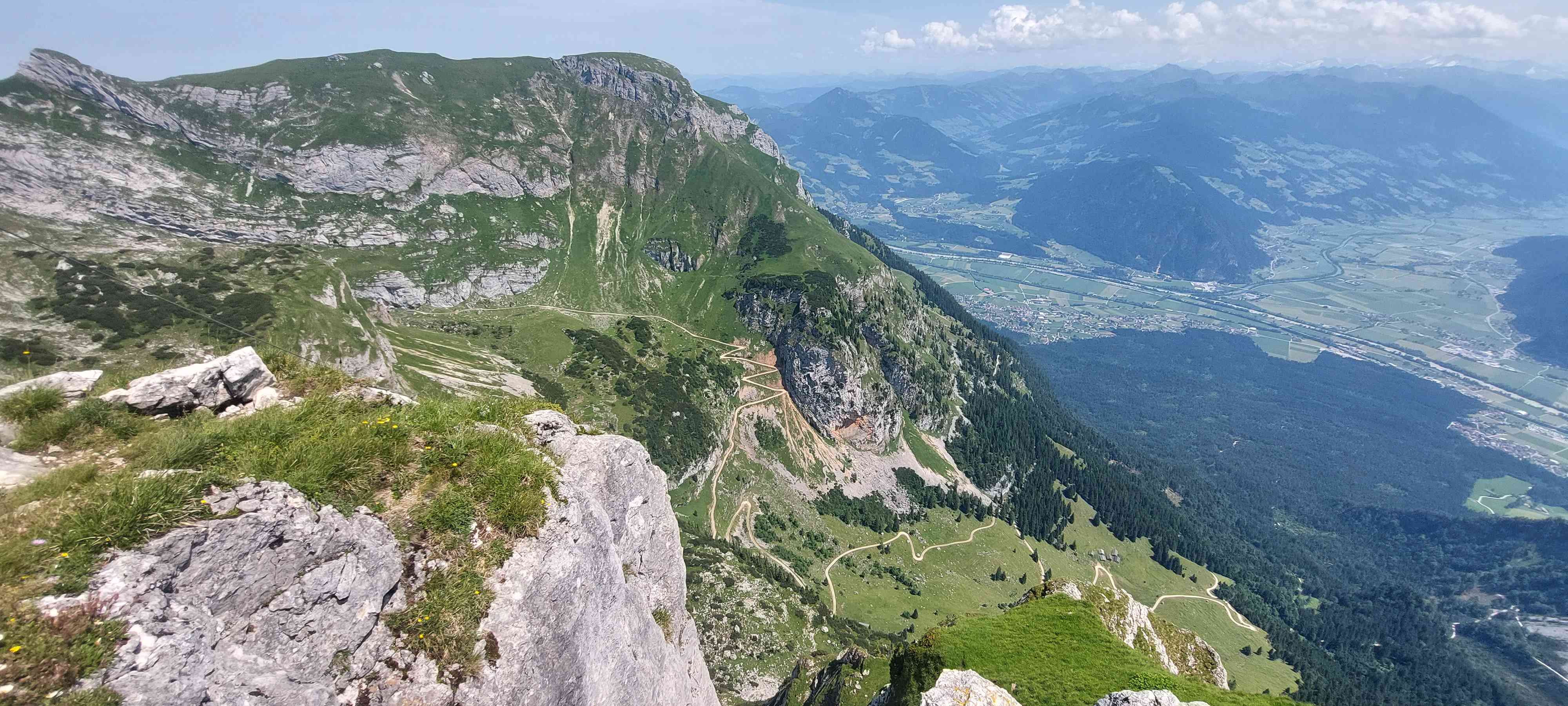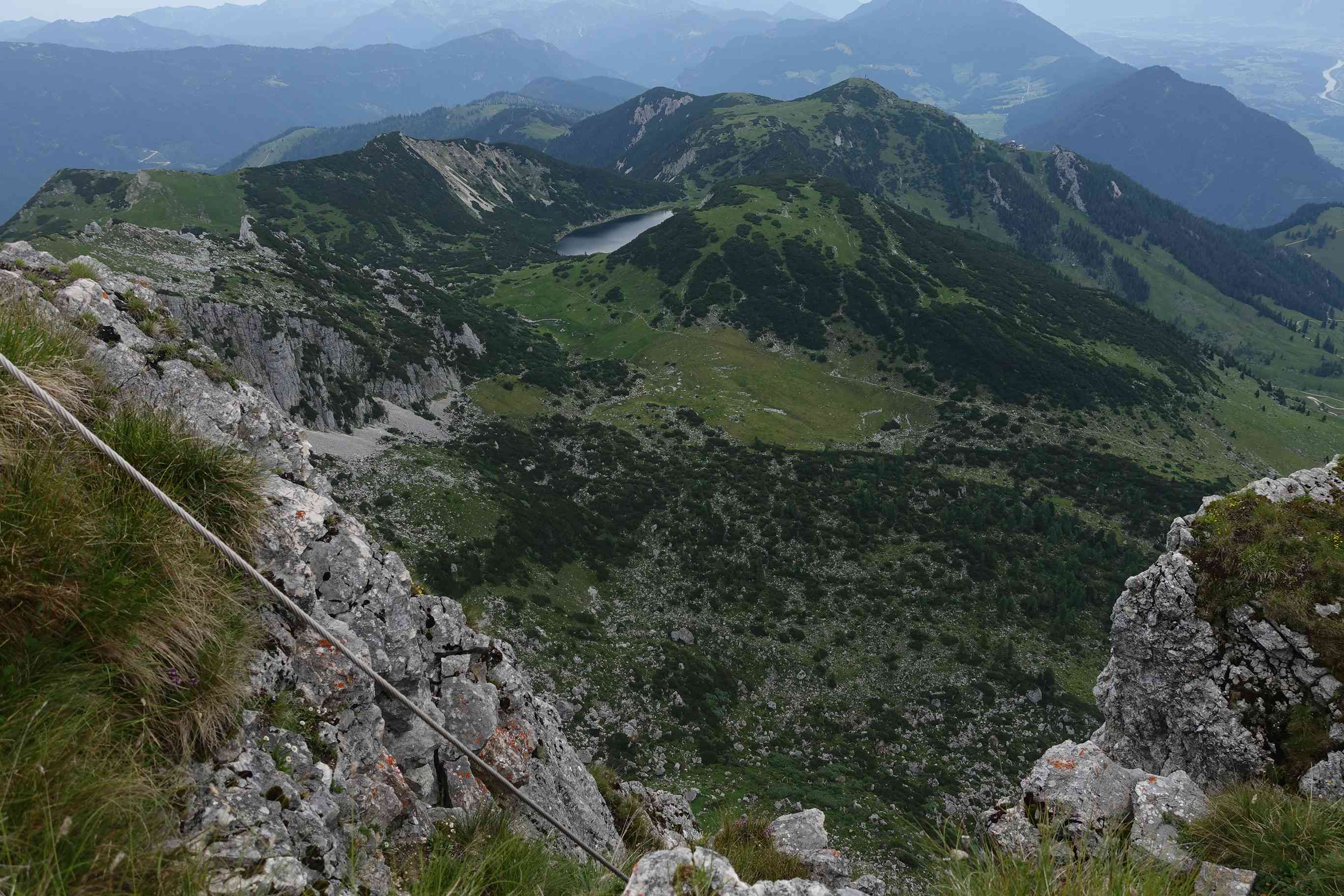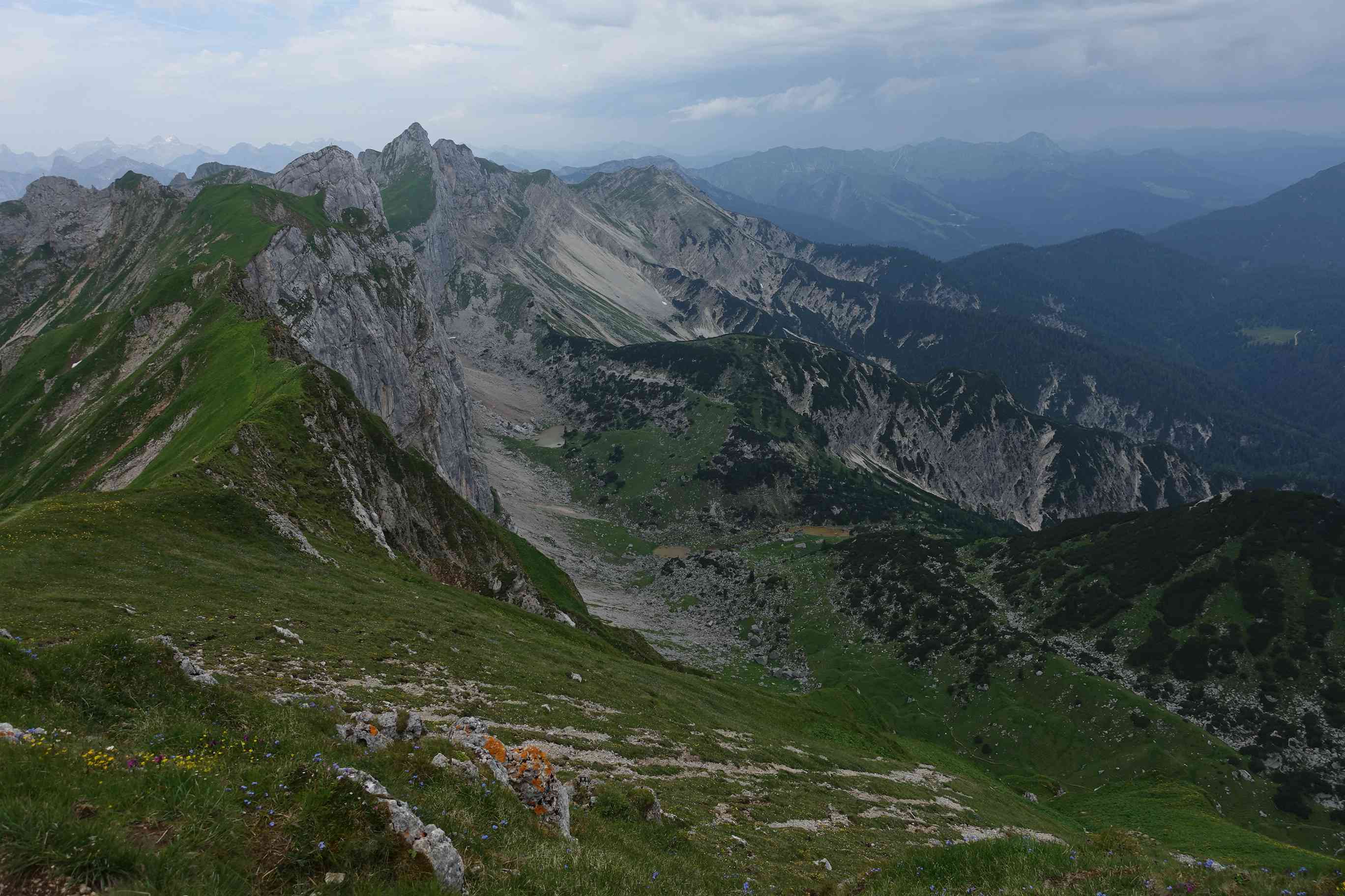 Der Himmel zog einigermaßen zu und der Wind ging auch, so war es garnicht mehr zu warm. Bereits vom Sonnwendjoch aus hat man einen großartigen Blick über den ganzen Gebirgsstock und wir sahen unsere weitere Tour des heutigen Tages vor uns. Der Sagzahn lag wie ein grüner Grashügel vor uns. Erst auf der anderen Seite runter folgte der Abstieg dann über einen leichten A-Klettersteig. Da ging der Zacken steil abwärts, was wir am vorigen Tag schon gesehen hatten vom Roßkogel aus. Über die Rofanspitze waren wir schnell drüber, denn da oben pfiff es nun richtig unangenehm und es waren viele Leute am Gipfel. In der Grubascharte oberhalb des Grubasees stärkten wir uns. Es war um die Mittagszeit, bevor wir rüber zur Haidachstellwand liefen. War in der Wettervorhersage nichts Bedenkliches vorher zu sehen gewesen, so hatten sich aber ab der Rofanspitze Gewitter im Norden gezeigt, die wir erstmal im Auge behielten. Es sah nicht wirklich gefährlich für uns aus und auch laut meiner Echtzeit Wetterapp drückte es diese Front eher nach Südosten als zu uns her, dennoch beobachteten wir. Angekommen am Einstieg in den Klettersteig aber riß es nun endgültig auf, es wurde wieder warm und das Schwarz am Himmel war gänzlich verschwunden.