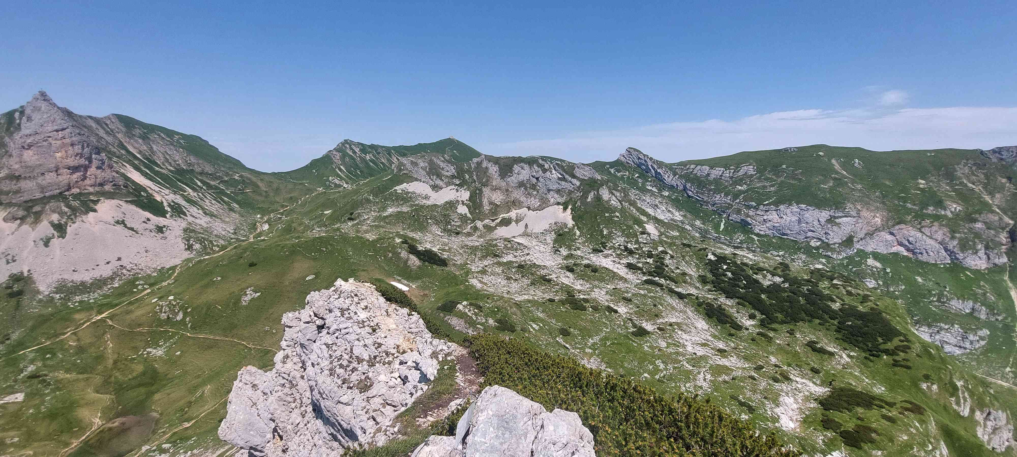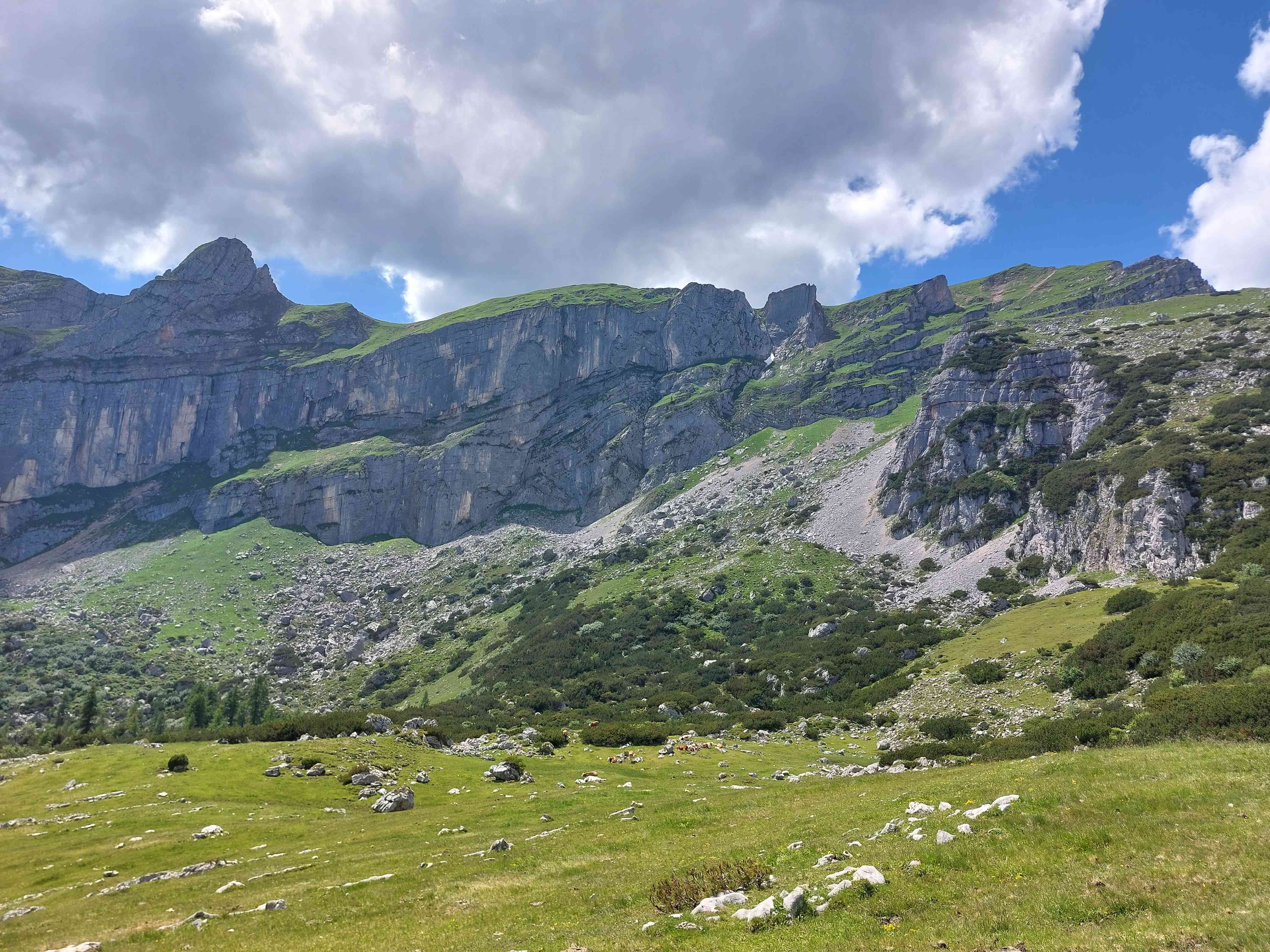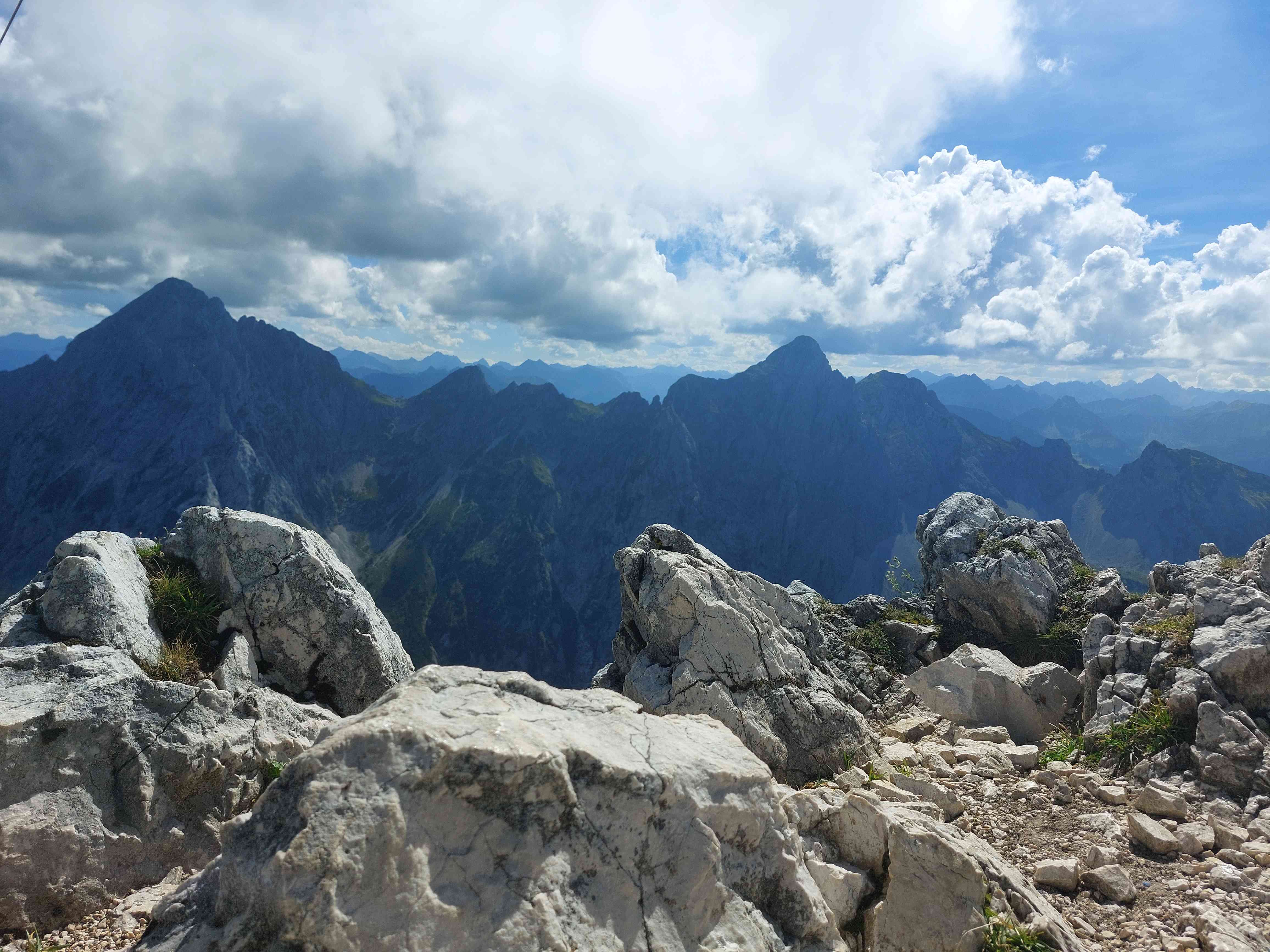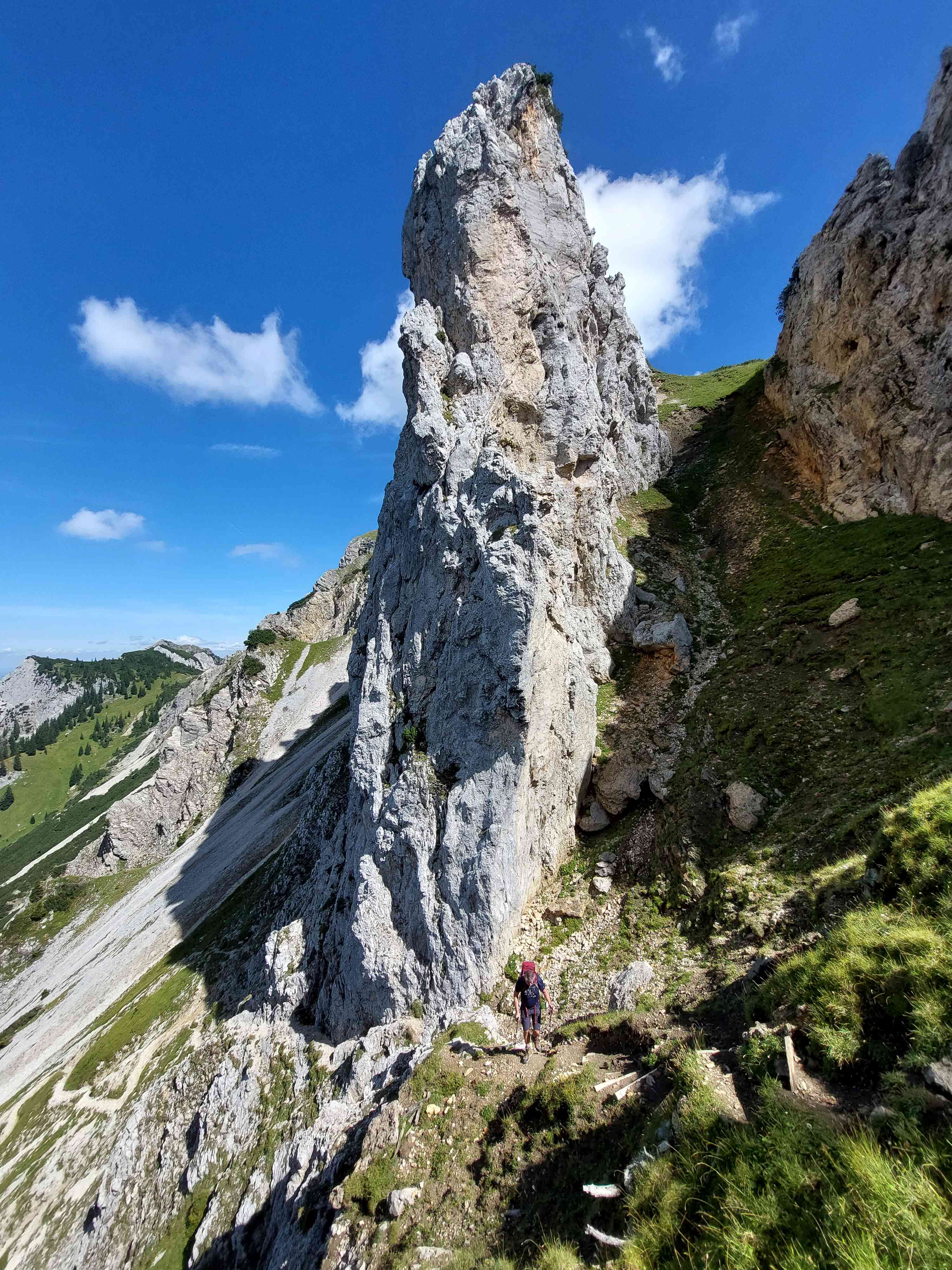 Der Himmel zog einigermaßen zu und der Wind ging auch, so war es garnicht mehr zu warm. Bereits vom Sonnwendjoch aus hat man einen großartigen Blick über den ganzen Gebirgsstock und wir sahen unsere weitere Tour des heutigen Tages vor uns. Der Sagzahn lag wie ein grüner Grashügel vor uns. Erst auf der anderen Seite runter folgte der Abstieg dann über einen leichten A-Klettersteig. Da ging der Zacken steil abwärts, was wir am vorigen Tag schon gesehen hatten vom Roßkogel aus. Über die Rofanspitze waren wir schnell drüber, denn da oben pfiff es nun richtig unangenehm und es waren viele Leute am Gipfel. In der Grubascharte oberhalb des Grubasees stärkten wir uns. Es war um die Mittagszeit, bevor wir rüber zur Haidachstellwand liefen. War in der Wettervorhersage nichts Bedenkliches vorher zu sehen gewesen, so hatten sich aber ab der Rofanspitze Gewitter im Norden gezeigt, die wir erstmal im Auge behielten. Es sah nicht wirklich gefährlich für uns aus und auch laut meiner Echtzeit Wetterapp drückte es diese Front eher nach Südosten als zu uns her, dennoch beobachteten wir. Angekommen am Einstieg in den Klettersteig aber riß es nun endgültig auf, es wurde wieder warm und das Schwarz am Himmel war gänzlich verschwunden.
