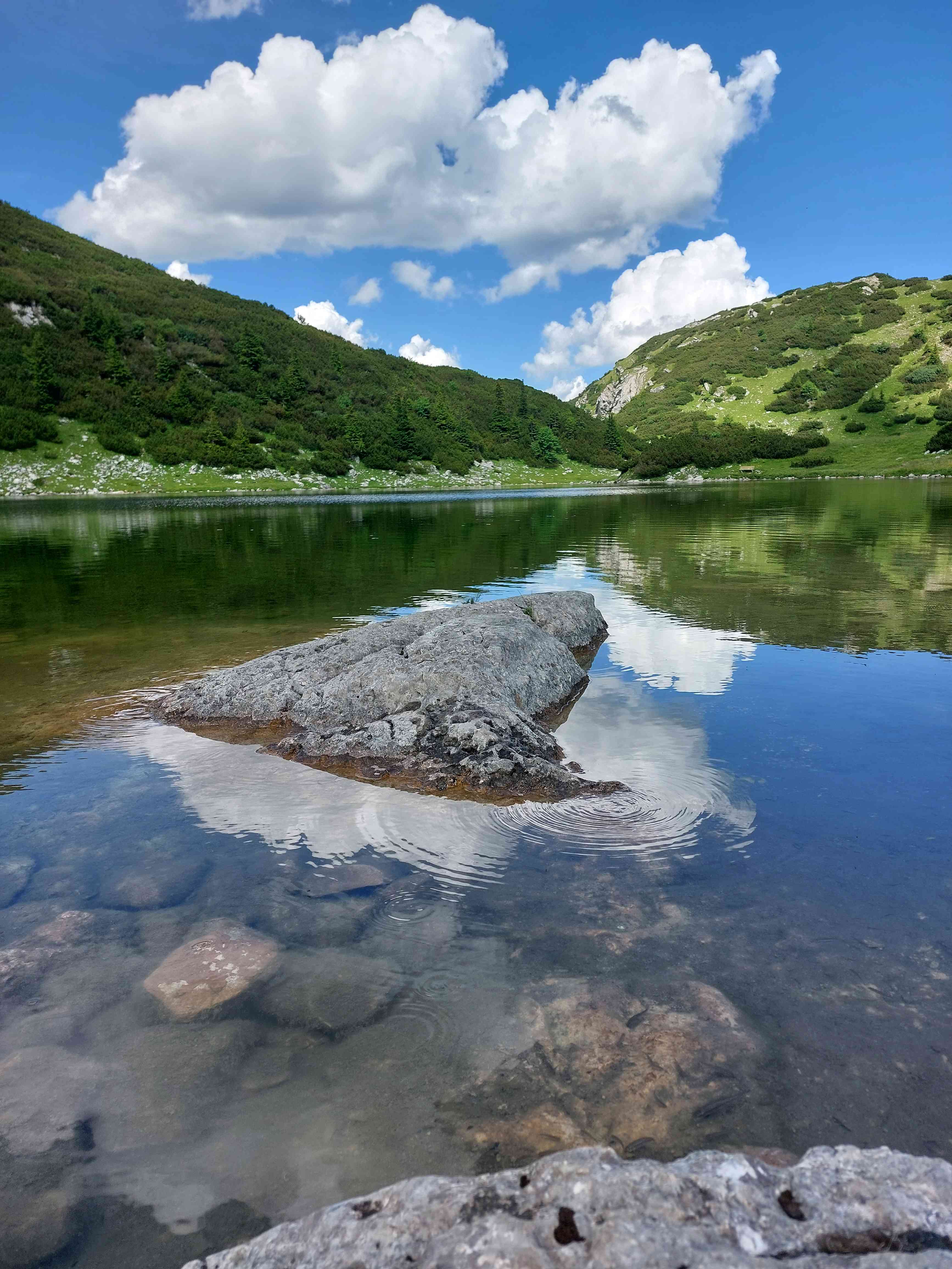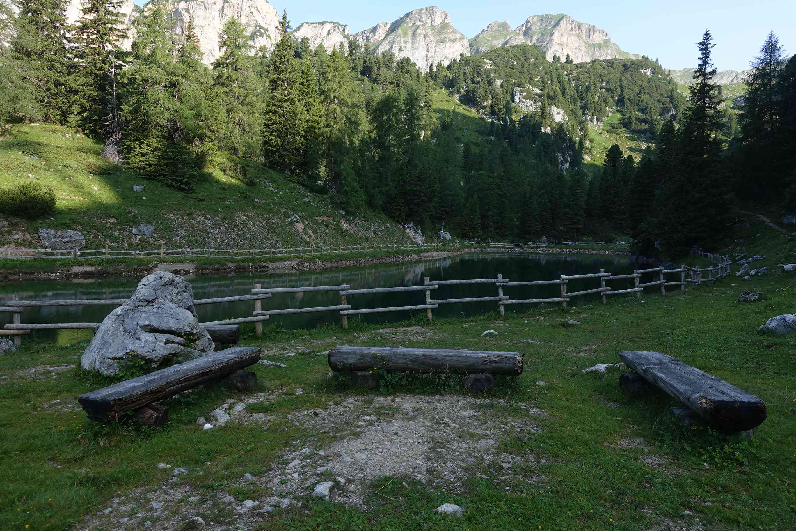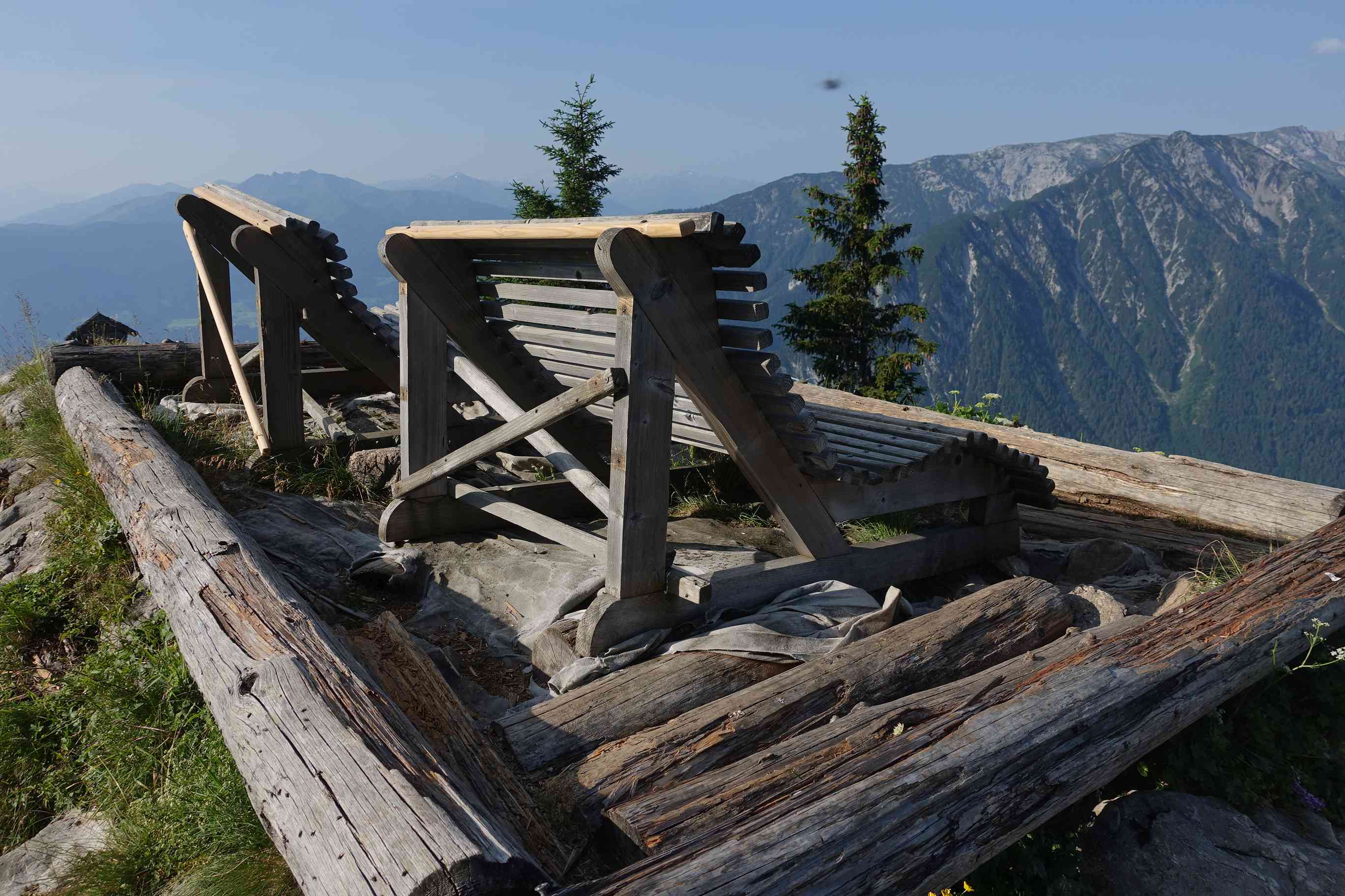 Hier machten wir nun eine gute Stunde Pause bei einem erfrischenden Getränk, ich meldete uns an und gegen kurz nach 13 Uhr starteten wir in Richtung Zireiner See und Roßkogel mit leichtem Gepäck. Ein Stück der Strecke war Fahrweg, aber ansonsten auch hier wieder tolle Bergwege und man bekam ein paar Einblicke in das, was uns an den beiden nächsten Tagen erwarten würde. Außerdem konnte man jetzt rüber zum Guffert sehen, an dem ich vor ein paar Wochen mit Nicole unterwegs gewesen war. Am See ließen wir uns Zeit und hängten die Füße ins Wasser. Kurz unterhalb des Roßkogel (1948m) befindet sich die ehemalige Seilbahnstation, die einst von Kramsach heraufkam, ein 1-er Sessellift, der aber seit 2015 nicht mehr in Betrieb ist.