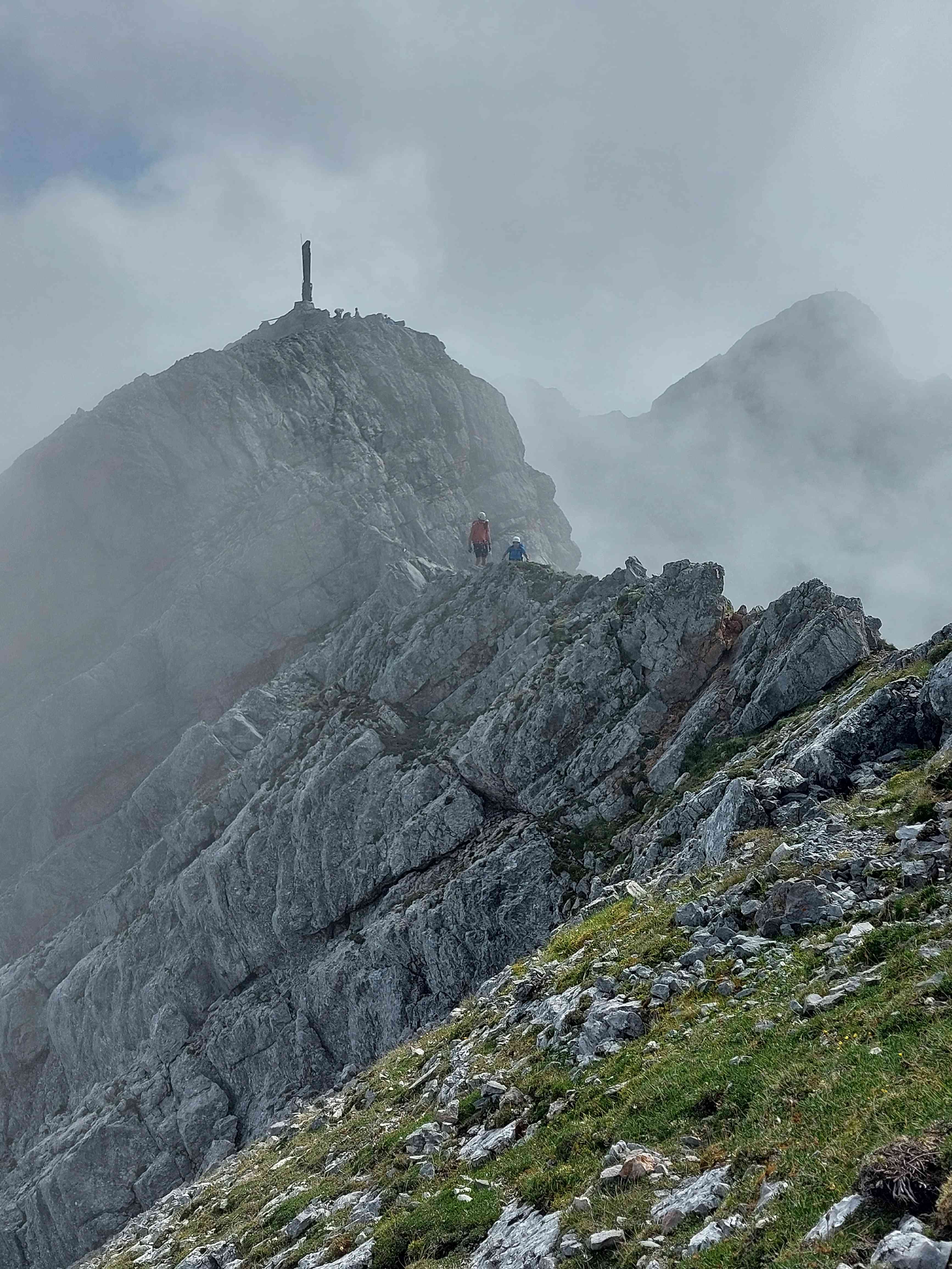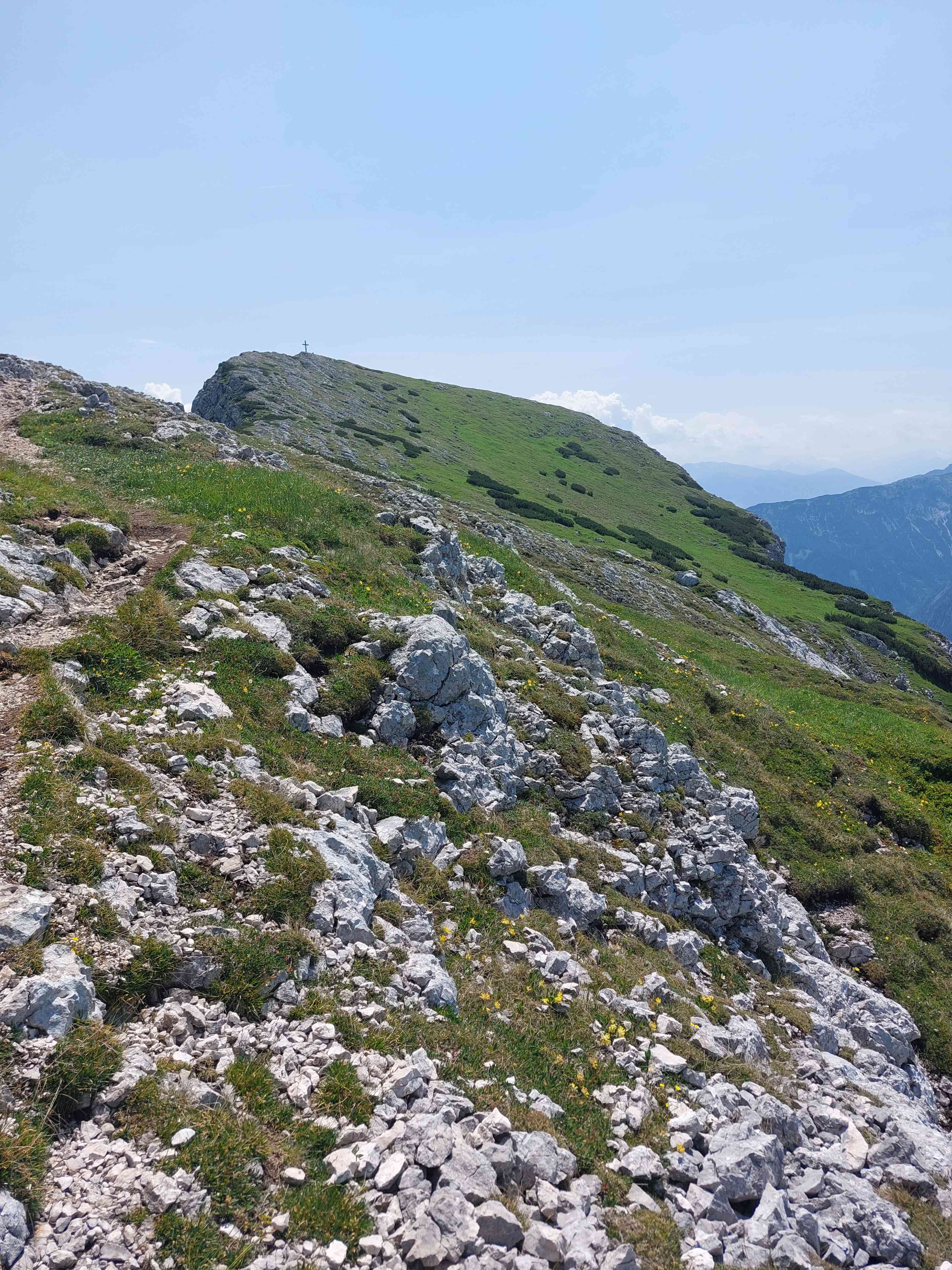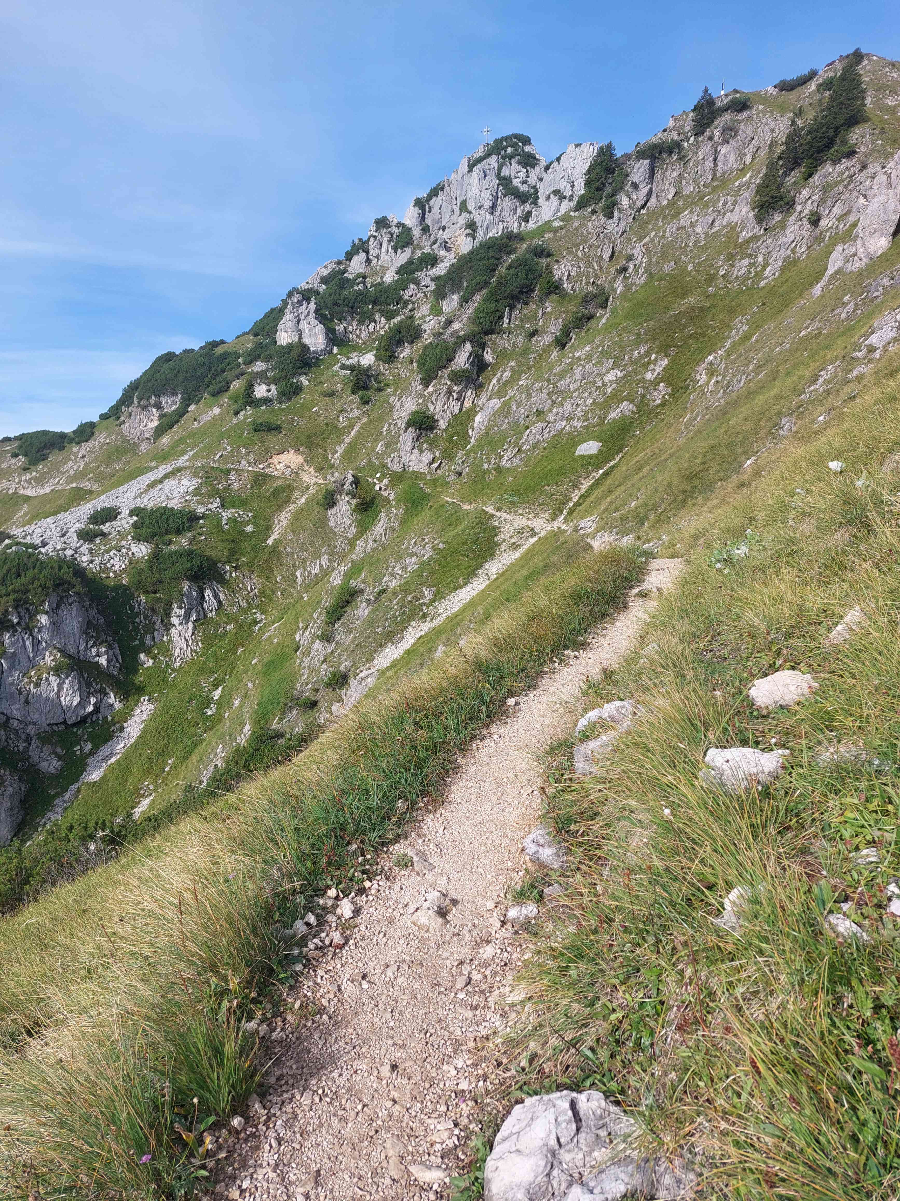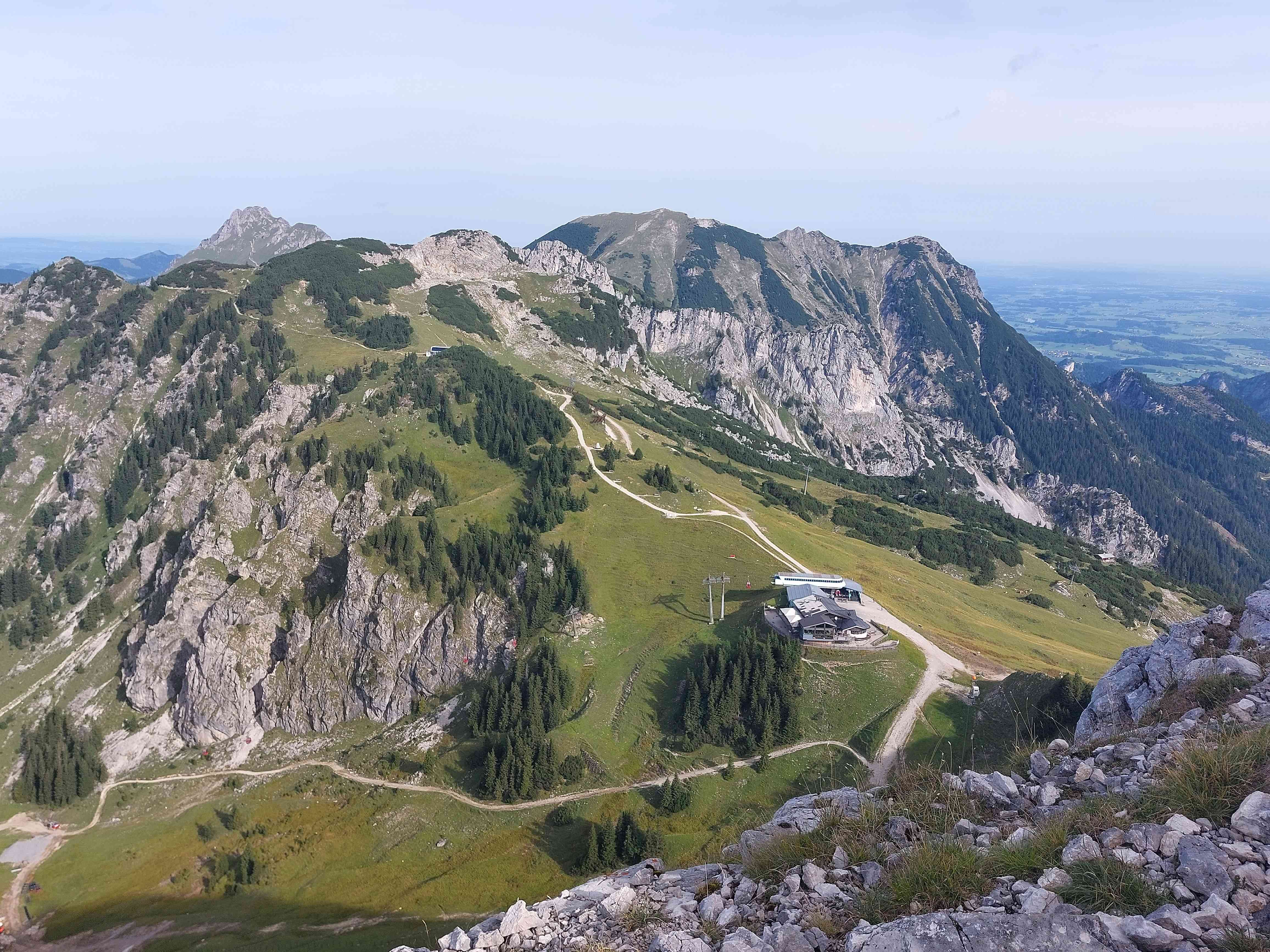 Frühstück gab es um 7 Uhr, 8 Uhr Start. Zunächst ging es auf dem Normalweg zur Bad Kissinger Hütte, von dem wir allerdings dann abzweigten, um noch über die Läuferspitze zu klettern. 1956m hoch, aber ich hatte keine gute Beschreibung gefunden, nach der ich sicher sein konnte, daß wir da wirklich drüber gehen. Alternativen hätte es gegeben, um umzudrehen. Wir gingen und es war machbar, etwas steil und grieselig, im Anschluß eine Wand mit Seil und Trittstufen, die ausgesetzt war, aber für uns alle kein Problem darstellte. So genossen wir den Gipfel. An diesem Tag war es zwar sonnig aber etwas eingetrübt, die Sicht daher nicht ganz genial, aber gegeben. Auf der anderen Seite ging es auch seilversichert wieder runter, aber nicht mehr so ausgesetzt. So kamen wir zum Füssener Jöchel, wo wir uns an der Bergstation der Bergbahn von Grän eine kleine Rast gönnten.