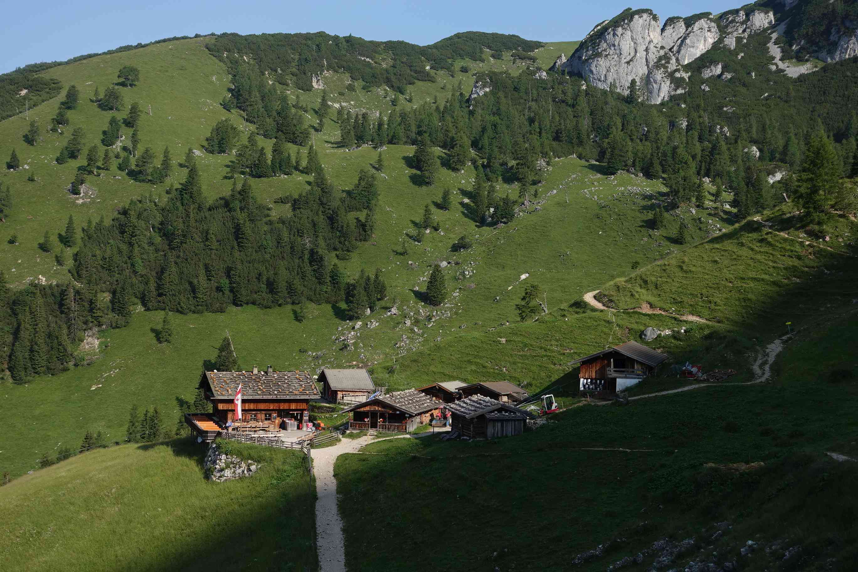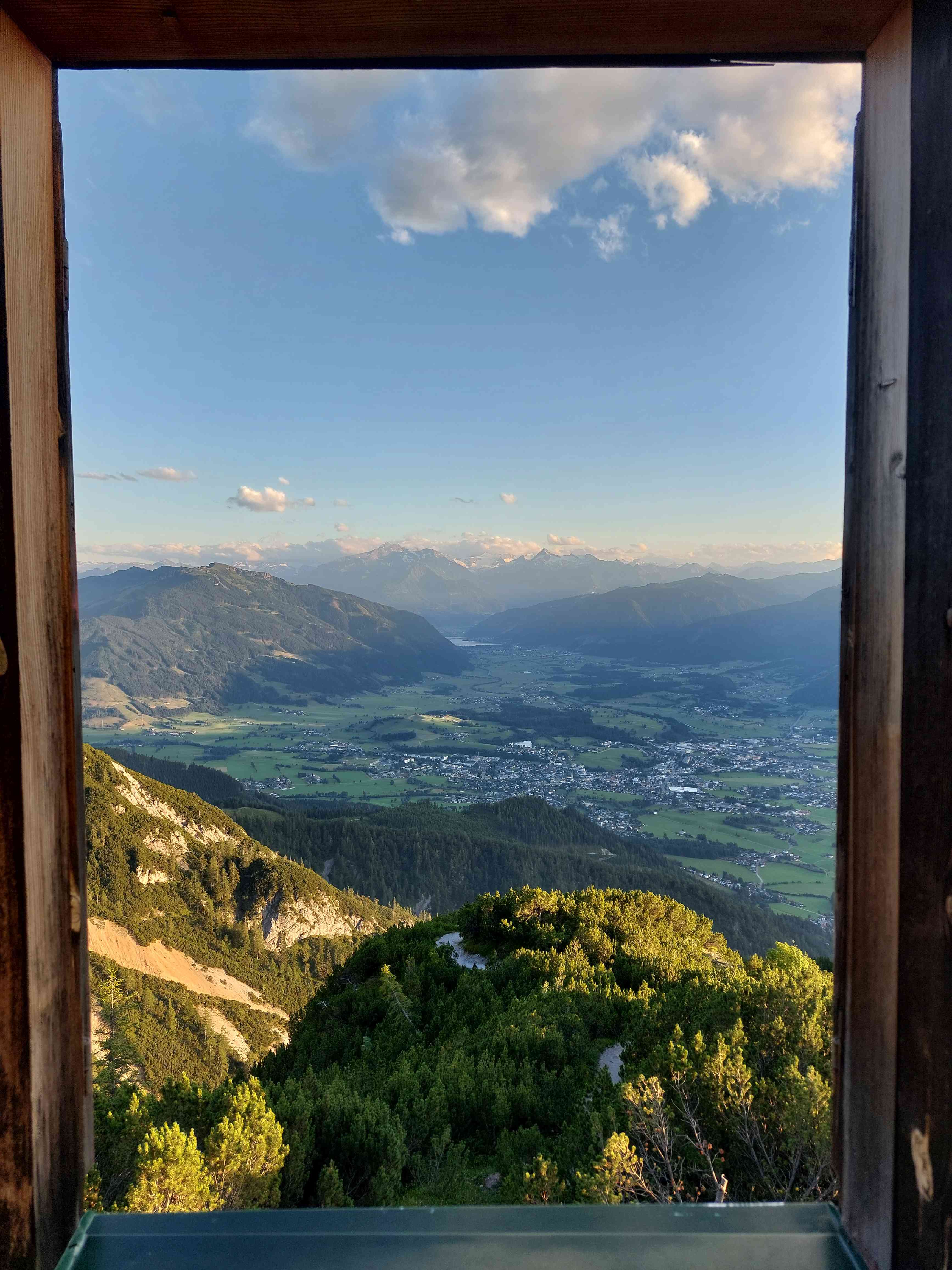 Es war heiß an diesem Tag – weiter über 30 Grad sollten es werden. So saßen wir erstmal 5 Stunden im Auto nach Saalfelden im Urlaubsverkehr. Allein das strengte schon an. Gegen halb 4 am angedachten Parkplatz angekommen wurden Schuhe geschnürt und los ging’s in Richtung Einsiedelei und dann über den Jägersteig hoch zur Hütte. Die Sonne brannte runter, so daß das Ganze ganz schön schweißtreibend war und viel Wasser benötigte. Nach 2 ¾h kamen wir an. Ich quälte mich irgendwie ziemlich.