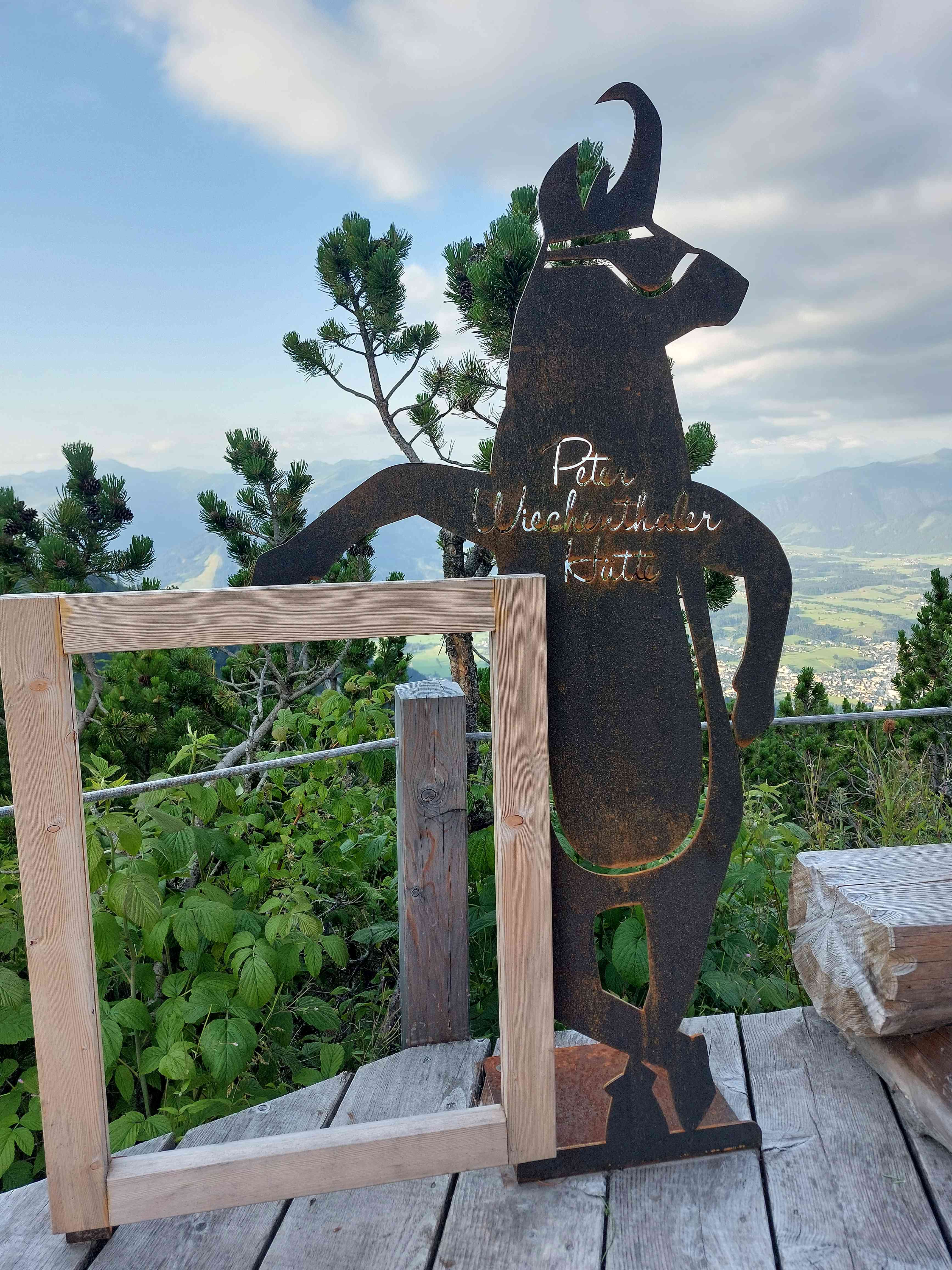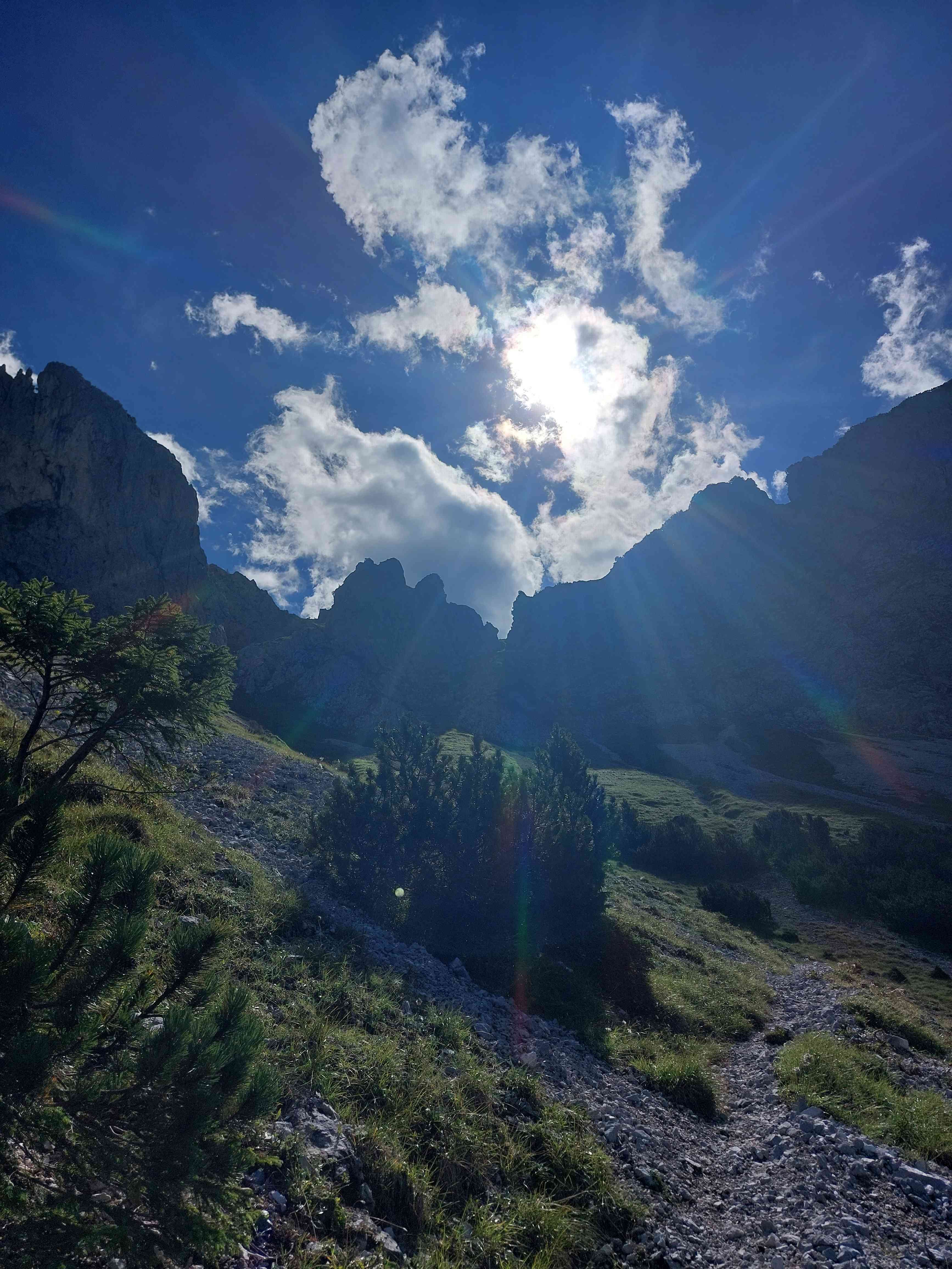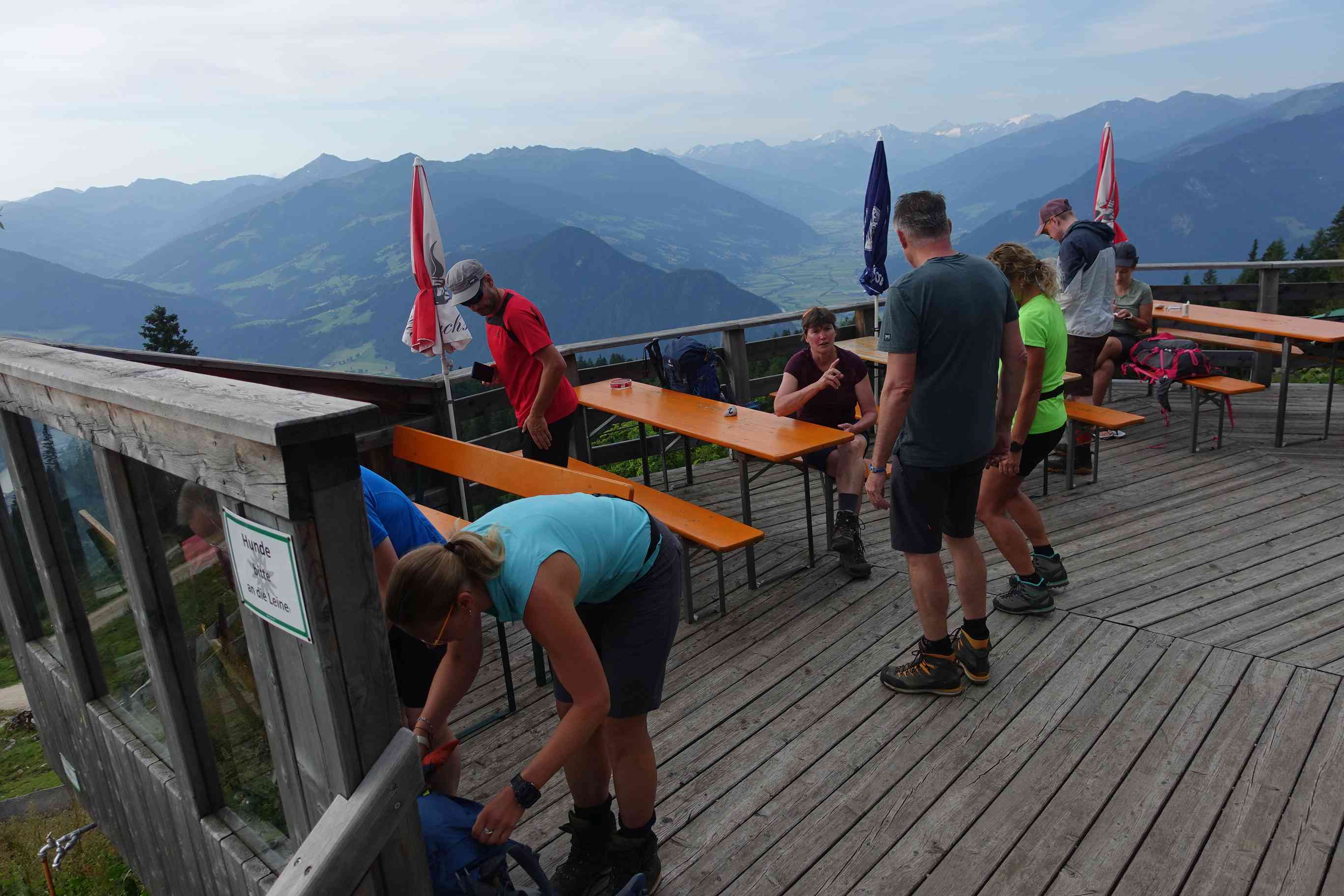 3.30 Uhr Start bei mir. Bin ich sonst immer wesentlich früher für sowas aufgestanden, so war es diesmal 3.15 Uhr. Ich stand im Bett, hatte zum Glück vorher schon alles gerichtet, so daß ich nur noch schnell Tee und Kaffee für die Fahrt machen mußte – ziemlich hektisch. Um kurz nach 4 waren Reiner, Lissy und Andy im Auto bei mir und los ging’s zur Rofan Seilbahnstation, wo wir für 3 Tage parken wollten und kurz nach dem Eintreffen auf Roland, Nicole und Petra trafen. Wir waren also komplett pünktlich um halb 8 hier, da der Bus um 8.13 Uhr fahren sollte, aber am Ticketautomaten war es nicht möglich, ein 3-Tagesticket zu lösen. Ein klein wenig Panik kam auf. Die Kasse der Seilbahnstation öffnete zum Glück kurz vor 8, so daß wir unser Ticket bekamen, aber was war das? An der Bushaltestelle hing ein ganz anderer Fahrplan als der, den ich „aktuell“ aus dem Internet hatte. Die Buslinie fuhr garnicht bis zur Kanzelkehre. Es wurde schon hier umgedacht und über Alternativen gesprochen. Dennoch kam ein Bus um die angegebene Uhrzeit und ich fragte den Busfahrer, der uns freundlicherweise mitnahm zur nächsten Haltestelle ca. 500m weiter. Im Nachhinein habe Ich erfahren, daß die Busfahrpläne exakt zu diesem 9.7. in Österreich umgestellt worden waren – vielleicht hatte sich da diese Änderung ergeben. Ich weiß es nicht. Als wir an der anderen Haltestelle einfuhren kam auch schon unser Bus – eine andere Buslinie eben – aber wir kamen dahin, wo wir starten wollten, also alle Aufregung umsonst. Es lief dann und wir liefen – erst bergab und dann bergauf, sehr steil teilweise, aber eben gewohnte Bergwege nach kurzer Zeit. Der Zustieg zur Bayreuther Hütte von der Kanzelkehre aus ist eine tolle Alternative in jedem Fall. Die Sonne brannte schon recht bald runter. Auch wenn wir viel im Wald unterwegs waren, wurde es doch gut warm und bei eben diesem Sonnenschein kamen wir auf der Bayreuther Hütte auf ca. 1600m an nach ca. 3h, also absolut gut in der Zeit.
