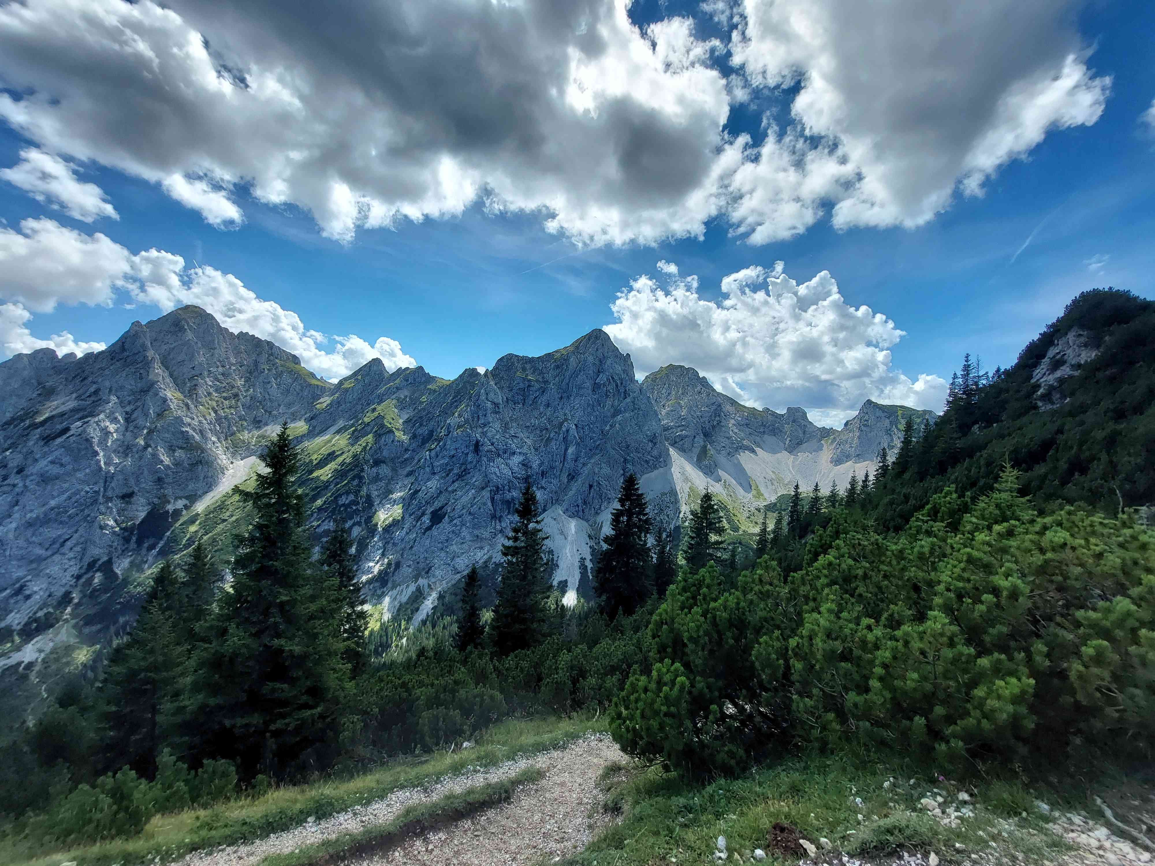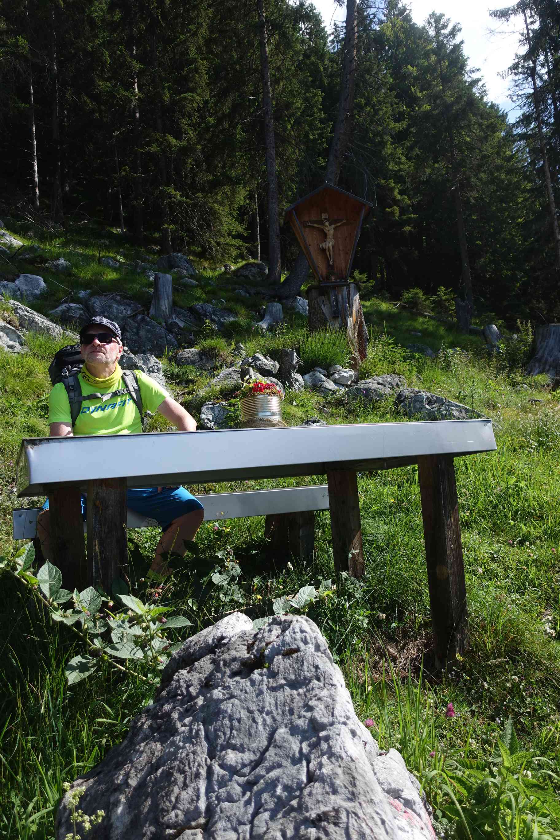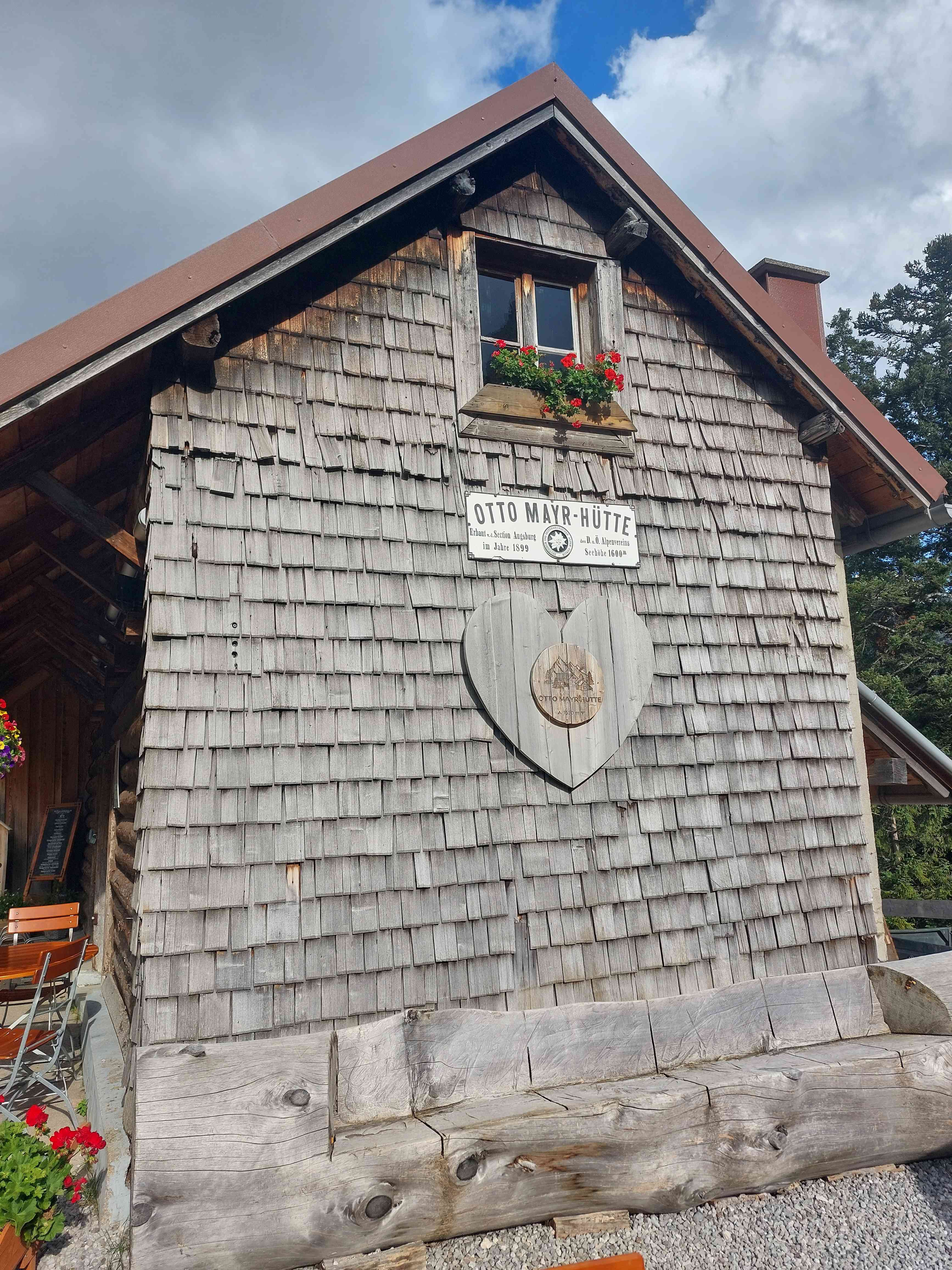3.30 Uhr Start bei mir. Bin ich sonst immer wesentlich früher für sowas aufgestanden, so war es diesmal 3.15 Uhr. Ich stand im Bett, hatte zum Glück vorher schon alles gerichtet, so daß ich nur noch schnell Tee und Kaffee für die Fahrt machen mußte – ziemlich hektisch. Um kurz nach 4 waren Reiner, Lissy und Andy im Auto bei mir und los ging’s zur Rofan Seilbahnstation, wo wir für 3 Tage parken wollten und kurz nach dem Eintreffen auf Roland, Nicole und Petra trafen. Wir waren also komplett pünktlich um halb 8 hier, da der Bus um 8.13 Uhr fahren sollte, aber am Ticketautomaten war es nicht möglich, ein 3-Tagesticket zu lösen. Ein klein wenig Panik kam auf. Die Kasse der Seilbahnstation öffnete zum Glück kurz vor 8, so daß wir unser Ticket bekamen, aber was war das? An der Bushaltestelle hing ein ganz anderer Fahrplan als der, den ich „aktuell“ aus dem Internet hatte. Die Buslinie fuhr garnicht bis zur Kanzelkehre. Es wurde schon hier umgedacht und über Alternativen gesprochen. Dennoch kam ein Bus um die angegebene Uhrzeit und ich fragte den Busfahrer, der uns freundlicherweise mitnahm zur nächsten Haltestelle ca. 500m weiter. Im Nachhinein habe Ich erfahren, daß die Busfahrpläne exakt zu diesem 9.7. in Österreich umgestellt worden waren – vielleicht hatte sich da diese Änderung ergeben. Ich weiß es nicht. Als wir an der anderen Haltestelle einfuhren kam auch schon unser Bus – eine andere Buslinie eben – aber wir kamen dahin, wo wir starten wollten, also alle Aufregung umsonst. Es lief dann und wir liefen – erst bergab und dann bergauf, sehr steil teilweise, aber eben gewohnte Bergwege nach kurzer Zeit. Der Zustieg zur Bayreuther Hütte von der Kanzelkehre aus ist eine tolle Alternative in jedem Fall. Die Sonne brannte schon recht bald runter. Auch wenn wir viel im Wald unterwegs waren, wurde es doch gut warm und bei eben diesem Sonnenschein kamen wir auf der Bayreuther Hütte auf ca. 1600m an nach ca. 3h, also absolut gut in der Zeit.