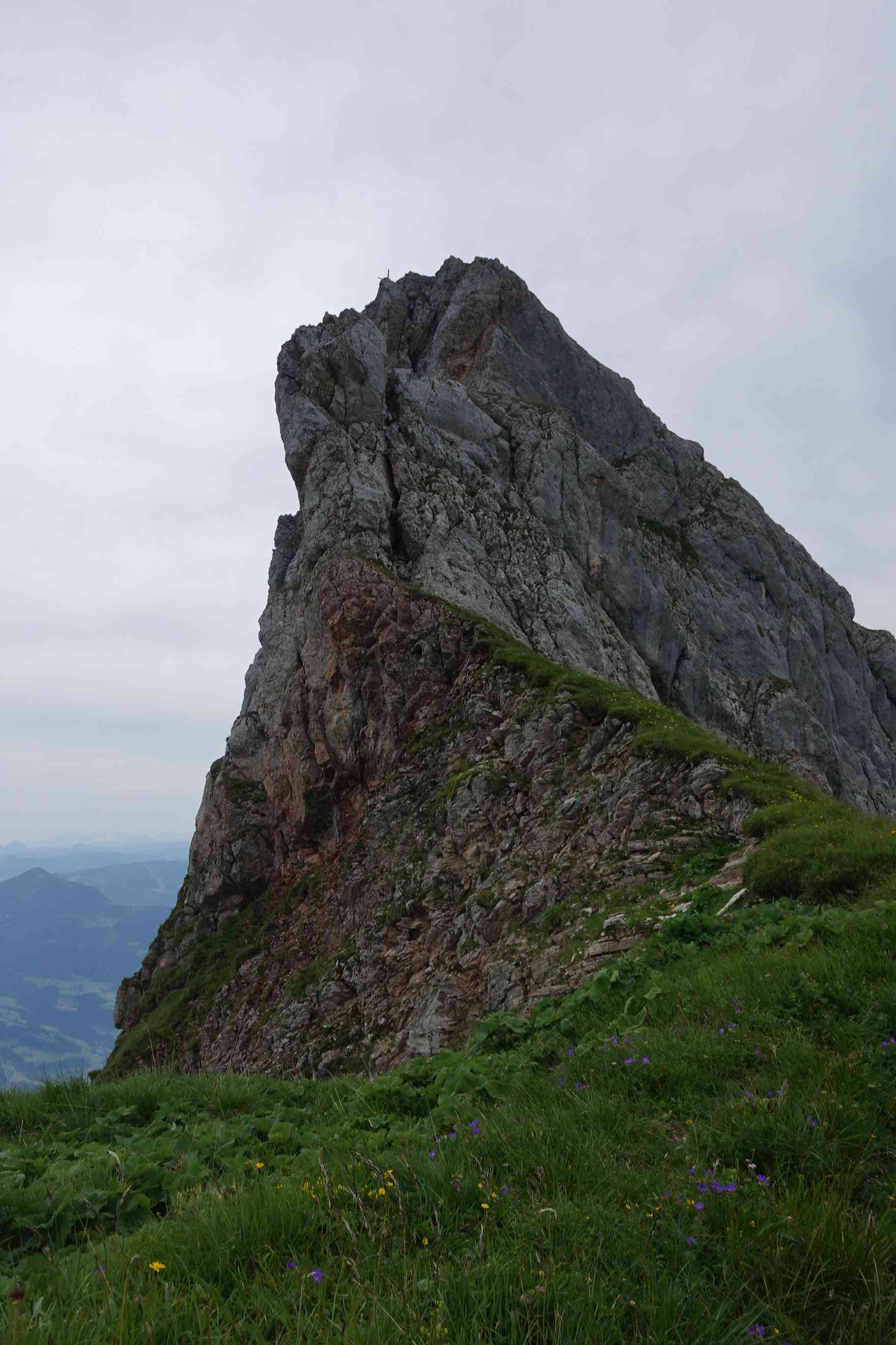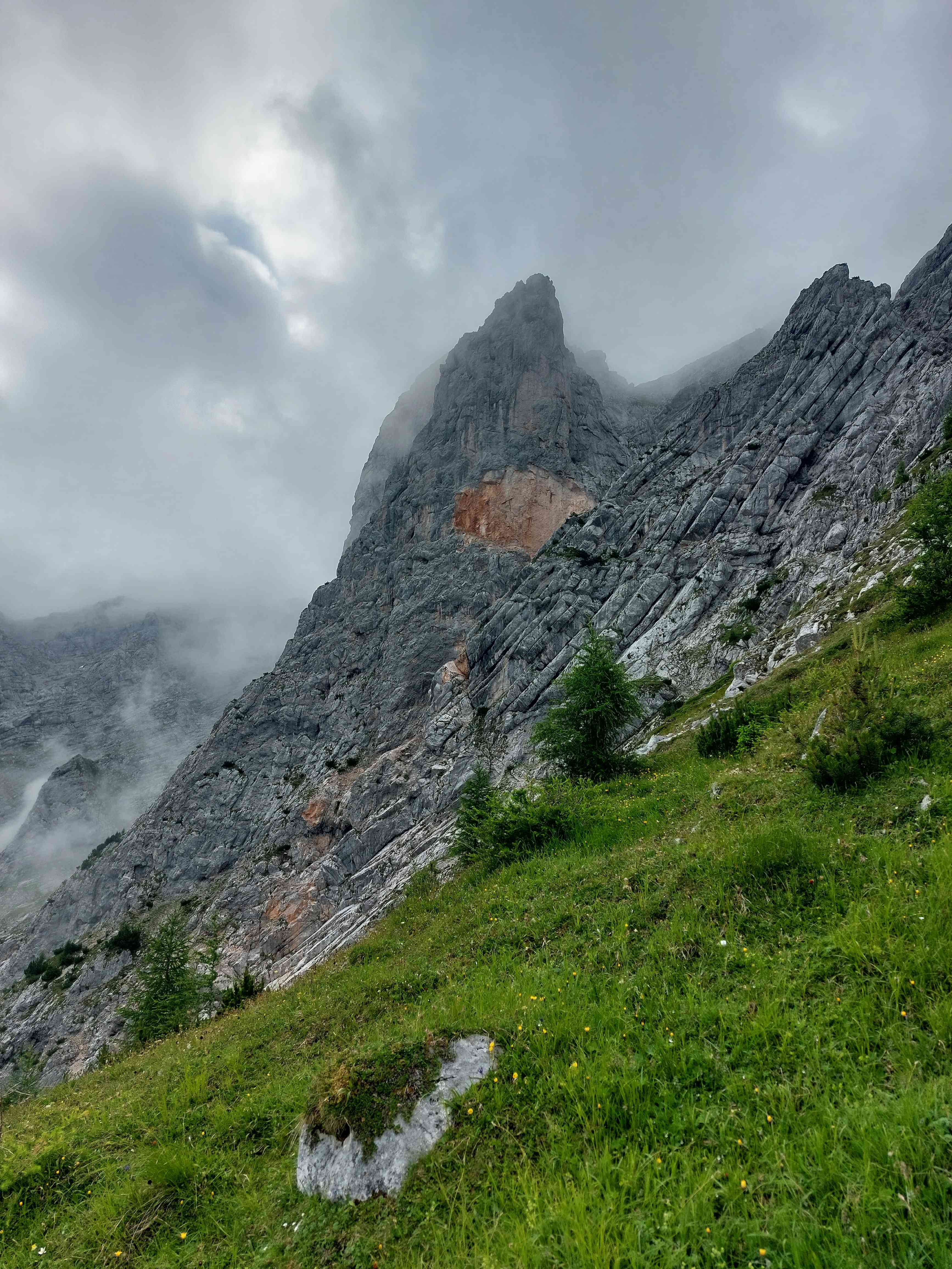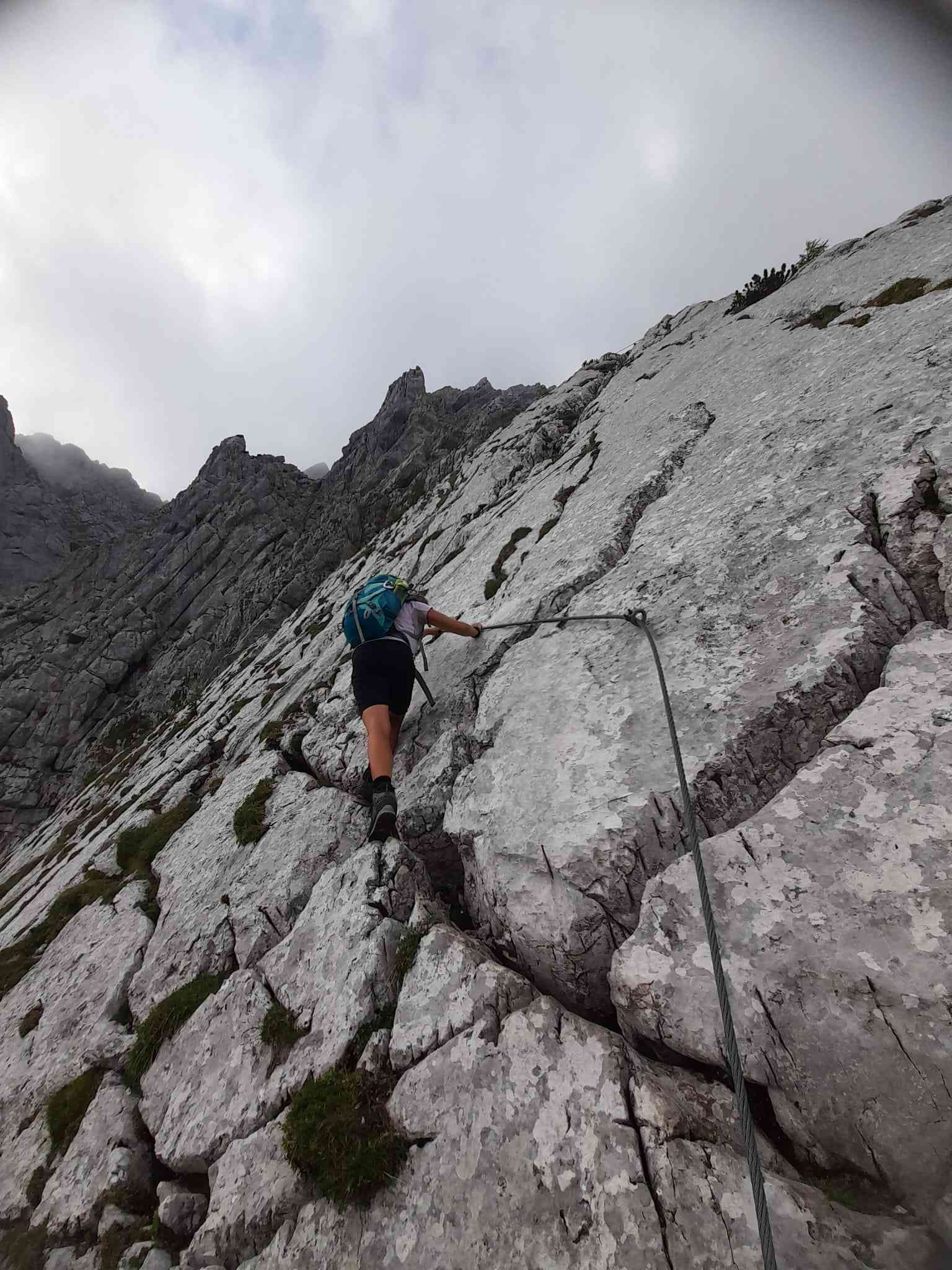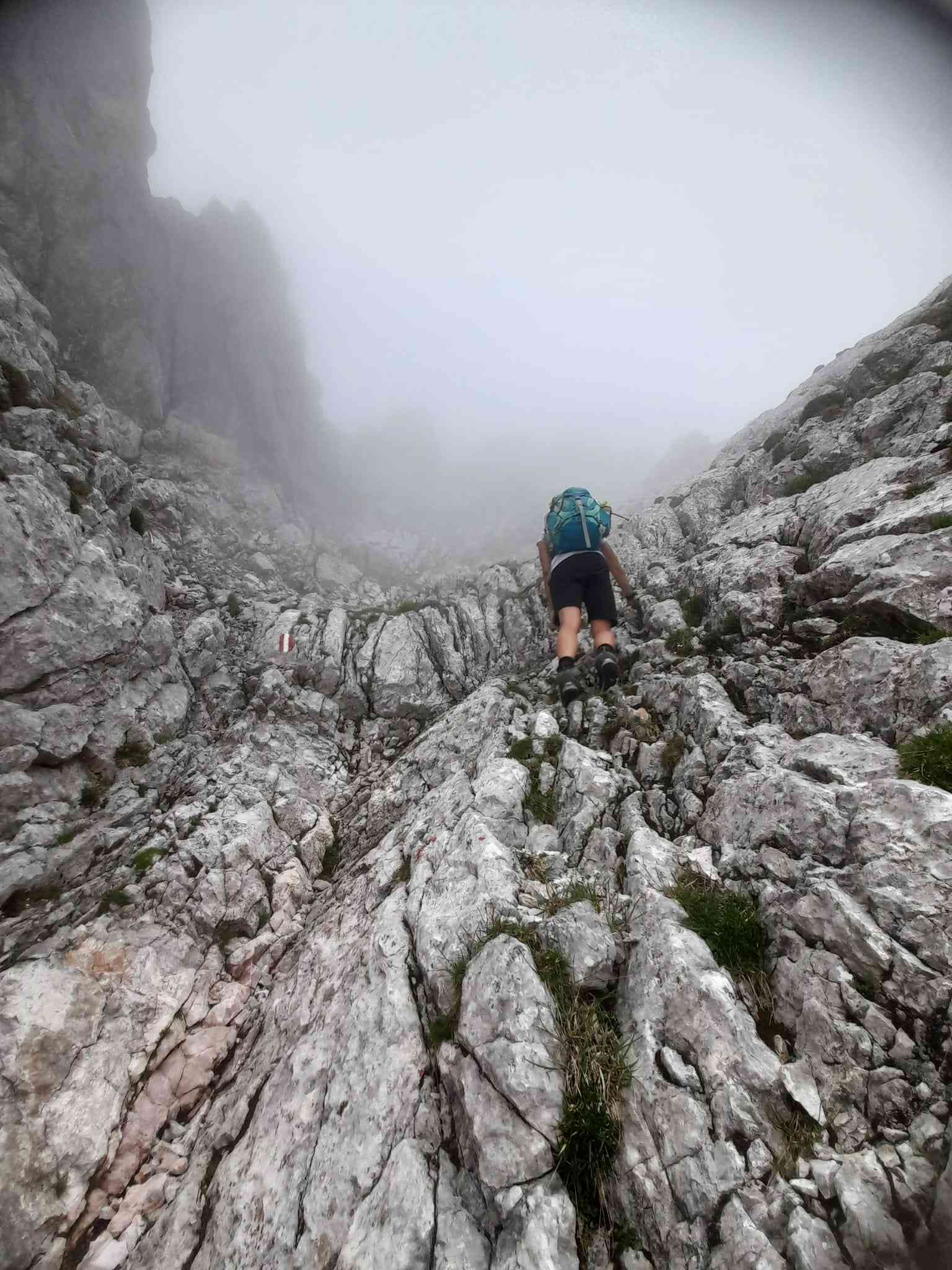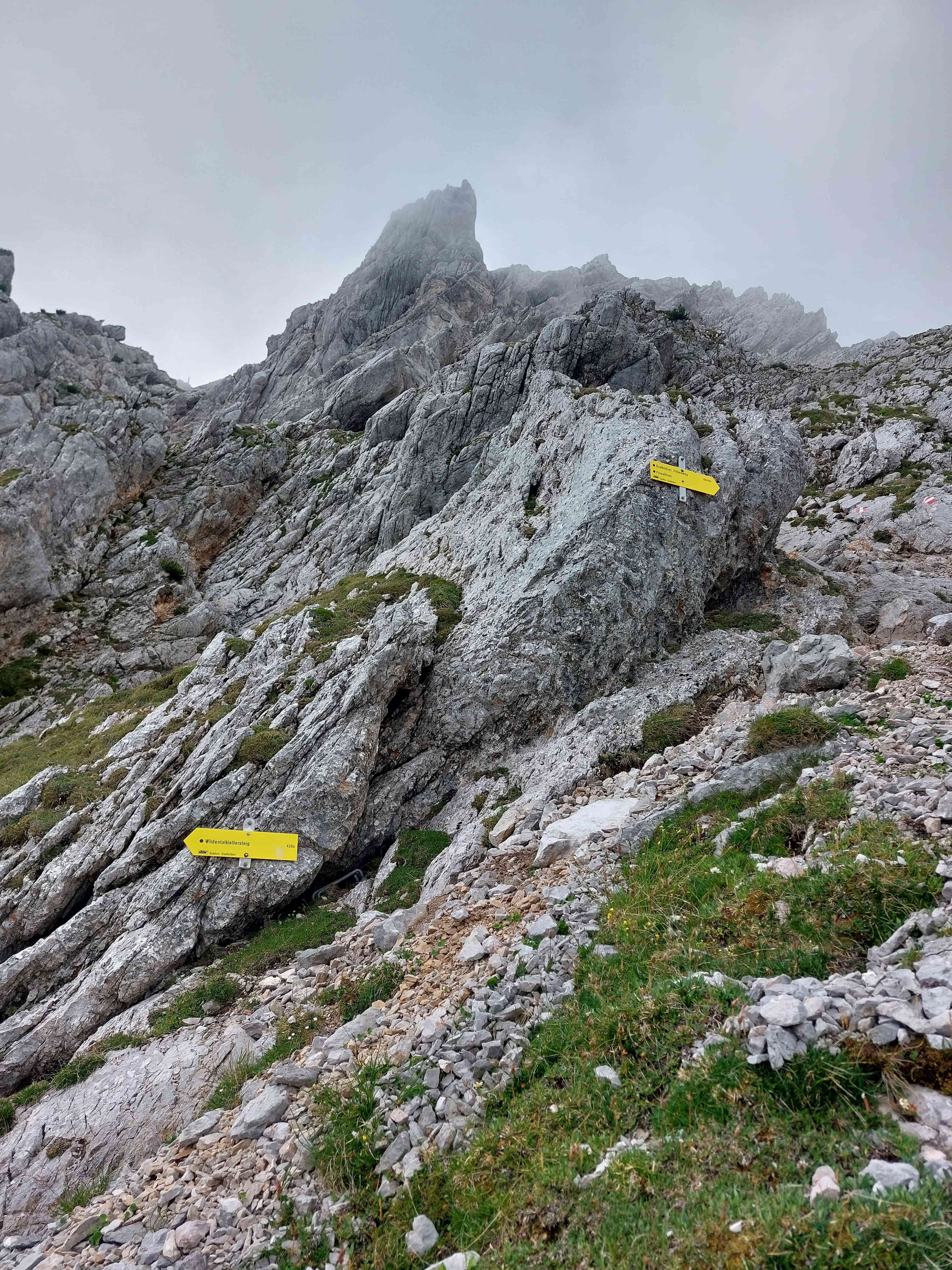 Um 7.30 Uhr gab es Frühstück. Trotz dem vielen Platz und der „Ruhe“ hatte ich gefühlt wenig geschlafen. Wir hatten zwar eine Überquerung von ein paar Gipfeln im Blick, aber da wir ja am Ende noch heimfahren mußten, war eigentlich klar, daß es die große Runde nicht werden konnte. Wir entschieden uns, Sachen auf der Hütte zu lassen und mit leichtem Gepäck zum Persailhorn aufzusteigen, um dort weiter zu entscheiden. Auch wenn wir die eine mögliche Überschreitung machen sollten, würden wir nochmal dort vorbeikommen. Der Weg war kraß. Erst ging’s ca. eine halbe Stunde steil bergauf Bergweg. Dann teilte sich das Ganze auf. Links ein B/C Klettersteig, rechts ein B/C Klettersteig, der aber etwas leichter sein sollte, und geradeaus der Saalfeldener Höhenweg, von dem ich nicht viel Informationen habe finden können. Der rechte Weg zweigte als erster ab und den ließen wir rechts liegen. Zum Einstieg in den schwereren Klettersteig ging es auch schon seilversichert los mit allerdings relativ leichten Passagen, so daß wir uns auch nicht anhängten oder Ausrüstung anlegten. Konzentration war dennoch erforderlich. Dann die Entscheidung. Links sahen wir den Klettersteig, in dem wir auch ein paar Leute sehen konnten, geradeaus leichte Kletterei nach oben, die aber nicht weit einsehbar war. Wir entschieden uns für geradeaus, da wir glaub‘ beide keine Lust auf Klettersteig hatten. Sorgsam drauf achtend, keine Steine loszutreten, stiegen wir los. Es war einfach toll. Kletterei pur über 200hm hinauf im 1er Grad, vielleicht eine 2er Stelle, die wir aber beim Abstieg garnicht mehr so empfinden sollten. Oben dann nochmal Klettersteig, aber auch das ohne Gurt machbar für uns. Als wir auf dem Gipfel auf 2347m waren, hatten wir leider keine Sicht, die mich schon gereizt hätte. Aber gut. Hier tummelte sich einiges an Leuten, die in verschiedene Richtungen wieder verschwanden.
