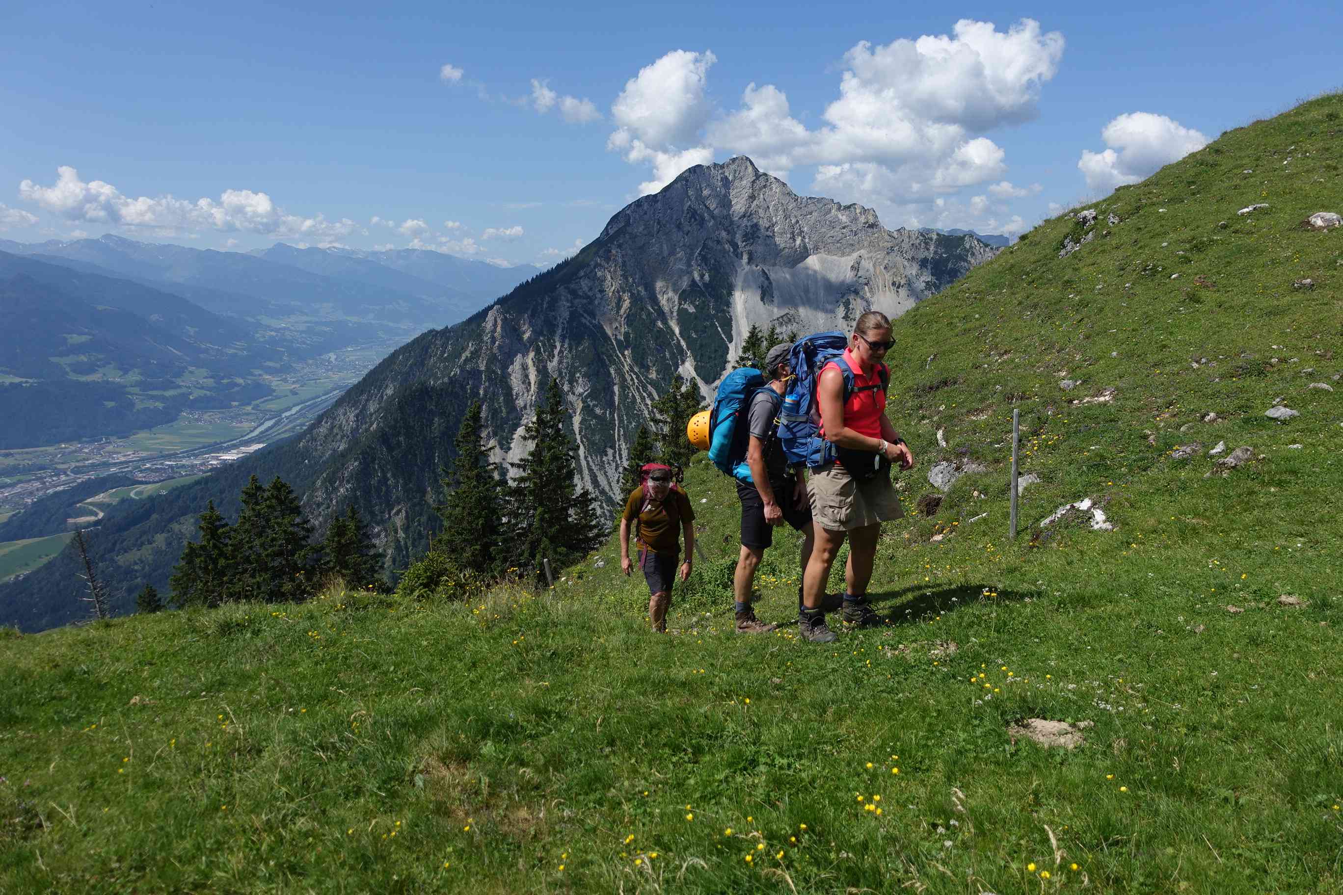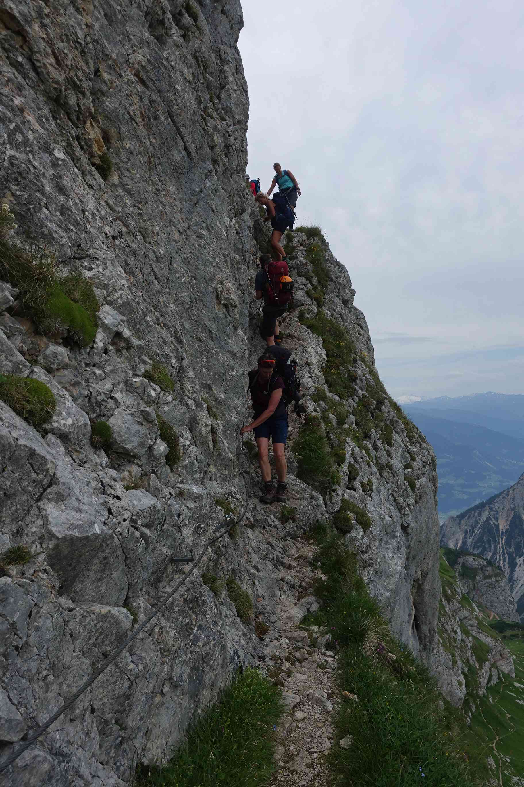 Hier ist auch noch ein kurzes Stück Steig eingebaut, bevor es erst steil, später flacher in Richtung Erfurter geht. Hätten wir nun noch die Möglichkeit gehabt, auf den Gschöllkopf zu gehen, der hinter der Erfurter Hütte liegt, so beschlossen wir einstimmig, daß es für heute genug sein sollte. Vier von uns gönnten sich noch einen Flug mit dem Air Rofan, und dann saßen wir alle auf der Terrasse zusammen in der heißen Sonne mit Blick auf den Achensee. Auch das Abendessen konnten wir gut draußen genießen, bevor es langsam kühl wurde und wir rein gingen. Der Abend wurde nun etwas länger, schließlich gab es einen gelungenen Gipfeltag zu feiern und Roland, das Geburtstagskind unter uns.