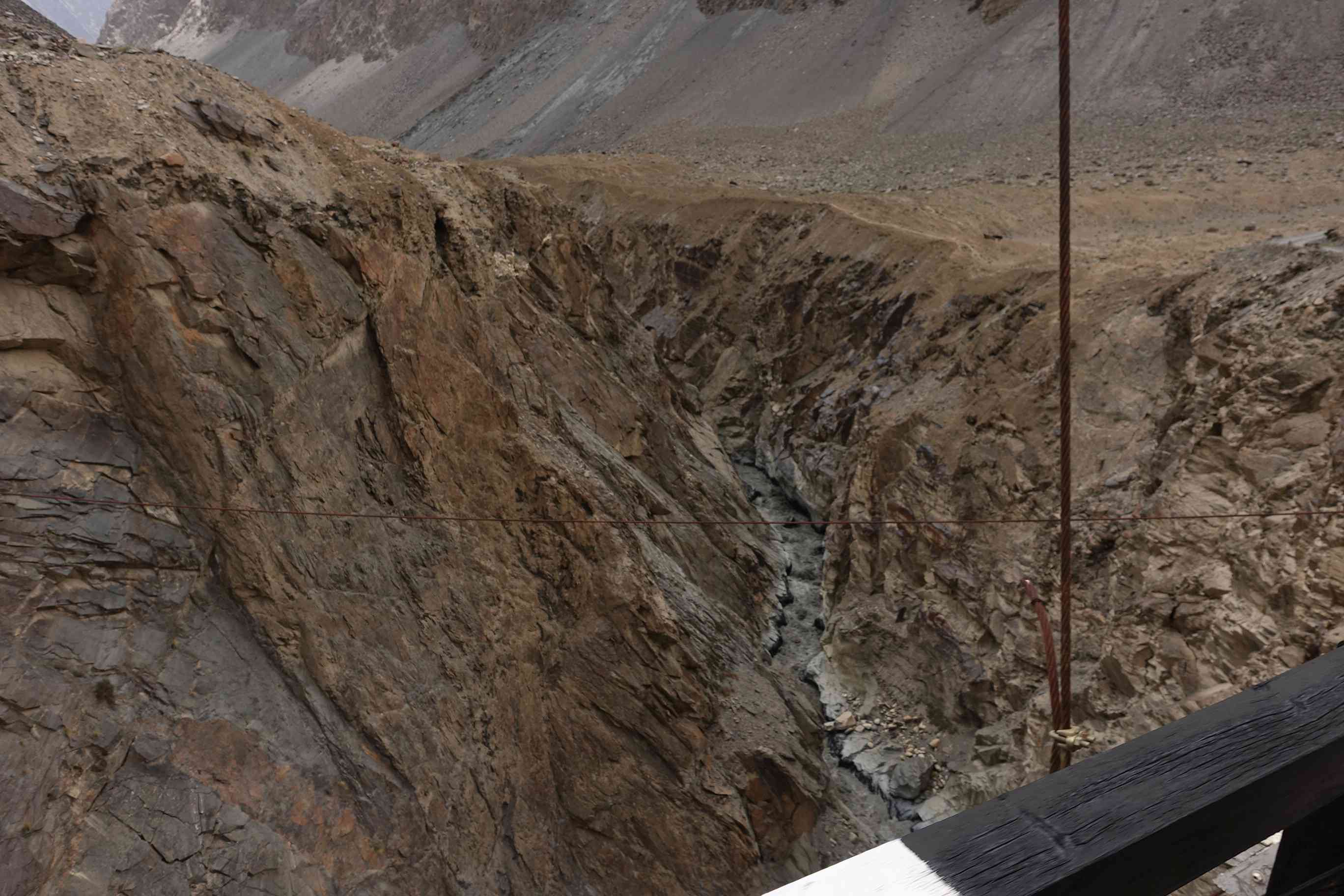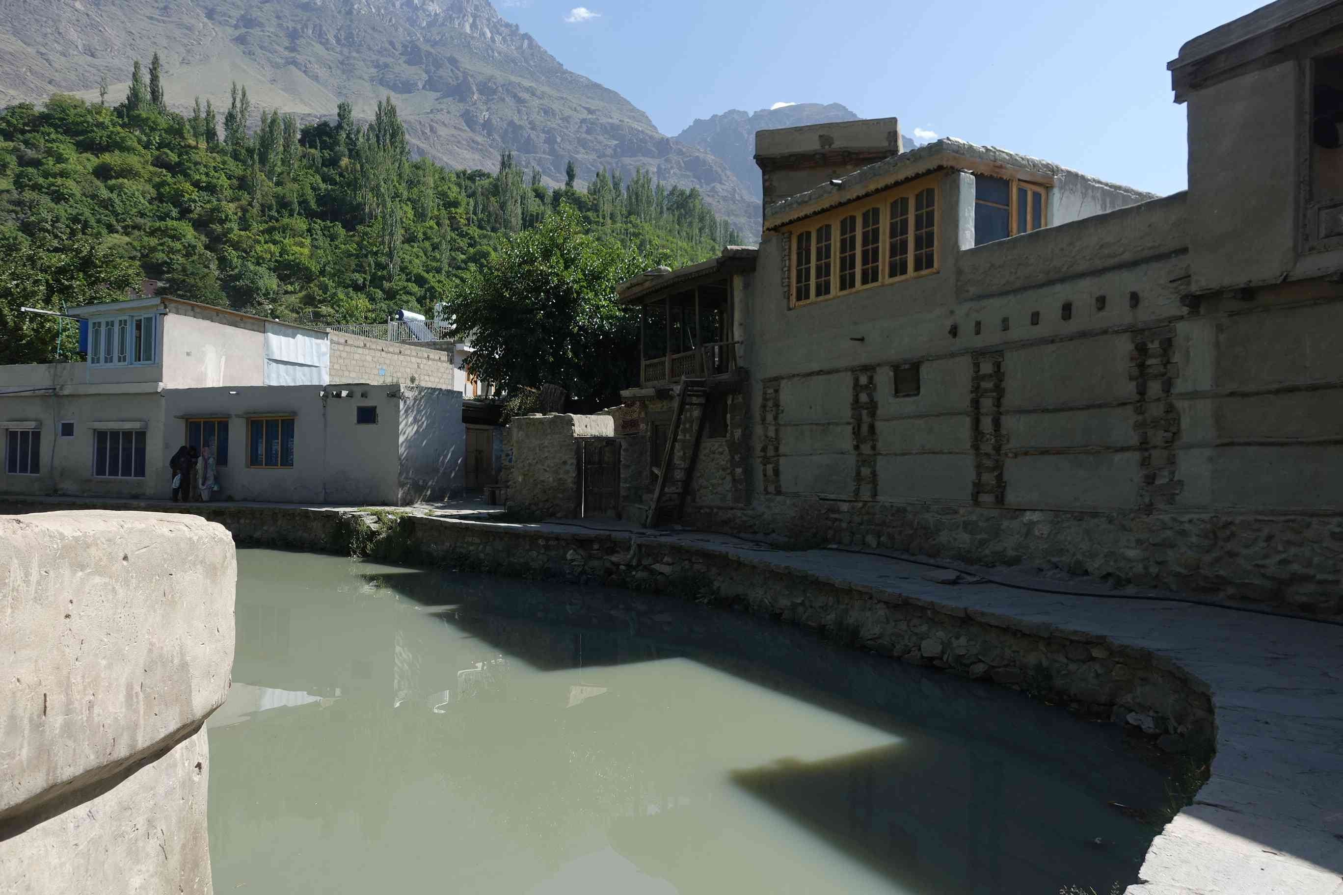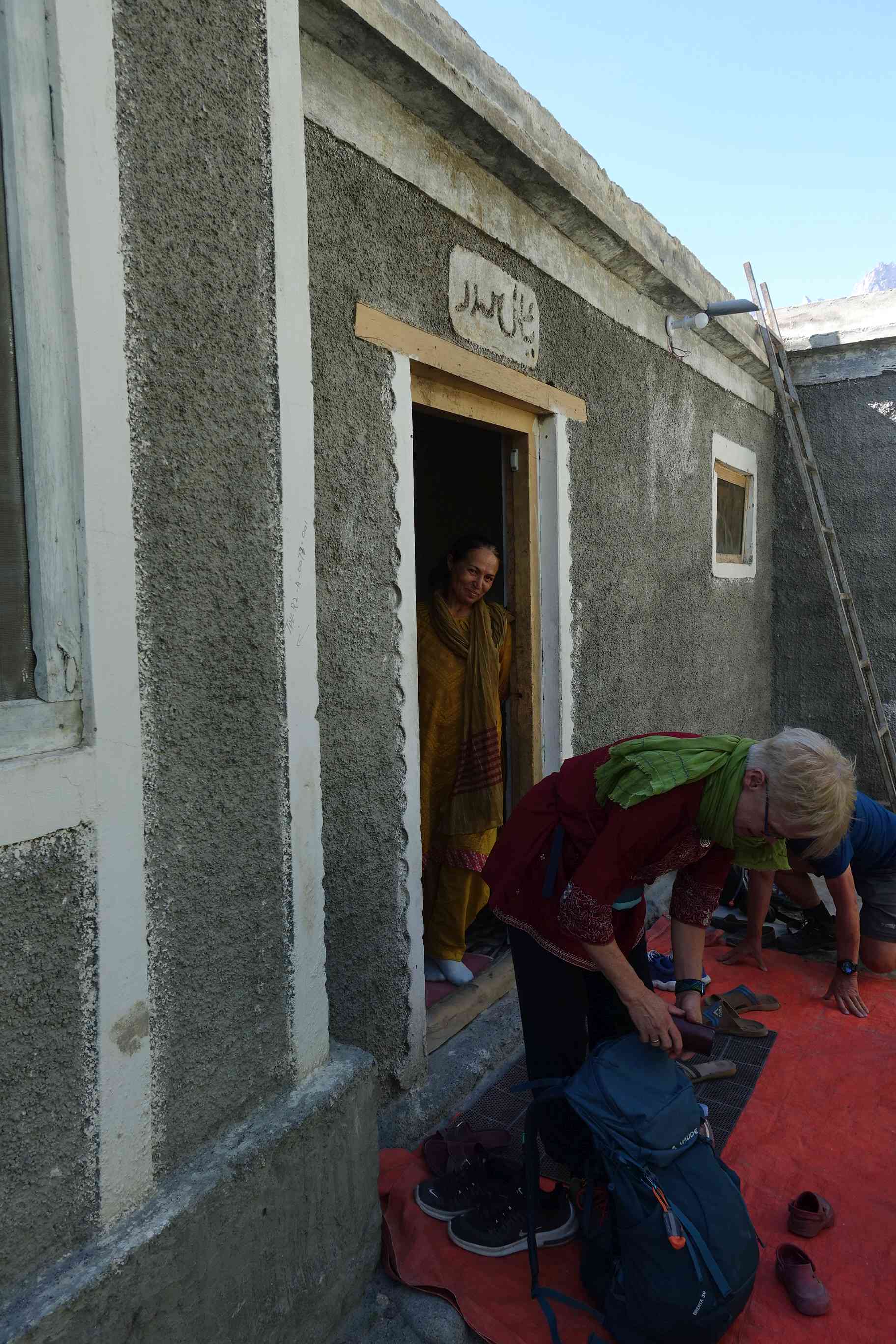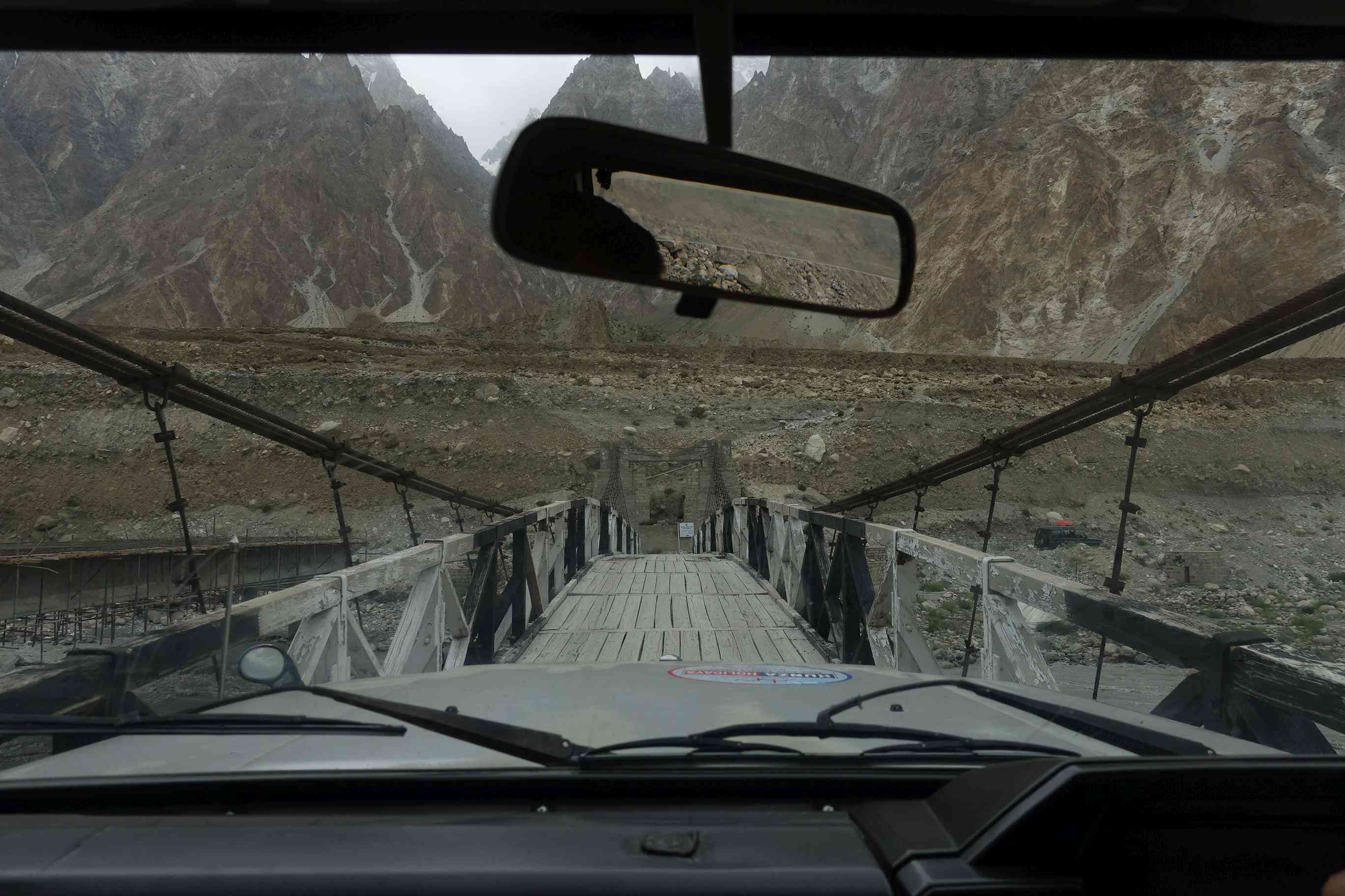 Früh war es windig und sehr bewölkt, dennoch war die Wäsche gut getrocknet. Ich hatte Bauchweh, aber nicht vom Durchfall sondern eher vom Gegenteil. Die Nahrungsumstellung machte mir zu schaffen. Kannte mein Körper sonst nur Körnerbrot, Gemüse und Salat, so war es hier doch alles anders. Wir ließen Sachen in Passu, die wir beim Trekking nicht brauchen sollten und los ging’s mit den Jeeps nach Shimshal – knapp 4h wilde Fahrt auf Schotterpisten und nahe am Abgrund des Shimshal-Rivers. Viele Hängebrücken, Schluchten, Gletscherbrüche am Wegesrand. Im Shimshal jetzt ohne WLAN – Ruhe – Handyruhe für alle. Hier trafen wir auf das Küchenteam und einen Teil der Eseltreiber. War zunächst noch die Rede von 40 Trägern gewesen, die uns begleiten sollten, so stellte sich nun heraus, daß 15 Esel unser Gepäck transportieren würden. Wir bekamen Tee, gingen in unsere Zimmer und liefen dann auf eigene Faust los, das Dorf zu erkunden. Viele Kinder guckten, die Älteren grüßten freundlich und man kam ins ein oder andere Gespräch. Mit Englisch kam man an manchen Stellen relativ weit. Ein Zimmermann sägte Bretter zurecht und präsentierte uns seine bescheidene Werkstatt in einer Garage.
