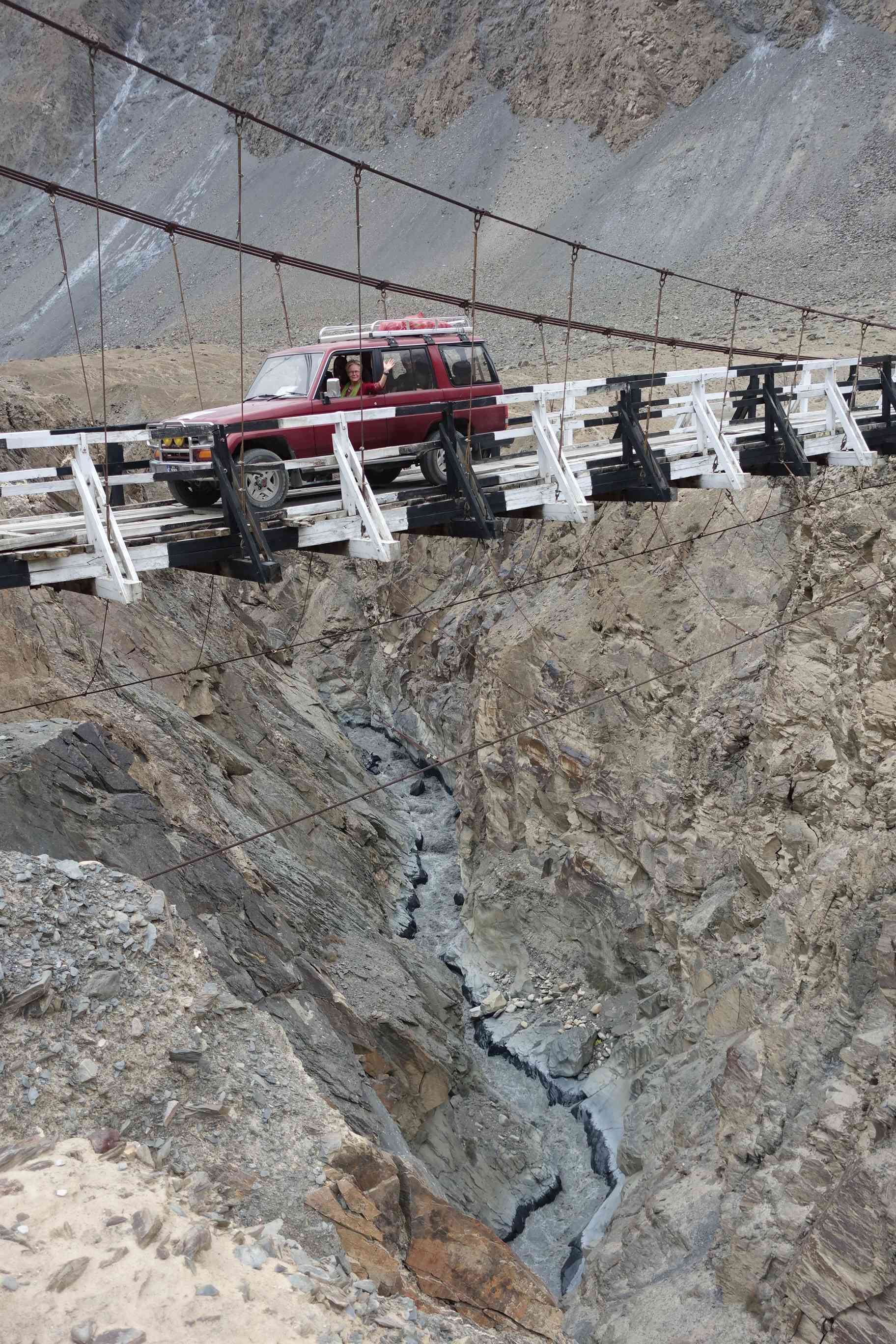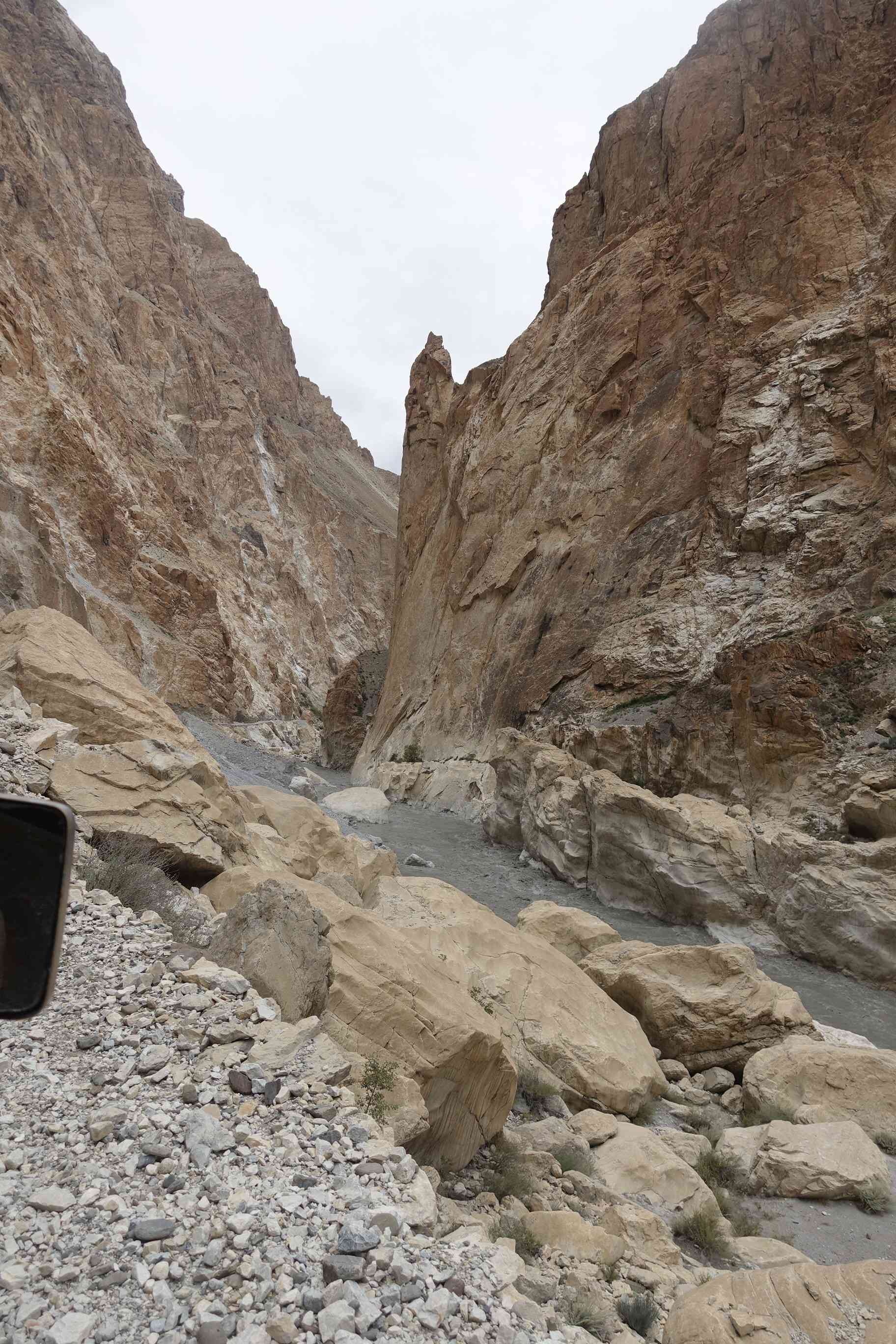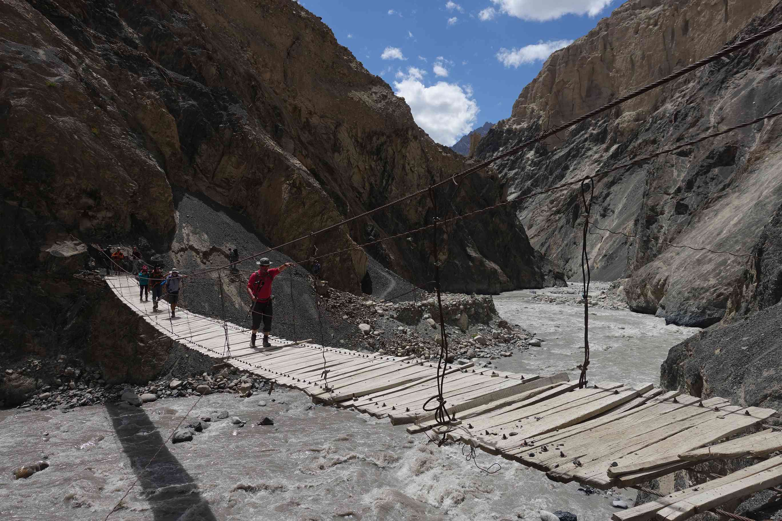 Früh war es windig und sehr bewölkt, dennoch war die Wäsche gut getrocknet. Ich hatte Bauchweh, aber nicht vom Durchfall sondern eher vom Gegenteil. Die Nahrungsumstellung machte mir zu schaffen. Kannte mein Körper sonst nur Körnerbrot, Gemüse und Salat, so war es hier doch alles anders. Wir ließen Sachen in Passu, die wir beim Trekking nicht brauchen sollten und los ging’s mit den Jeeps nach Shimshal – knapp 4h wilde Fahrt auf Schotterpisten und nahe am Abgrund des Shimshal-Rivers. Viele Hängebrücken, Schluchten, Gletscherbrüche am Wegesrand. Im Shimshal jetzt ohne WLAN – Ruhe – Handyruhe für alle. Hier trafen wir auf das Küchenteam und einen Teil der Eseltreiber. War zunächst noch die Rede von 40 Trägern gewesen, die uns begleiten sollten, so stellte sich nun heraus, daß 15 Esel unser Gepäck transportieren würden. Wir bekamen Tee, gingen in unsere Zimmer und liefen dann auf eigene Faust los, das Dorf zu erkunden. Viele Kinder guckten, die Älteren grüßten freundlich und man kam ins ein oder andere Gespräch. Mit Englisch kam man an manchen Stellen relativ weit. Ein Zimmermann sägte Bretter zurecht und präsentierte uns seine bescheidene Werkstatt in einer Garage.