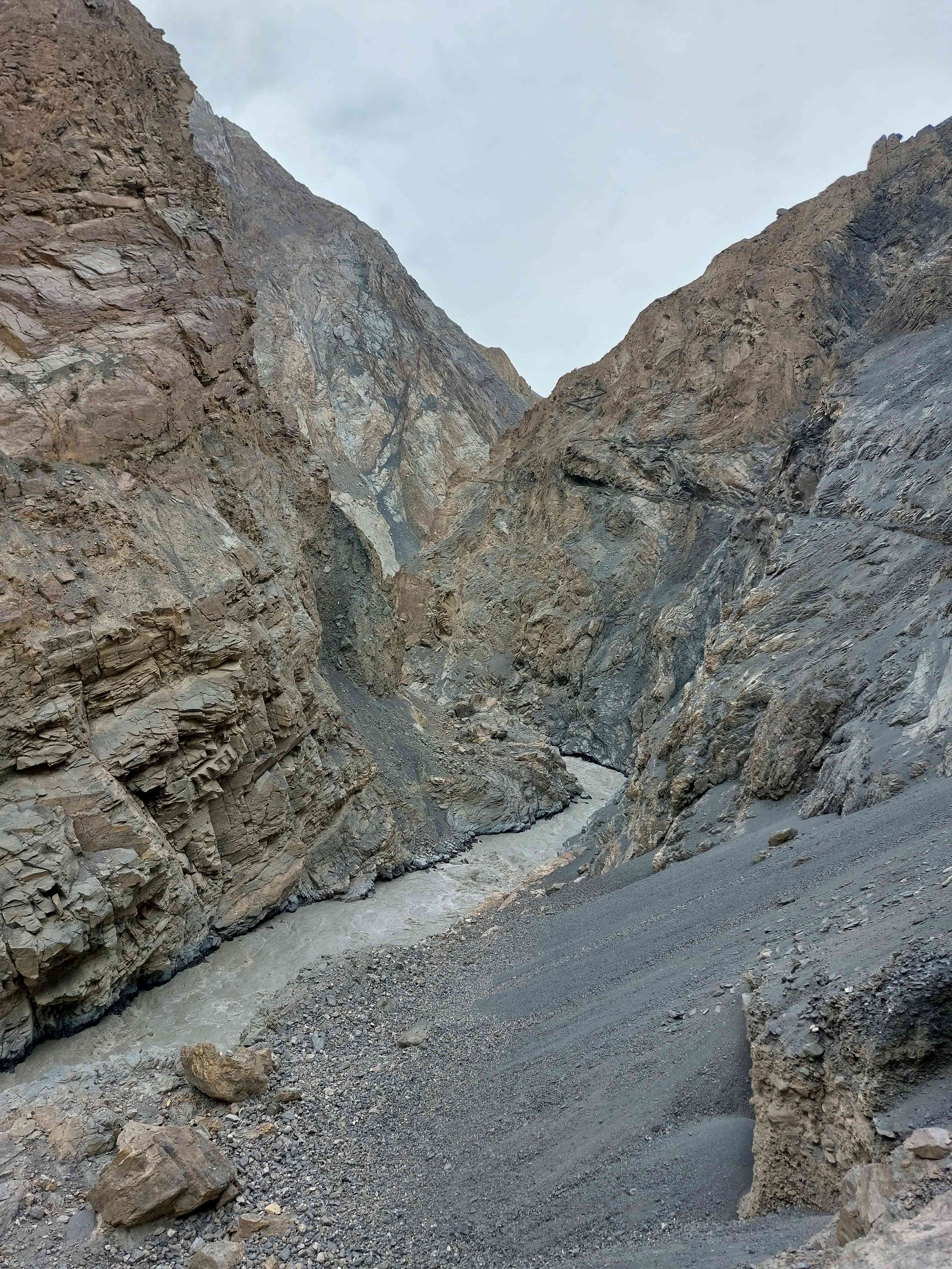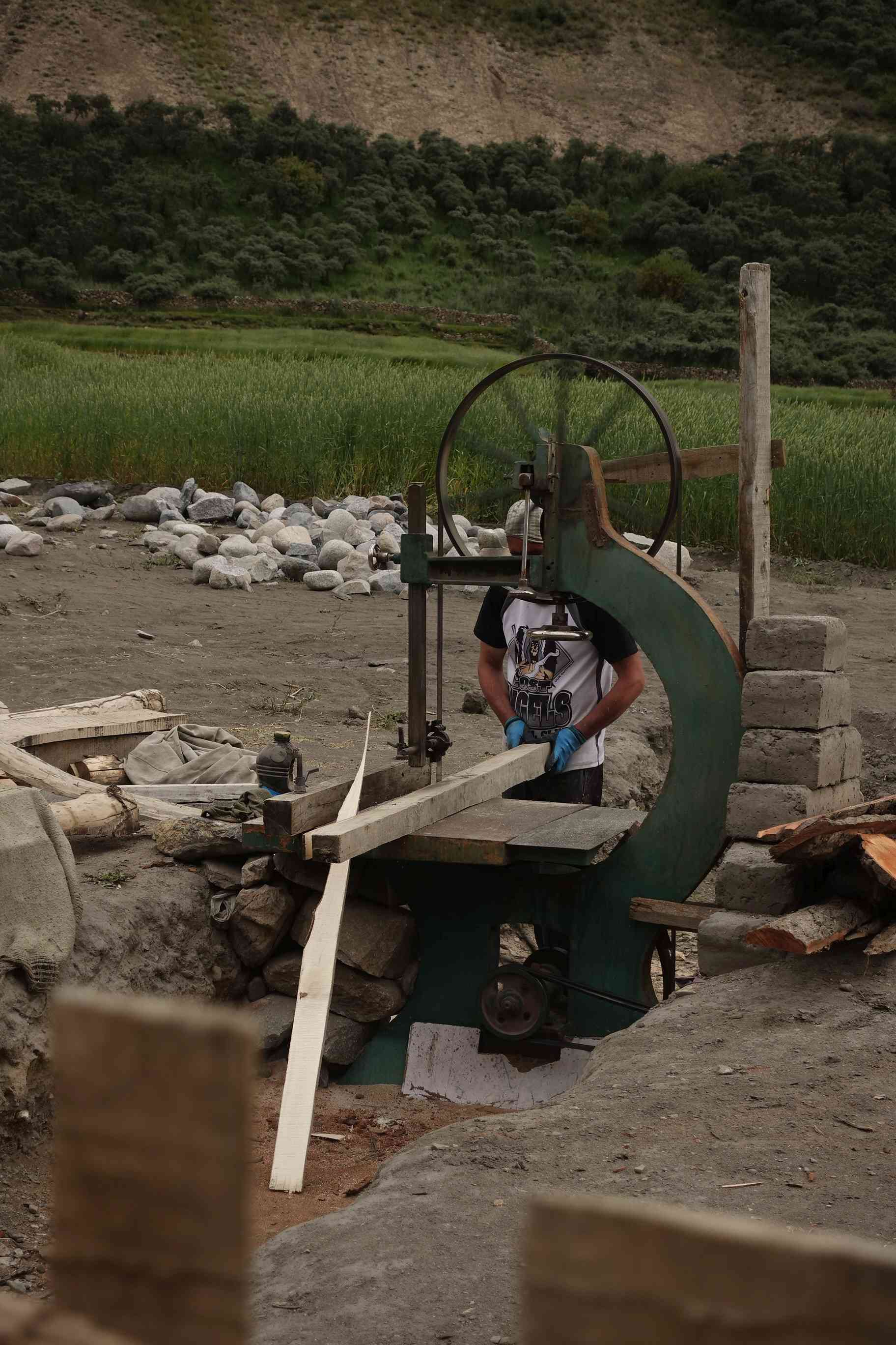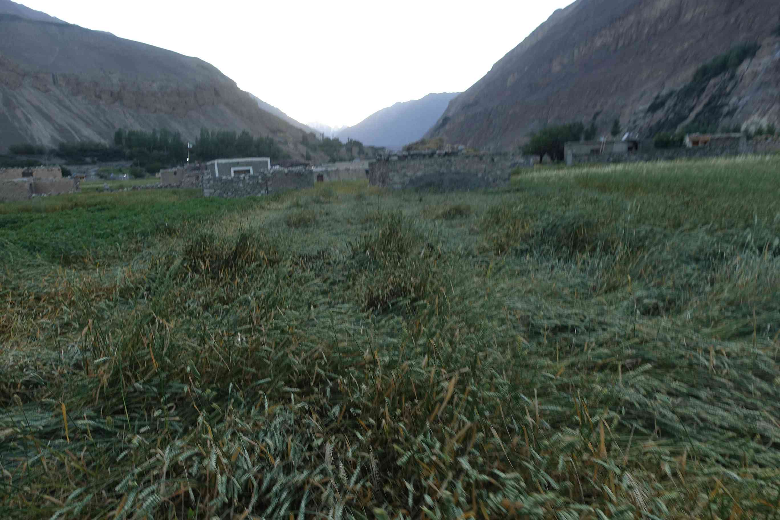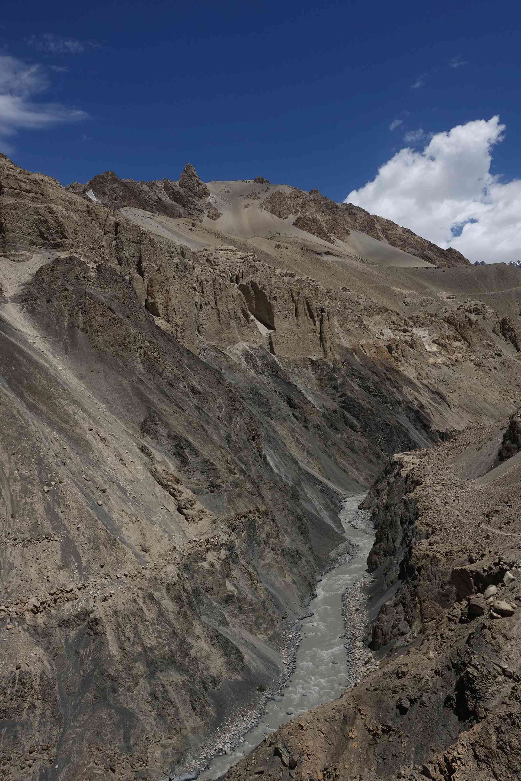 Früh war es windig und sehr bewölkt, dennoch war die Wäsche gut getrocknet. Ich hatte Bauchweh, aber nicht vom Durchfall sondern eher vom Gegenteil. Die Nahrungsumstellung machte mir zu schaffen. Kannte mein Körper sonst nur Körnerbrot, Gemüse und Salat, so war es hier doch alles anders. Wir ließen Sachen in Passu, die wir beim Trekking nicht brauchen sollten und los ging’s mit den Jeeps nach Shimshal – knapp 4h wilde Fahrt auf Schotterpisten und nahe am Abgrund des Shimshal-Rivers. Viele Hängebrücken, Schluchten, Gletscherbrüche am Wegesrand. Im Shimshal jetzt ohne WLAN – Ruhe – Handyruhe für alle. Hier trafen wir auf das Küchenteam und einen Teil der Eseltreiber. War zunächst noch die Rede von 40 Trägern gewesen, die uns begleiten sollten, so stellte sich nun heraus, daß 15 Esel unser Gepäck transportieren würden. Wir bekamen Tee, gingen in unsere Zimmer und liefen dann auf eigene Faust los, das Dorf zu erkunden. Viele Kinder guckten, die Älteren grüßten freundlich und man kam ins ein oder andere Gespräch. Mit Englisch kam man an manchen Stellen relativ weit. Ein Zimmermann sägte Bretter zurecht und präsentierte uns seine bescheidene Werkstatt in einer Garage.
