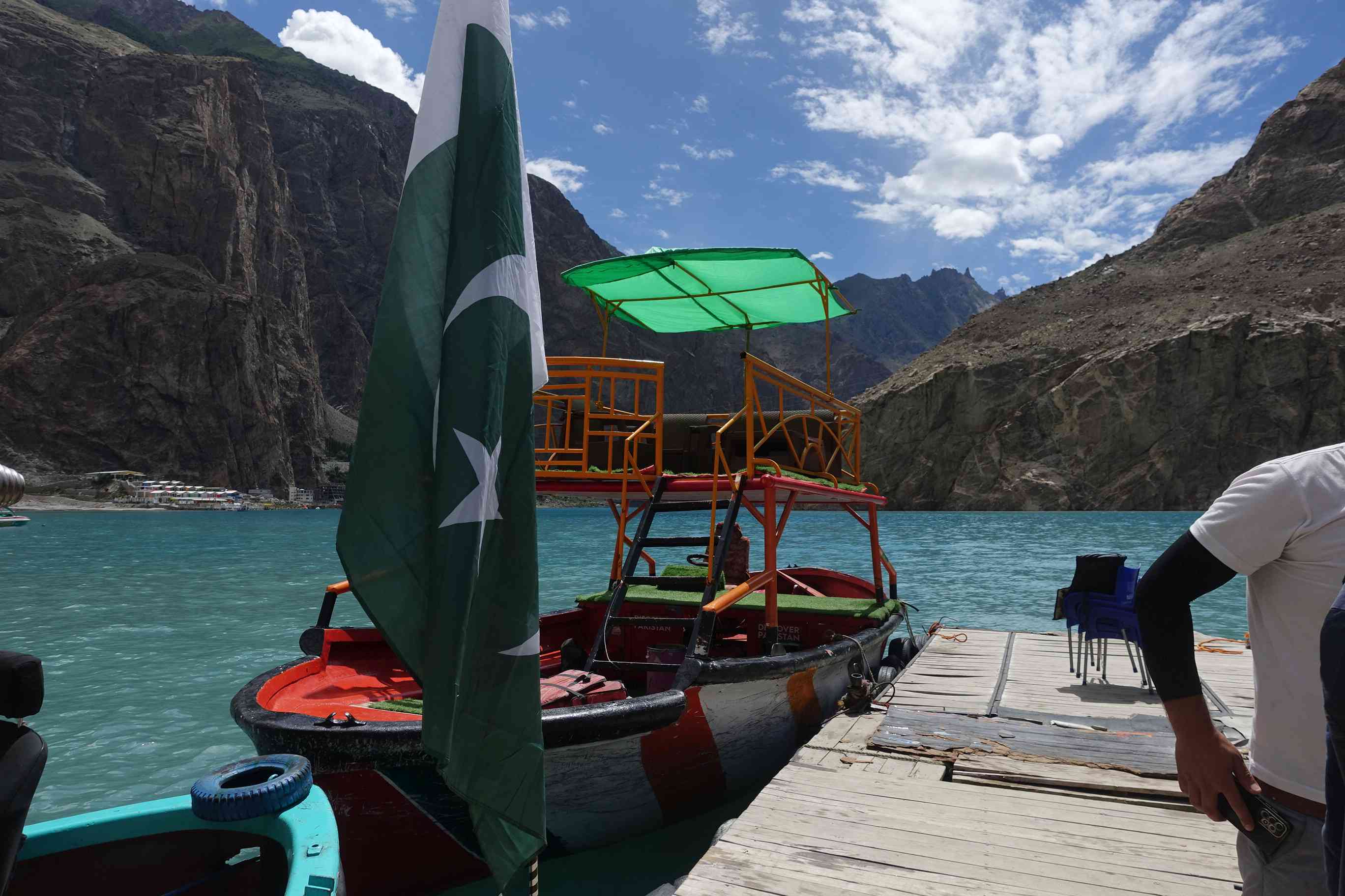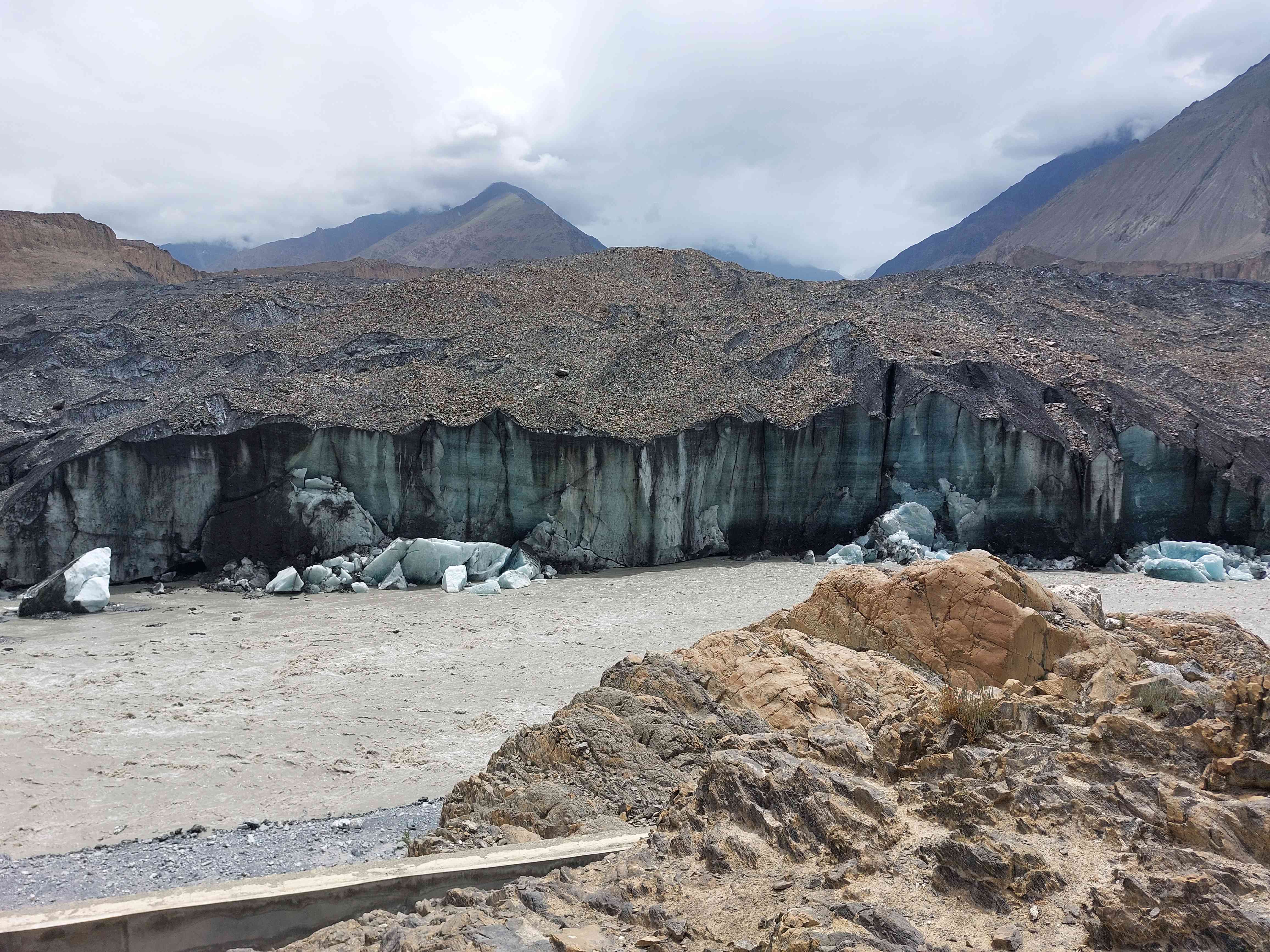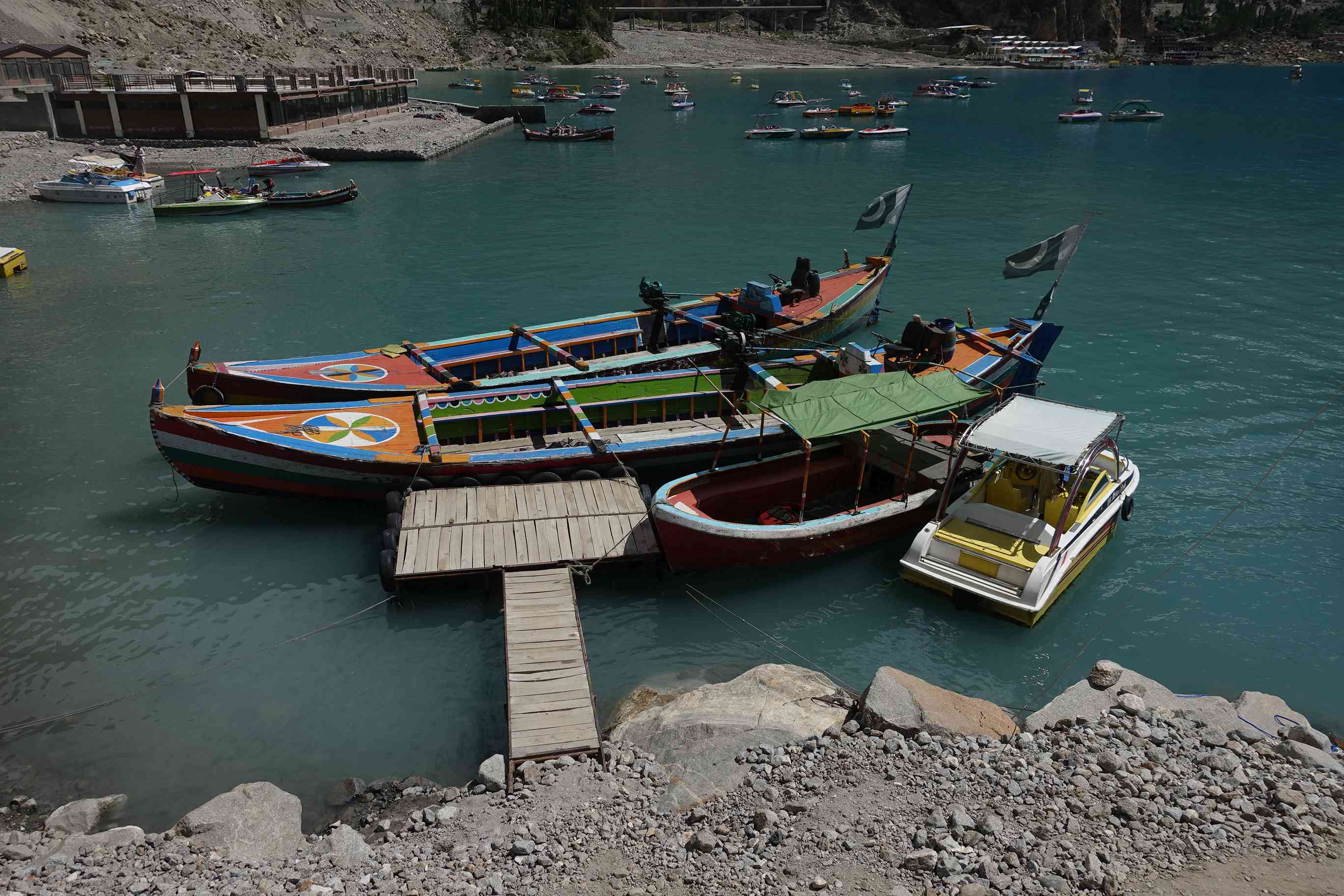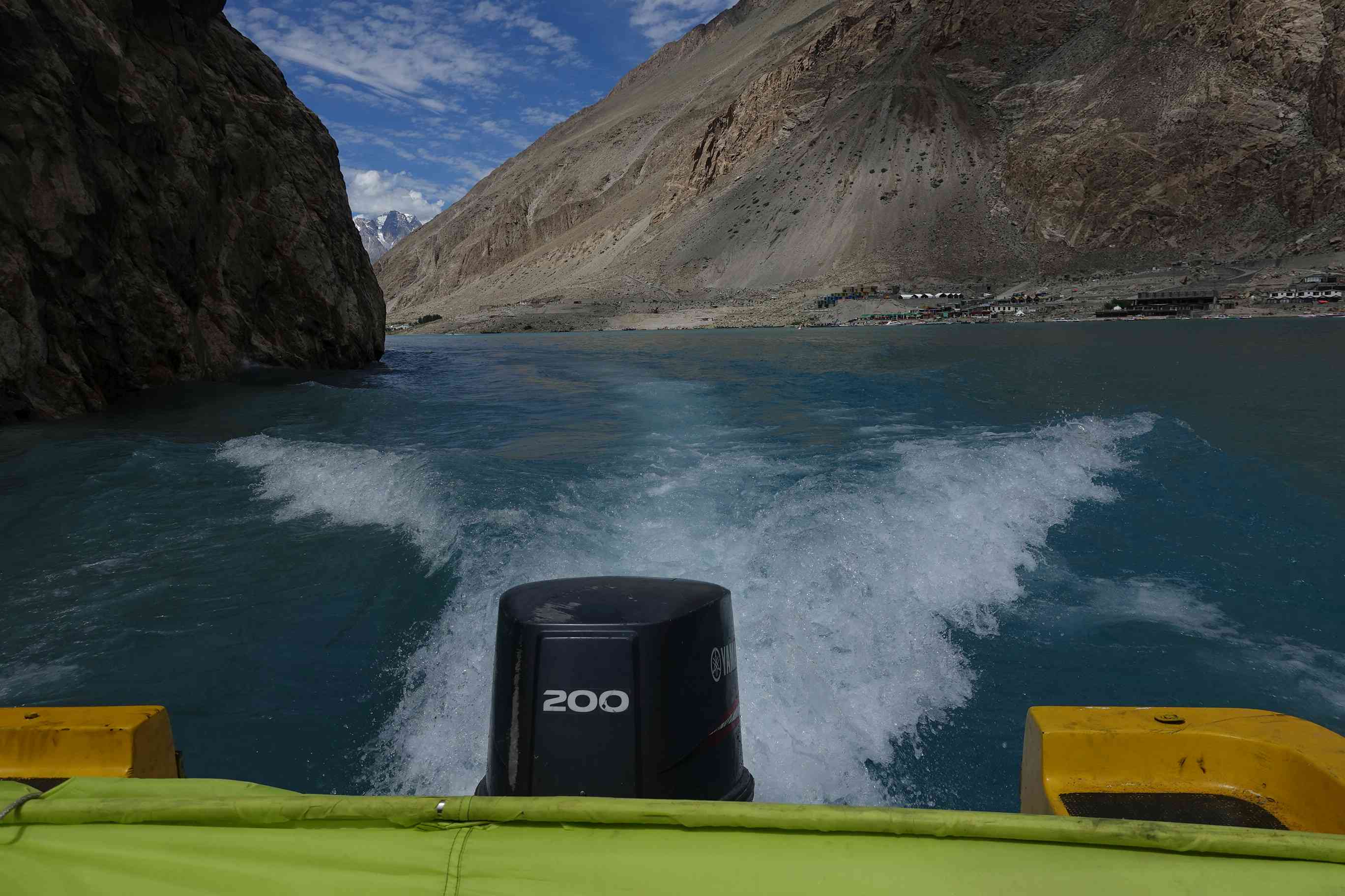 Wir stiegen in unseren Bus, der uns nach Passu bringen sollte über den Karakorum Highway, der die Verbindungslinie nach China darstellt. Alles Begriffe, die ich 1000mal gehört hatte und jetzt war ich plötzlich da. Vorbei am Viewpoint auf knapp 2000m direkt unter dem Rakaposhi einem knapp 8000er und zum Stopp am Attabad See, einem Stausee des Hunza Rivers, den ein Felssturz 2010 verursacht hat. So viele Dokus gesehen und jetzt Realität direkt vor Augen. Wir machten Pause und eine kleine Bootstour auf dem blau-blauen Wasser und aßen dort eine Kleinigkeit, bevor es bis Passu durch ging, wo wir in einem Guest House die Nacht verbringen sollten. Hier in Passu trafen wir erstmals auf unseren Bergführer Nasia. Mit ihm ging’s dann auch gleich auf zu einem kleinen Spaziergang entlang des Passu Gletschers, der in der Abendsonne glitzerte. War Volker schon bei dieser Tour in der Unterkunft geblieben, so ging es jetzt plötzlich Johanna auch noch schlecht vom Magen her.