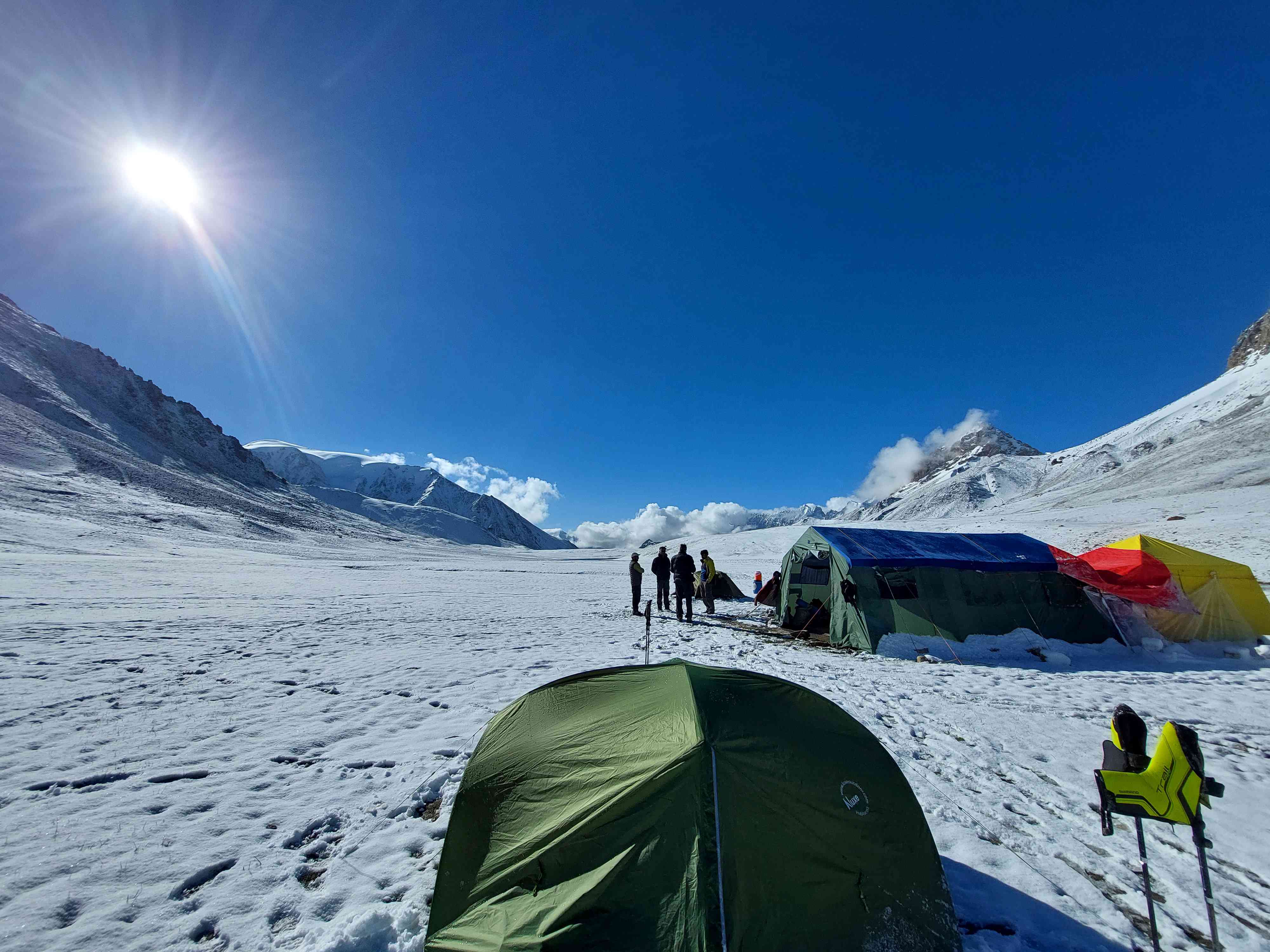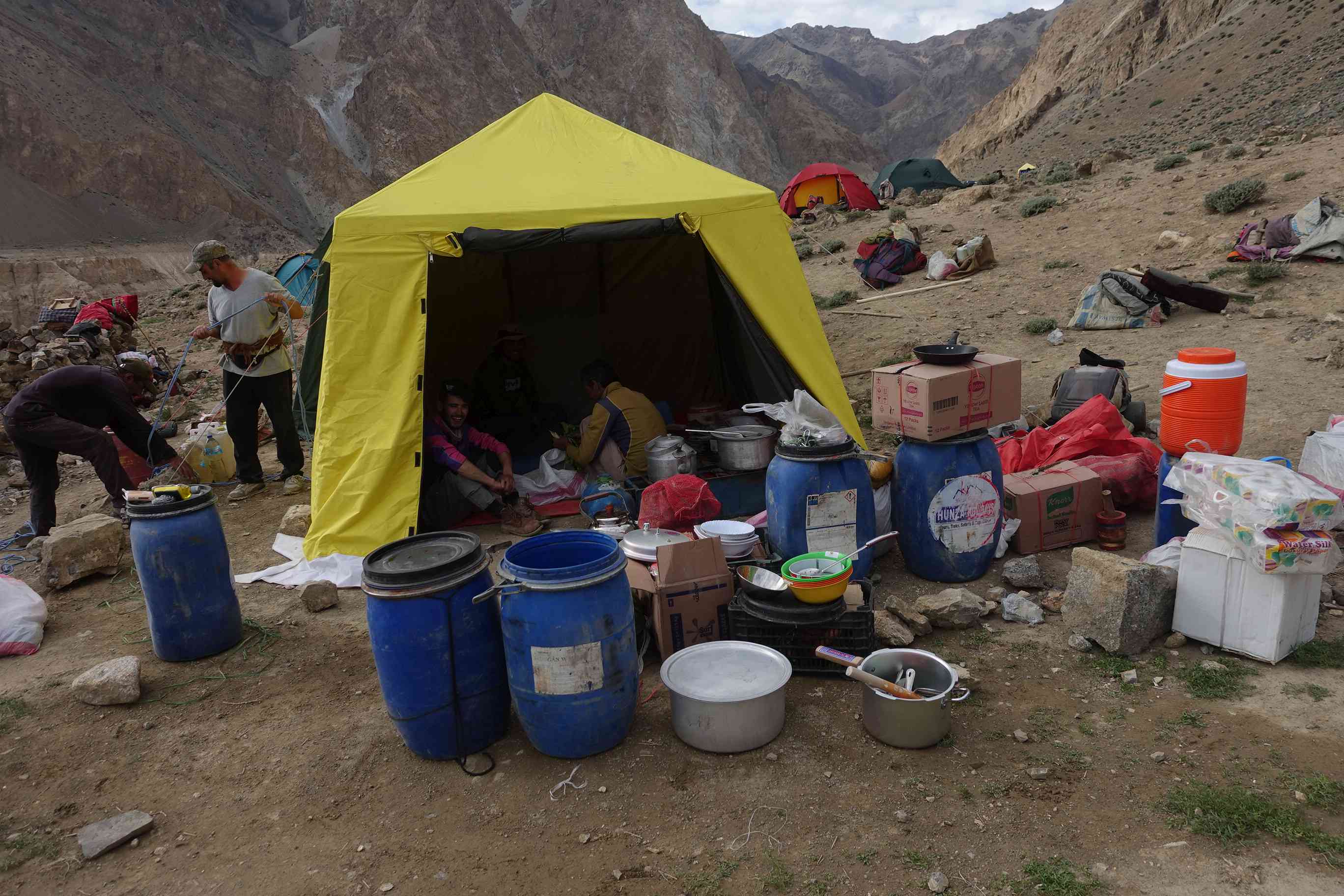 Währenddessen besprachen die anderen, wie sie mit Christoph weitermachen sollten und fragten sogar einen Hubschrauber an, um ihn eventuell am nächsten Tag runterfliegen zu können. Die Aufregung war hierdurch schon groß. Zum ersten Mal während unserer Tour waren wir in diesem Camp nicht alleine. Drei britische Bergsteiger mit Team waren auch hier zum Übernachten. Sie hatten wohl vor, in der nächsten Zeit ein paar noch unbegangene 7000er in der Region zu besteigen.