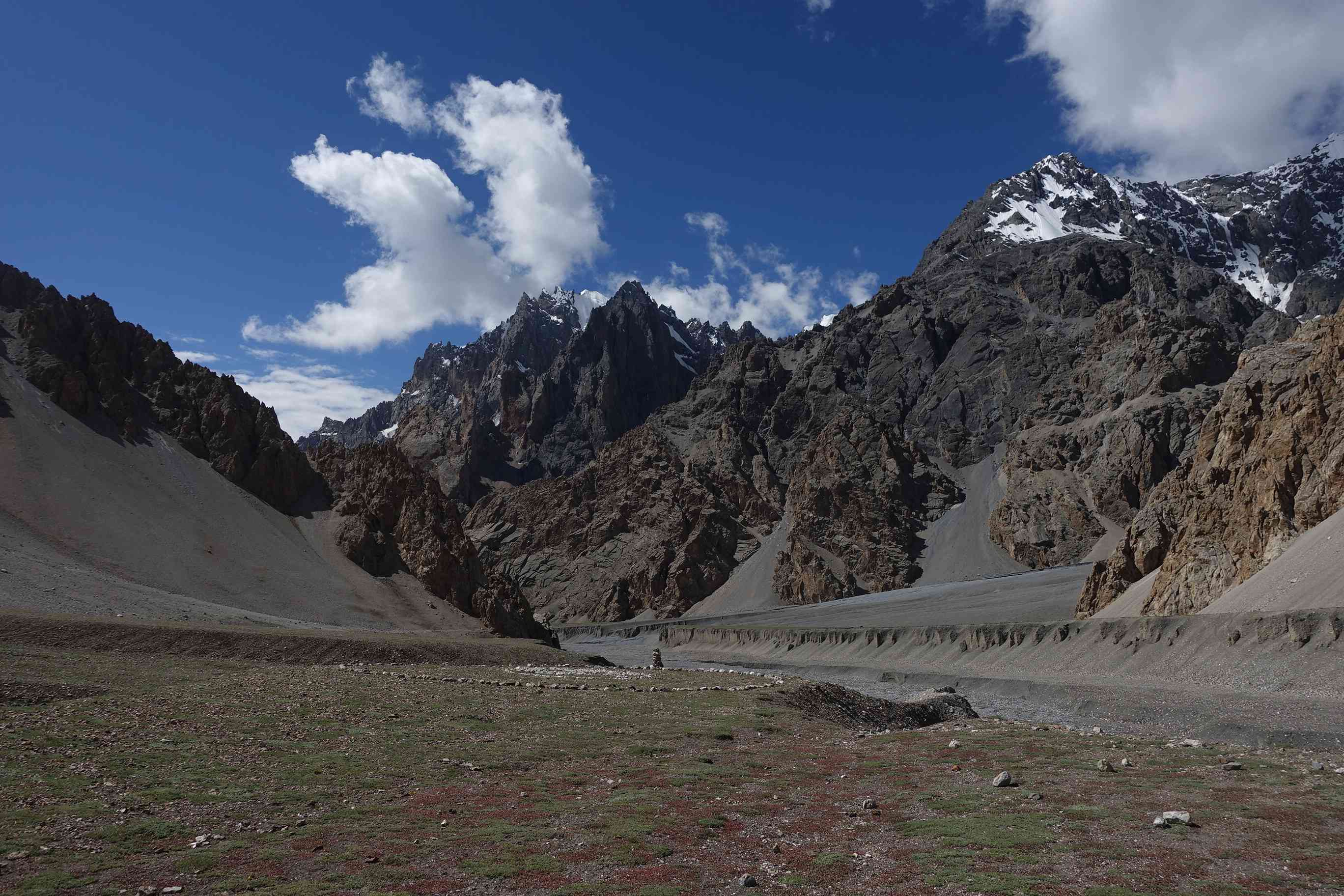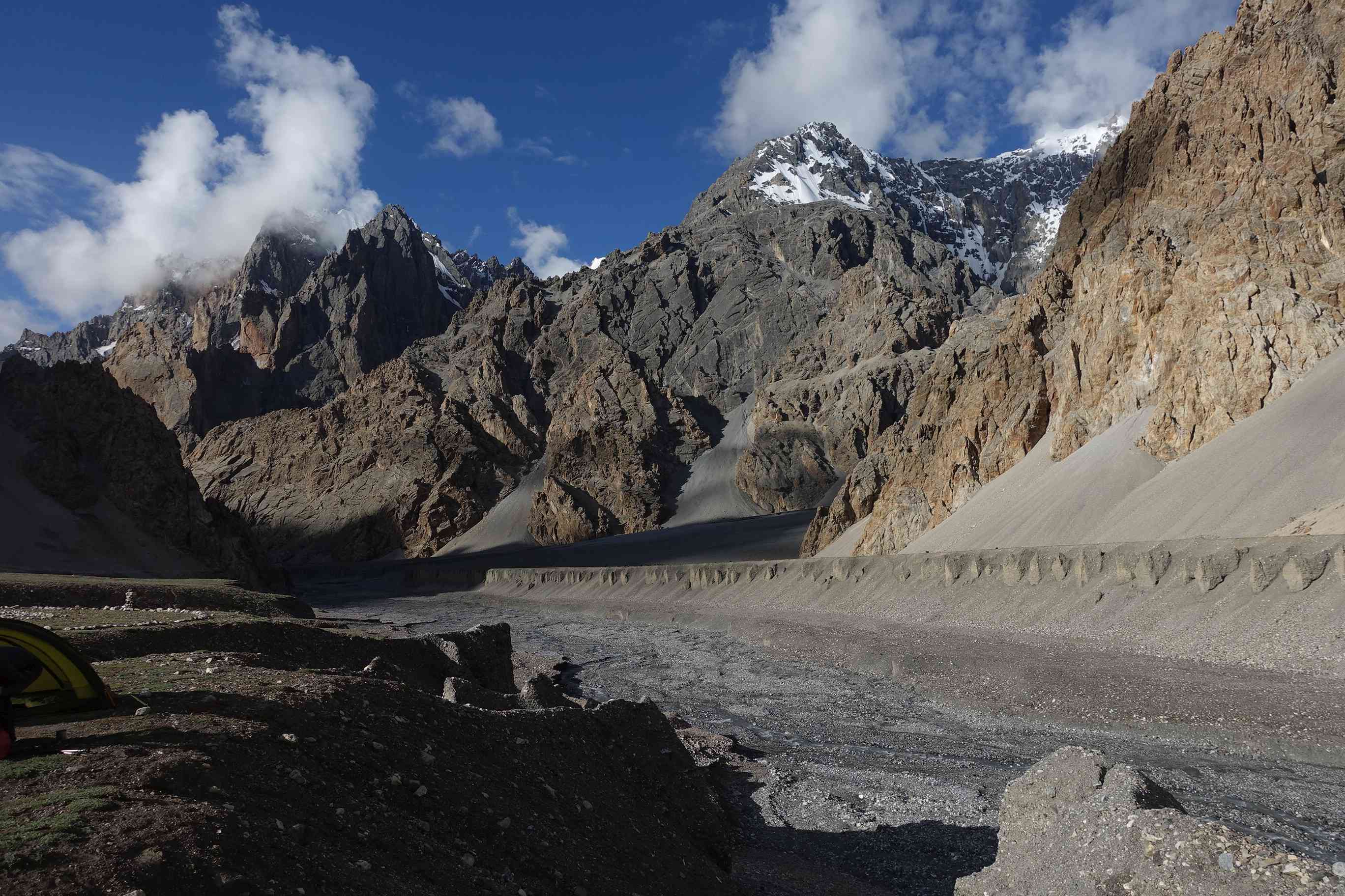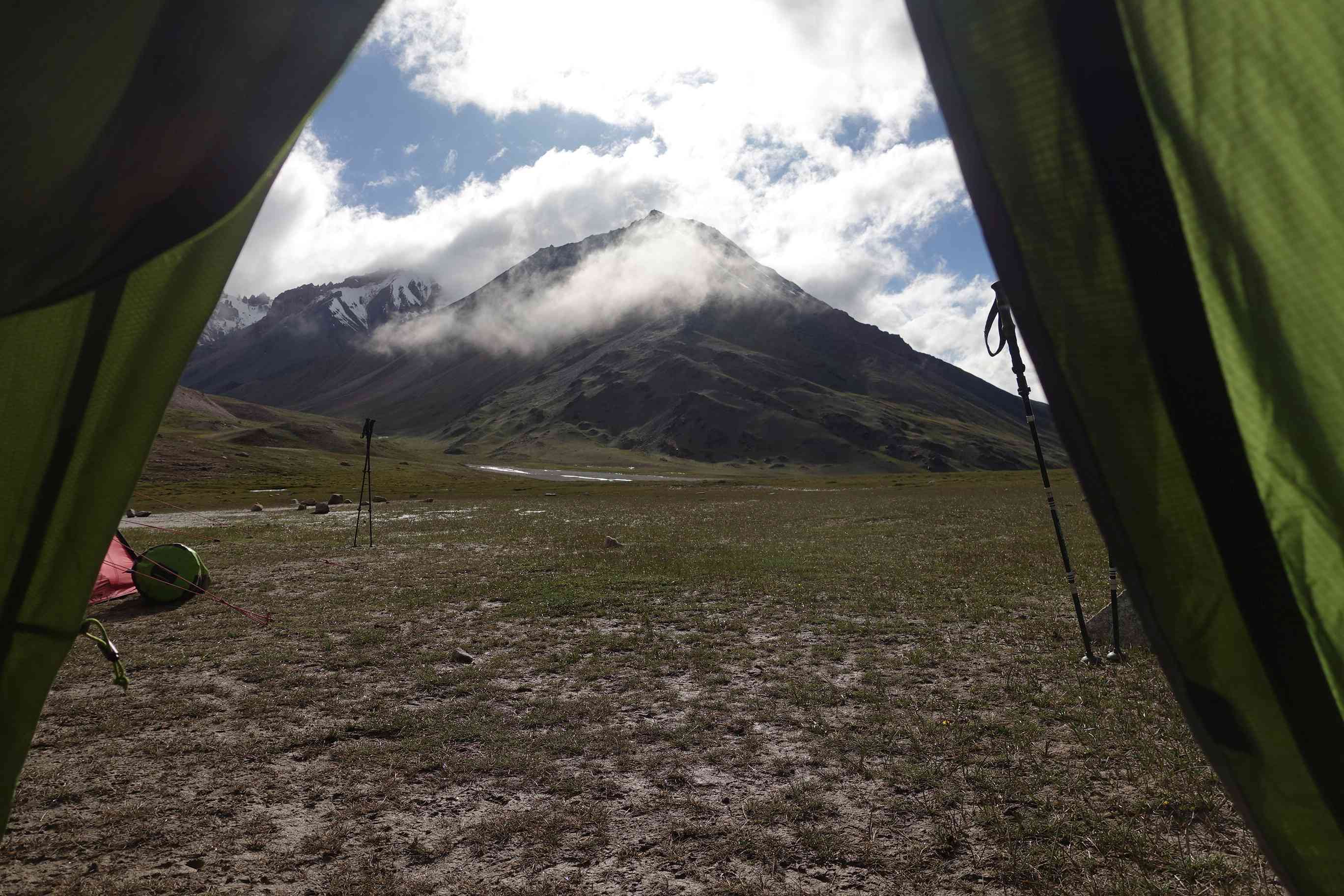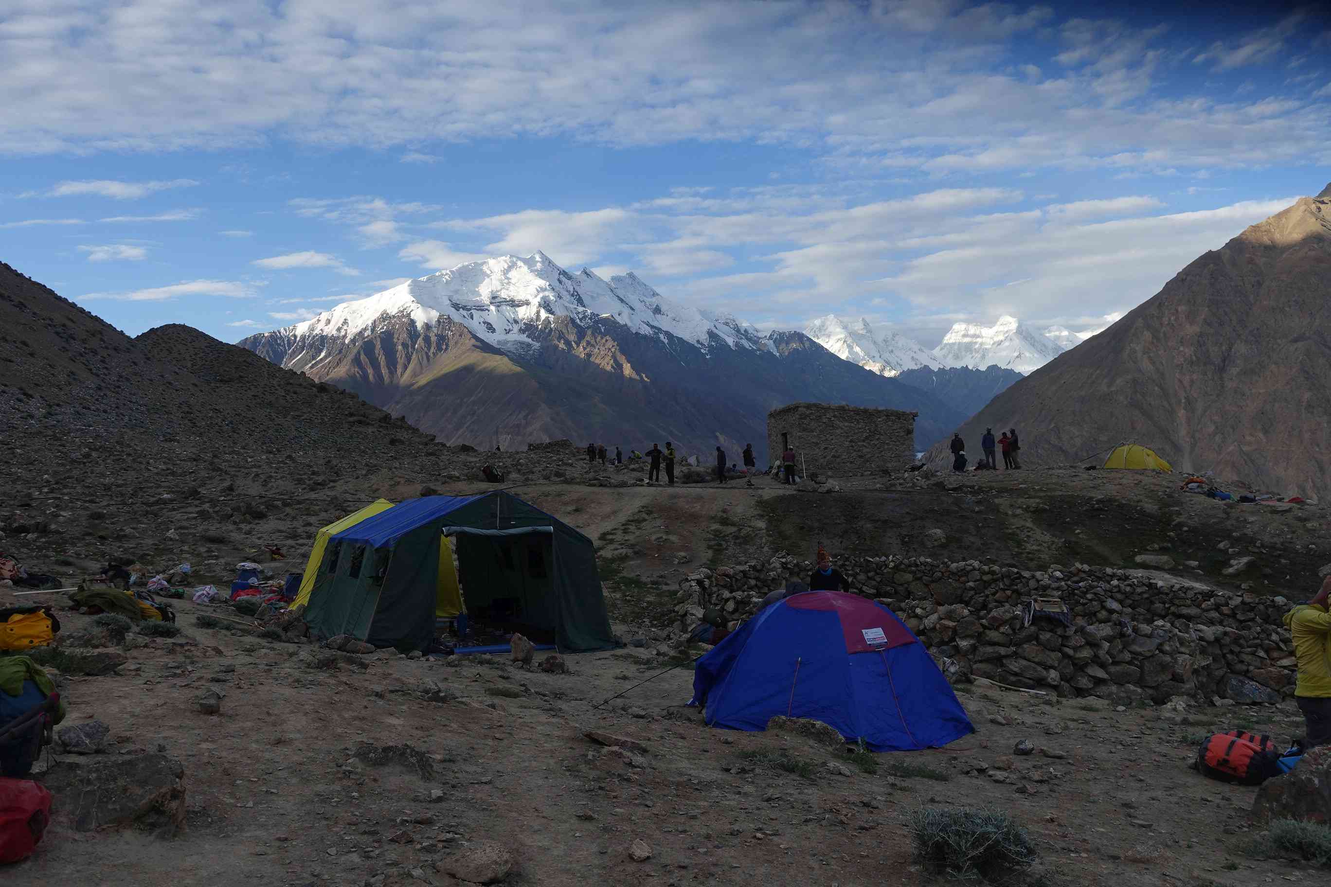 Gleich früh wurde es wieder sonnig und heiß. Heute stand eine lange Tour bevor – knapp 14km und über 1000hm hoch, sowie gut 700 wieder runter sollten es werden. Unser nächstes Camp auf 3900m Höhe. Viele waren etwas platt, aber mir ging es besser, je höher wir stiegen. Tolle Landschaft, tolles Gestein und der erste Blick zum Minglik Sar, unserem angedachten 6000er. Nach dem Zelte aufbauen wurde es etwas dunkel am Himmel, aber das verzog sich dann auch wieder. Ich halte mich ab heute abends an kohlehydratefreies Essen, was mir für den Rest der Tour wirklich gut tun sollte. Um 8.30 Uhr gingen wir schlafen und nachts gab es starken Regen und Wind, was es ziemlich laut und unruhig machte.