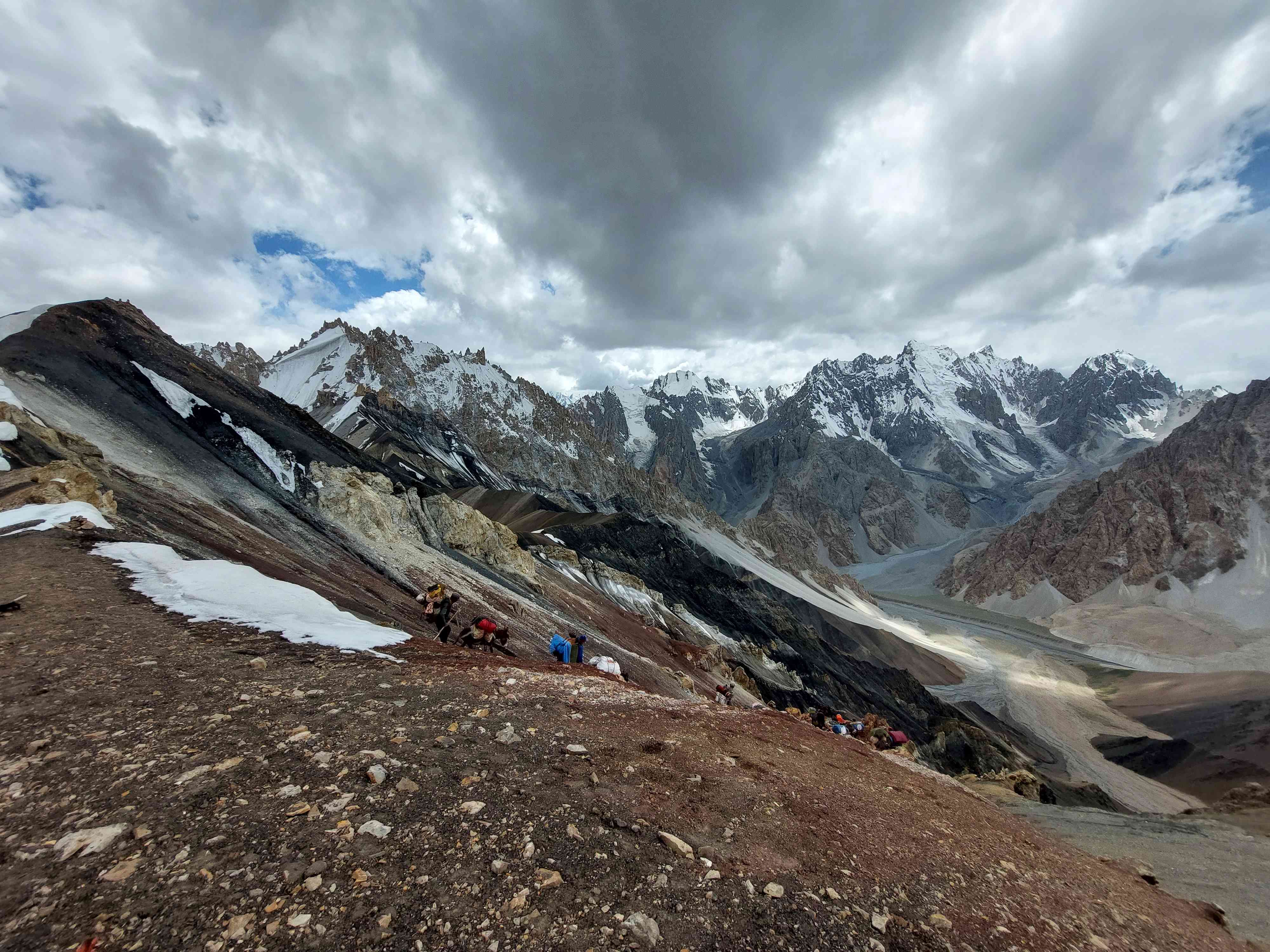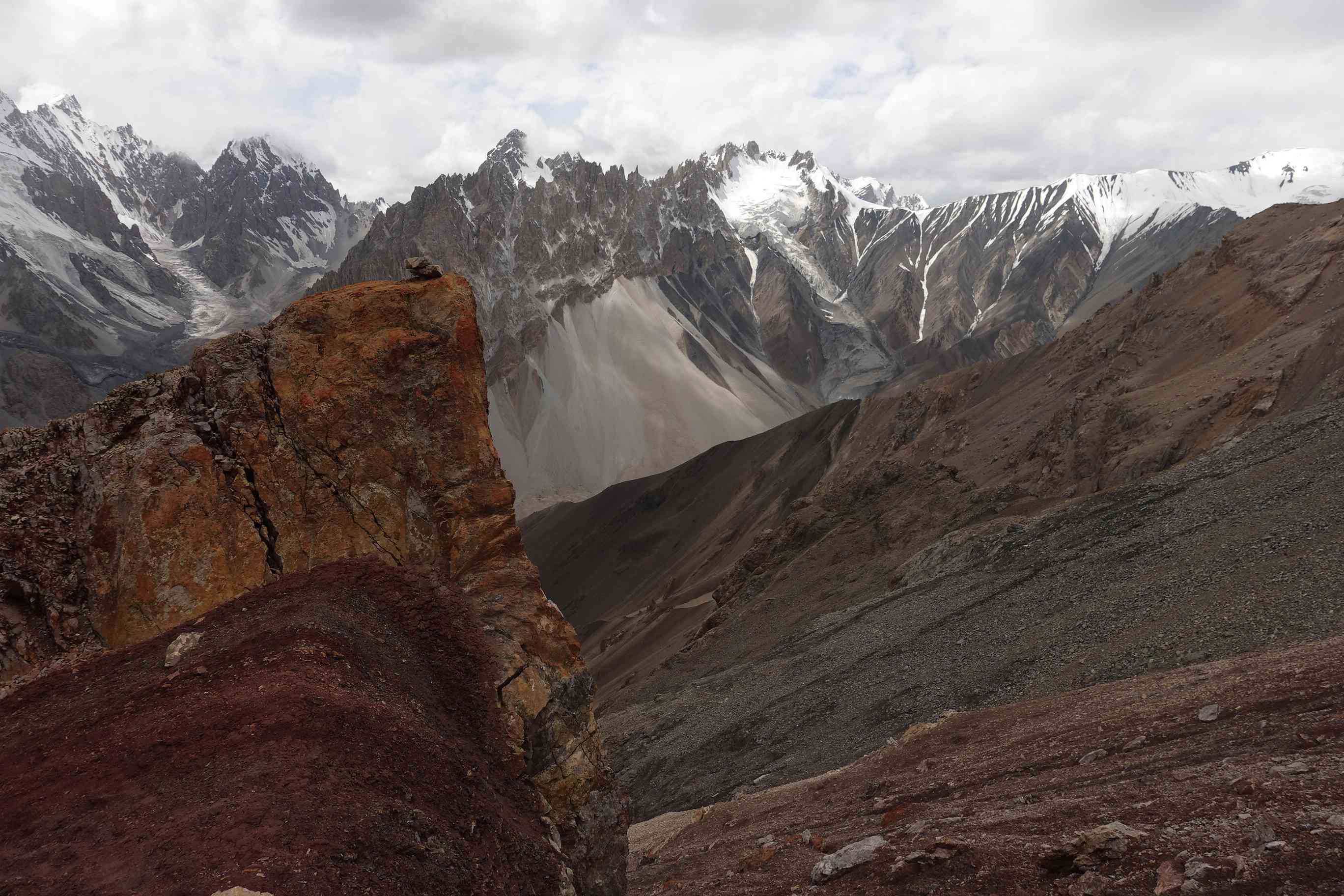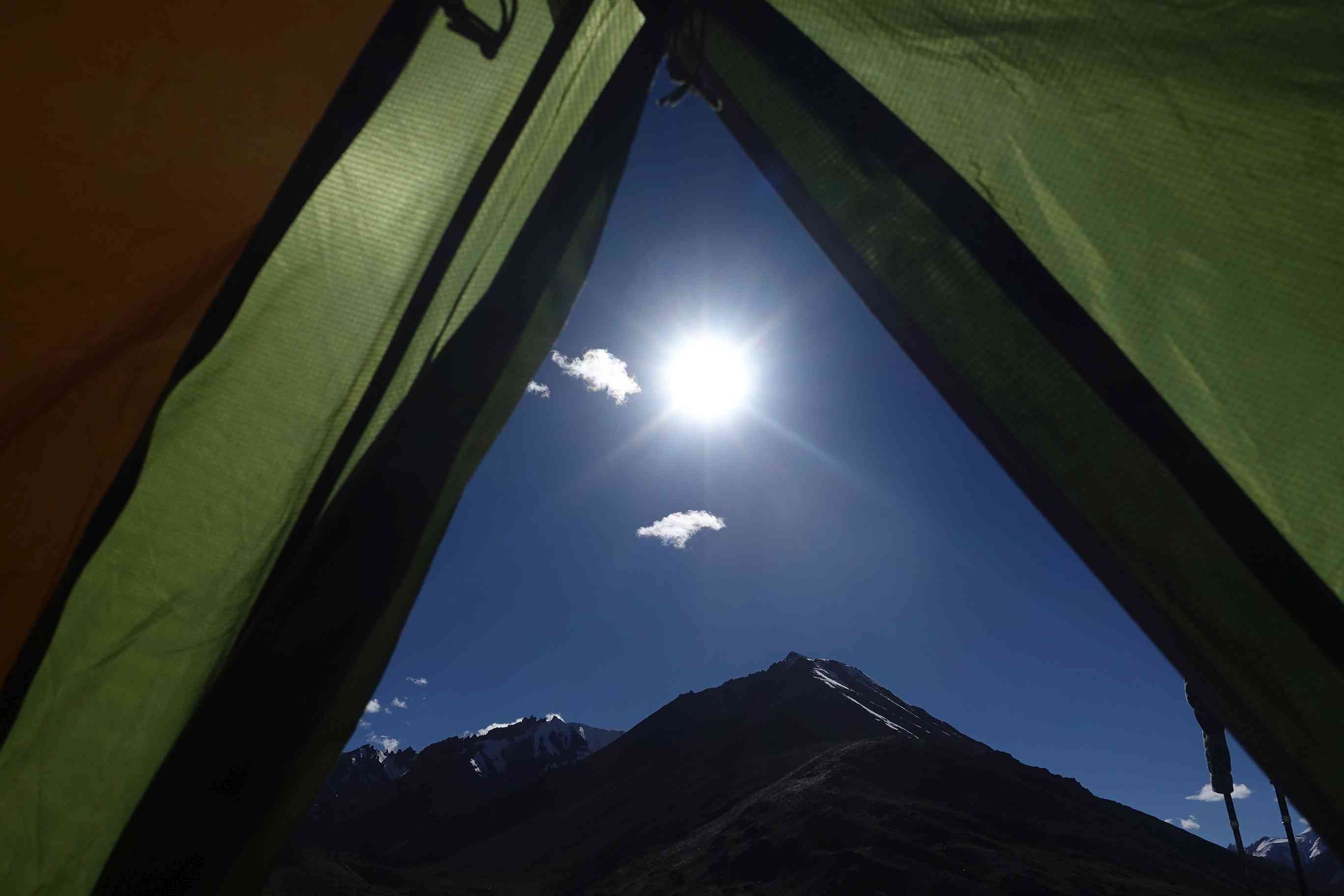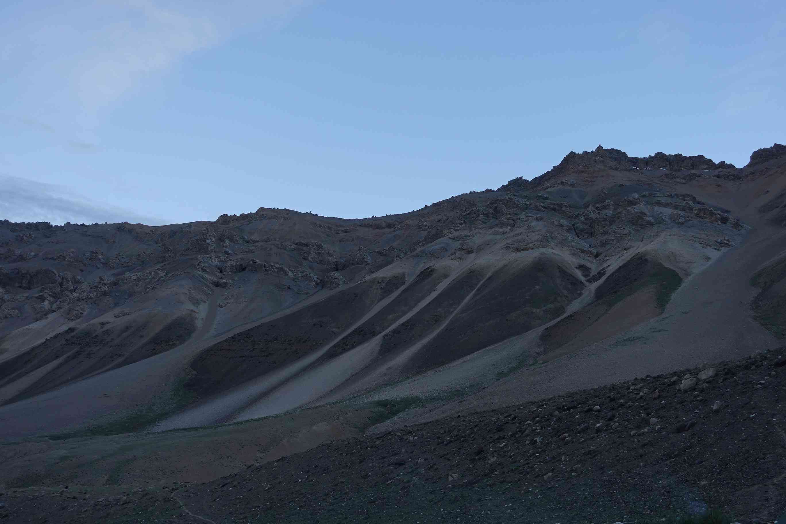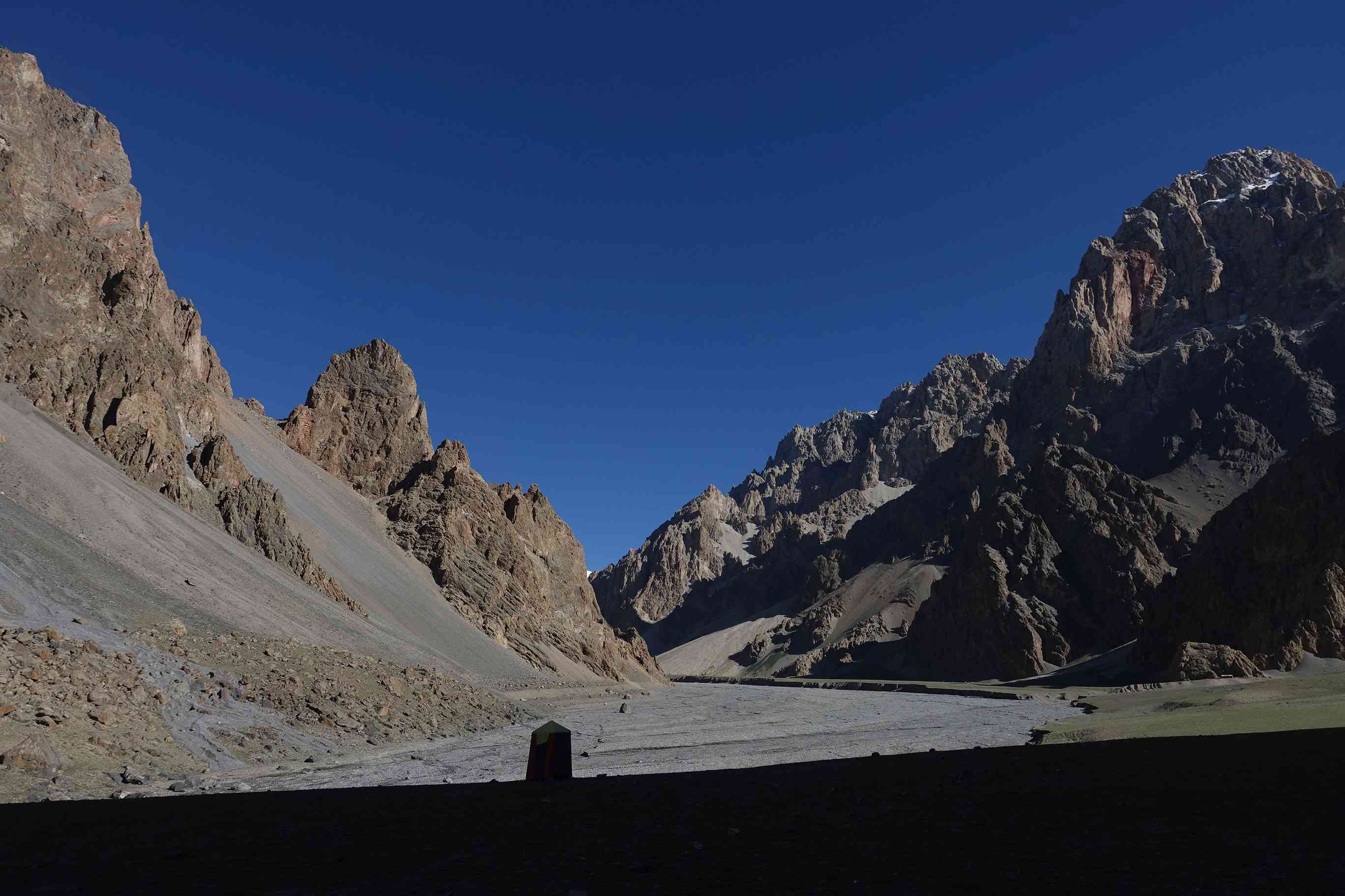 Gleich früh wurde es wieder sonnig und heiß. Heute stand eine lange Tour bevor – knapp 14km und über 1000hm hoch, sowie gut 700 wieder runter sollten es werden. Unser nächstes Camp auf 3900m Höhe. Viele waren etwas platt, aber mir ging es besser, je höher wir stiegen. Tolle Landschaft, tolles Gestein und der erste Blick zum Minglik Sar, unserem angedachten 6000er. Nach dem Zelte aufbauen wurde es etwas dunkel am Himmel, aber das verzog sich dann auch wieder. Ich halte mich ab heute abends an kohlehydratefreies Essen, was mir für den Rest der Tour wirklich gut tun sollte. Um 8.30 Uhr gingen wir schlafen und nachts gab es starken Regen und Wind, was es ziemlich laut und unruhig machte.