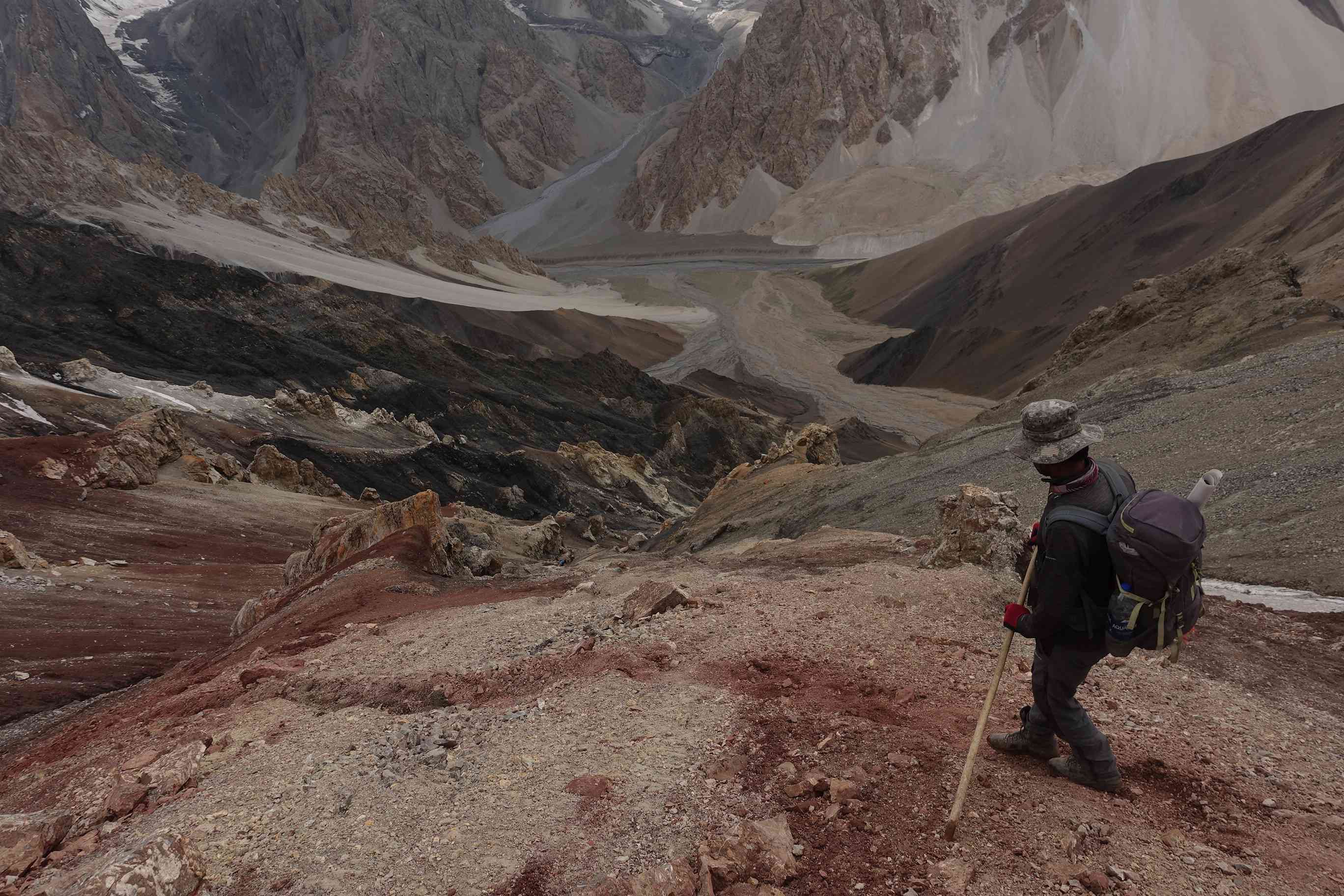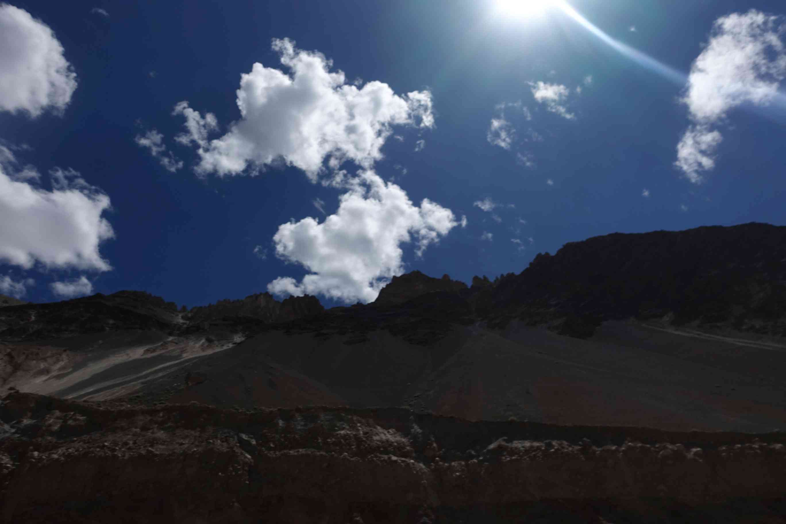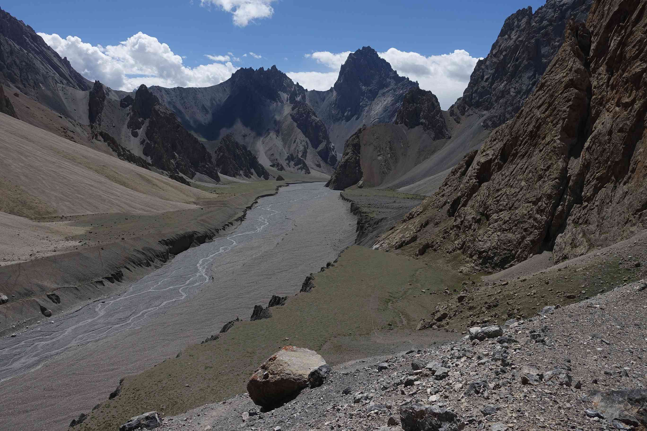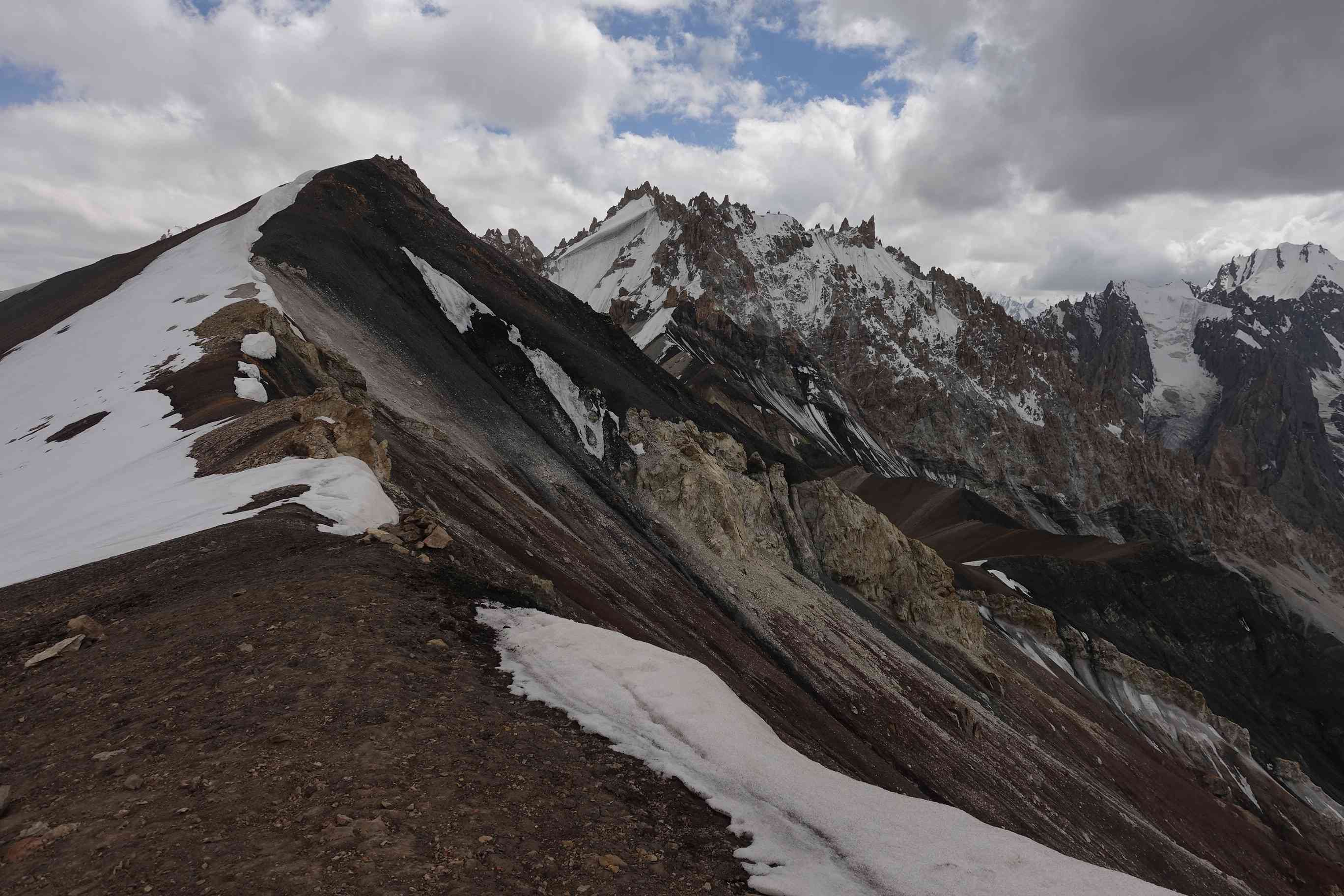 Gleich früh wurde es wieder sonnig und heiß. Heute stand eine lange Tour bevor – knapp 14km und über 1000hm hoch, sowie gut 700 wieder runter sollten es werden. Unser nächstes Camp auf 3900m Höhe. Viele waren etwas platt, aber mir ging es besser, je höher wir stiegen. Tolle Landschaft, tolles Gestein und der erste Blick zum Minglik Sar, unserem angedachten 6000er. Nach dem Zelte aufbauen wurde es etwas dunkel am Himmel, aber das verzog sich dann auch wieder. Ich halte mich ab heute abends an kohlehydratefreies Essen, was mir für den Rest der Tour wirklich gut tun sollte. Um 8.30 Uhr gingen wir schlafen und nachts gab es starken Regen und Wind, was es ziemlich laut und unruhig machte.