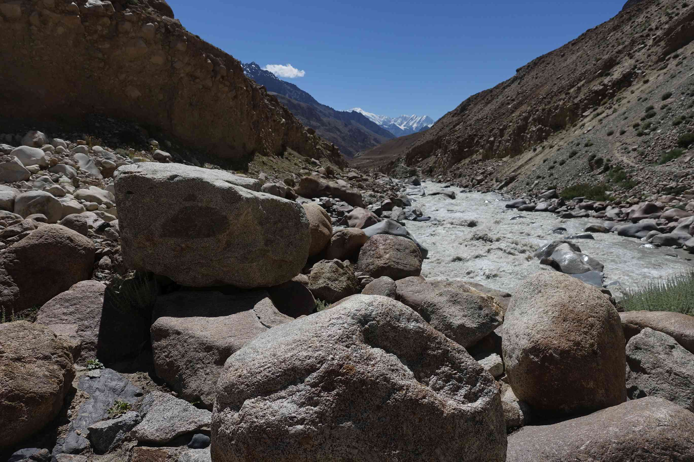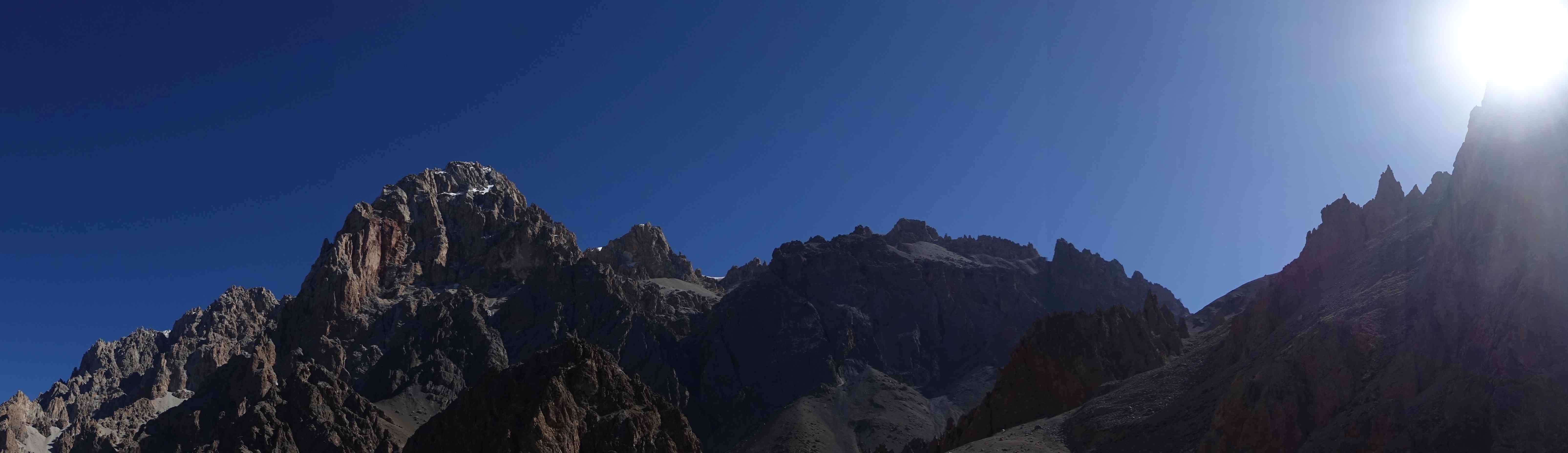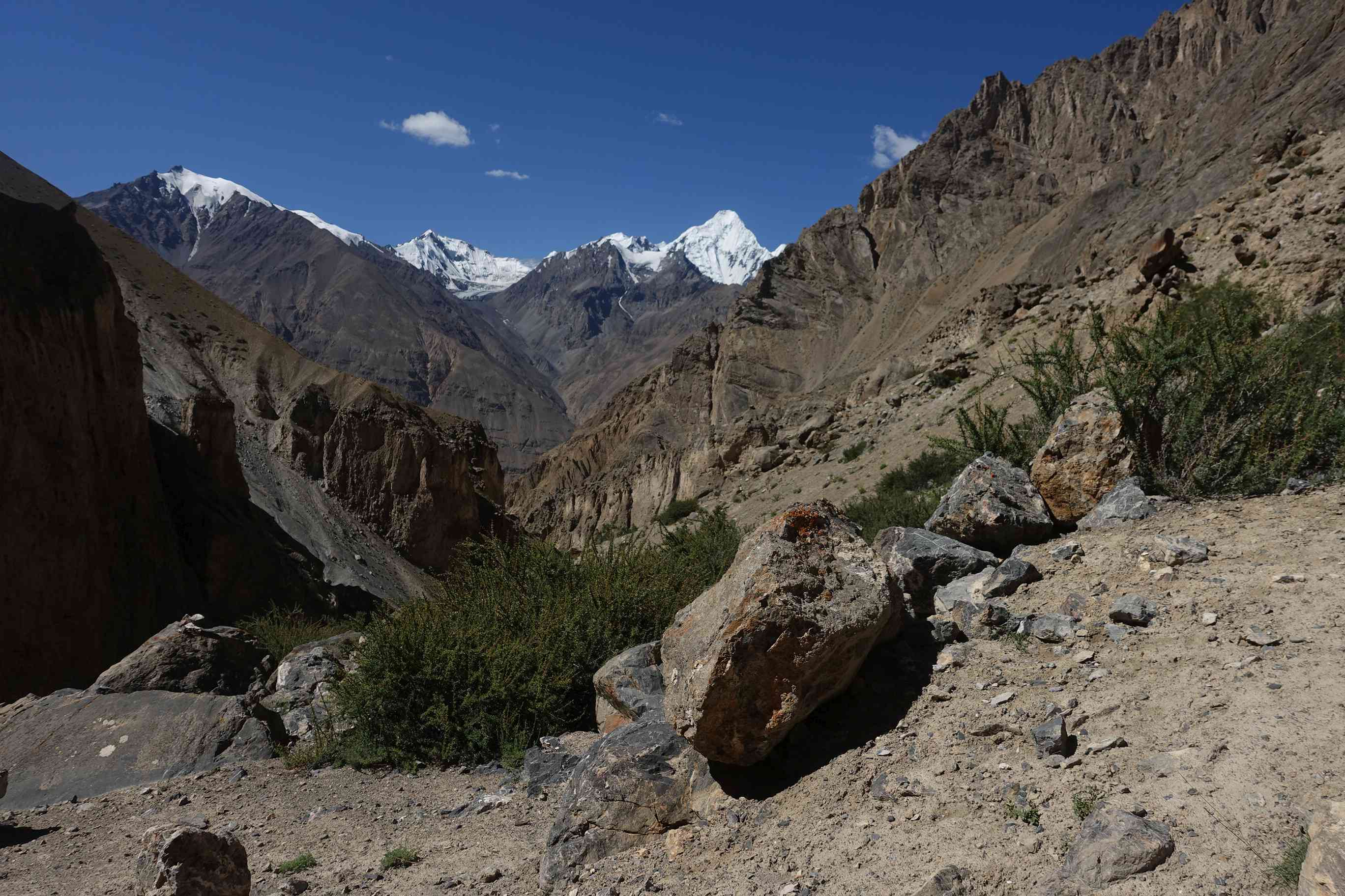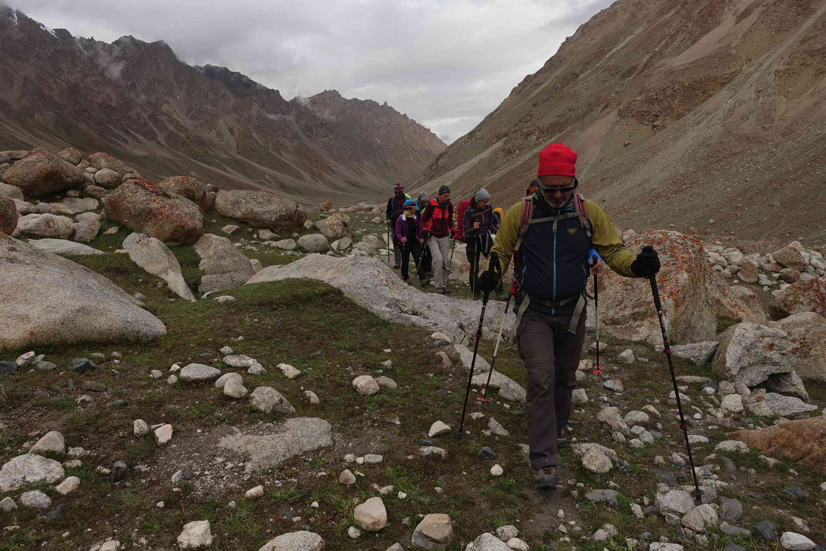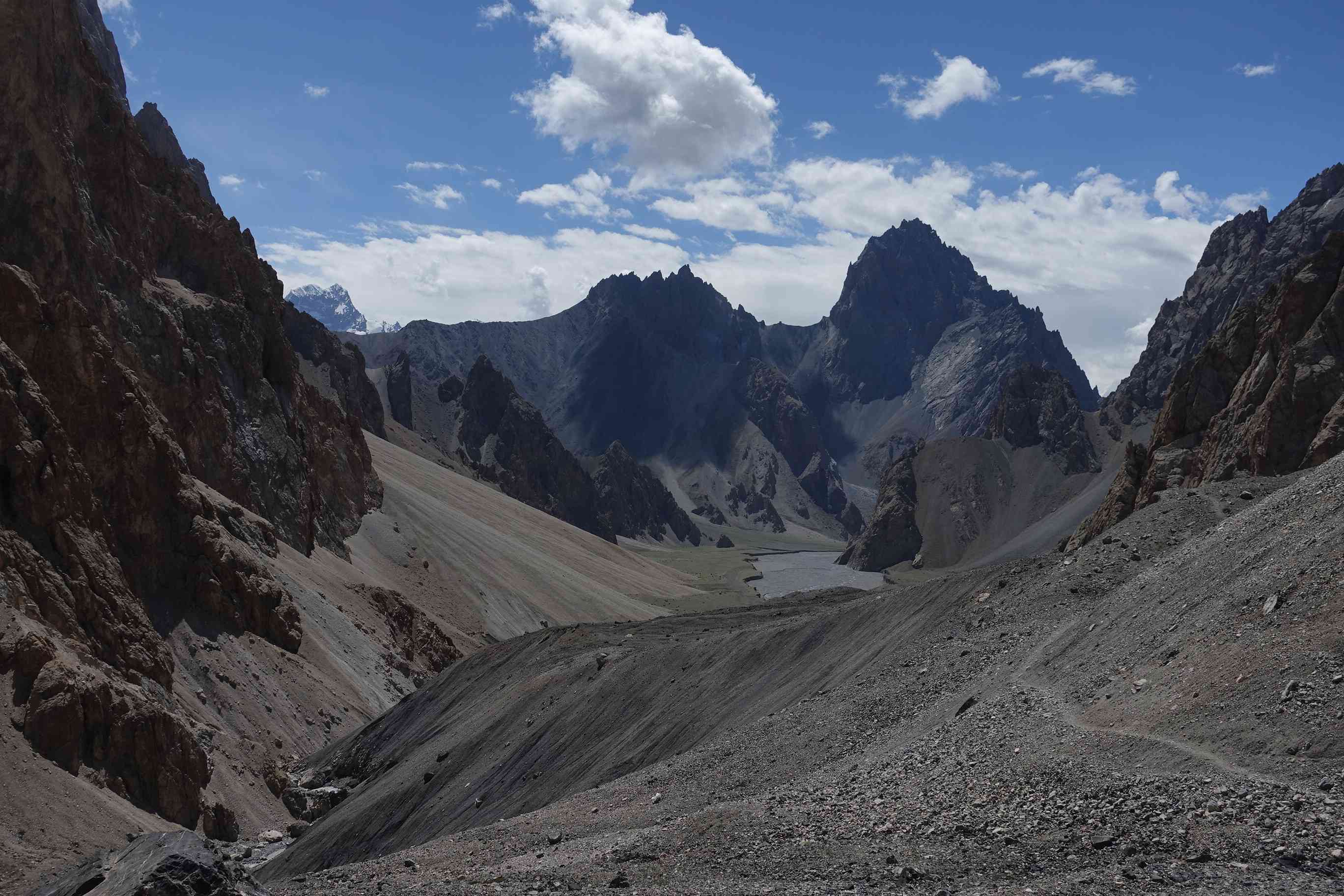 Gleich früh wurde es wieder sonnig und heiß. Heute stand eine lange Tour bevor – knapp 14km und über 1000hm hoch, sowie gut 700 wieder runter sollten es werden. Unser nächstes Camp auf 3900m Höhe. Viele waren etwas platt, aber mir ging es besser, je höher wir stiegen. Tolle Landschaft, tolles Gestein und der erste Blick zum Minglik Sar, unserem angedachten 6000er. Nach dem Zelte aufbauen wurde es etwas dunkel am Himmel, aber das verzog sich dann auch wieder. Ich halte mich ab heute abends an kohlehydratefreies Essen, was mir für den Rest der Tour wirklich gut tun sollte. Um 8.30 Uhr gingen wir schlafen und nachts gab es starken Regen und Wind, was es ziemlich laut und unruhig machte.