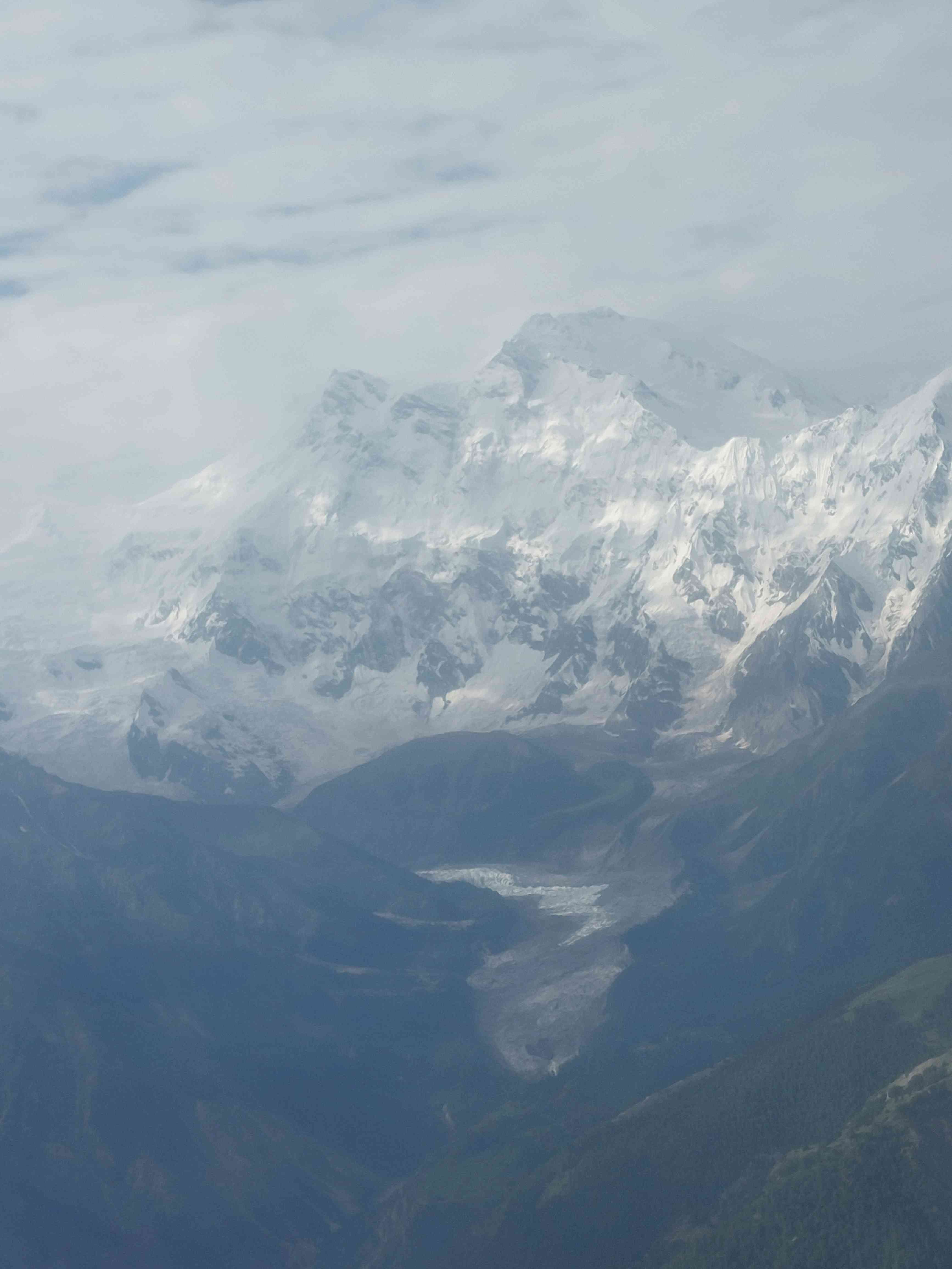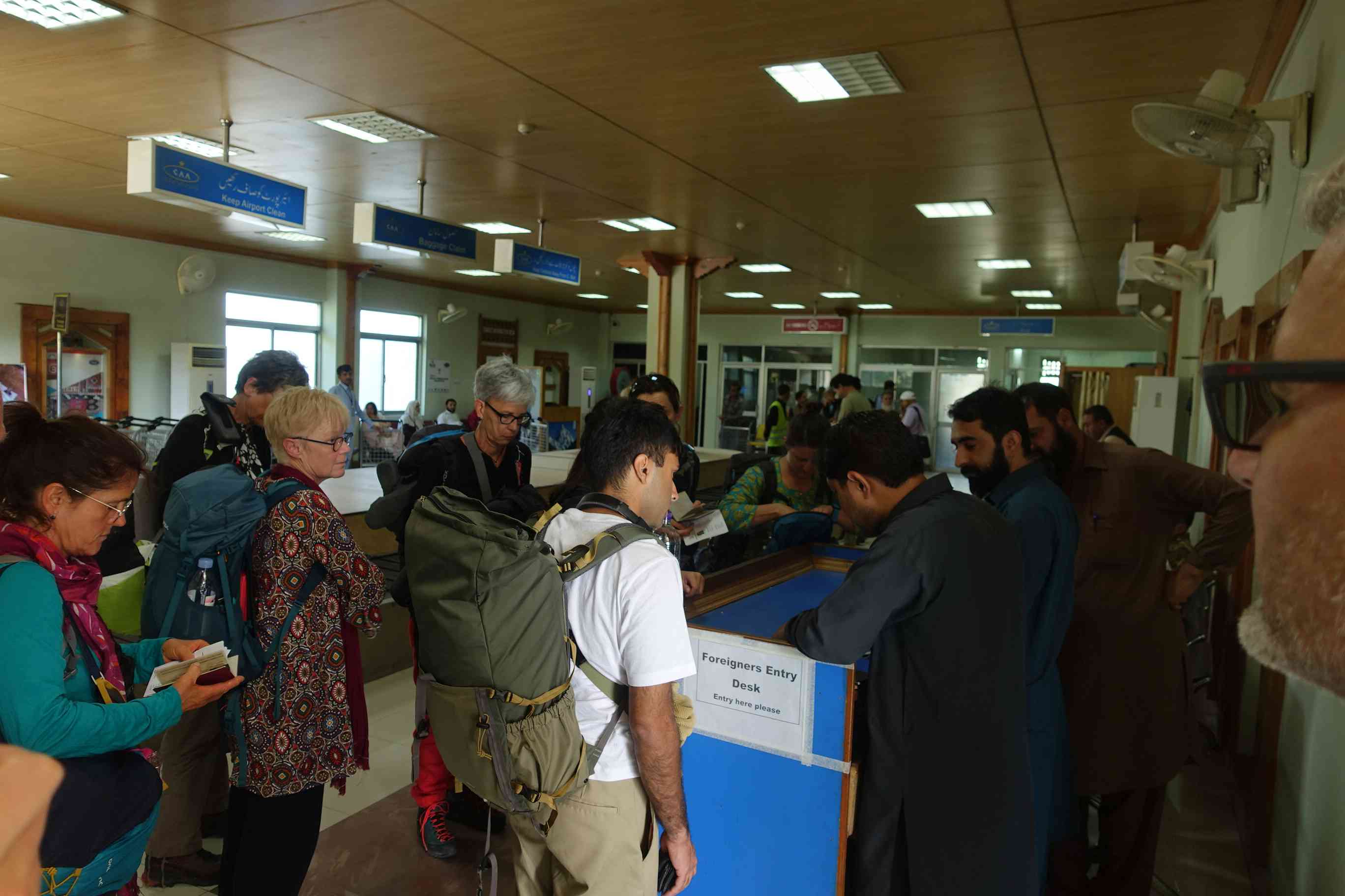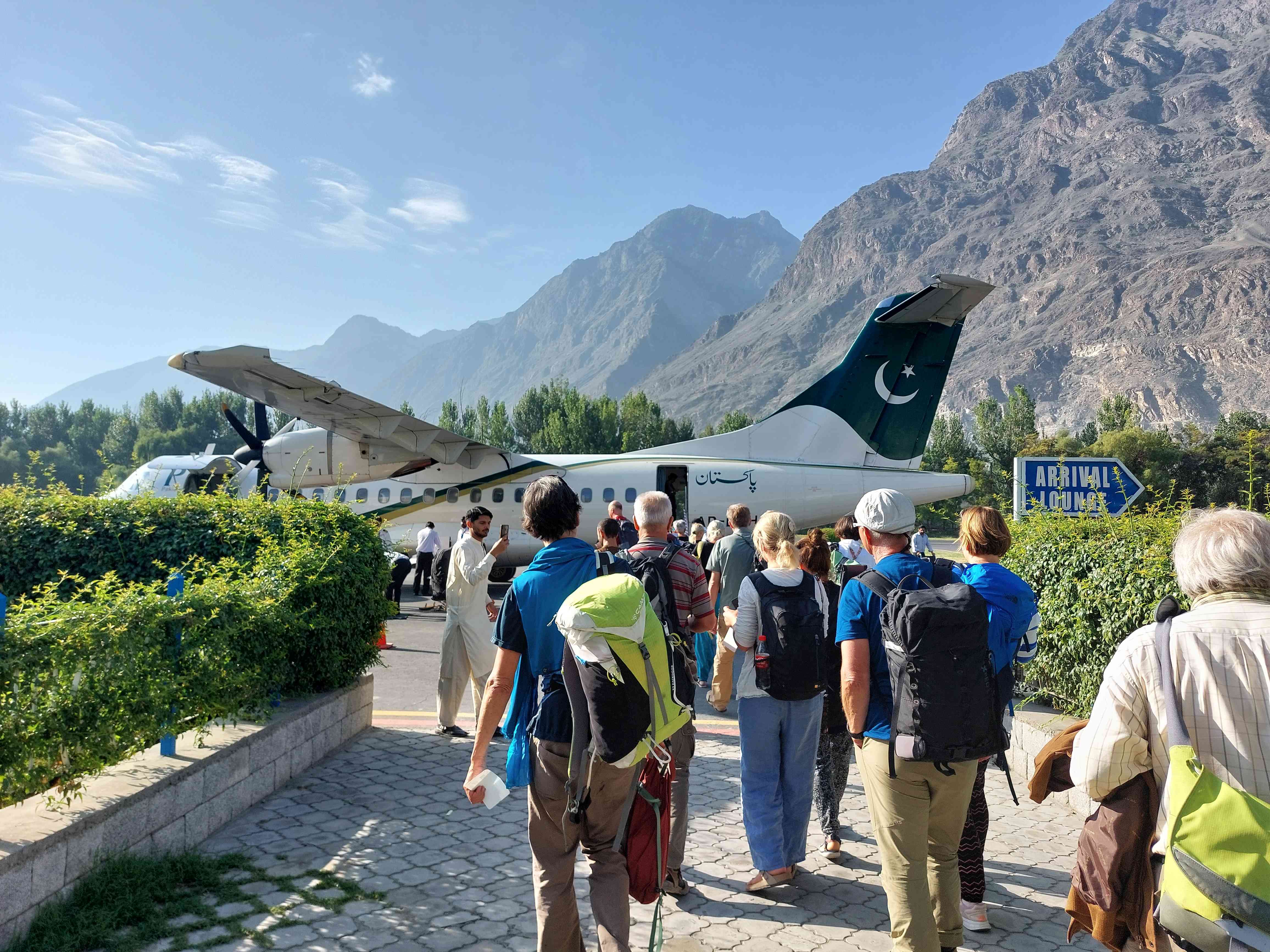 Frühstück, Abfahrt, 4.30 Uhr waren wir am Flughafen und bald darauf im Flieger, der uns nach Gilgit bringen sollte. Es erreichte uns kurz vorher noch die Nachricht von Peter, daß er nun doch sein Visum erhalten hatte und nachkommen würde – was eine Aktion. Vom kleinen Flieger aus hatten wir weiter nördlich gute Sicht auf den Nanga Parbat und den K2 – jetzt wurde es langsam Wirklichkeit, dieses Himalaya – das ließ bei mir den Atem schon stocken. Nach über drei Jahren der Wartezeit standen diese Bergriesen plötzlich in unmittelbarer Nähe, beinahe zum Greifen. Auf dem winzigen Flughafen in Gilgit auf ca. 1500m landeten wir und gelangten durch die Paß- und Visumskontrolle zum Parkplatz. Volker ging es hundeelend mit dem Magen – der Erste, den es treffen sollte.