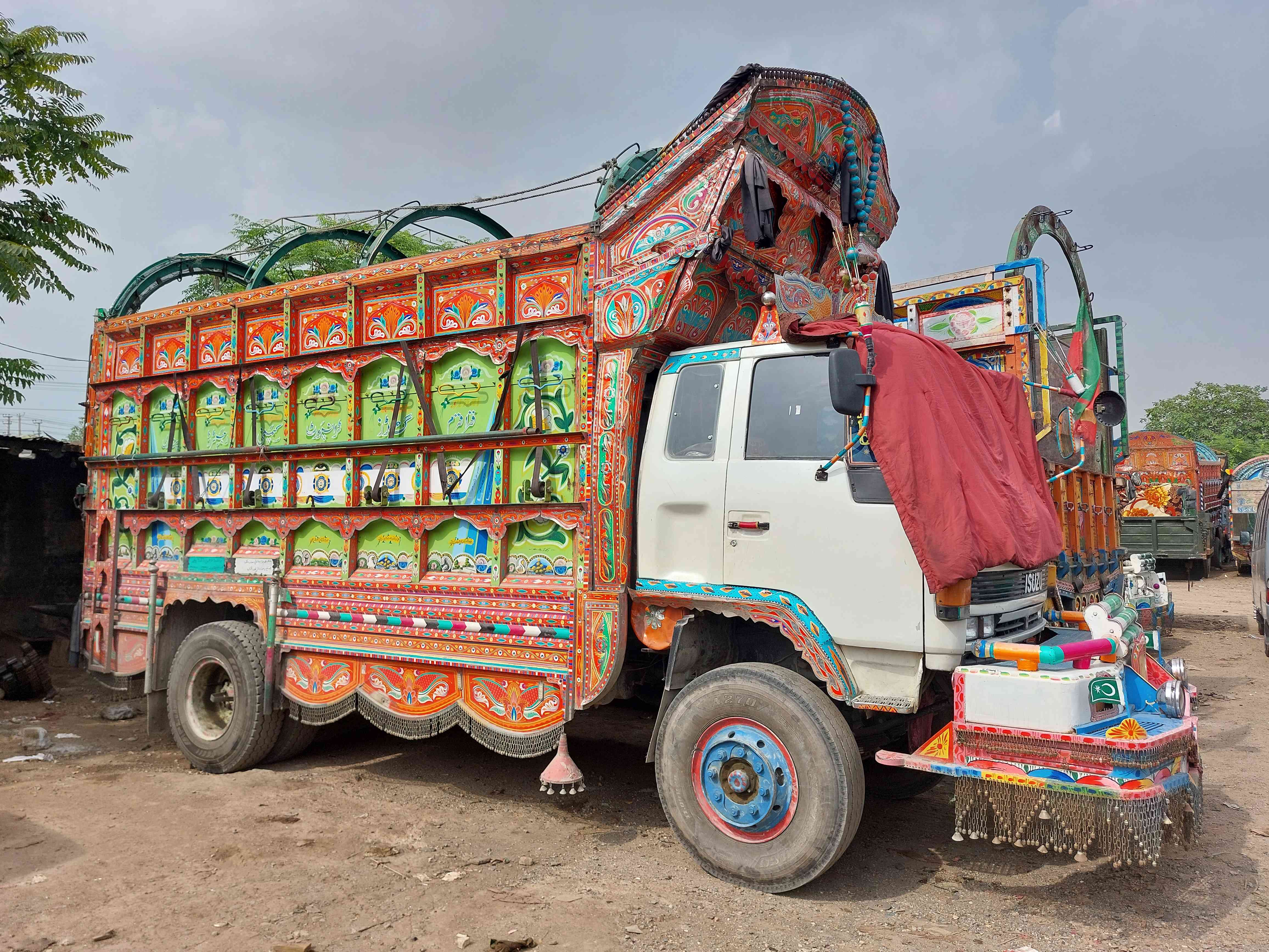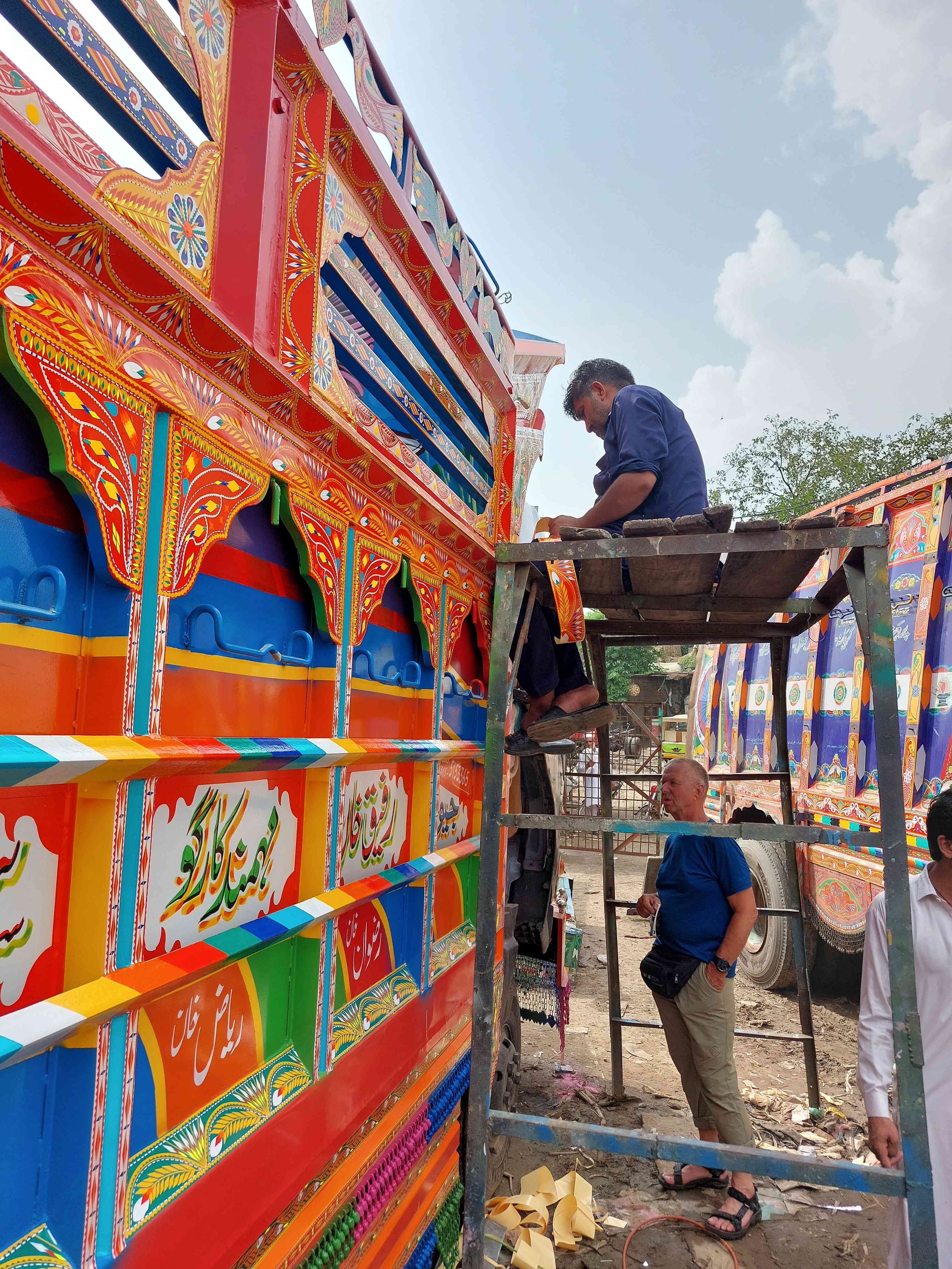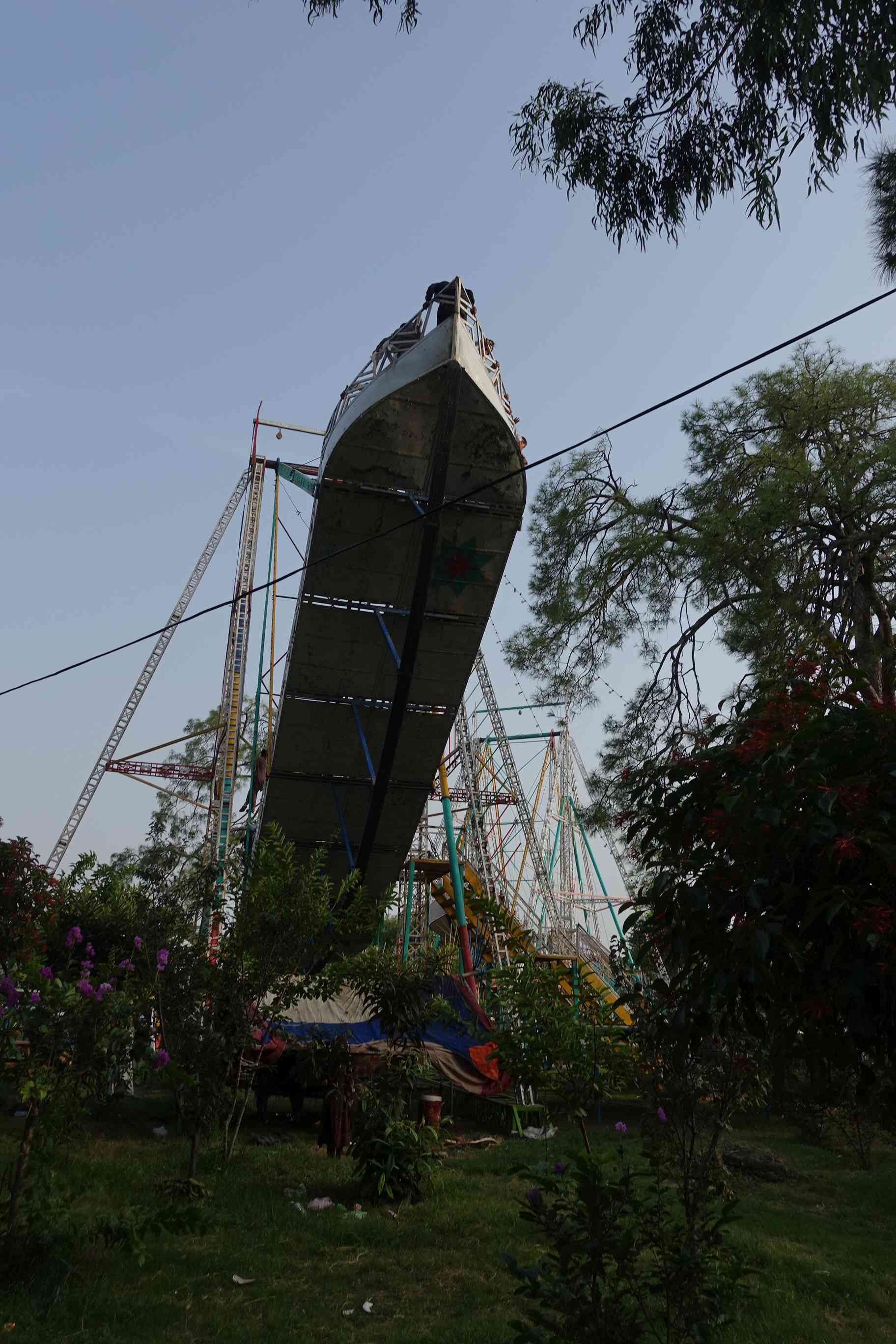 6 Uhr Abfahrt zum Flughafen mit einem Fahrzeug, das ging. Dort verspätet Abflug nach Islamabad und Transfer nach Rawalpindi ins Hotel, das wir schon anfangs zum Toilettengang besucht hatten. Diesmal war Volksfest gegenüber. Wir fuhren zu einem Museum über die Geschichte Pakistans und zu einem Monument und aßen danach in einem Straßenlokal frittiertes Genäsch – es war schon gut, aber einfach langsam viel zu viel Fett überall. Als nächstes fuhren wir zu einem Ort, an dem LKWs aufbereitet und verziert wurden – das war schon wirklich interessant. Sie verkünsteln sich total im Schmücken ihrer Fahrzeuge, und sie sind auch stolz auf alles, was sie hier machen. Zum Abschluß des Tage lief ich mit Volker und Peter noch durch die Straßen von Rawalpindi. Wir kauften uns eine Tüte Pfirsiche und verspeisten diese dann auf dem Rummel gegenüber des Hotels. Zwei riesen Schiffschaukeln wurden mit Dieselmotoren betrieben, was einen Höllenlärm verursachte. Wie überall hier, wo wir uns etwas aufhielten, wurden wir von Einheimischen angeschaut, hauptsächlich von den Kindern. Auch hier hatten wir bald wieder eine Menschentraube um uns, so daß wir uns bald wieder auf den „Heimweg“ machten.