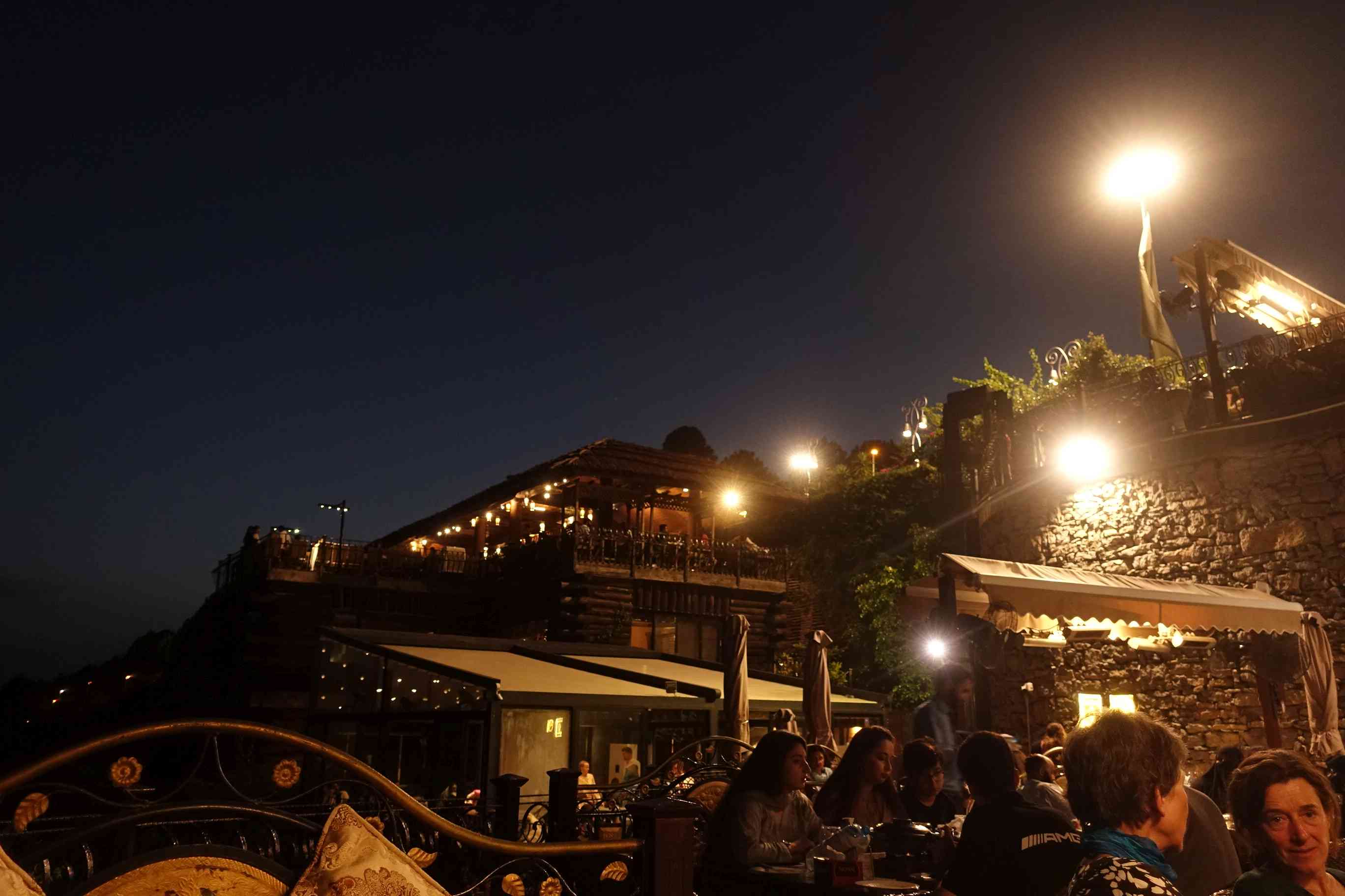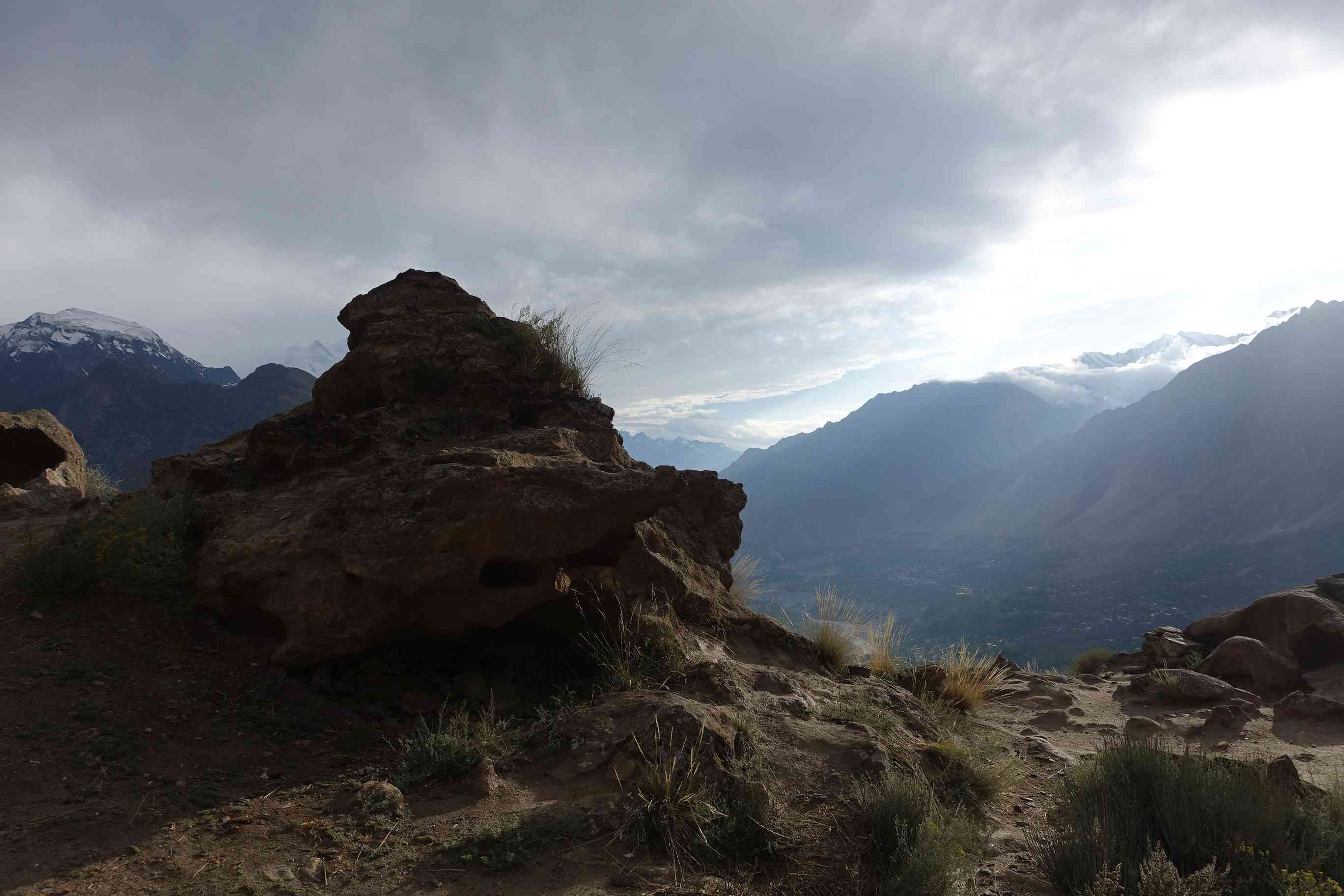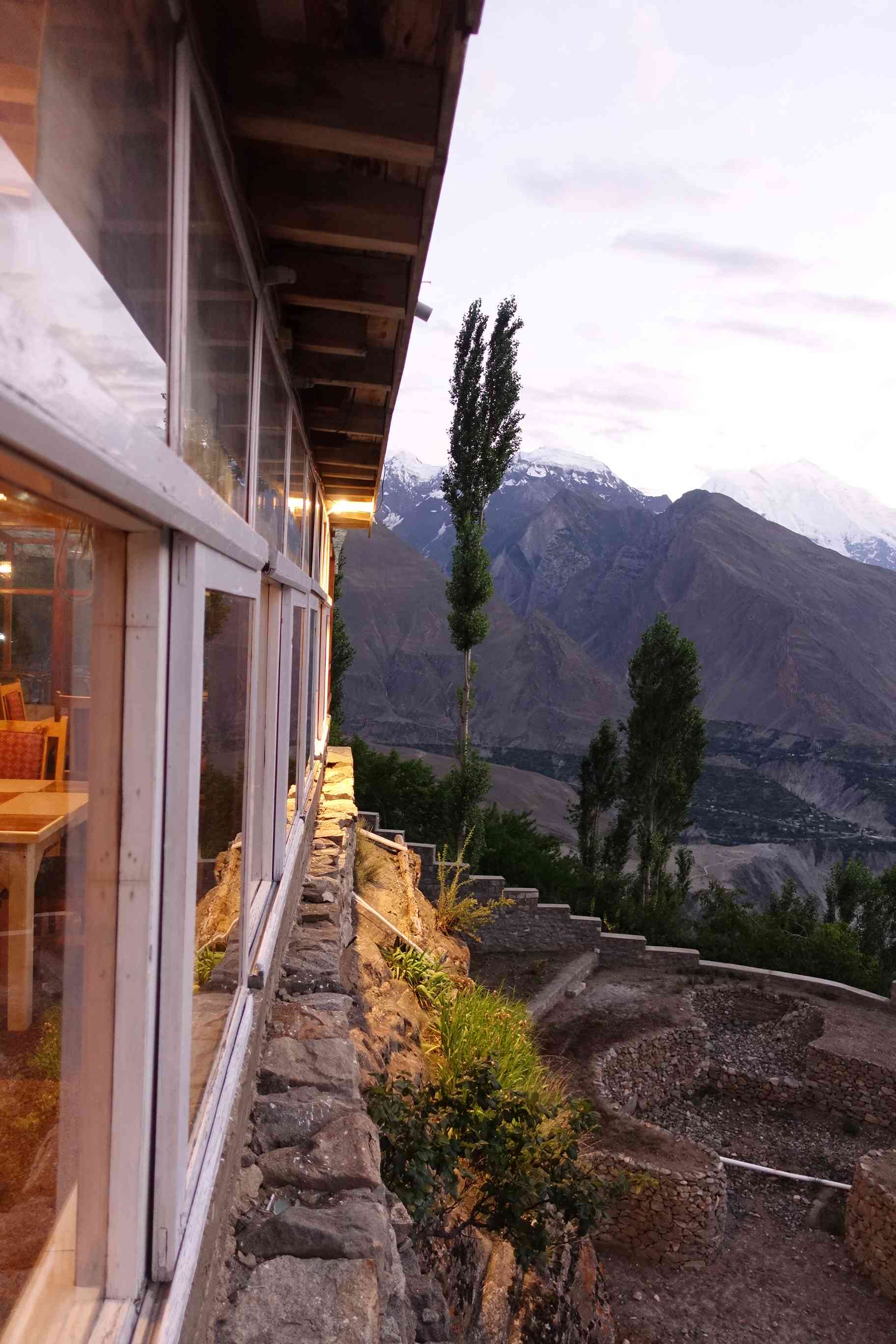 Um 15 Uhr waren wir zurück im Hotel und saßen im Garten mit Blick auf den Rakaposhi. Ich las. Zum Sonnenuntergang gingen wir hinauf auf einen Hügel hinter dem Hotel. Hier waren viele Einheimische, um Selfises und Fotos zu machen. Wir aßen zu Abend auf einer Dachterrasse, wieder viel zu viel Essen, und im Anschluß saßen wir noch auf unserer Bergterrasse und erzählten.