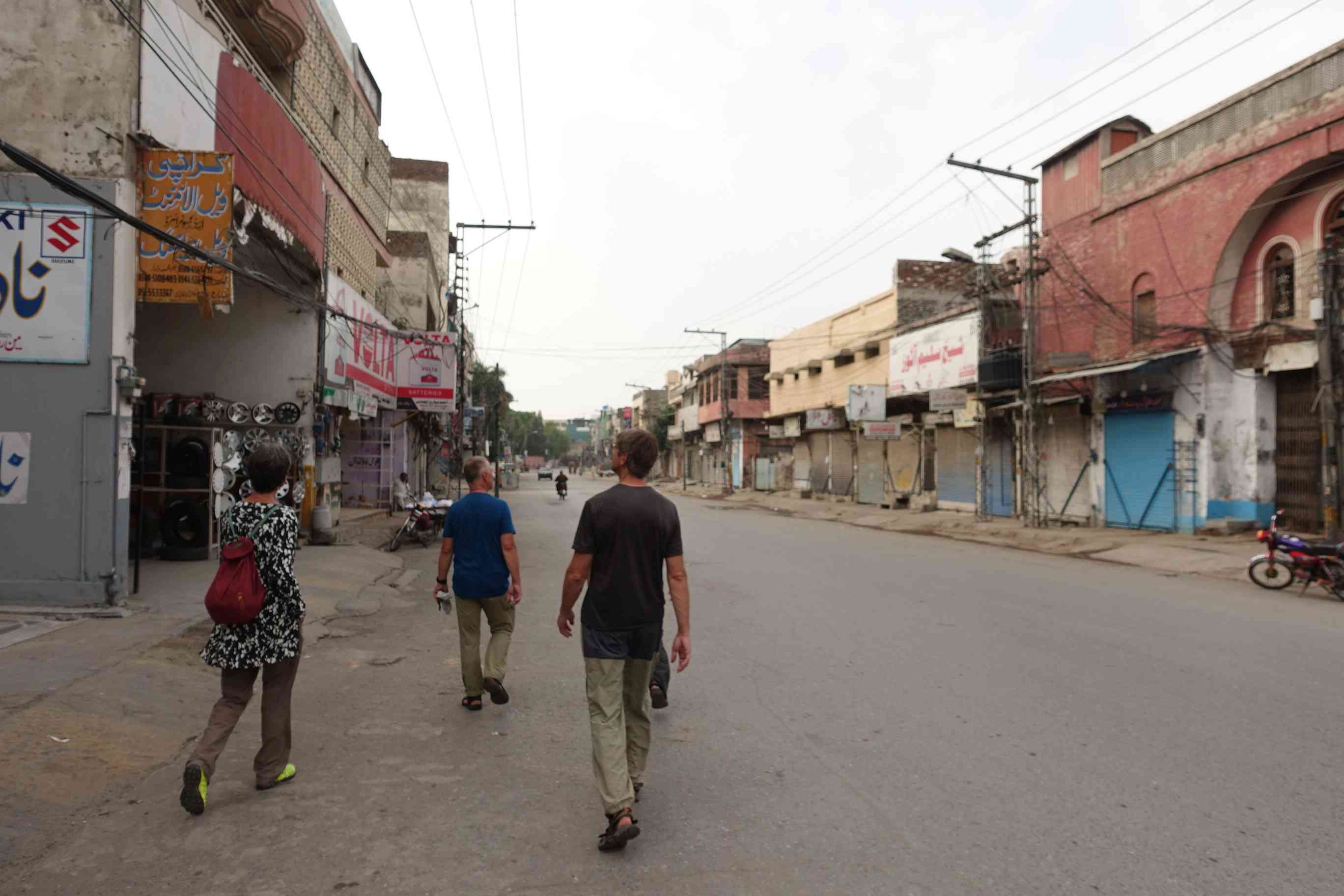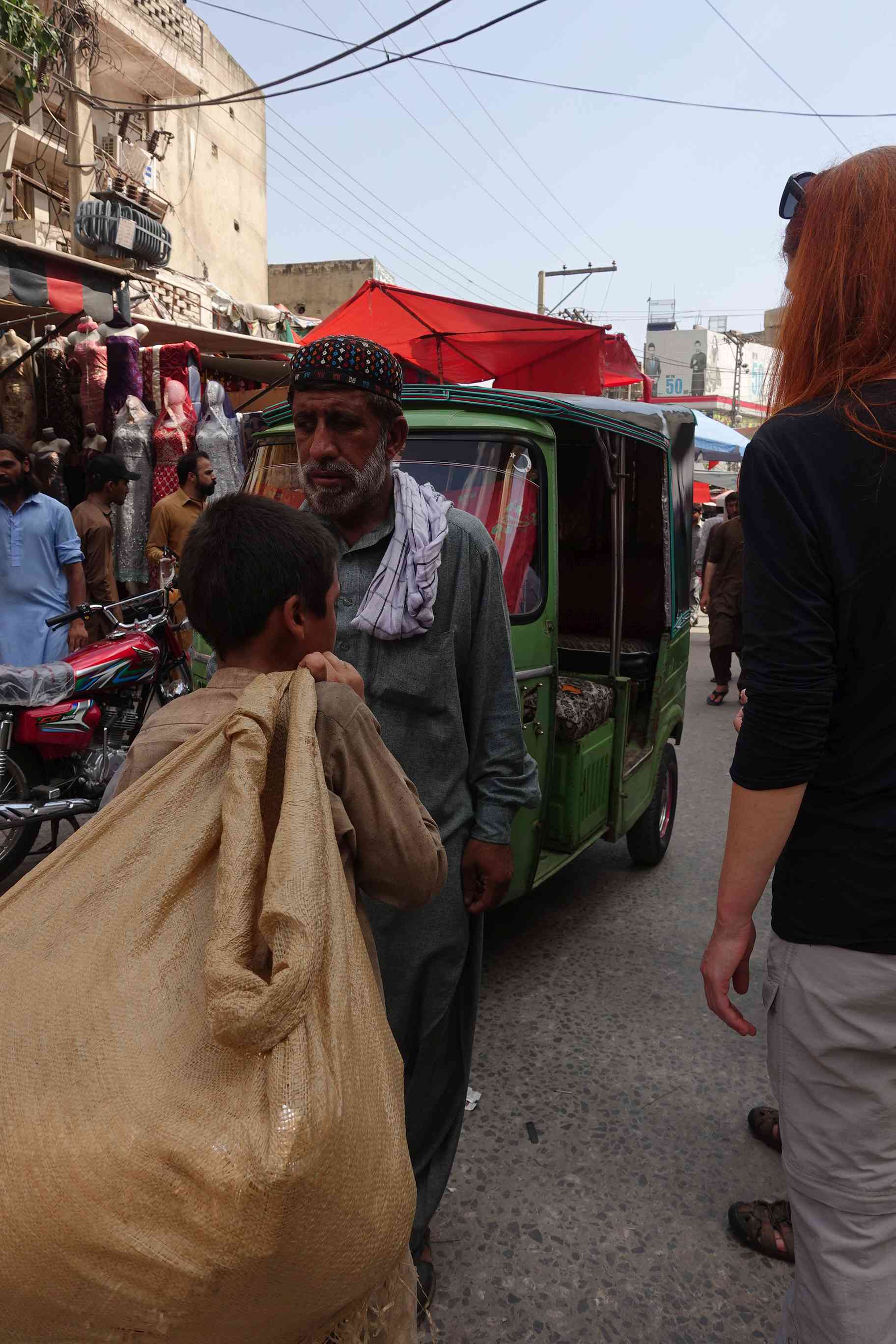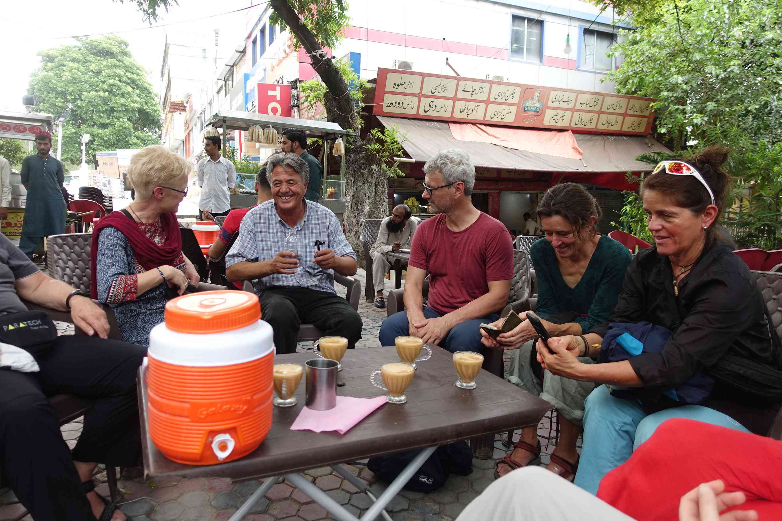 Aufstehen war um 8 Uhr, Frühstück, und dann trafen wir uns in der Lobby – erster Tagesordnungspunkt war Geld tauschen, was sich schwieriger und langwieriger erwies als gedacht. Letztlich fanden wir eine Bank, aus der wir alle mit den uns unbekannten Scheinen wieder rausgingen. 1000 Rupien entsprechen so ca. 3 Euro und irgendwie schien es anfangs nur 1000er zu geben, dementsprechend dick waren unsere Bündel. Nach einer Chaipause in einem Straßencafé fuhren wir mit dem Bus nach Rawalpindi, um dort über den Markt zu schlendern. Hier trafen wir auf Imtiaz‘ Tochter, die ein paar von uns behilflich dabei war, um noch ein paar lange Blusen zu kaufen. Die Stadt war voll und es war heiß und sonnig. Man lief guckte und unterhielt sich – die Truppe schien alles in allem eine gute Zusammensetzung zu sein.